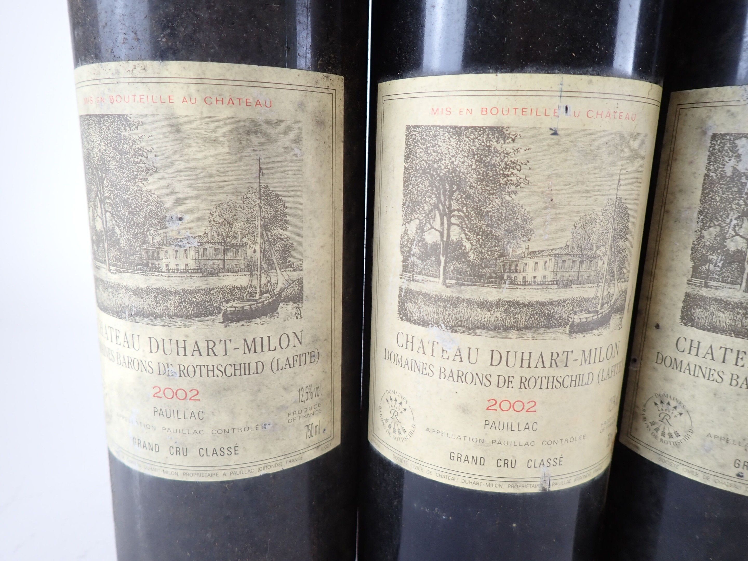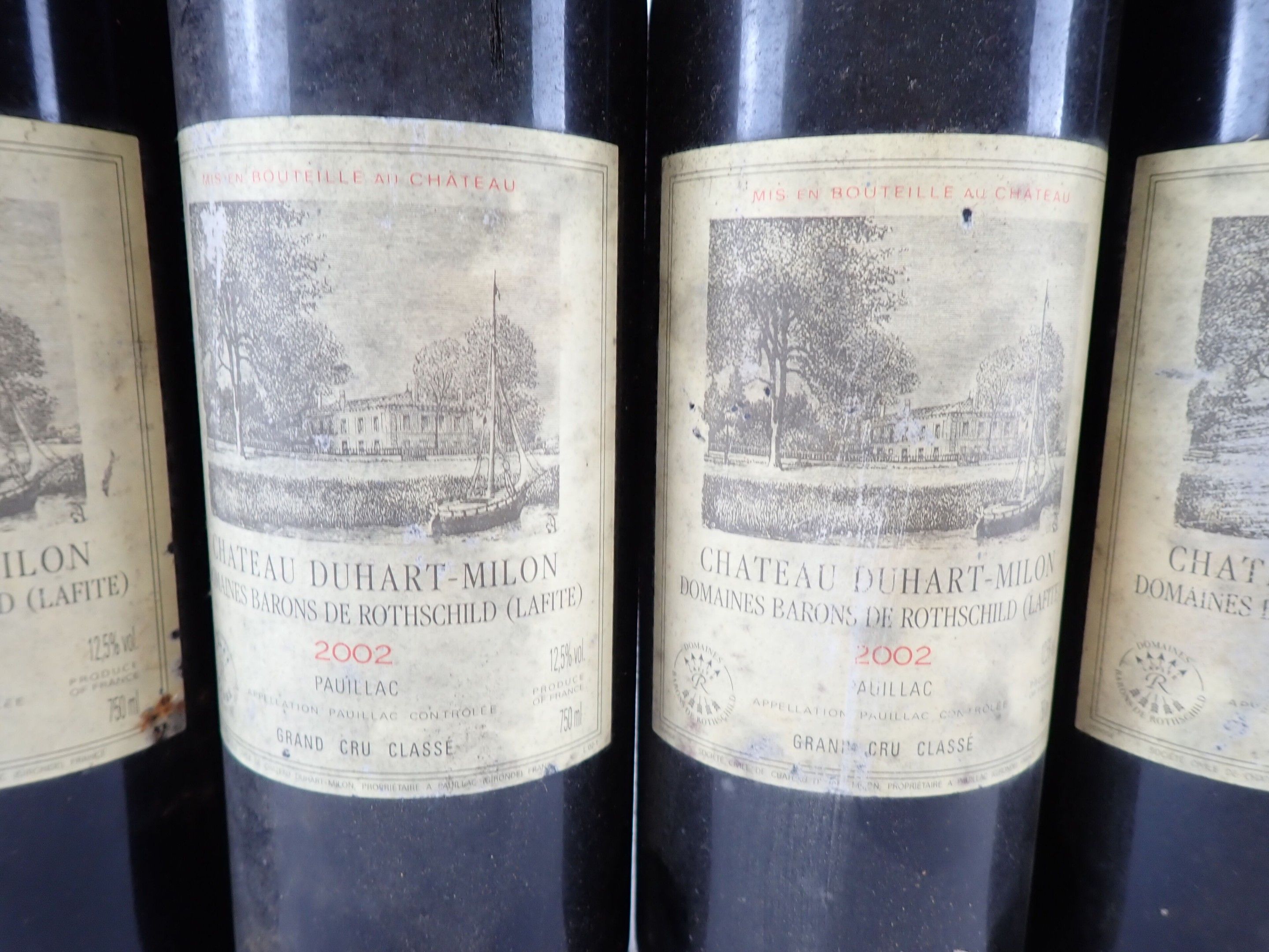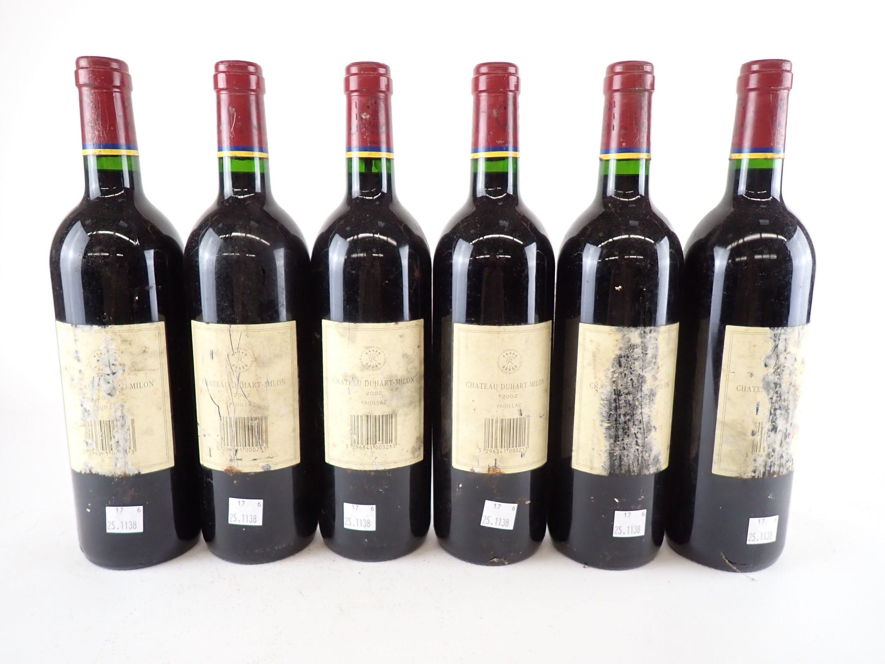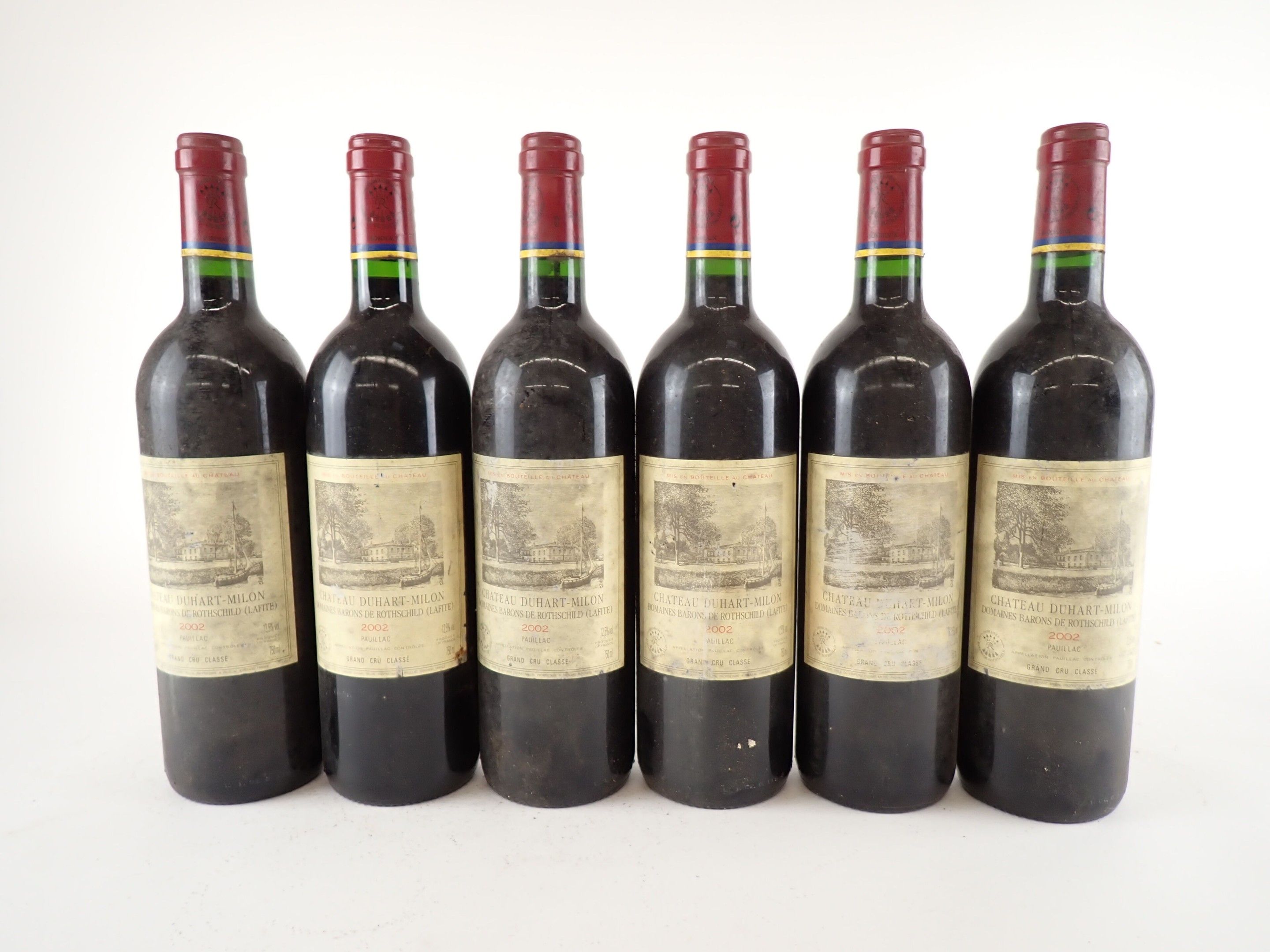 BORDEAUX - 6 bottles, Pauillac, Château Duhart-Milon, 4th Grand Cru Classé, 2002. Caps with traces. Dirty and damaged labels. Back labels dirty and slightly damaged to very damaged.