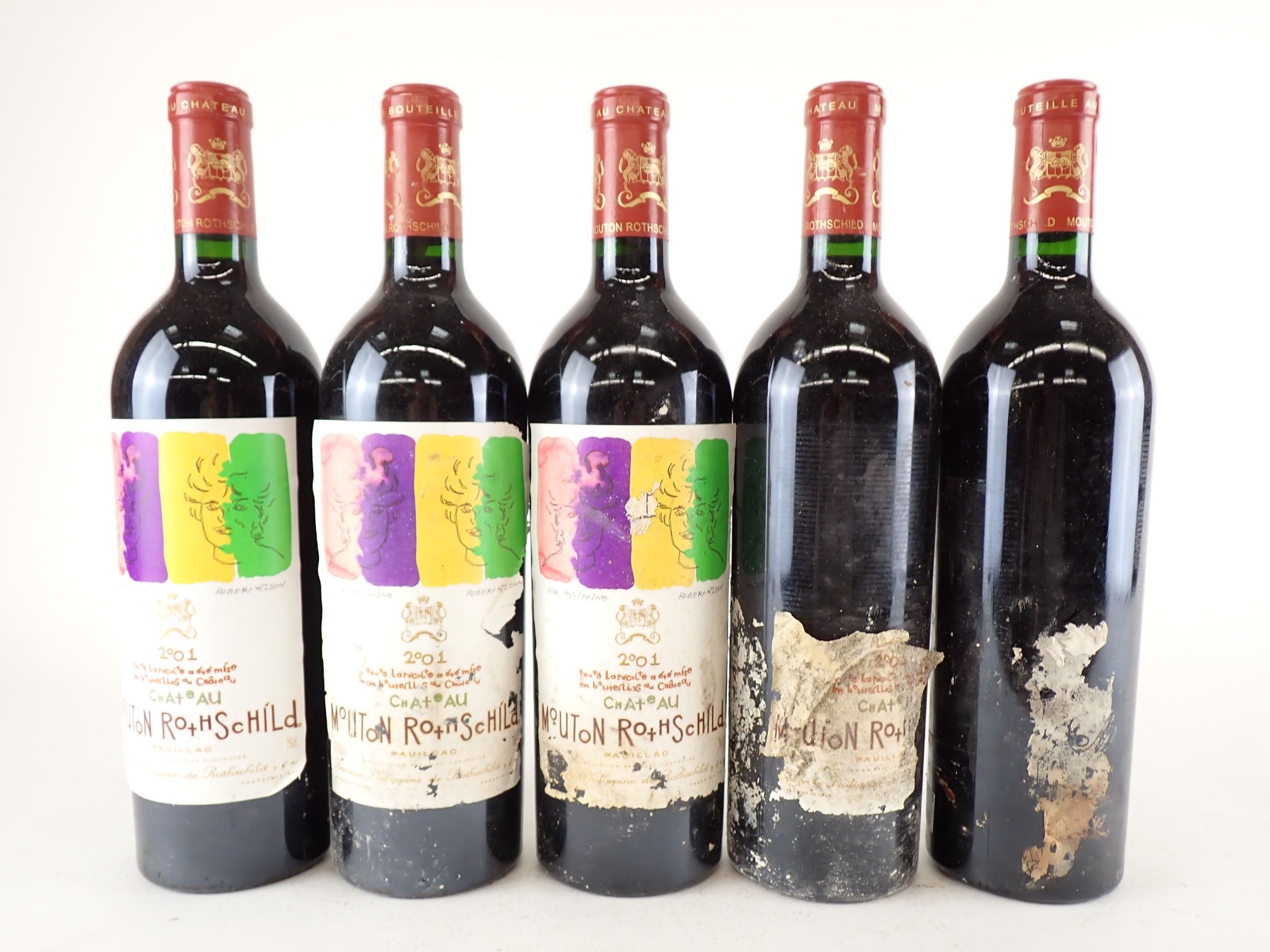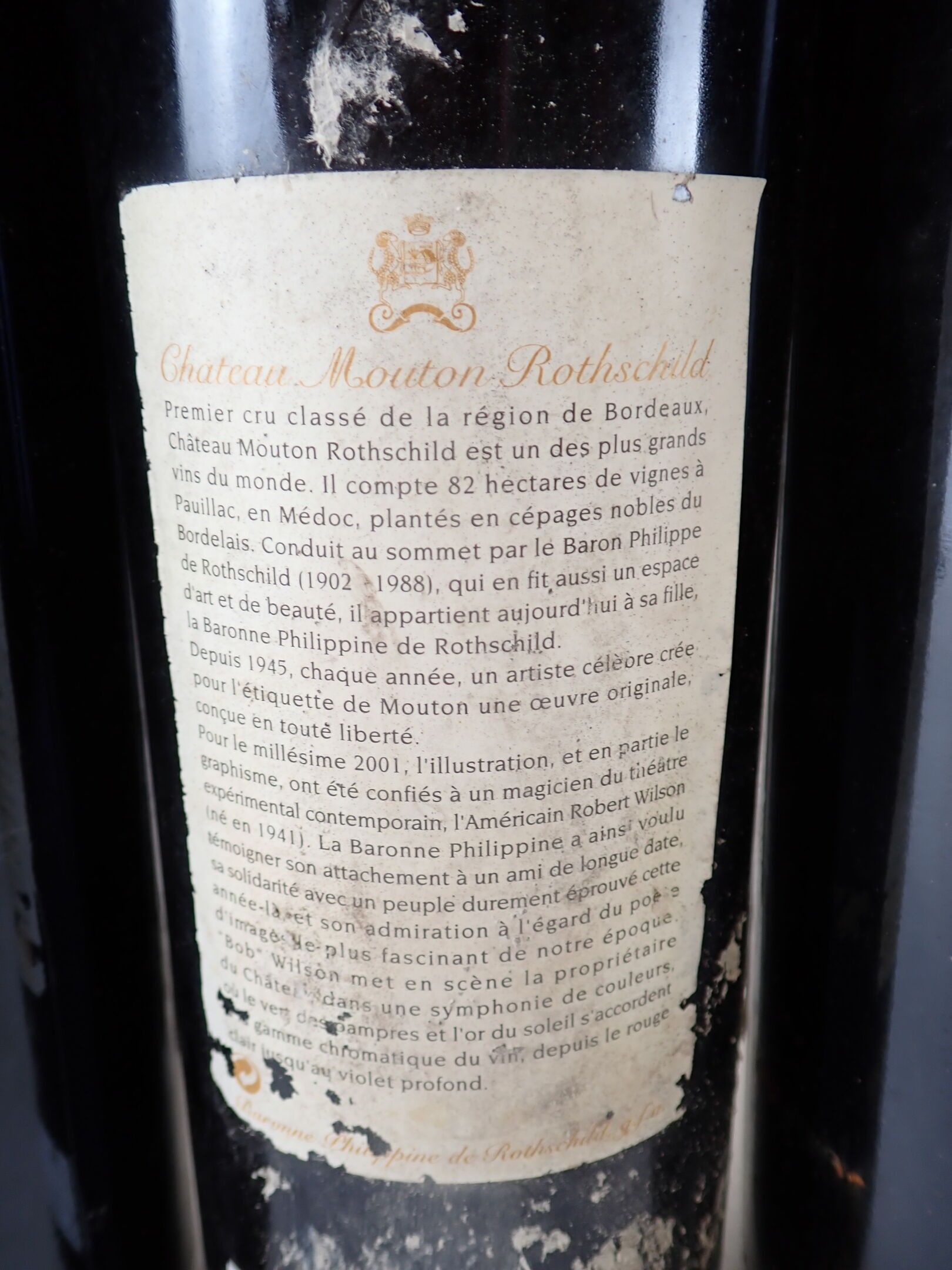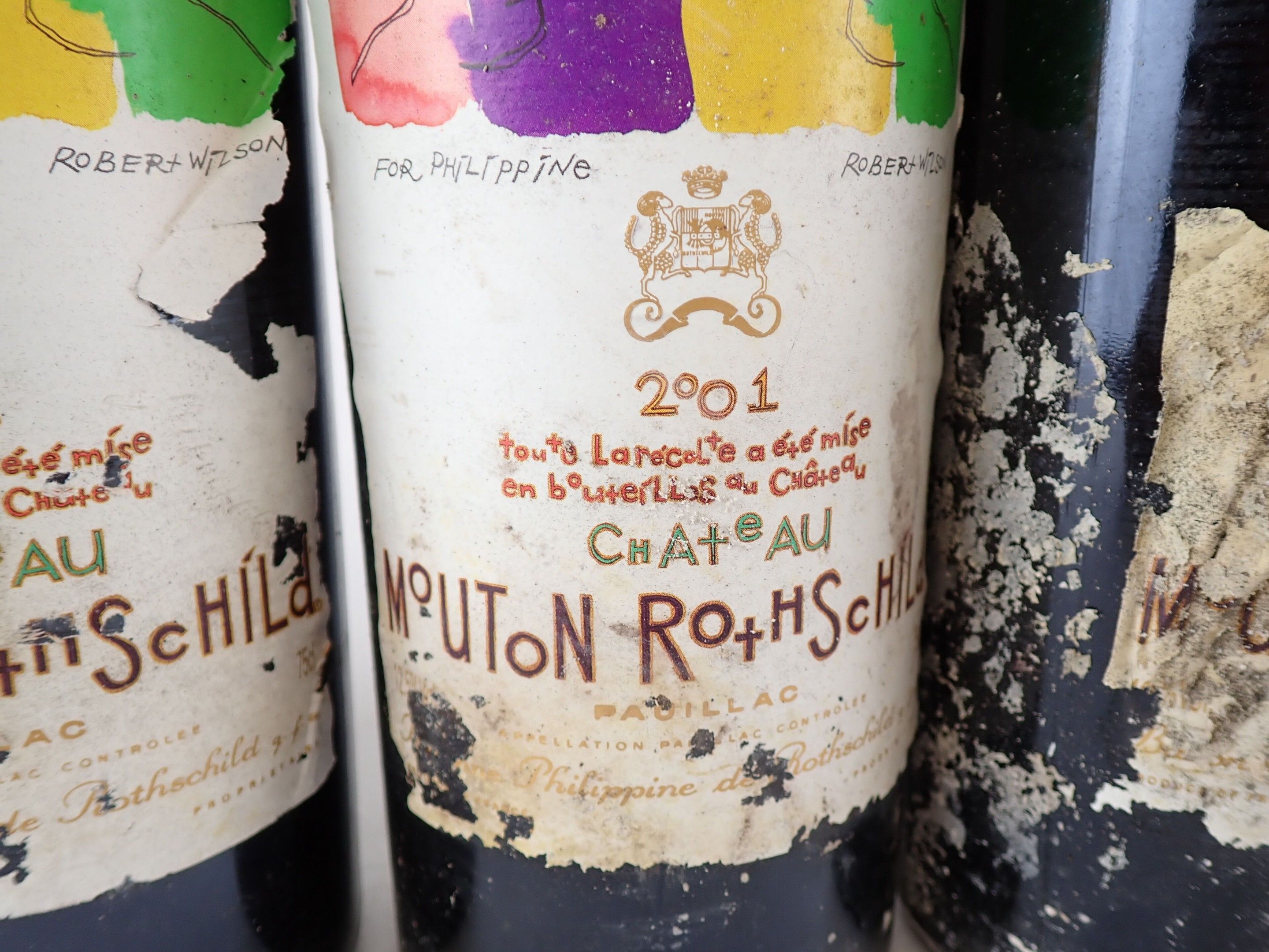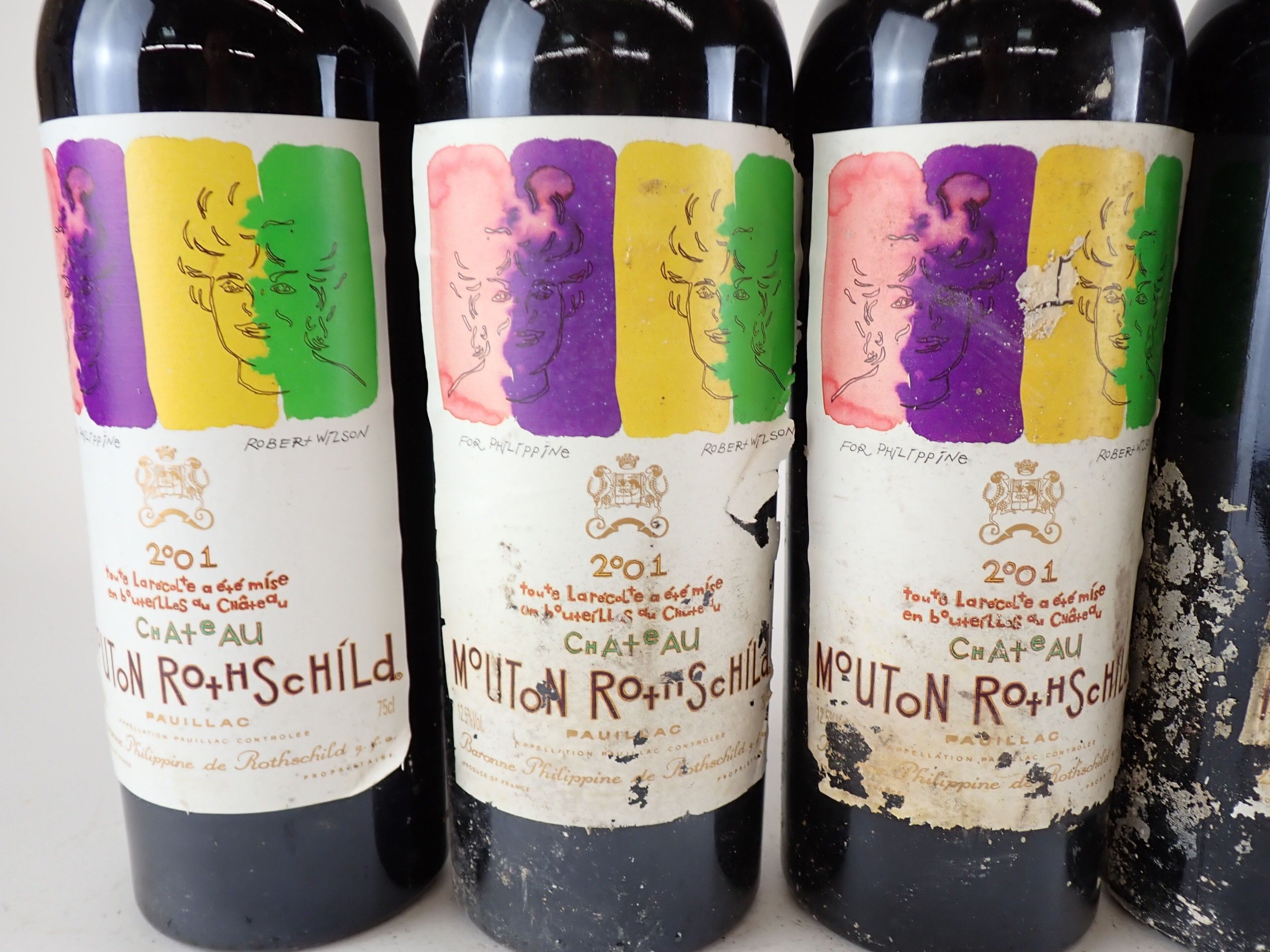 BORDEAUX - 4 bottles, Pauillac, Château Mouton Rothschild, 1er Grand Cru Classé, 2001 (label illustrated by Robert Wilson). Slightly dirty to very dirty and slightly damaged to very damaged labels (1). Two back labels are slightly dirty and damaged. The other two back labels are missing.