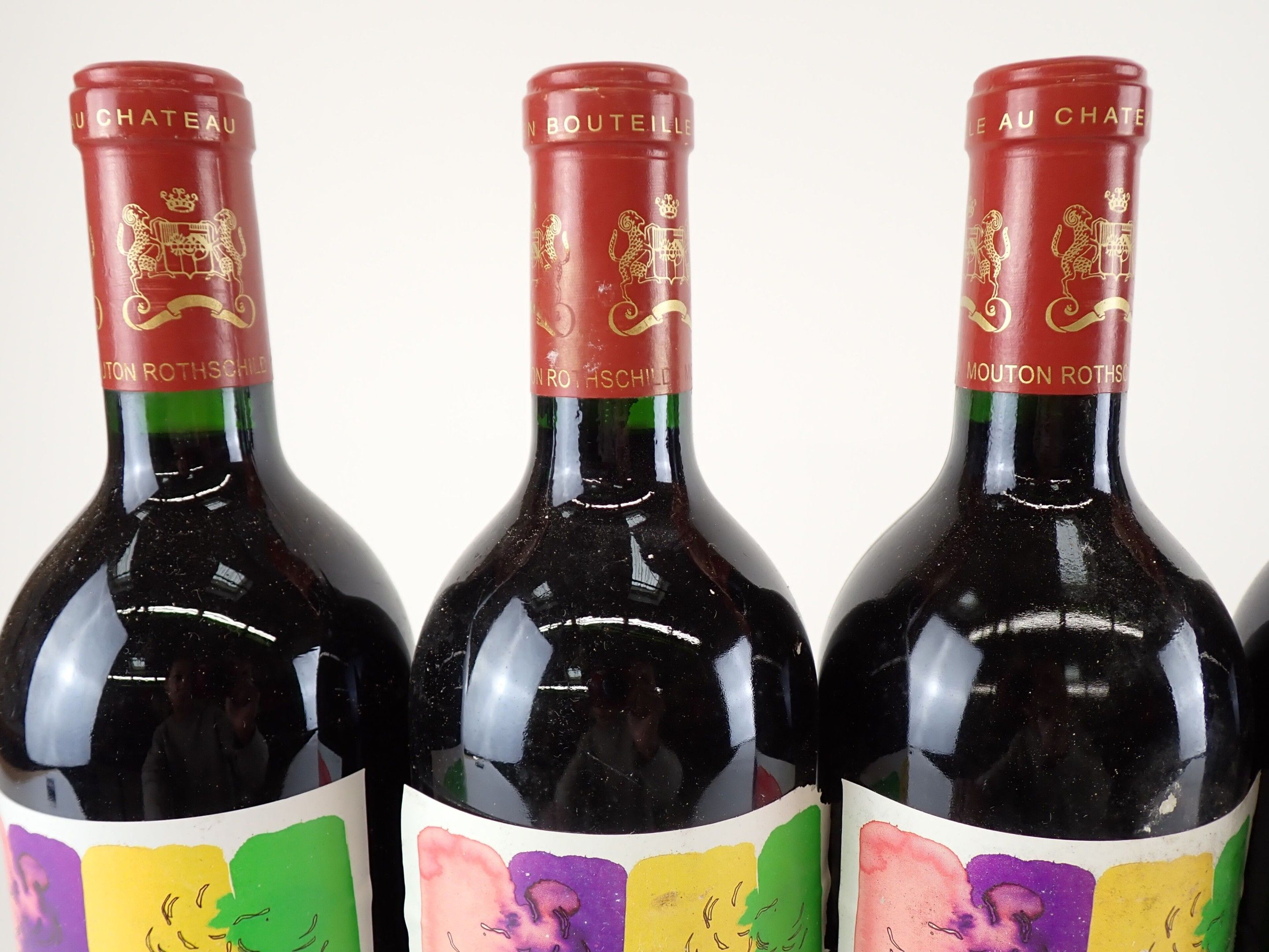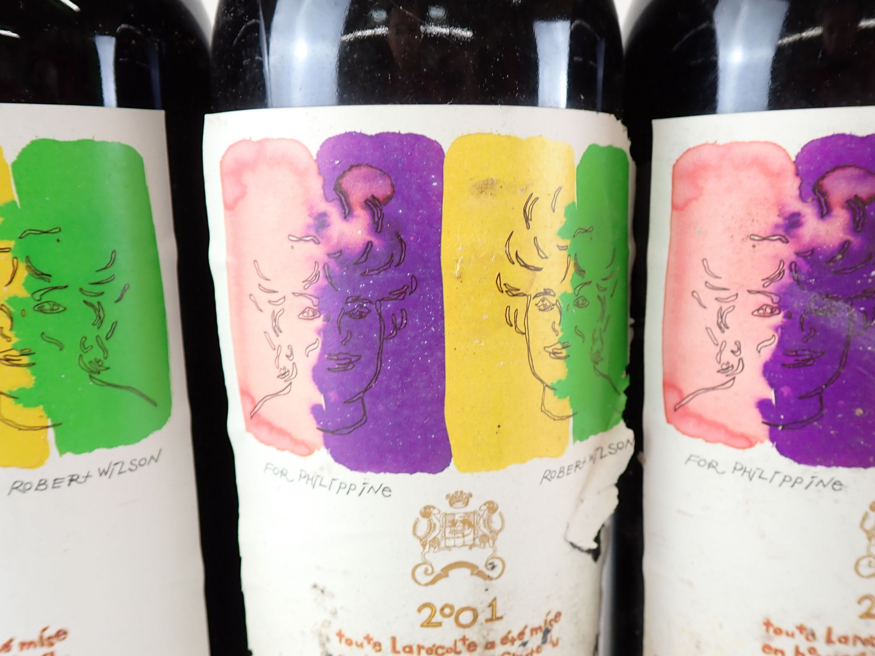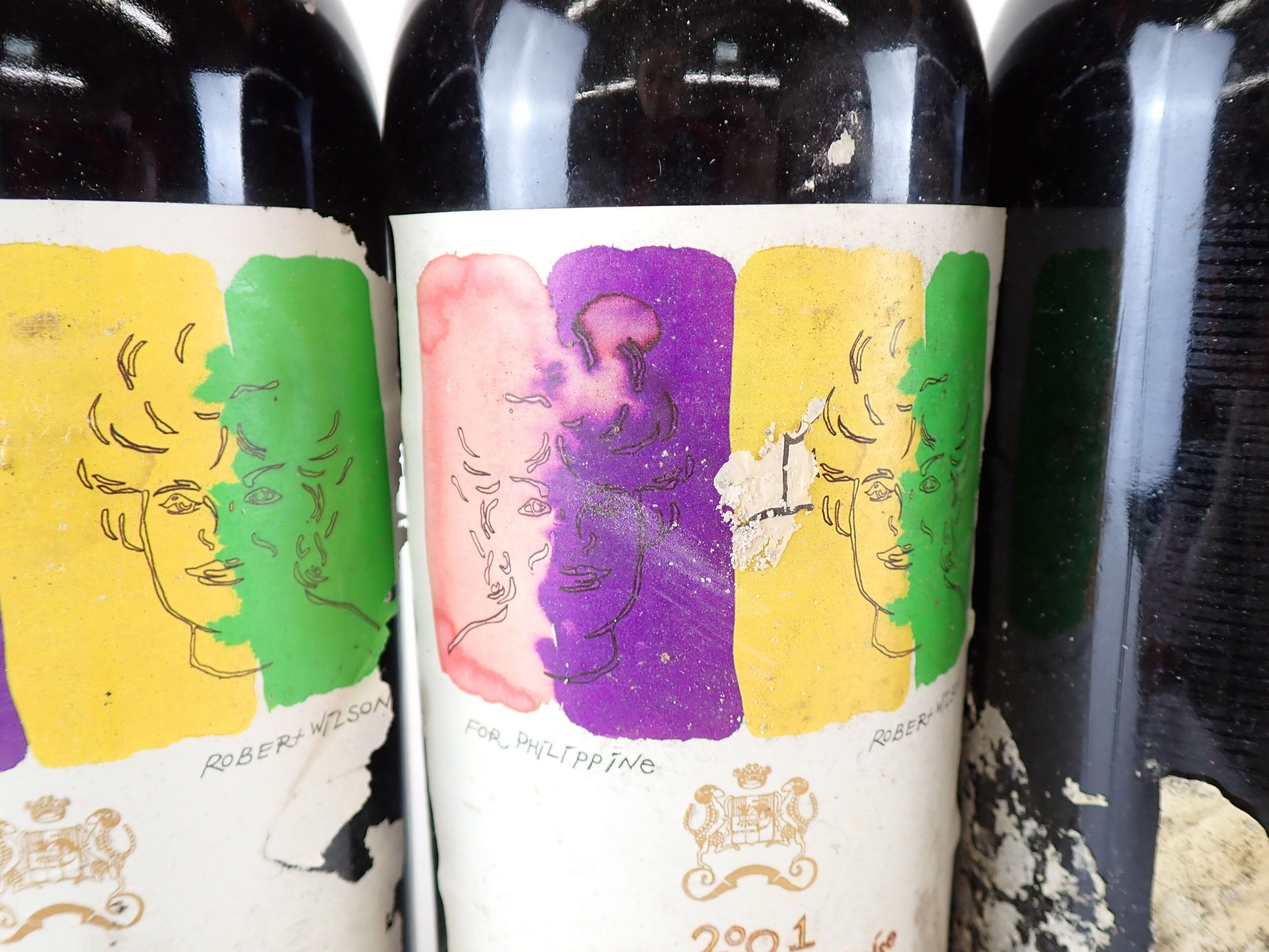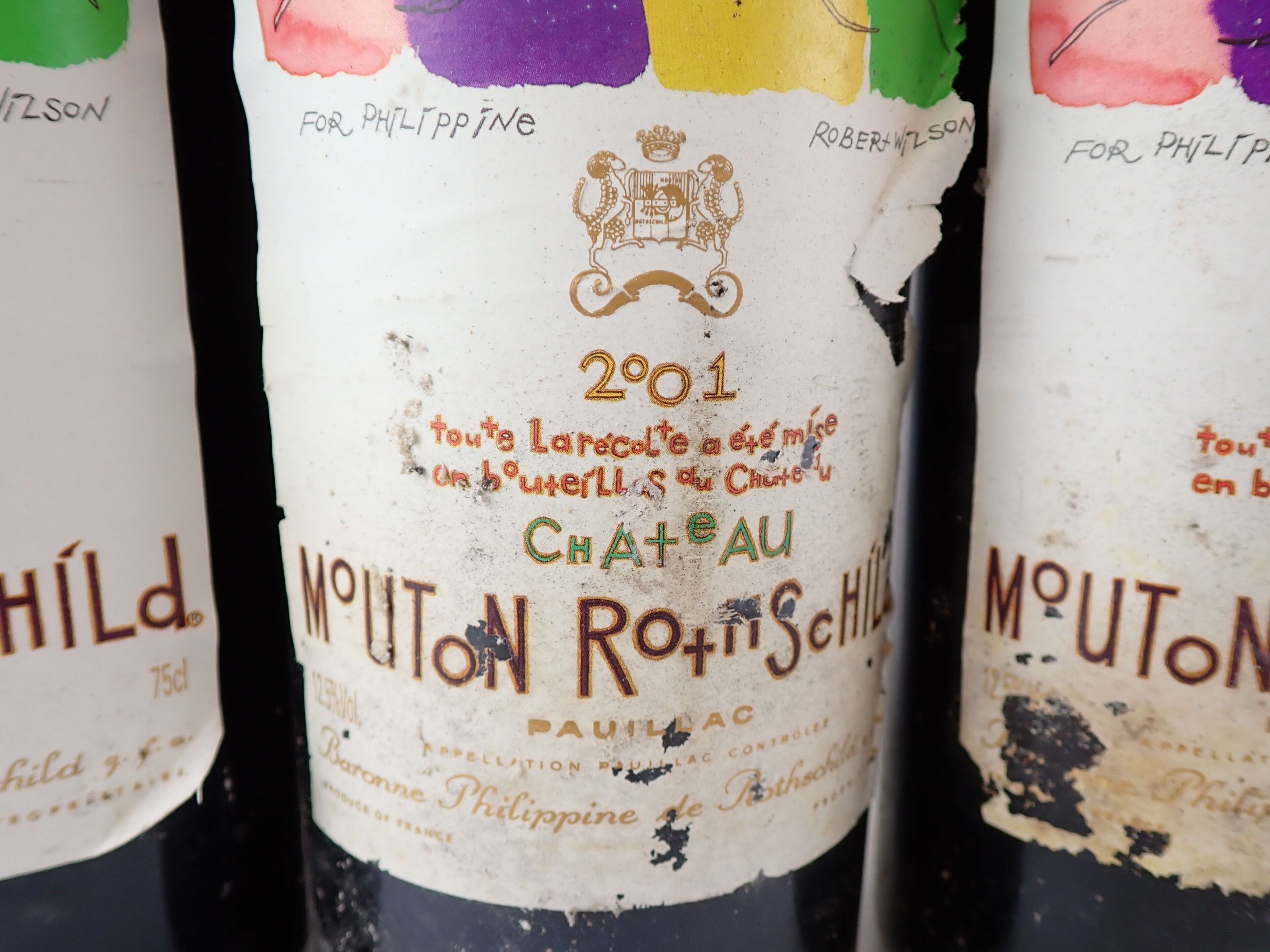 BORDEAUX - 4 bottles, Pauillac, Château Mouton Rothschild, 1er Grand Cru Classé, 2001 (label illustrated by Robert Wilson). Slightly dirty to very dirty and slightly damaged to very damaged labels (1). Two back labels are slightly dirty and damaged. The other two back labels are missing.