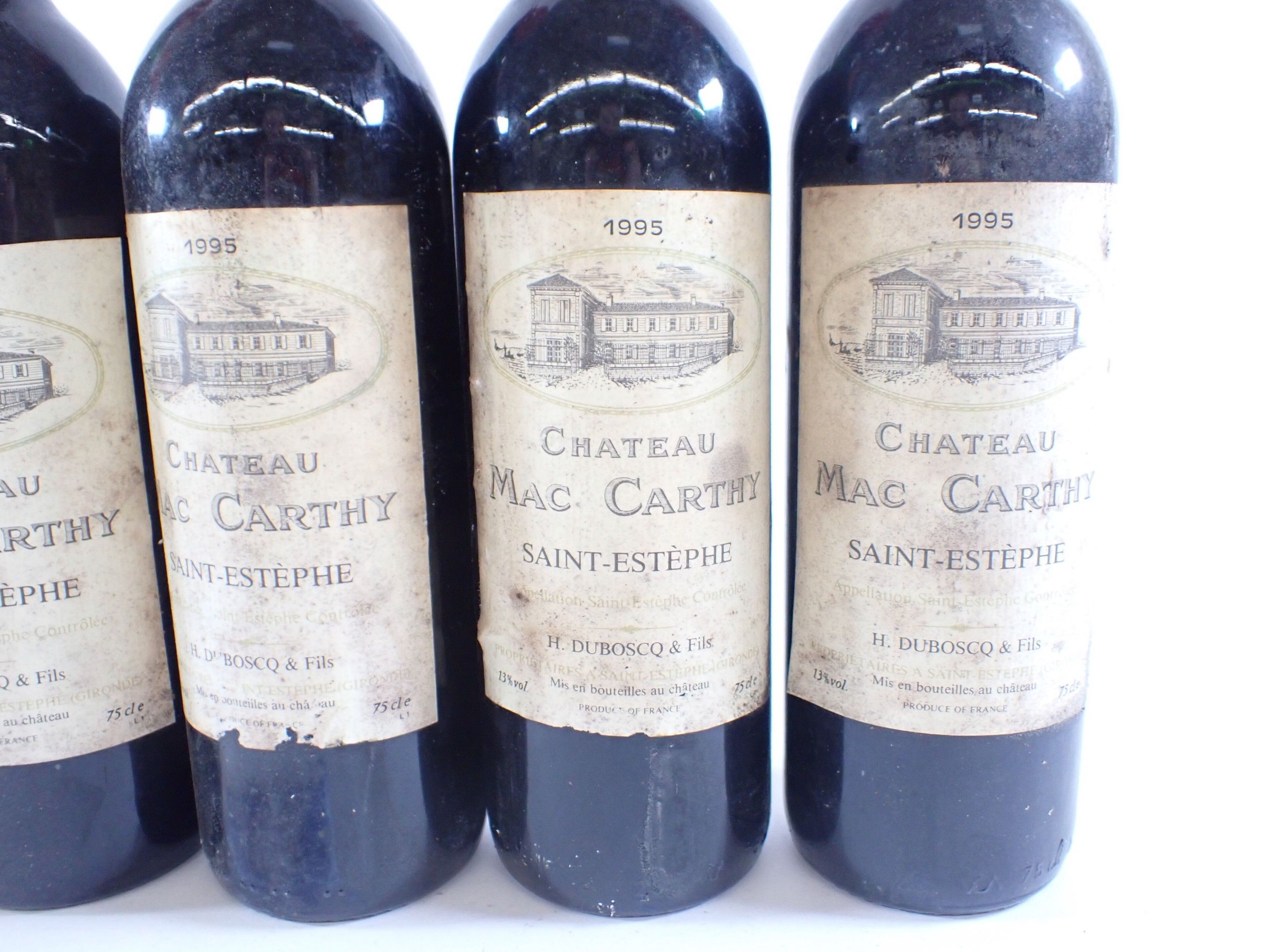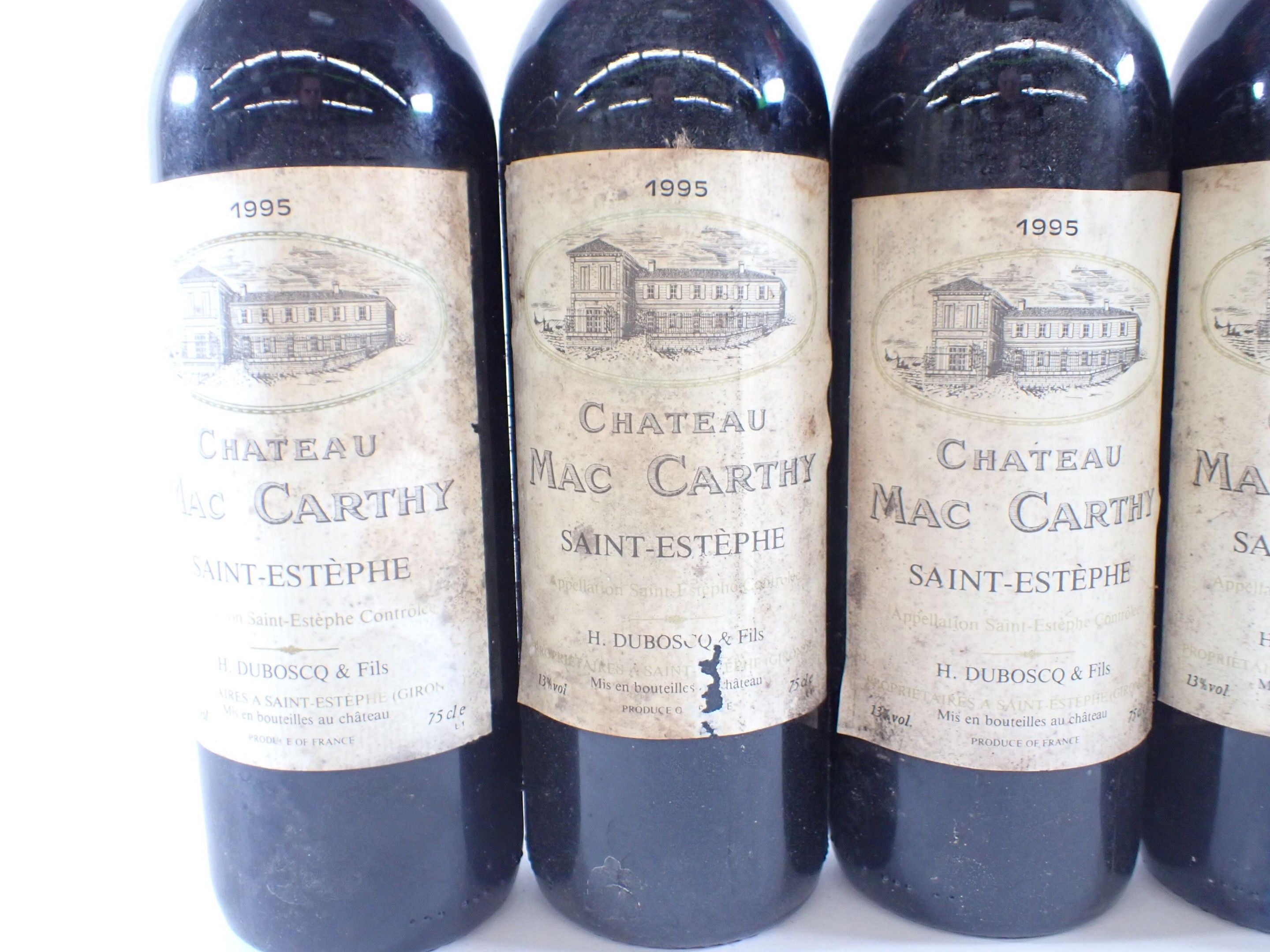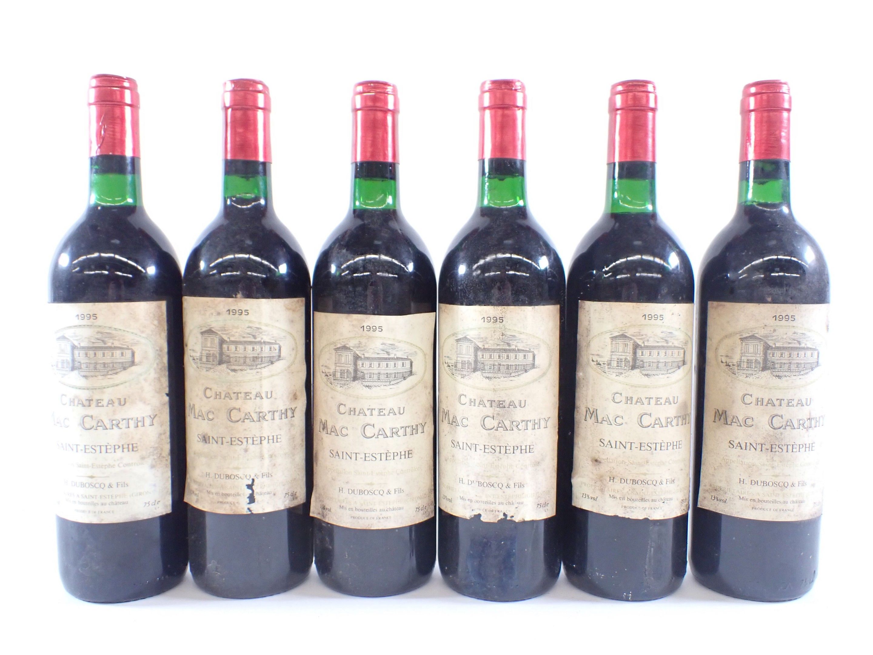 BORDEAUX - 6 bottles, Saint-Estèphe, Château Mac Carthy, 1995. 2 BG (+) and 1 BG. One capsule slightly curved. Dirty labels with peeling spots, four of which are also slightly damaged.