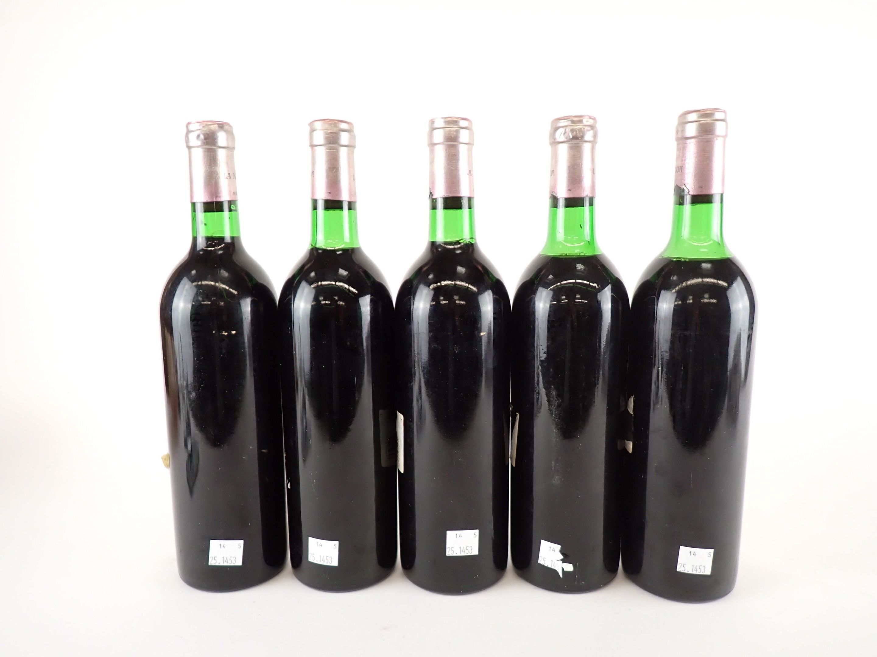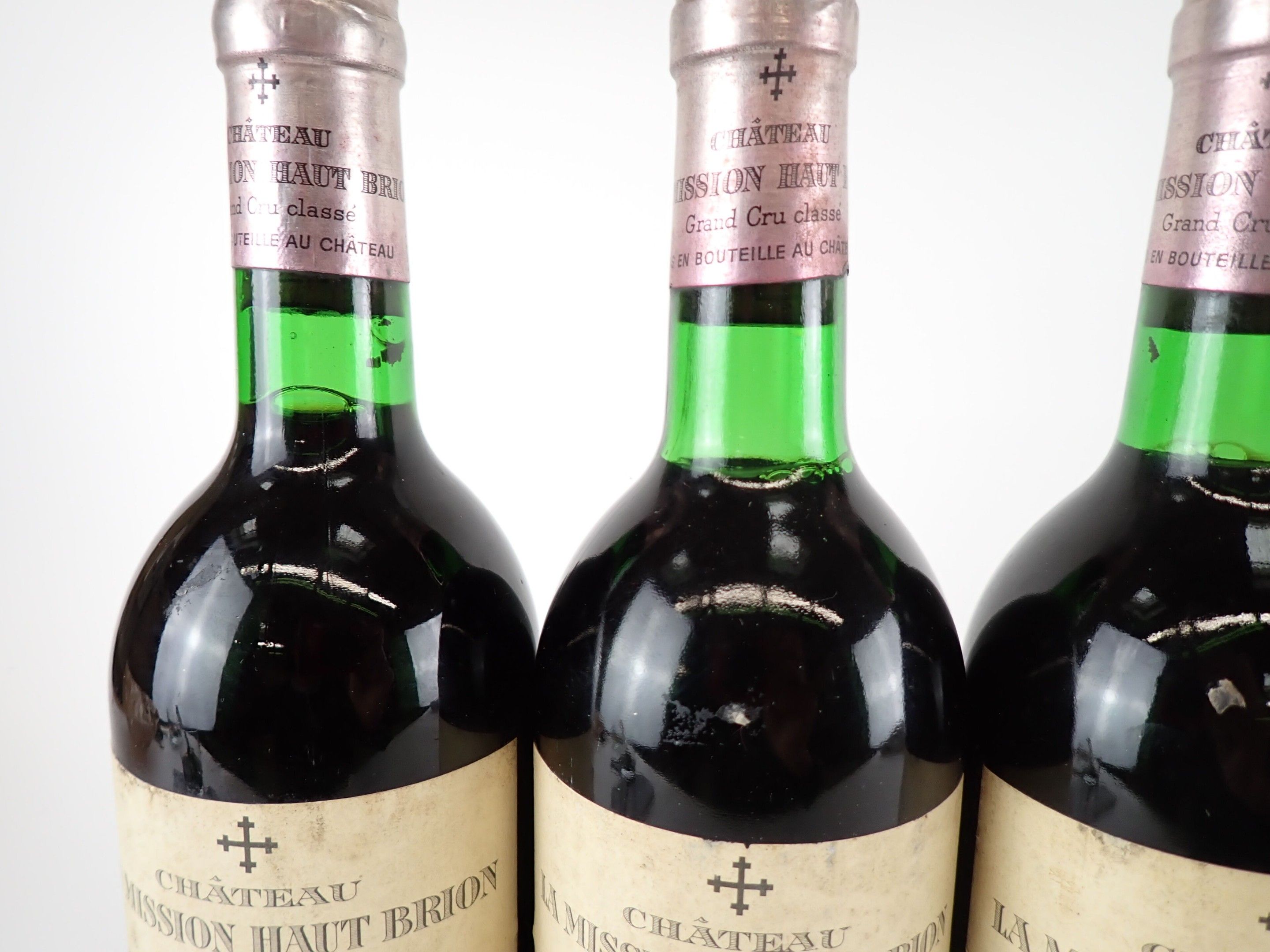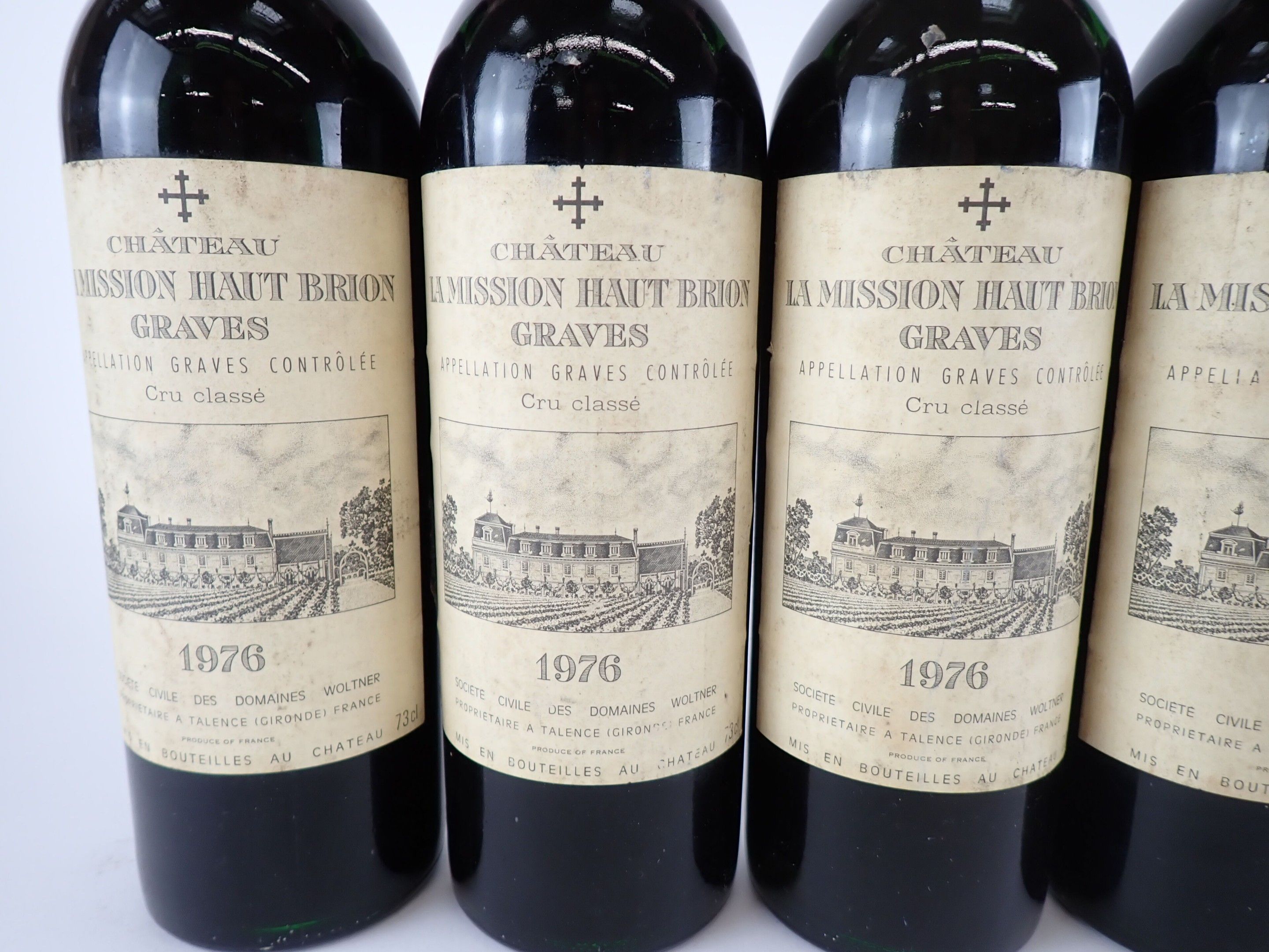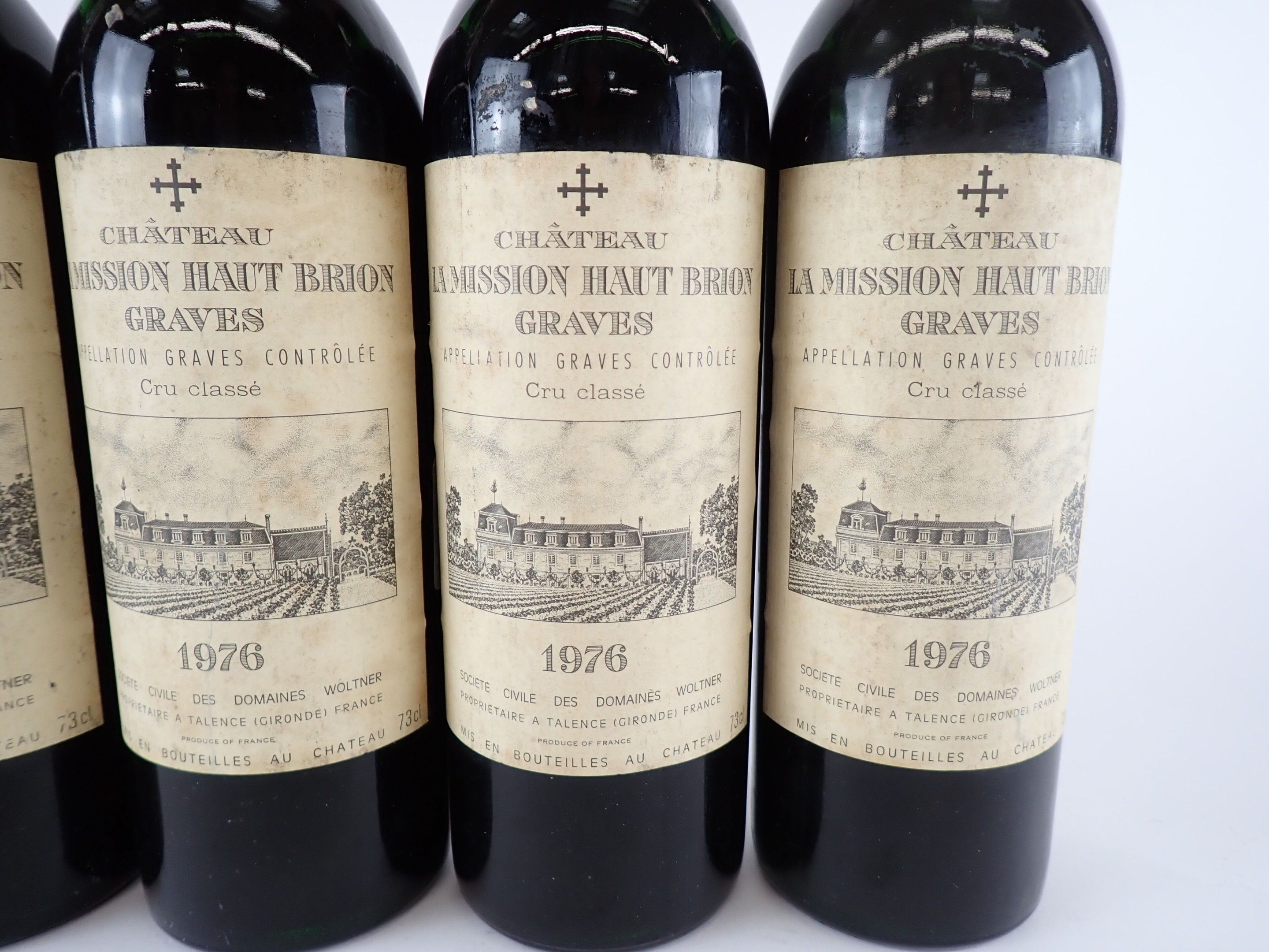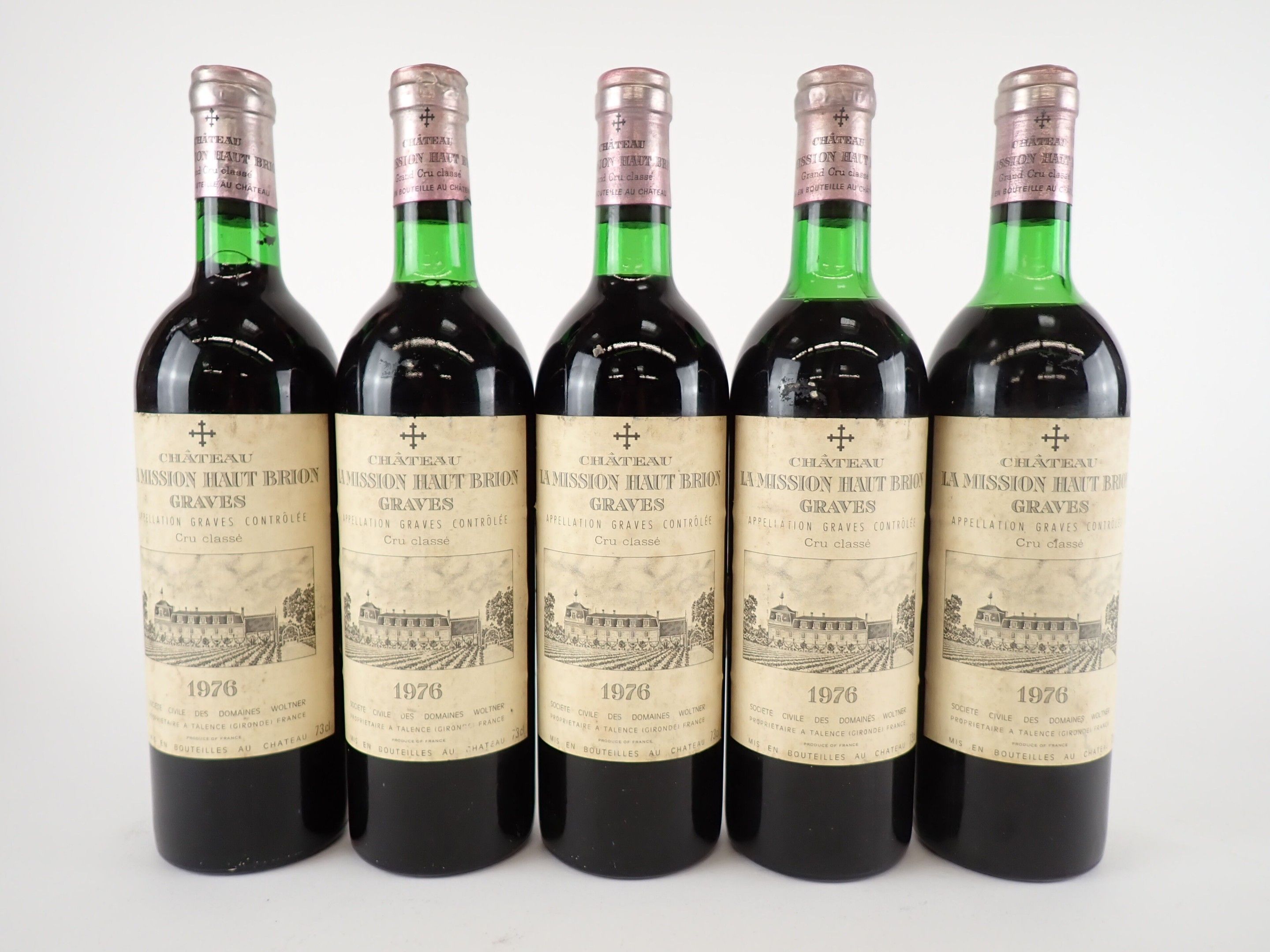 BORDEAUX - 5 bottles, Graves, Château La Mission Haut-Brion, Grand Cru Classé, 1976. 1 BG, 1 BG (-), 1 HE (+) and 1 HE. Capsules with traces, three of which have a small tear at the bottom of the skirt. Slightly dirty labels.