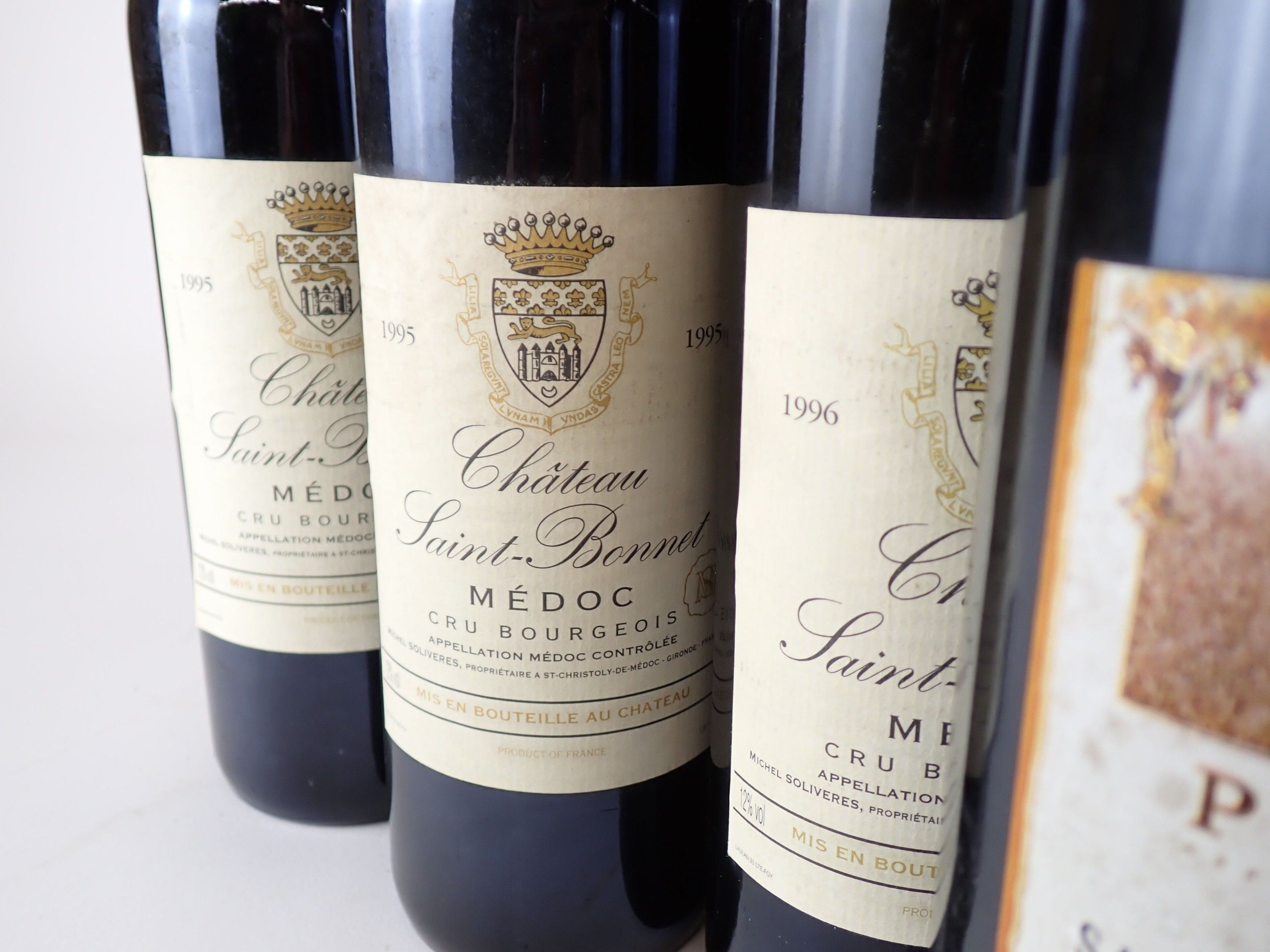 3 bottles, Médoc, Château Saint-Bonnet, Cru Bourgeois, 1995 (2) and 1996 (1). 1 BG (+) and 1 BG. Two very slightly curved capsules. Slightly dirty labels.