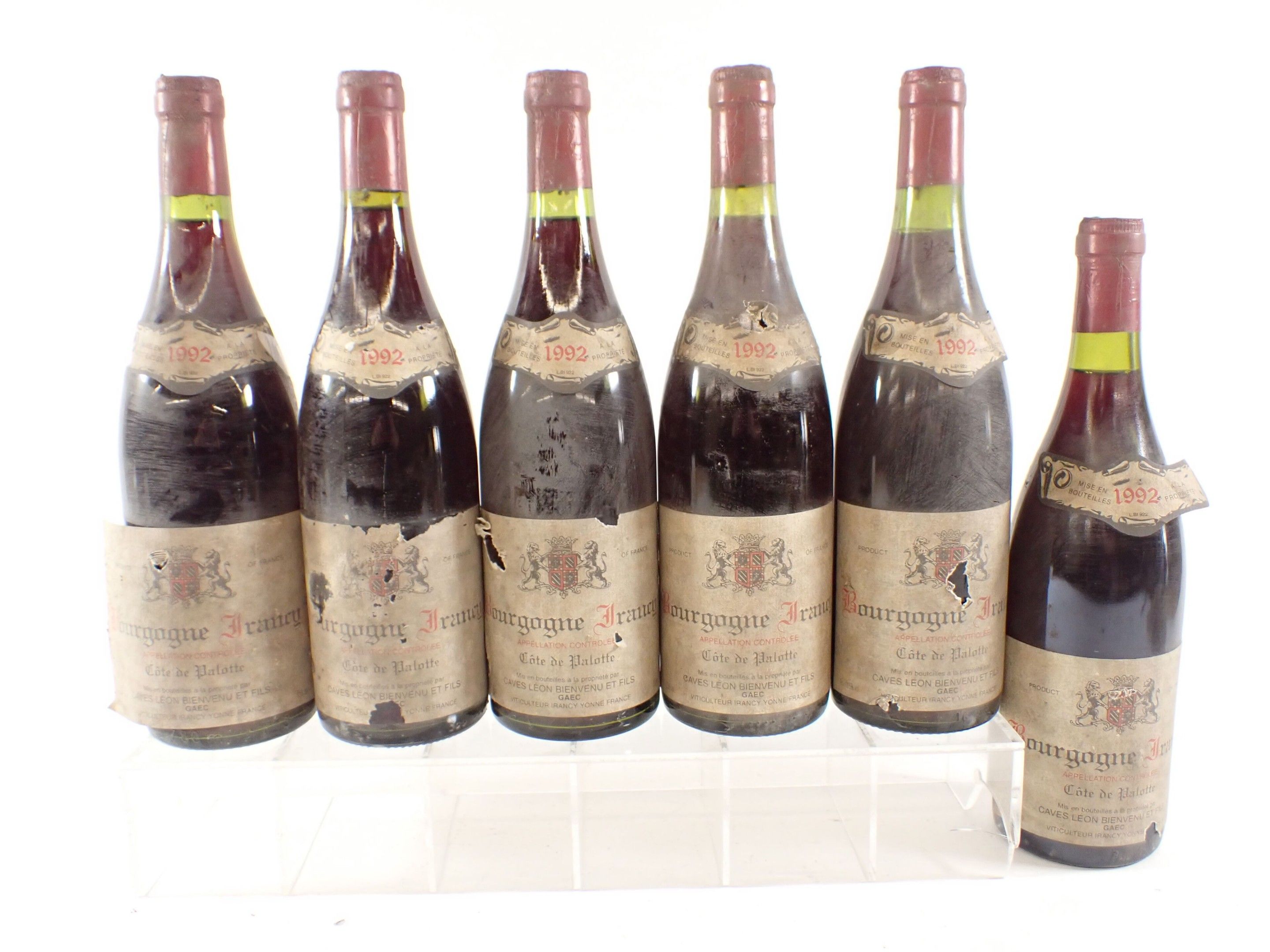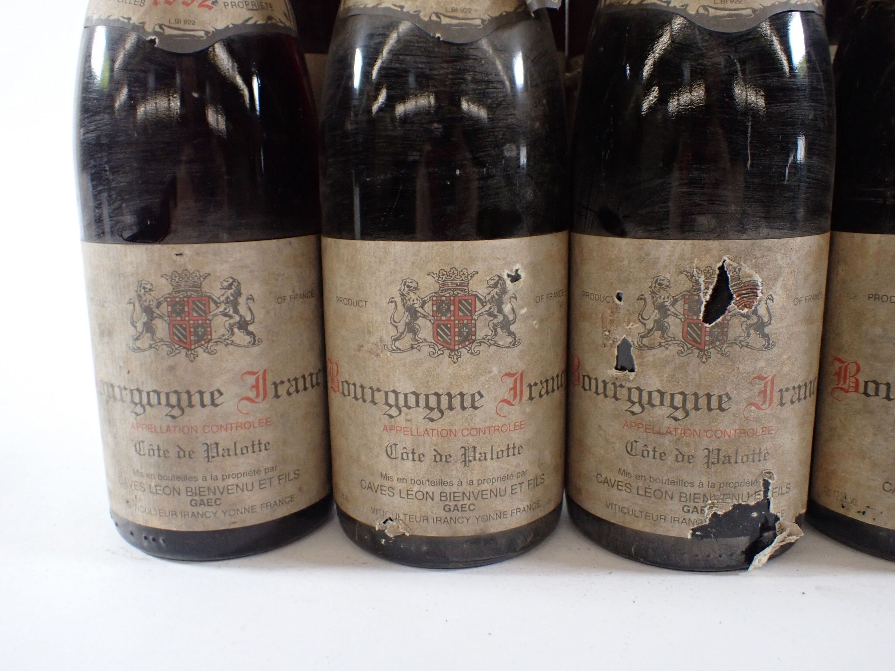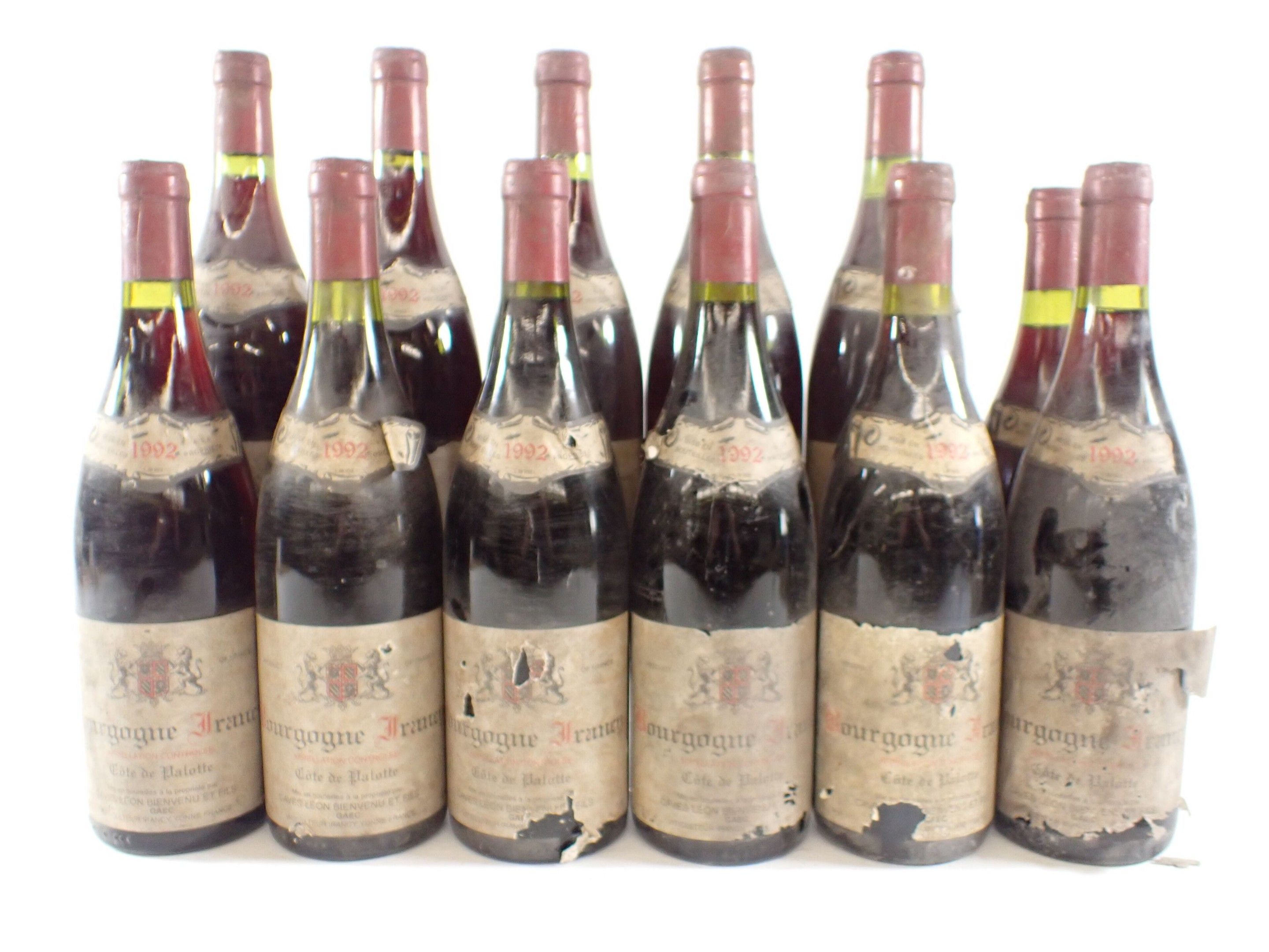 BOURGOGNE - 12 bottles, Bourgogne Irancy, Caves Léon Bienvenu et fils, Côte de Palotte, 1992. Dirty capsules. Collars and labels dirty, degraded and partially detached in some cases.
