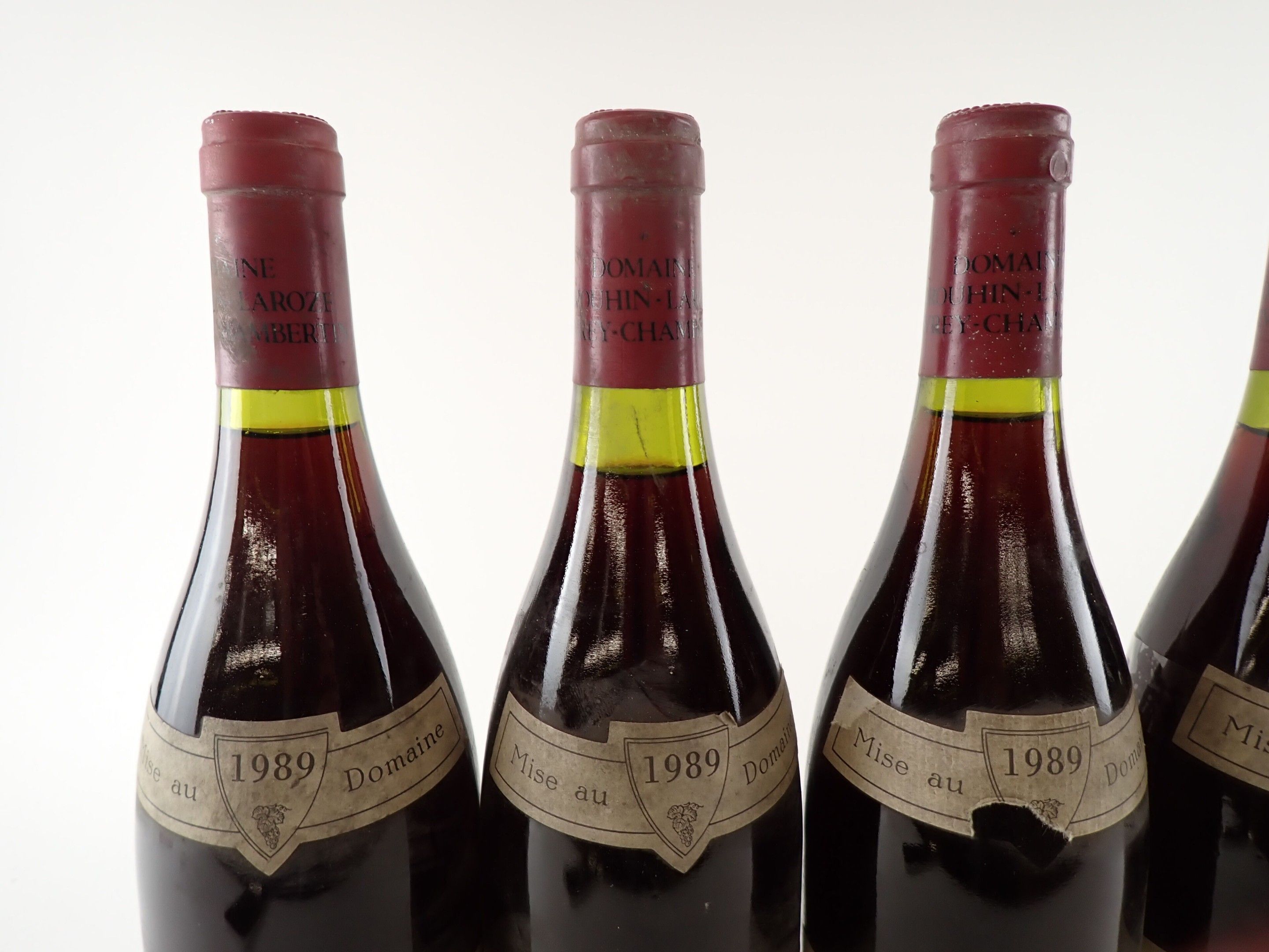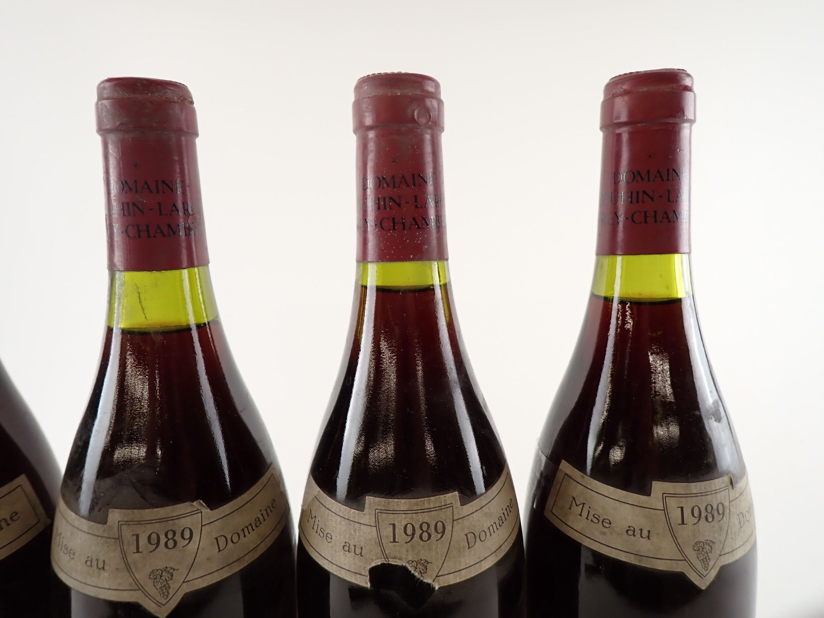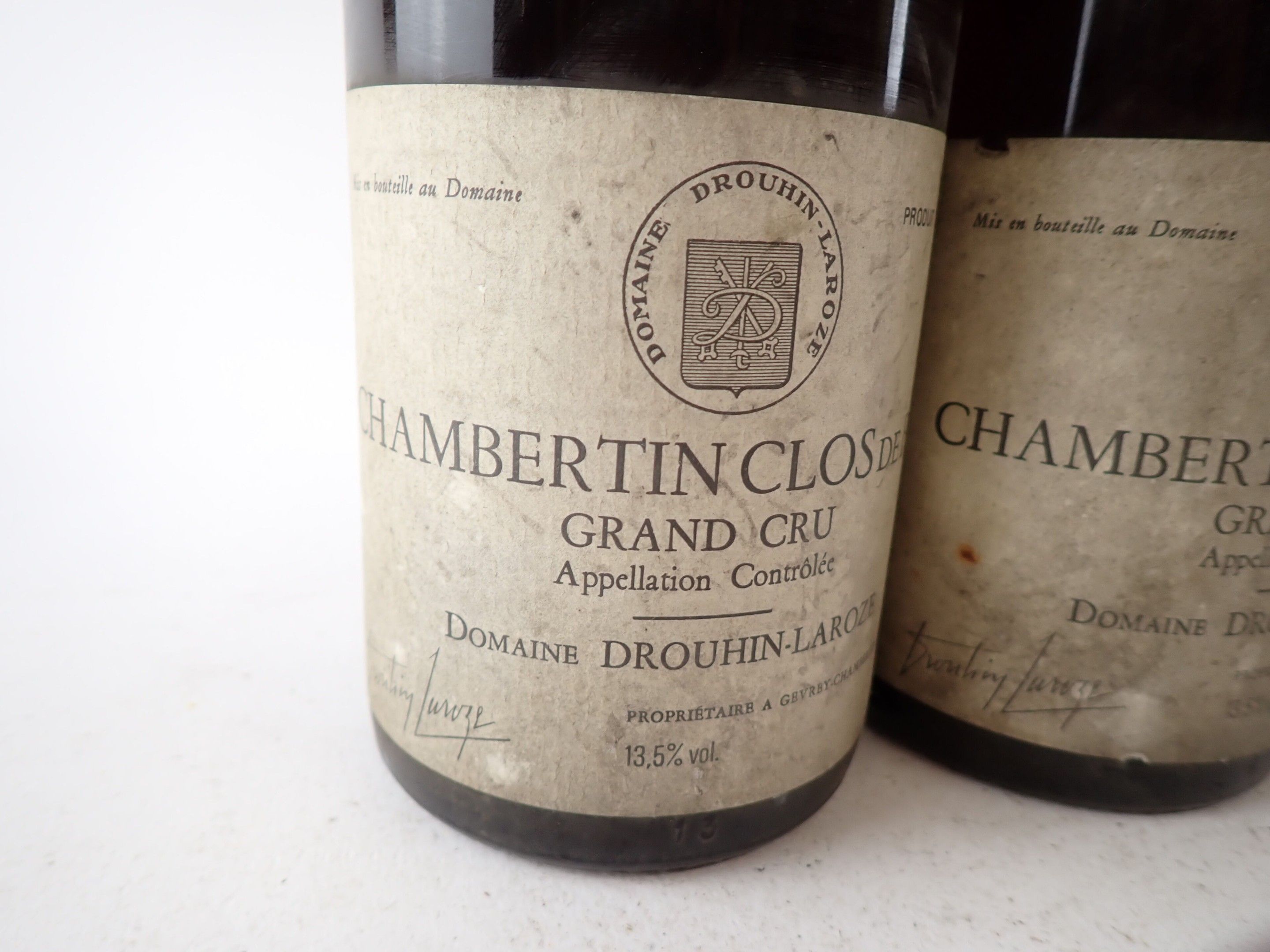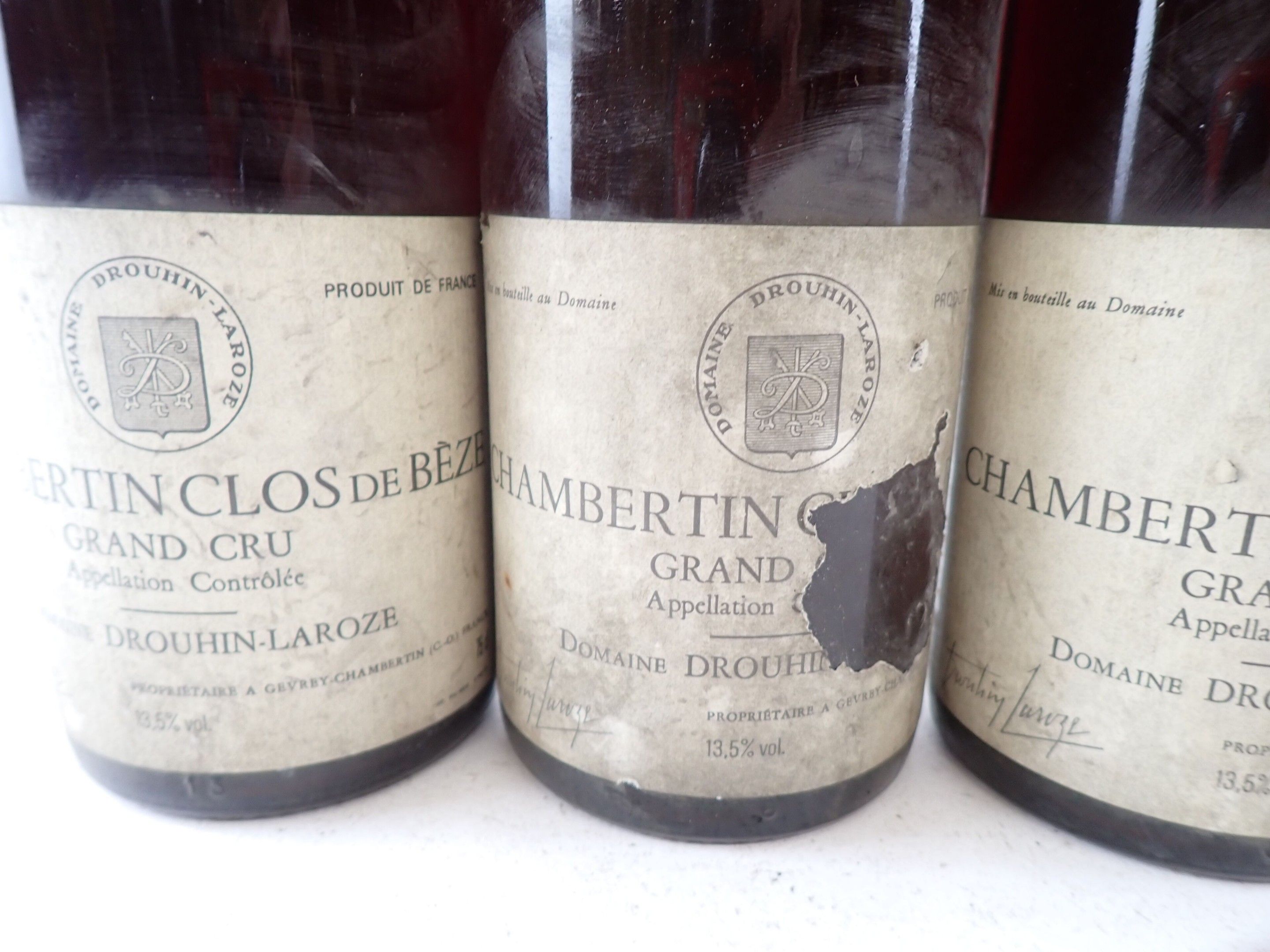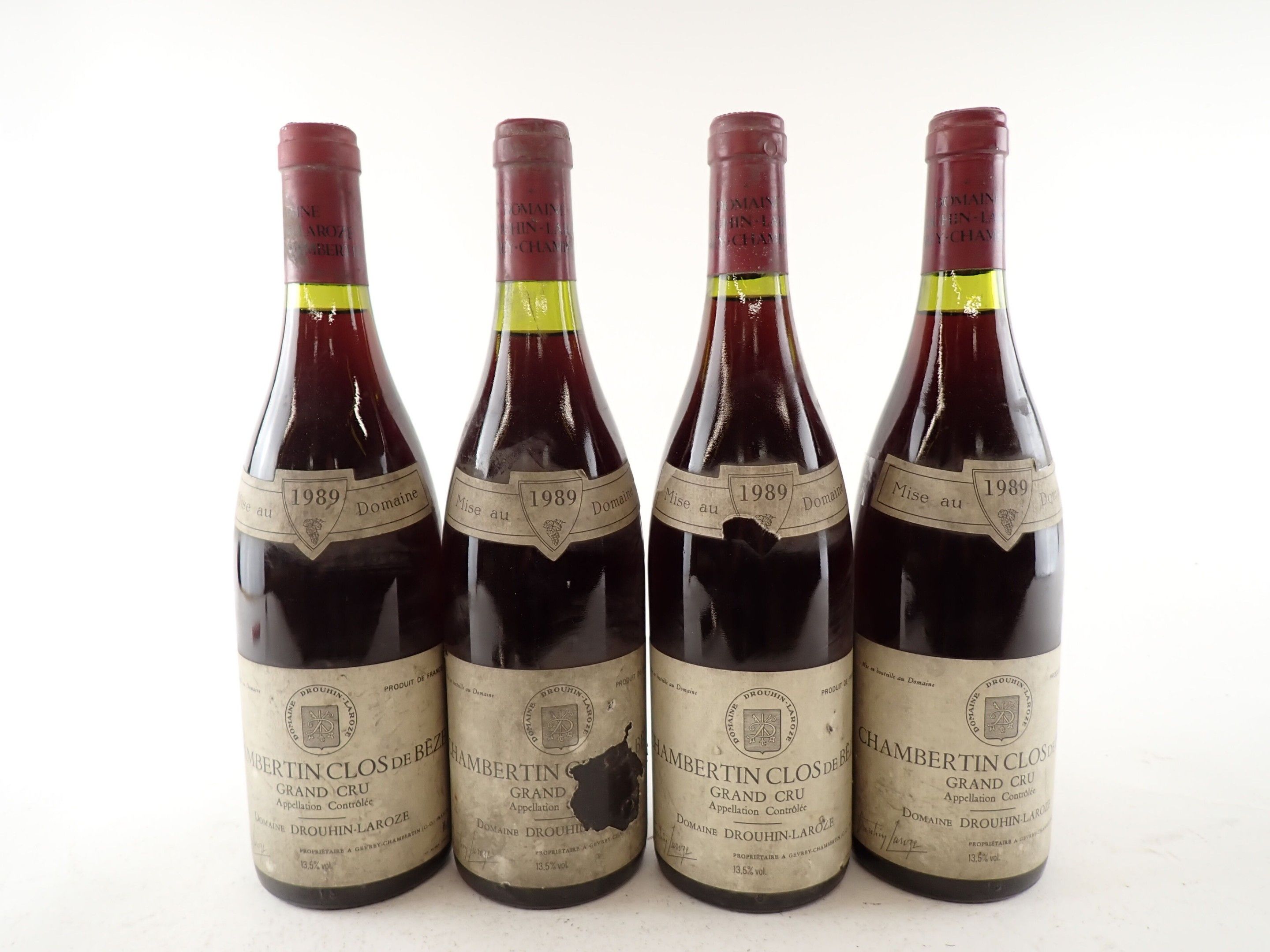 BOURGOGNE - 4 bottles, Chambertin-Clos de Bèze Grand Cru, Domaine Drouhin-Laroze, 1989. Caps slightly dirty to dirty. Dirty collars, one with a tear and another completely detached. Dirty labels, two with small scratches and one with a major missing label.