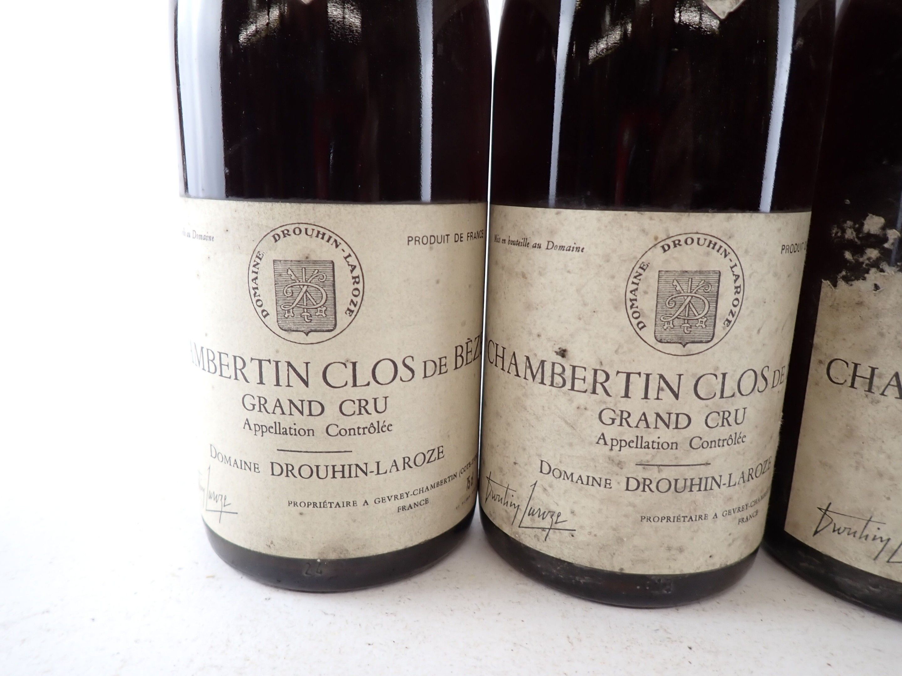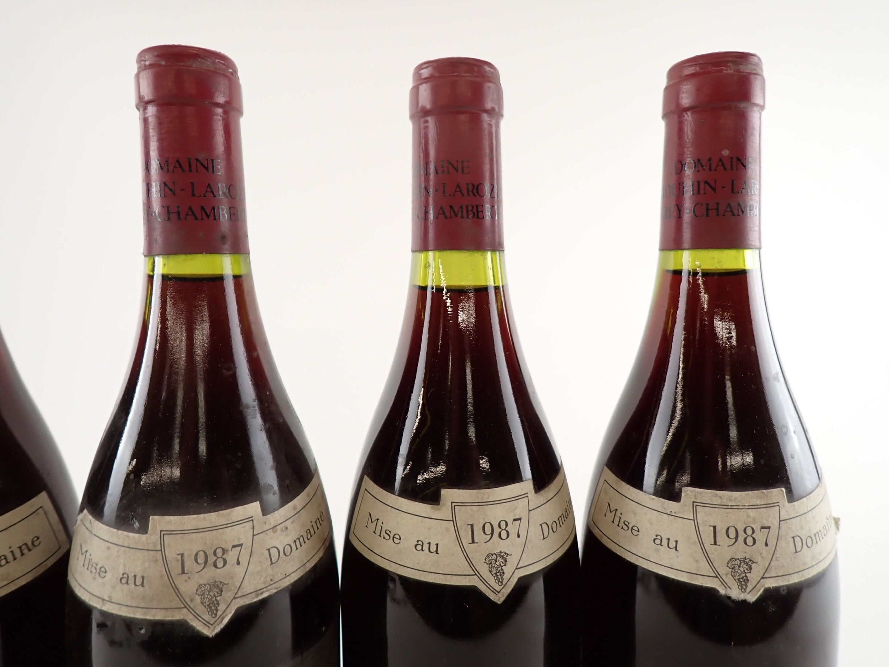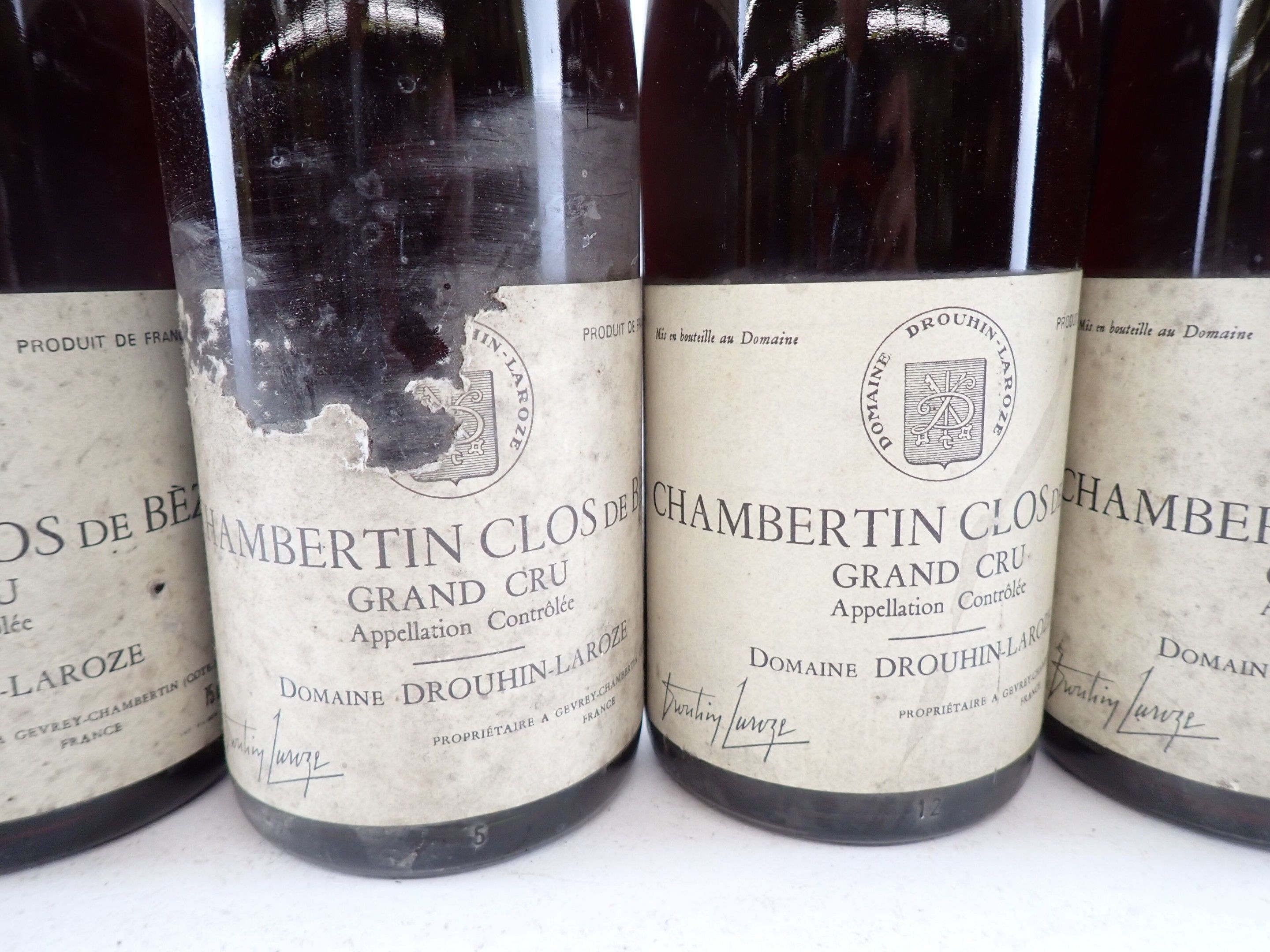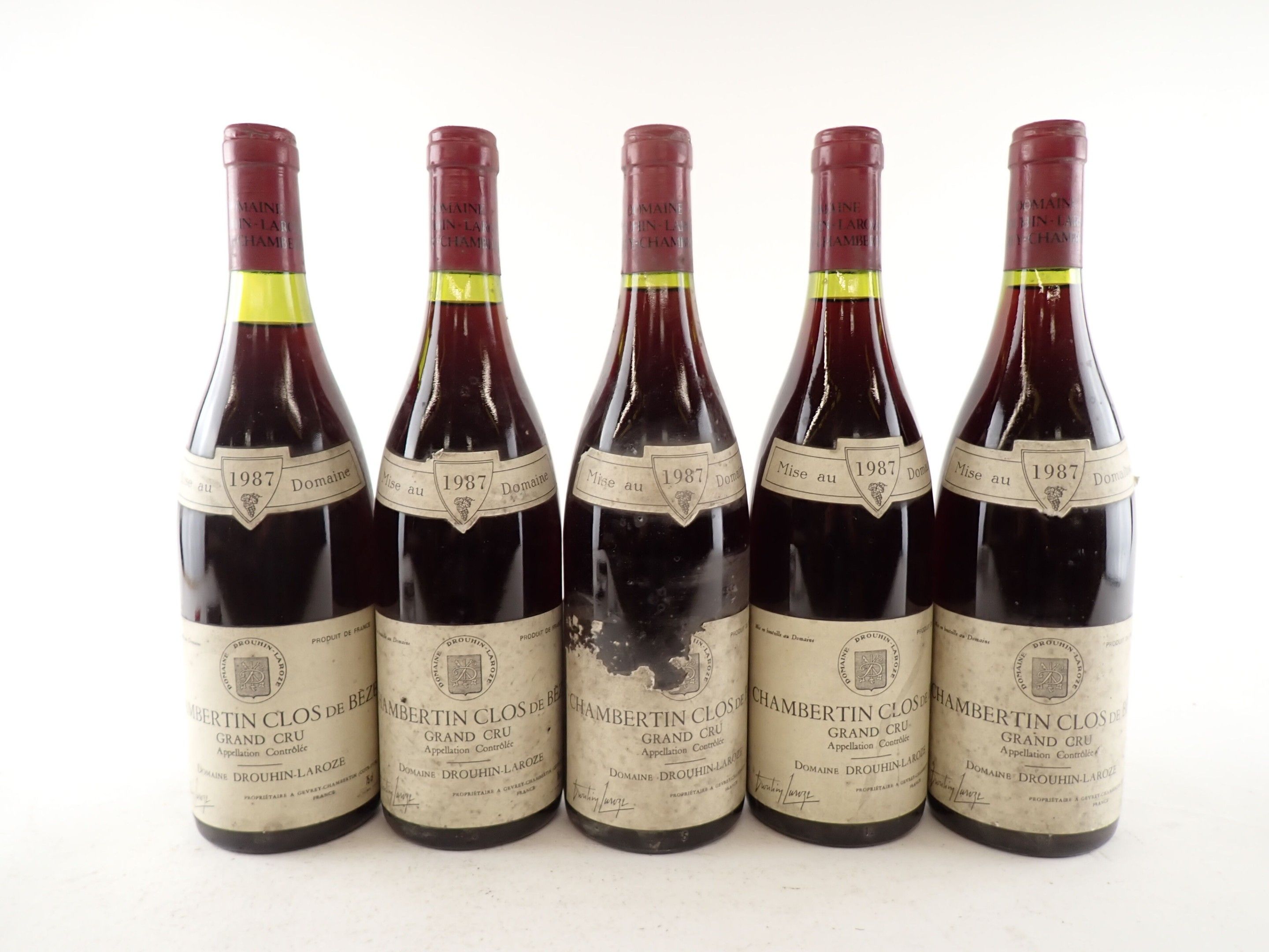 BOURGOGNE - 5 bottles, Chambertin-Clos de Bèze Grand Cru, Domaine Drouhin-Laroze, 1987. Caps slightly dirty to dirty. Collars and labels slightly dirty to dirty. Labels slightly dirty to dirty, one of which has a large tear at the top.