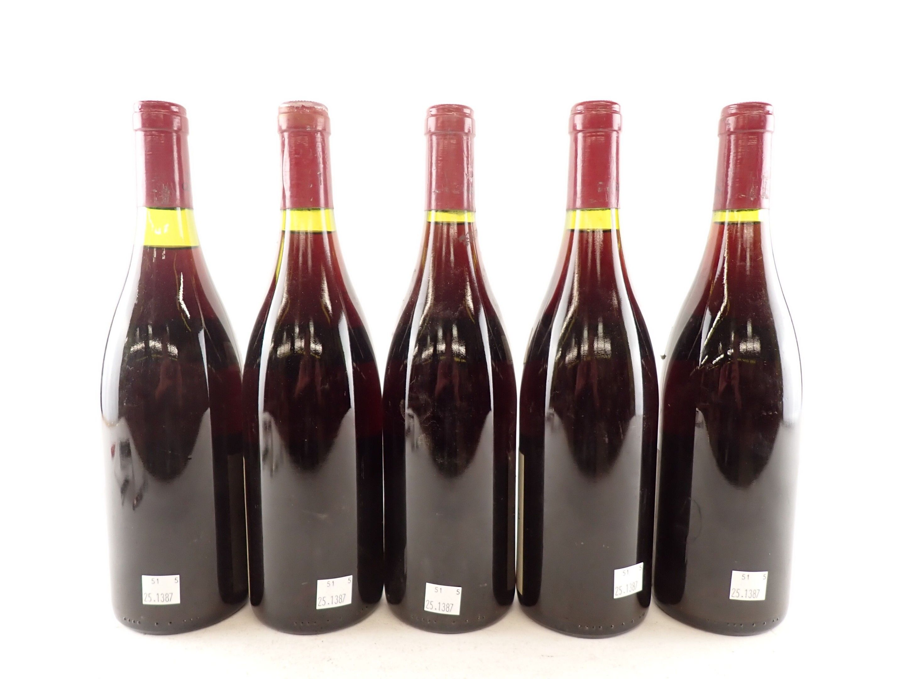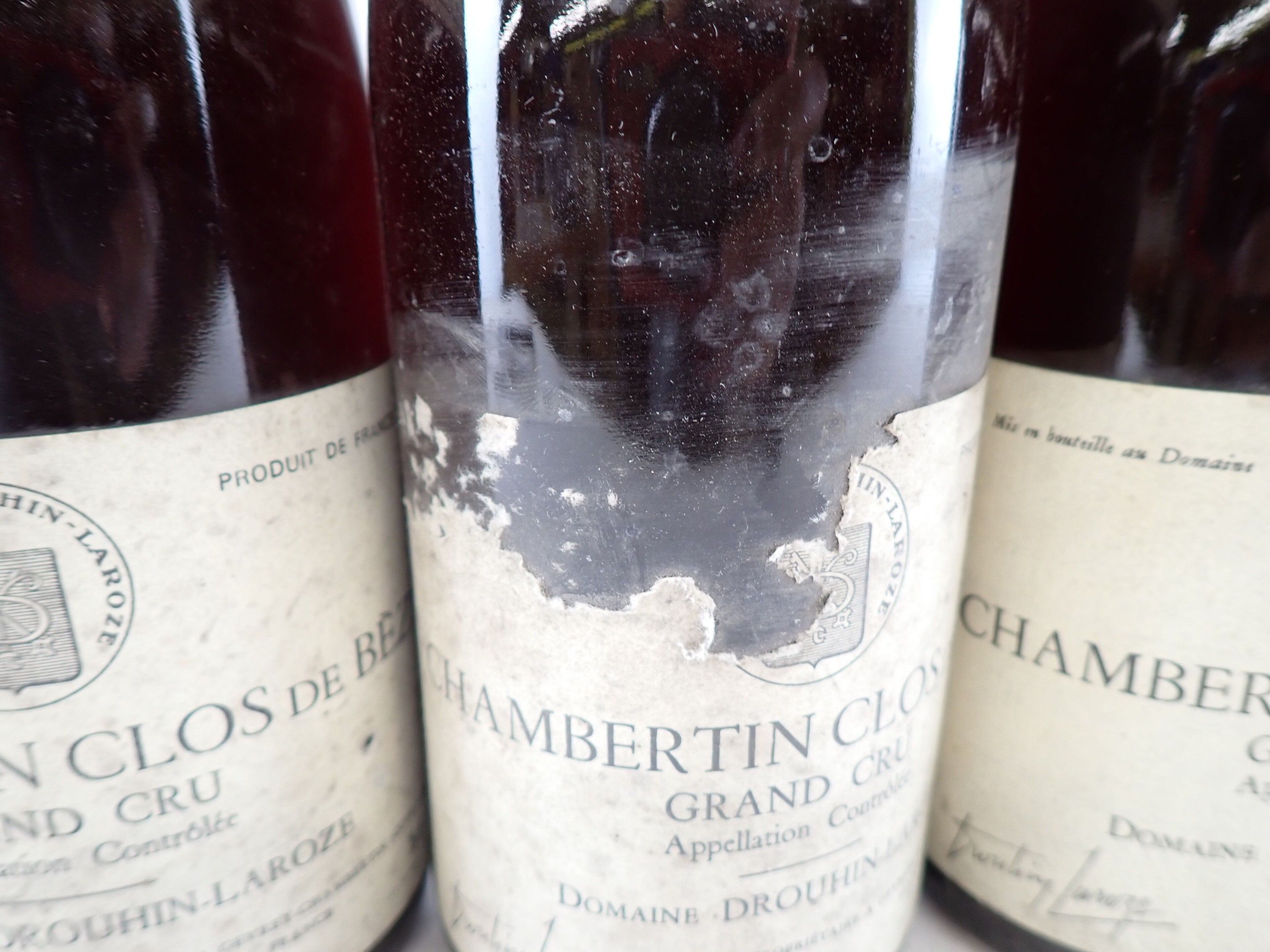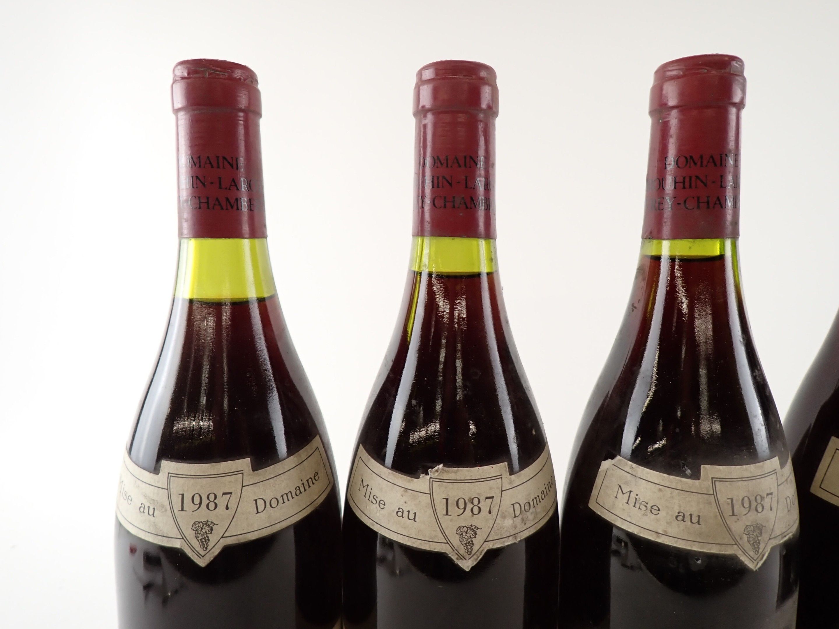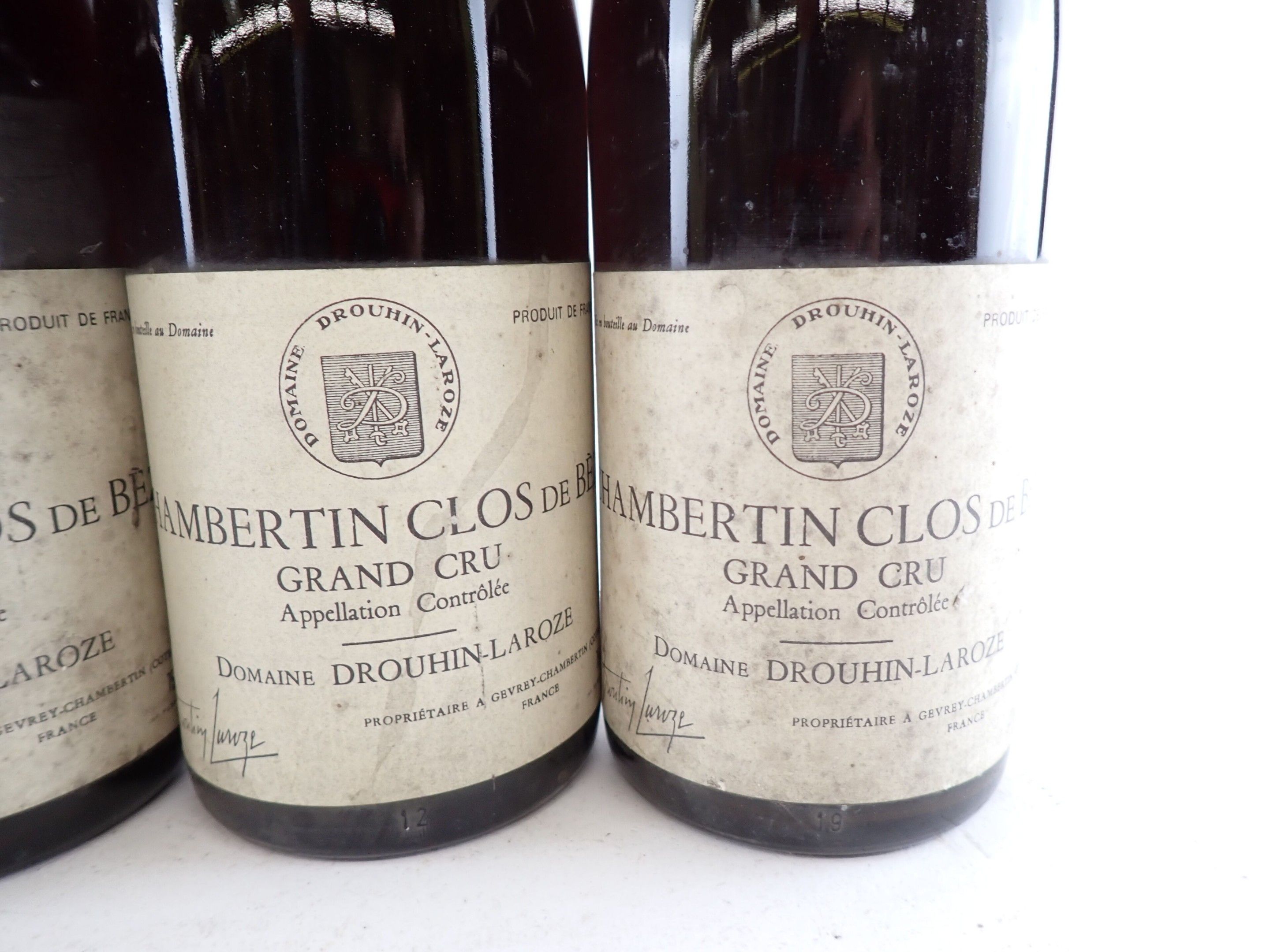 BOURGOGNE - 5 bottles, Chambertin-Clos de Bèze Grand Cru, Domaine Drouhin-Laroze, 1987. Caps slightly dirty to dirty. Collars and labels slightly dirty to dirty. Labels slightly dirty to dirty, one of which has a large tear at the top.