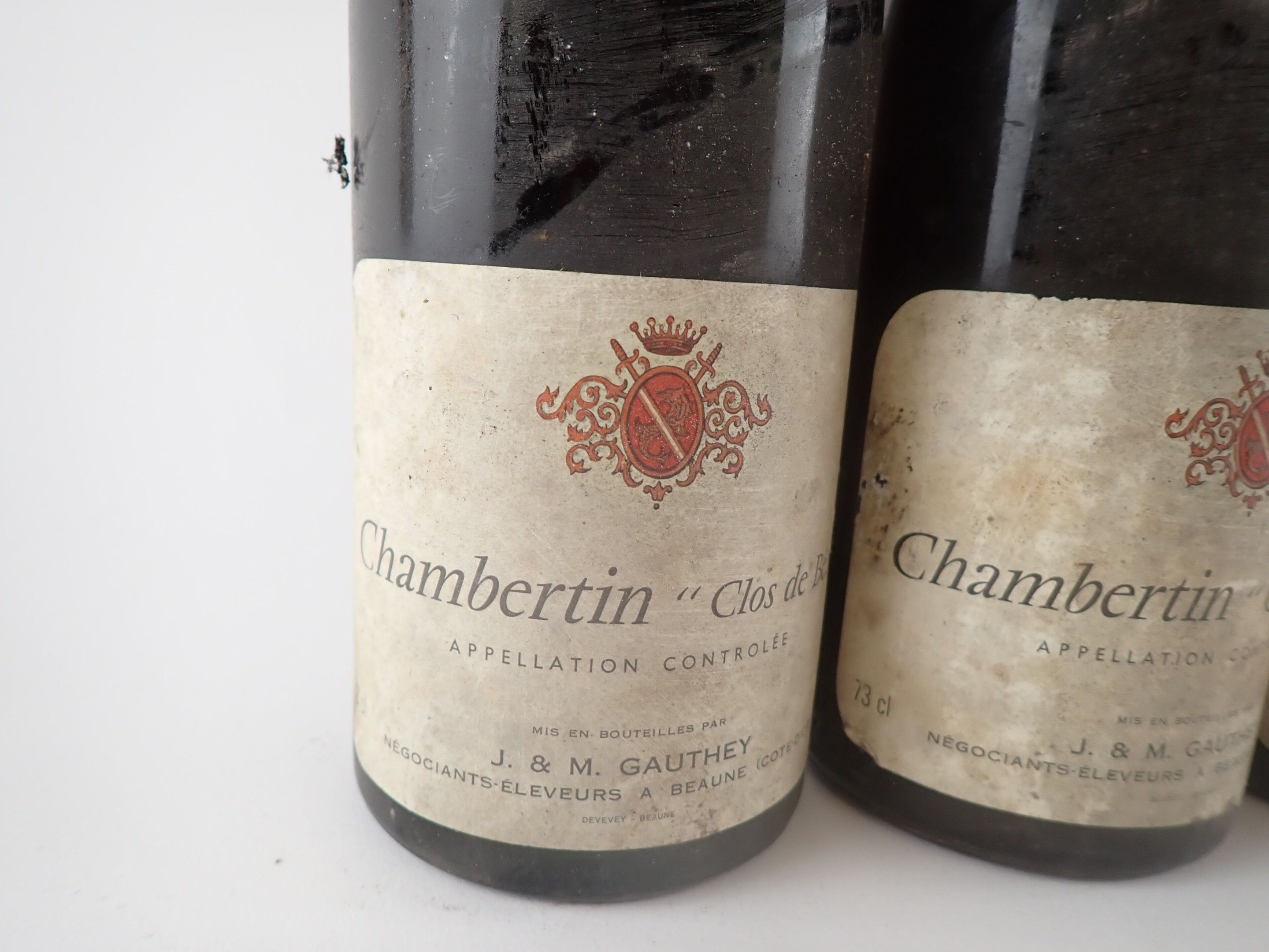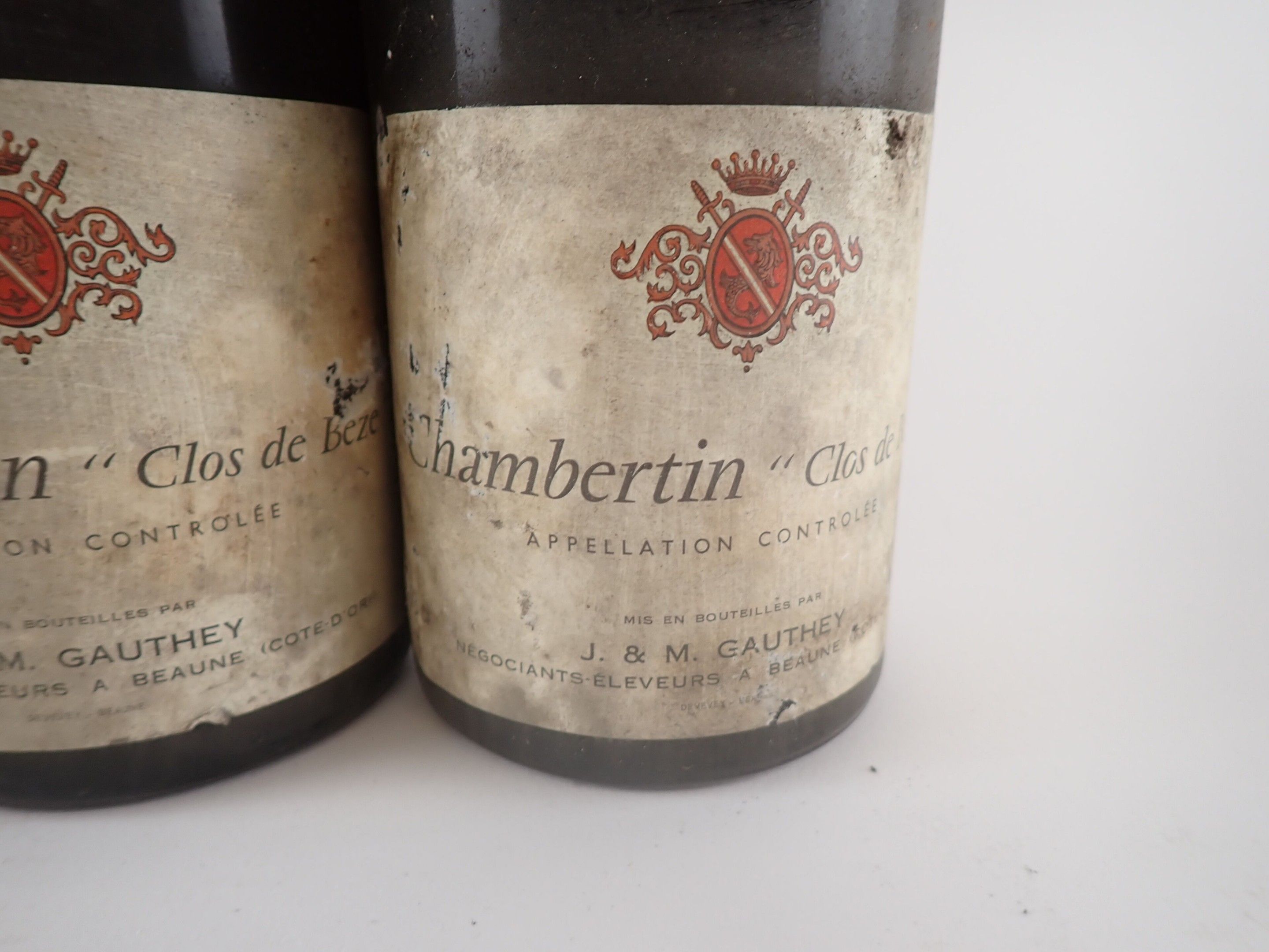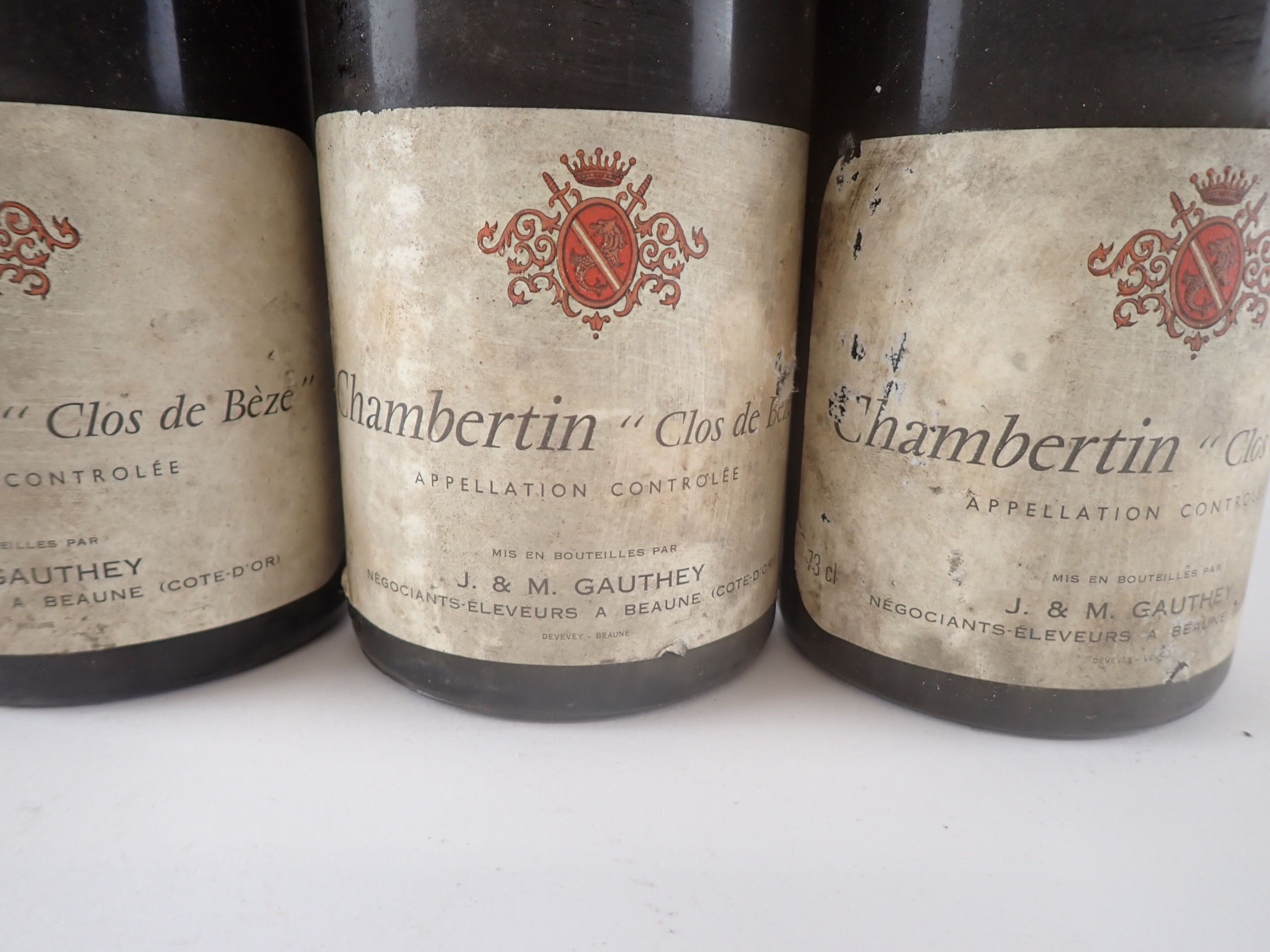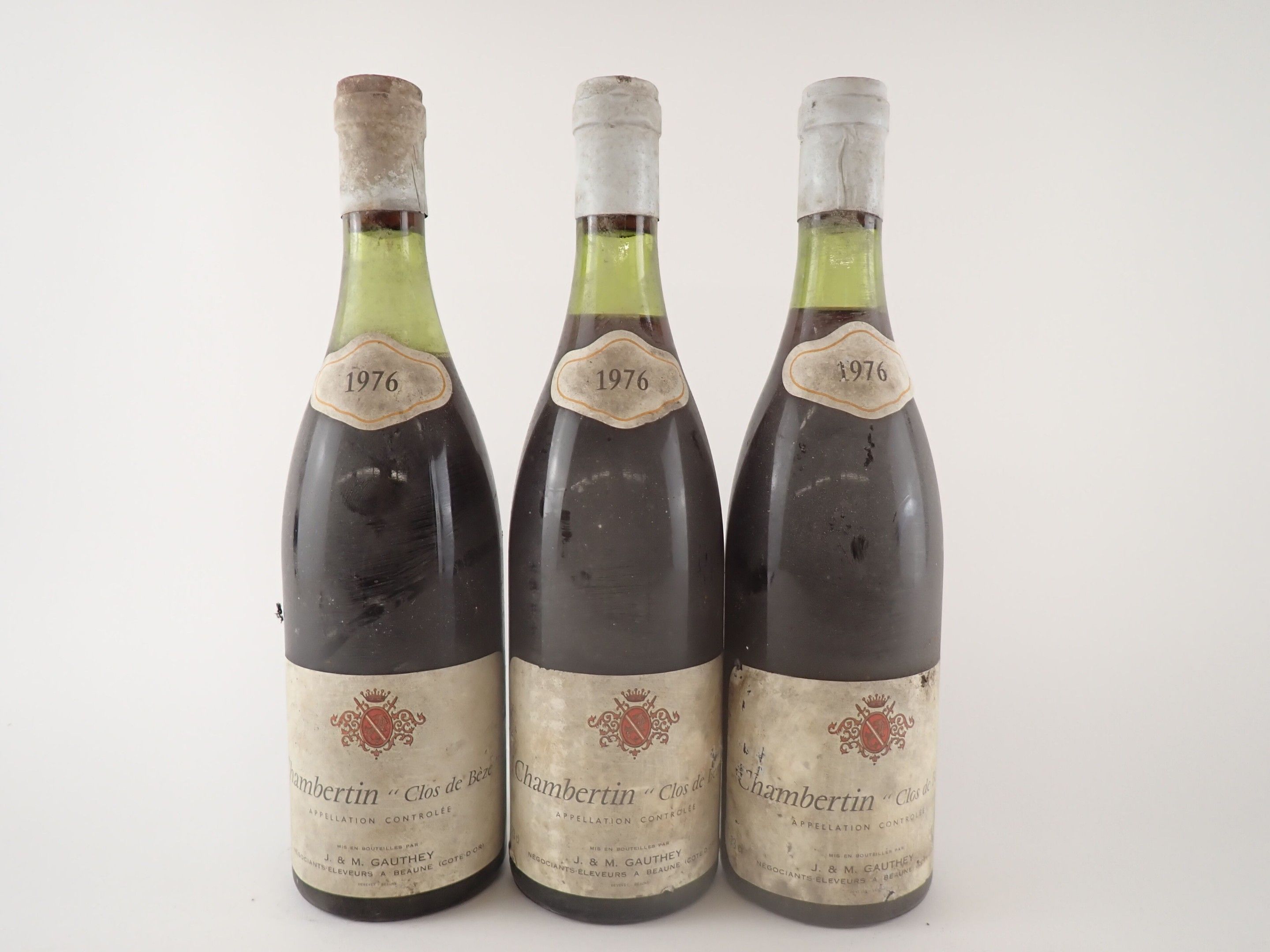 BOURGOGNE - 3 bottles, Chambertin-Clos de Bèze Grand Cru, Gauthey, 1976. 3 cm, 3.5 cm and 5 cm. Caps dirty to very dirty. Dirty escutcheons. Dirty labels, two of which are also slightly damaged.