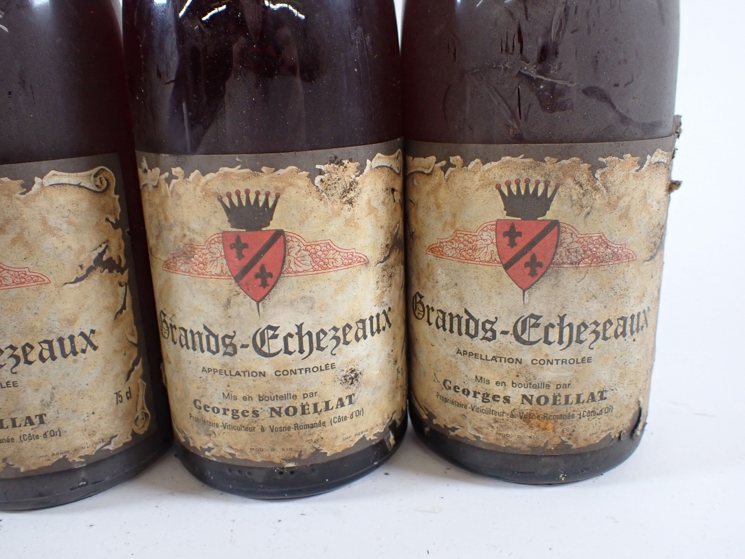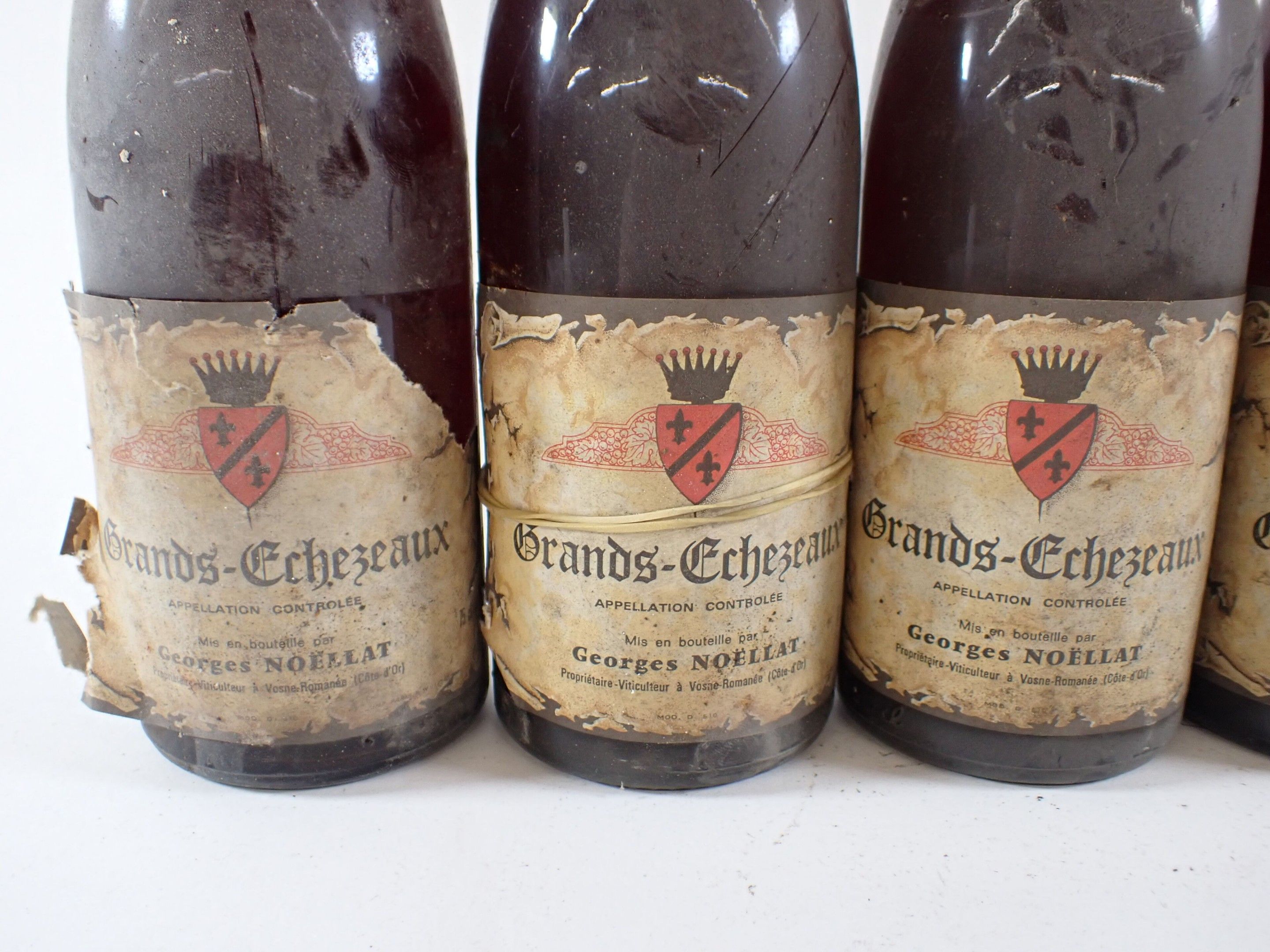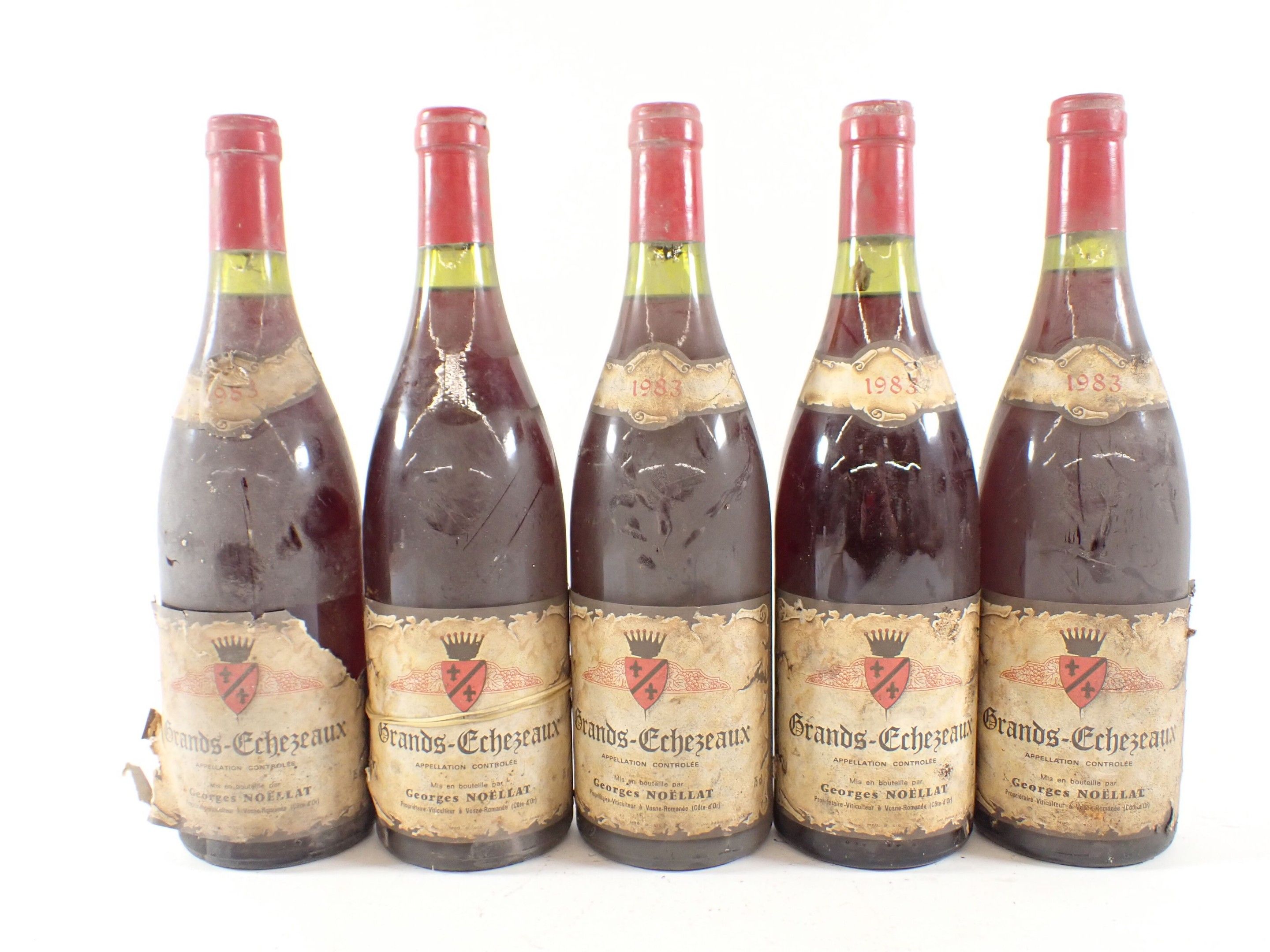 BOURGOGNE - 5 bottles, Grands Echézeaux Grand Cru, Georges Noëllat, 1983 (including a supposed bottle of this vintage). Caps slightly dirty and curved. Dirty collars, two damaged and one missing. Labels slightly dirty to very dirty and slightly faded to faded. One label is partially detached.