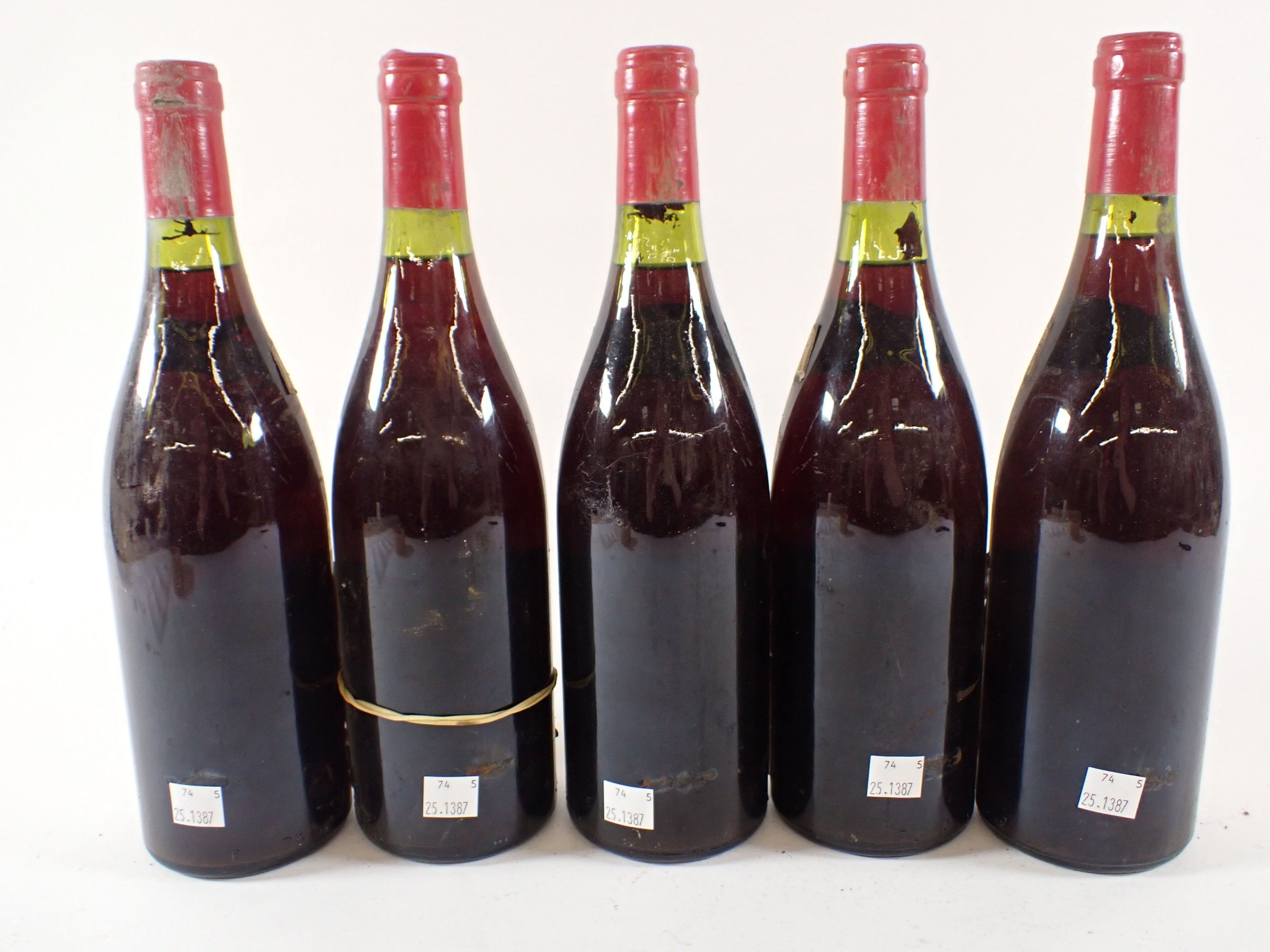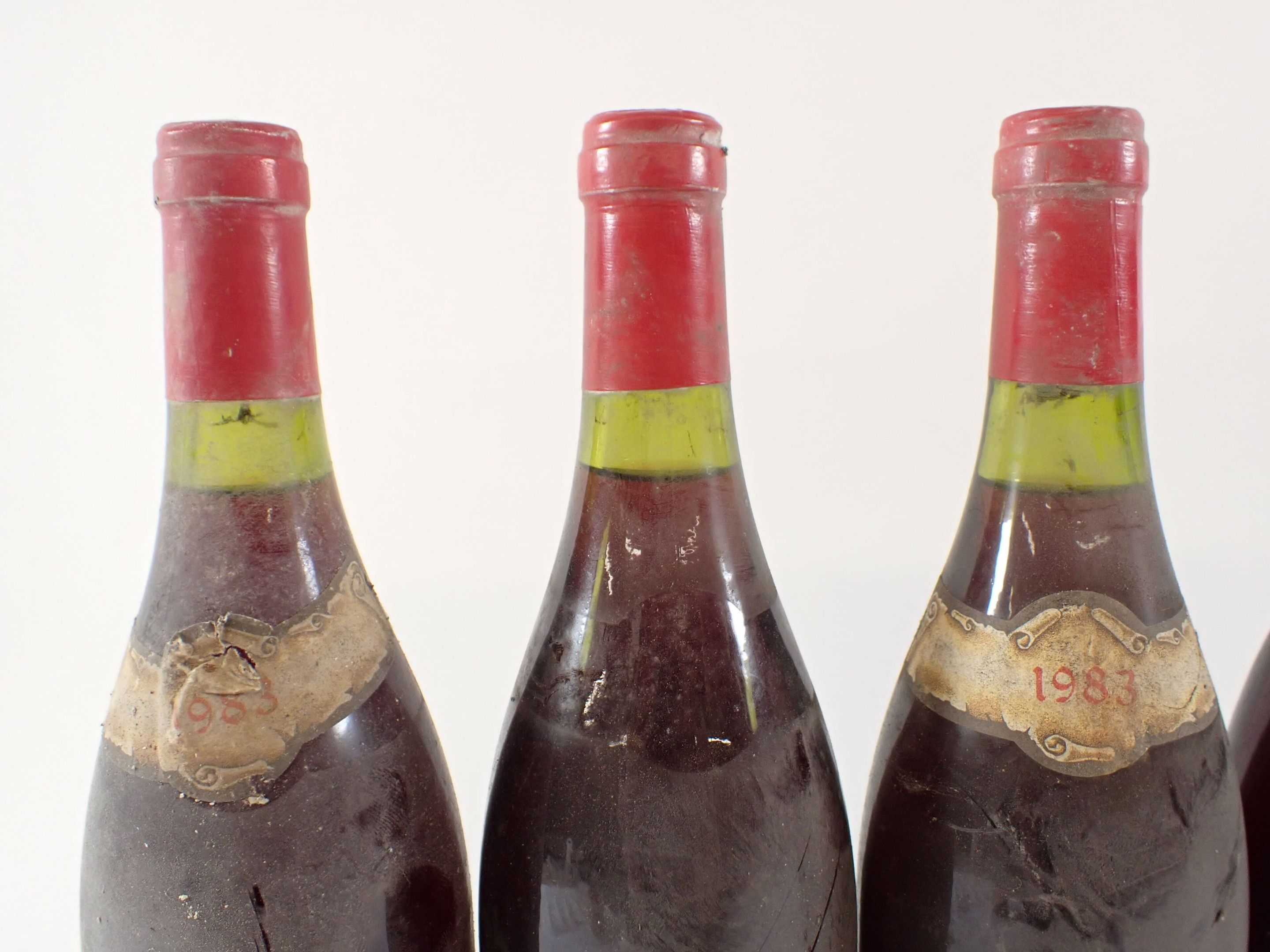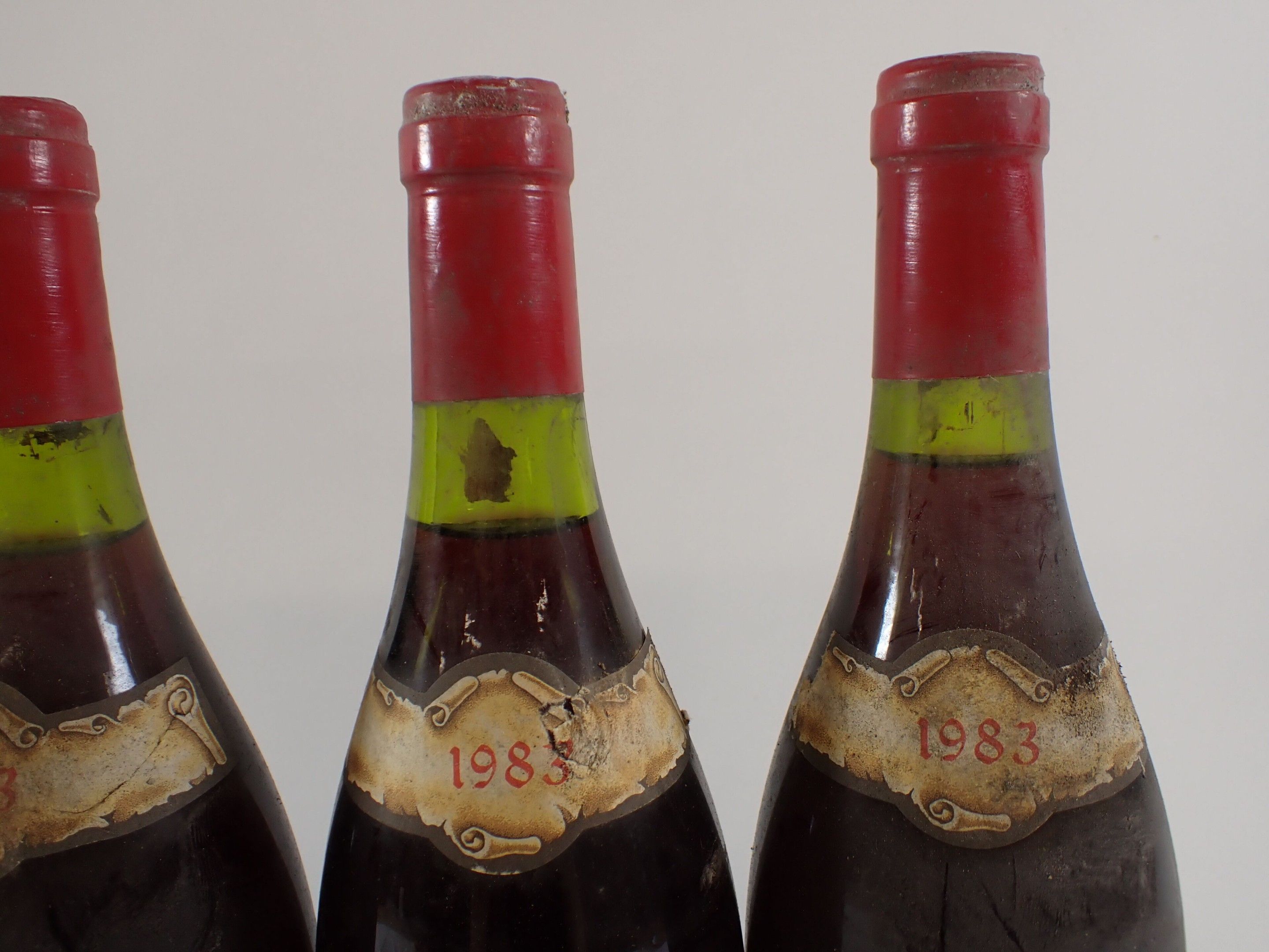 BOURGOGNE - 5 bottles, Grands Echézeaux Grand Cru, Georges Noëllat, 1983 (including a supposed bottle of this vintage). Caps slightly dirty and curved. Dirty collars, two damaged and one missing. Labels slightly dirty to very dirty and slightly faded to faded. One label is partially detached.