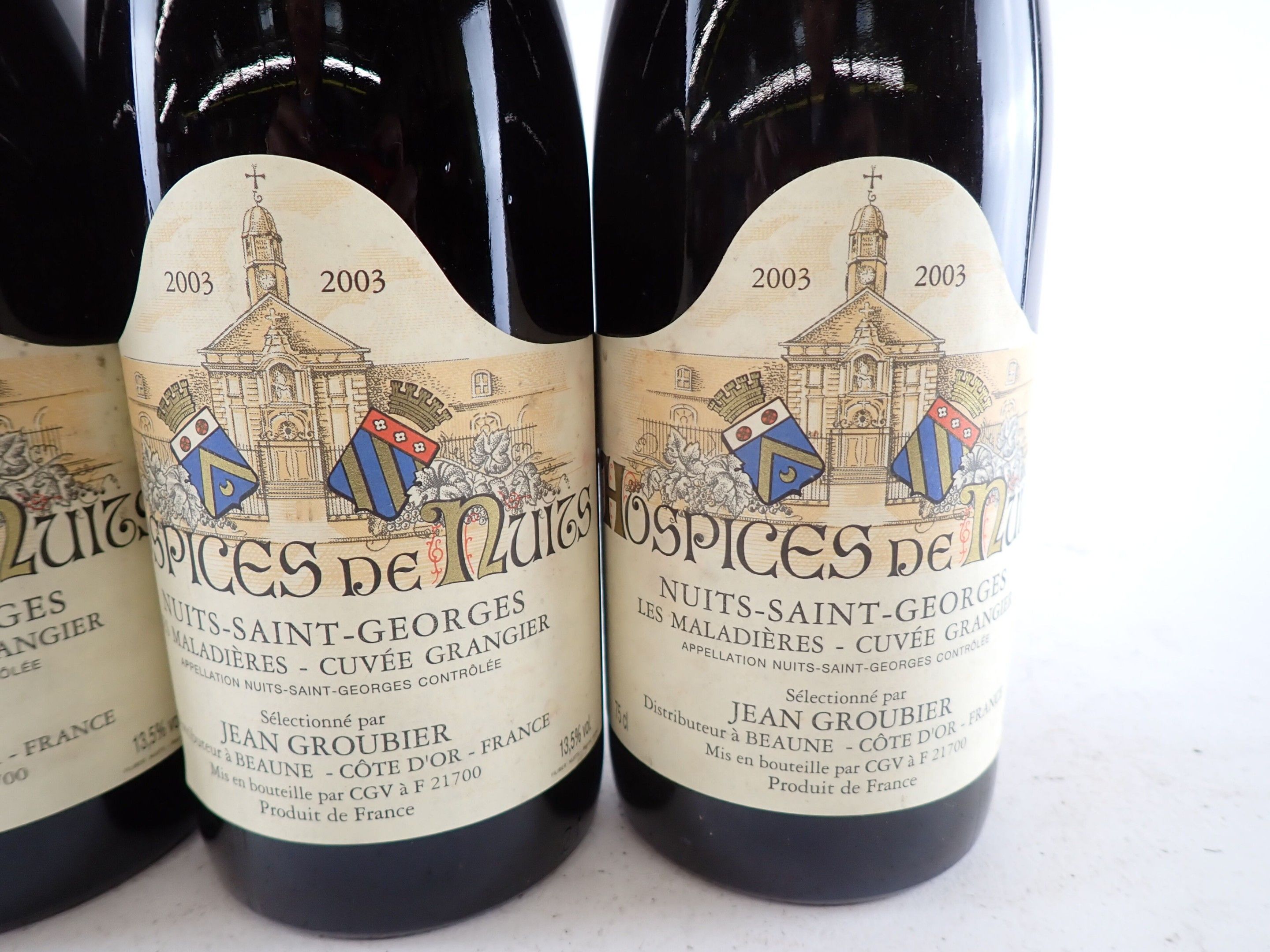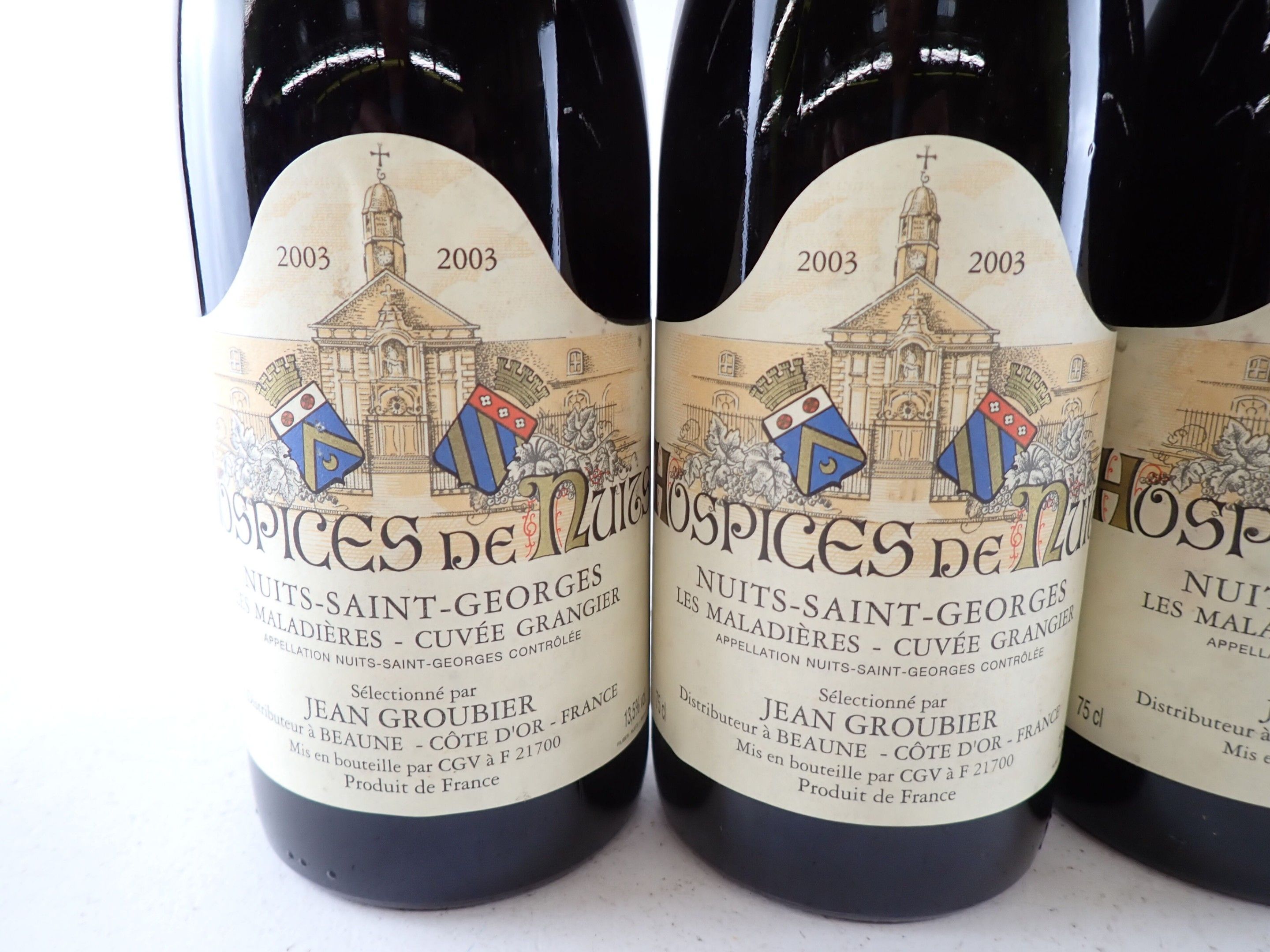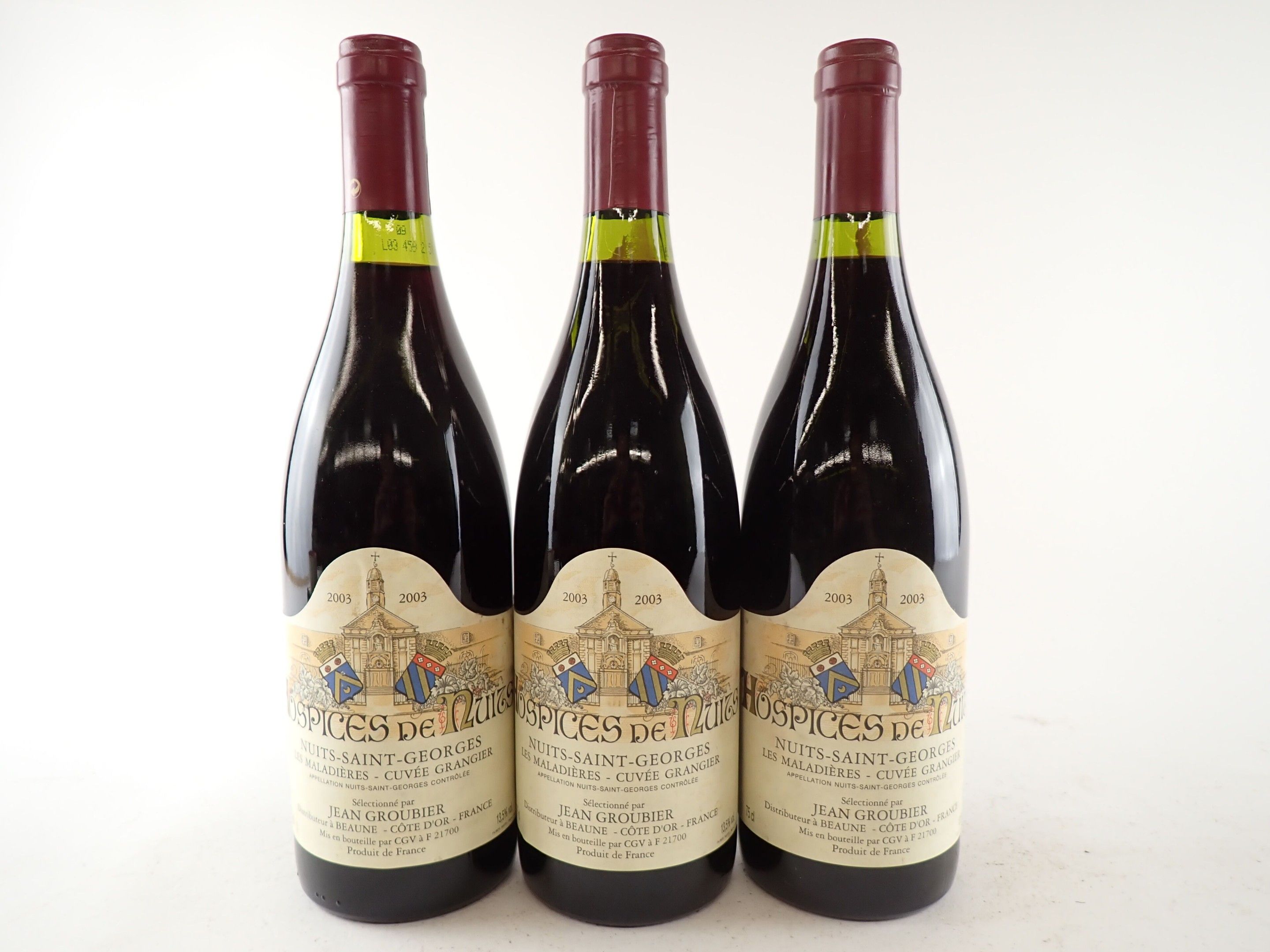 BOURGOGNE - 3 bottles, Nuits-Saint-Georges 'Les Maladières-Cuvée Grangier', Hospices de Nuits, Selected by Jean Groubier, 2003. Very slightly dirty labels.