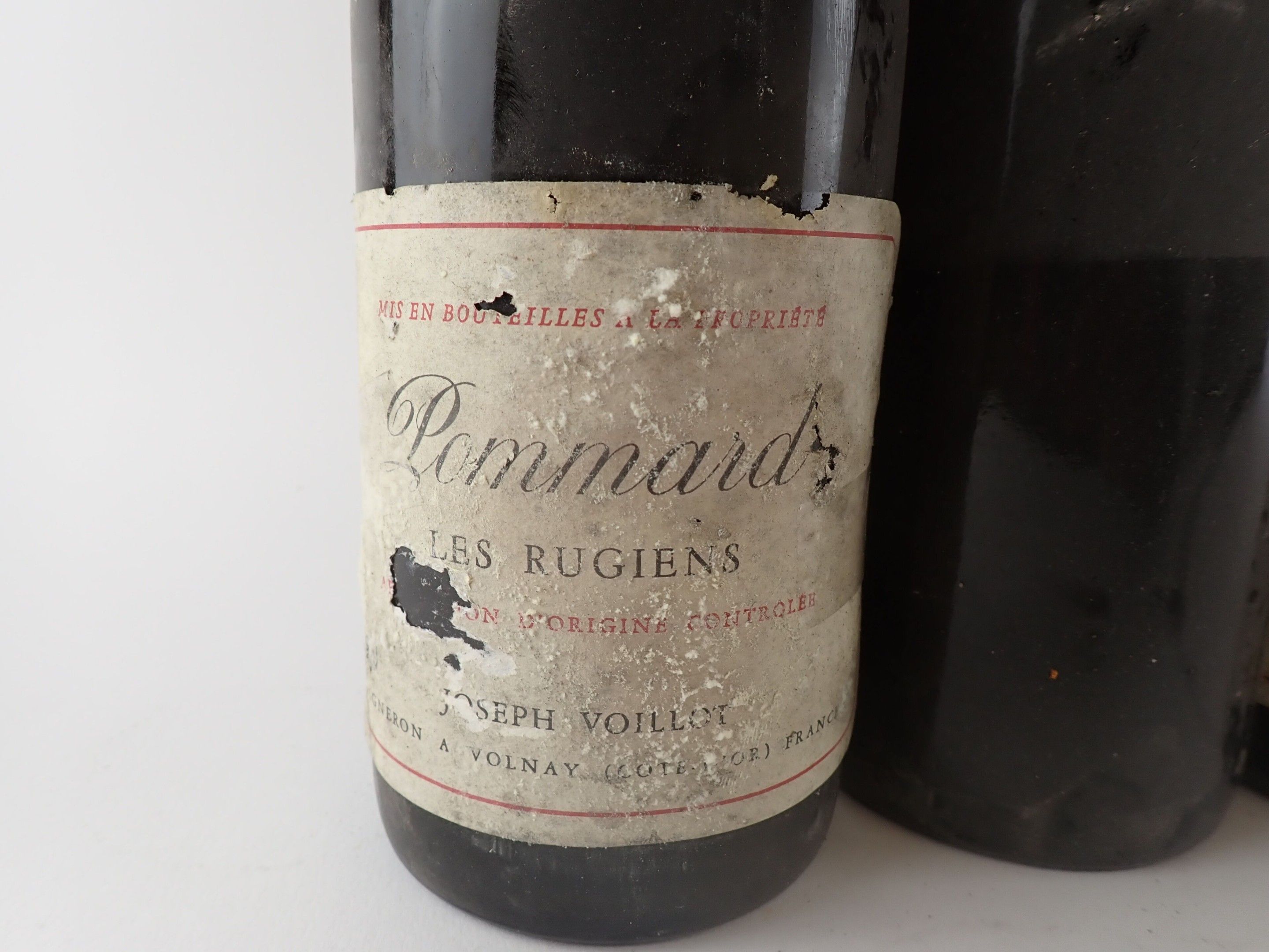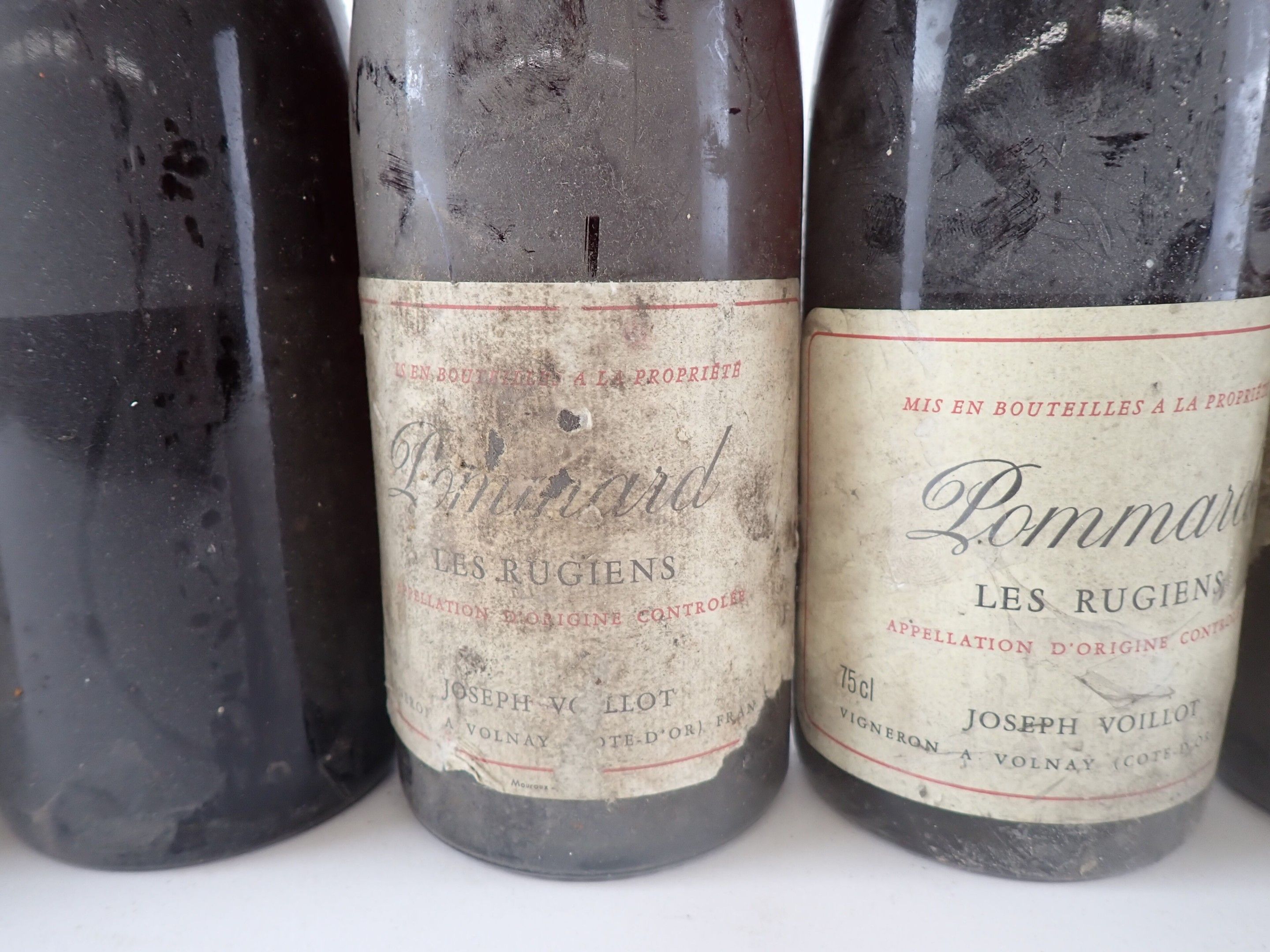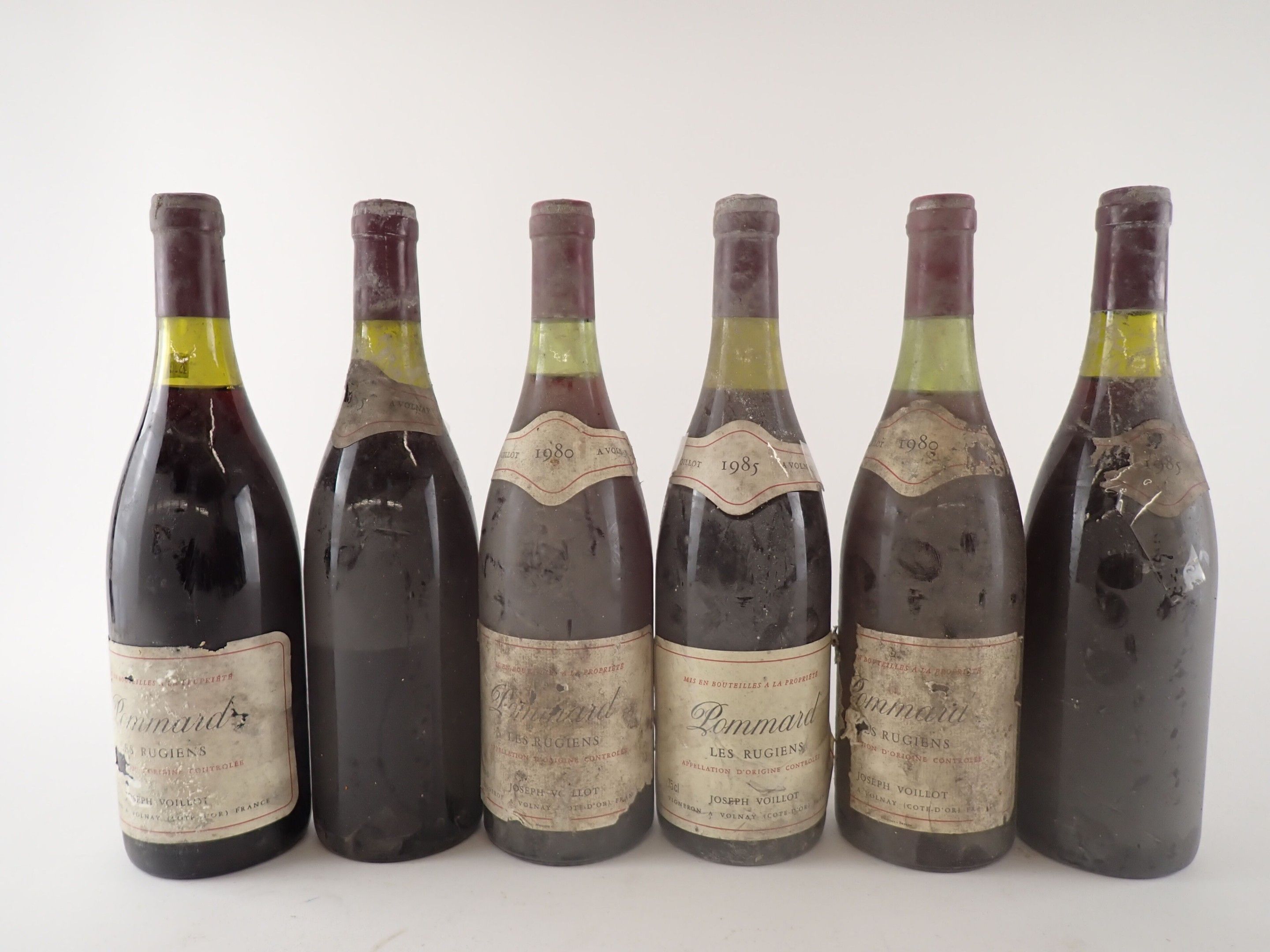 BOURGOGNE - 6 bottles, Pommard 'Les Rugiens', Joseph Voillot, 1980 (2) and 1985 (4) (of which two bottles are supposed to be of this reference and one bottle of this vintage). Levels at 3 cm or better. Caps dirty to very dirty. Dirty and degraded collars, two of which are completely detached and one is missing. Dirty to very dirty and degraded labels. Two labels are missing.