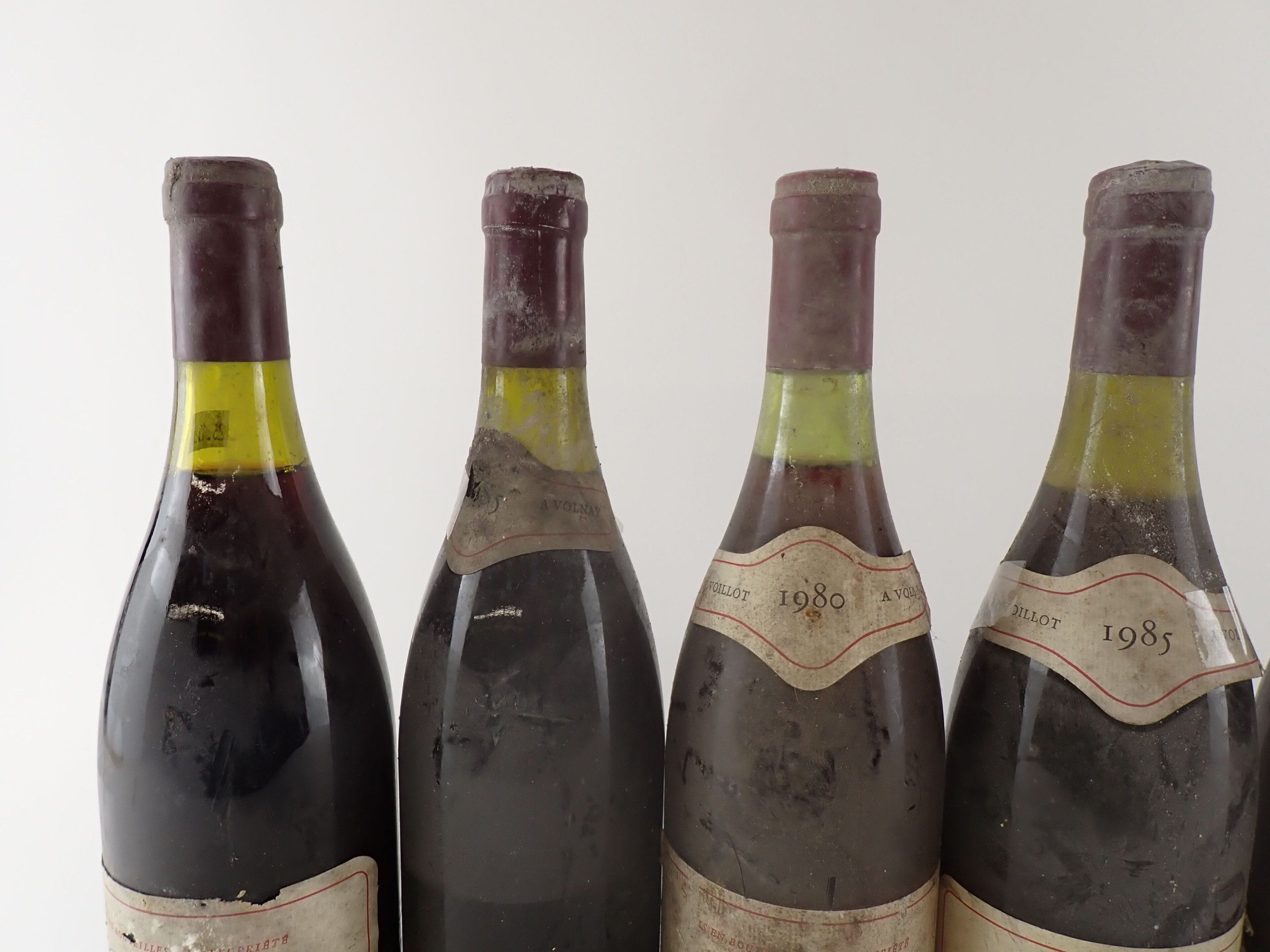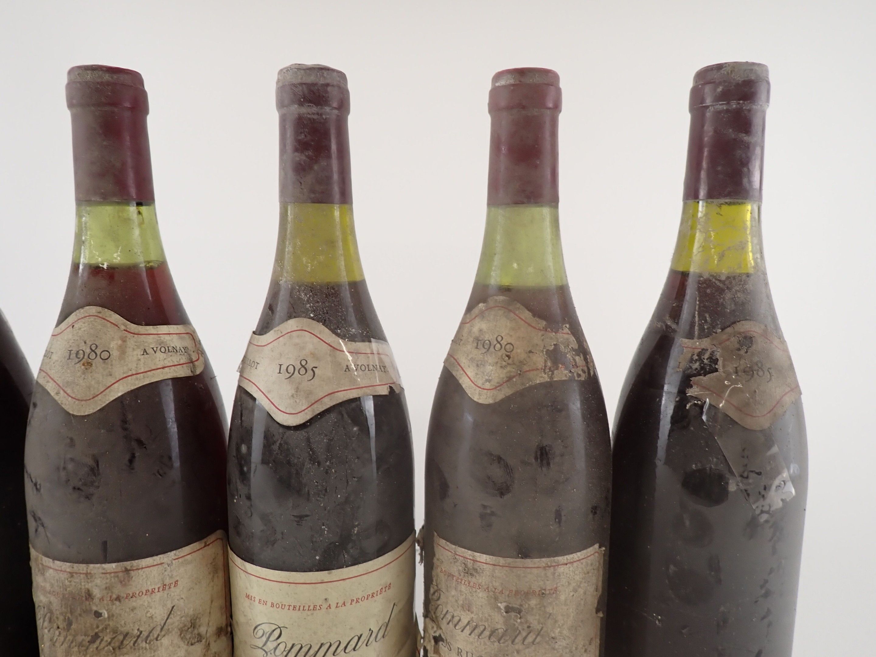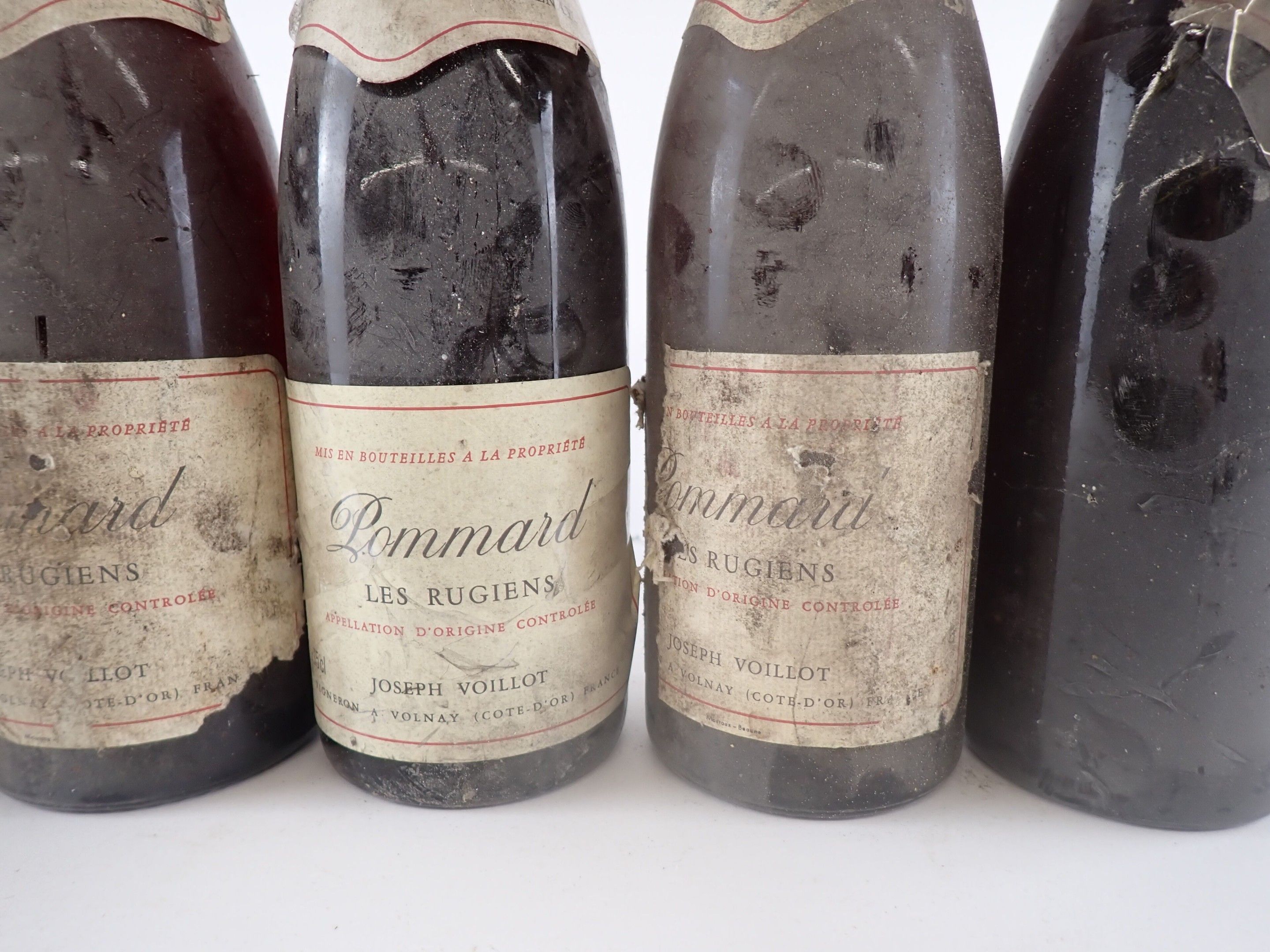 BOURGOGNE - 6 bottles, Pommard 'Les Rugiens', Joseph Voillot, 1980 (2) and 1985 (4) (of which two bottles are supposed to be of this reference and one bottle of this vintage). Levels at 3 cm or better. Caps dirty to very dirty. Dirty and degraded collars, two of which are completely detached and one is missing. Dirty to very dirty and degraded labels. Two labels are missing.