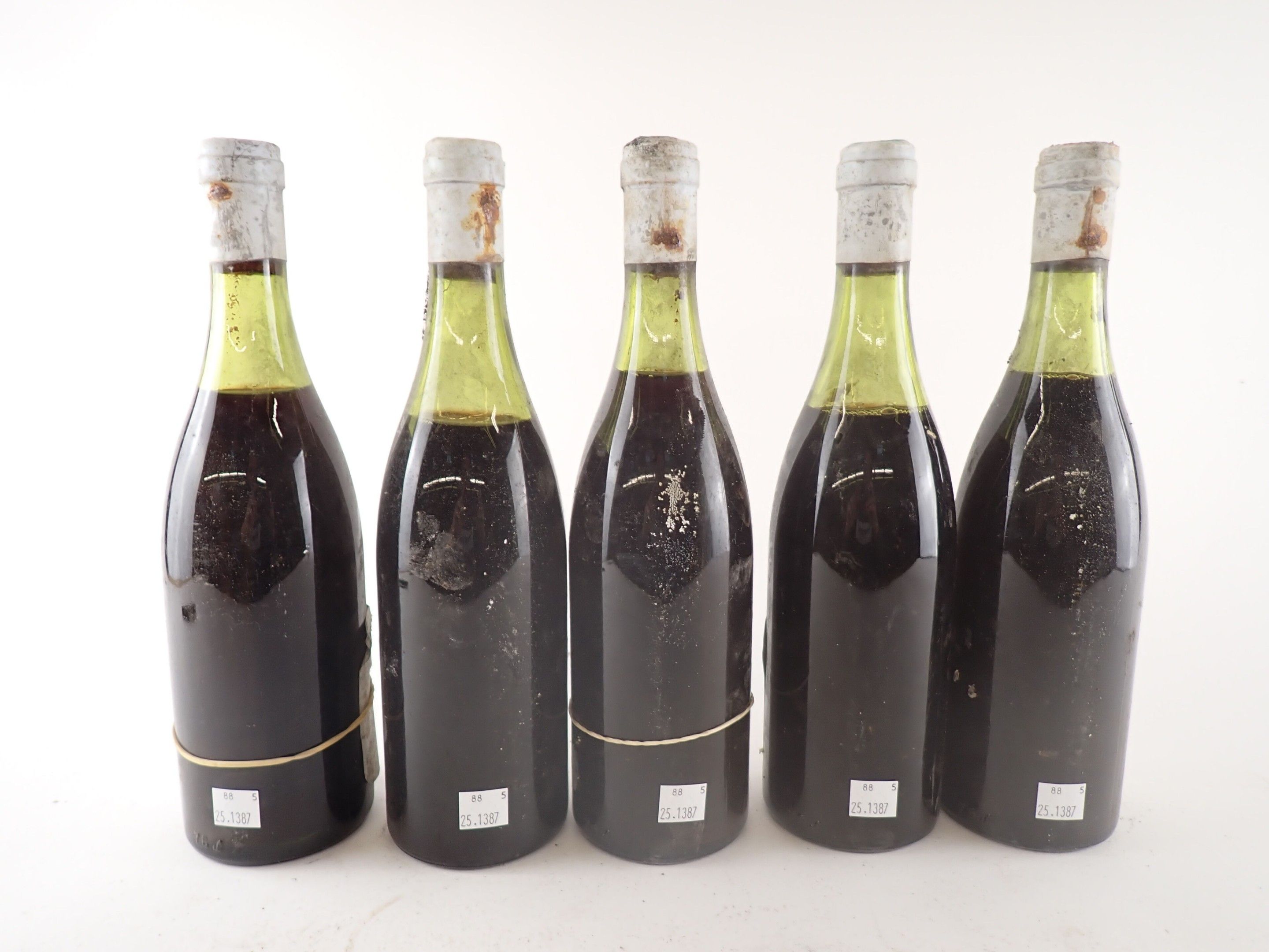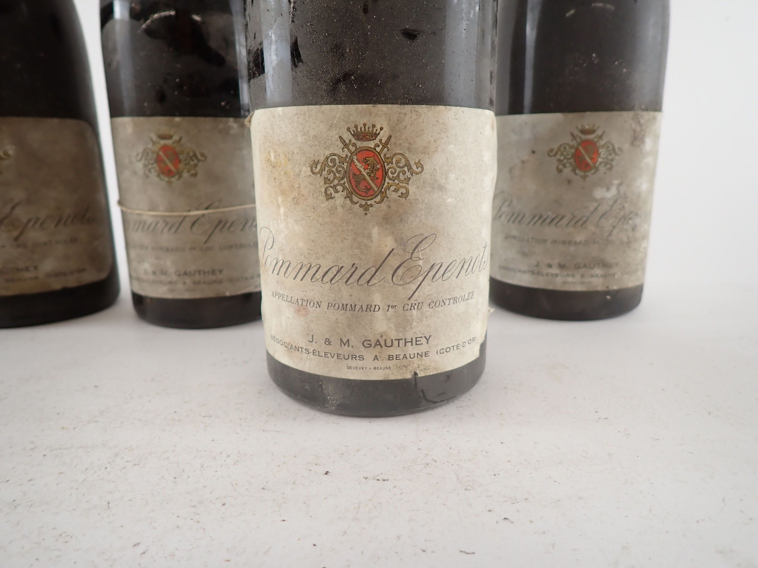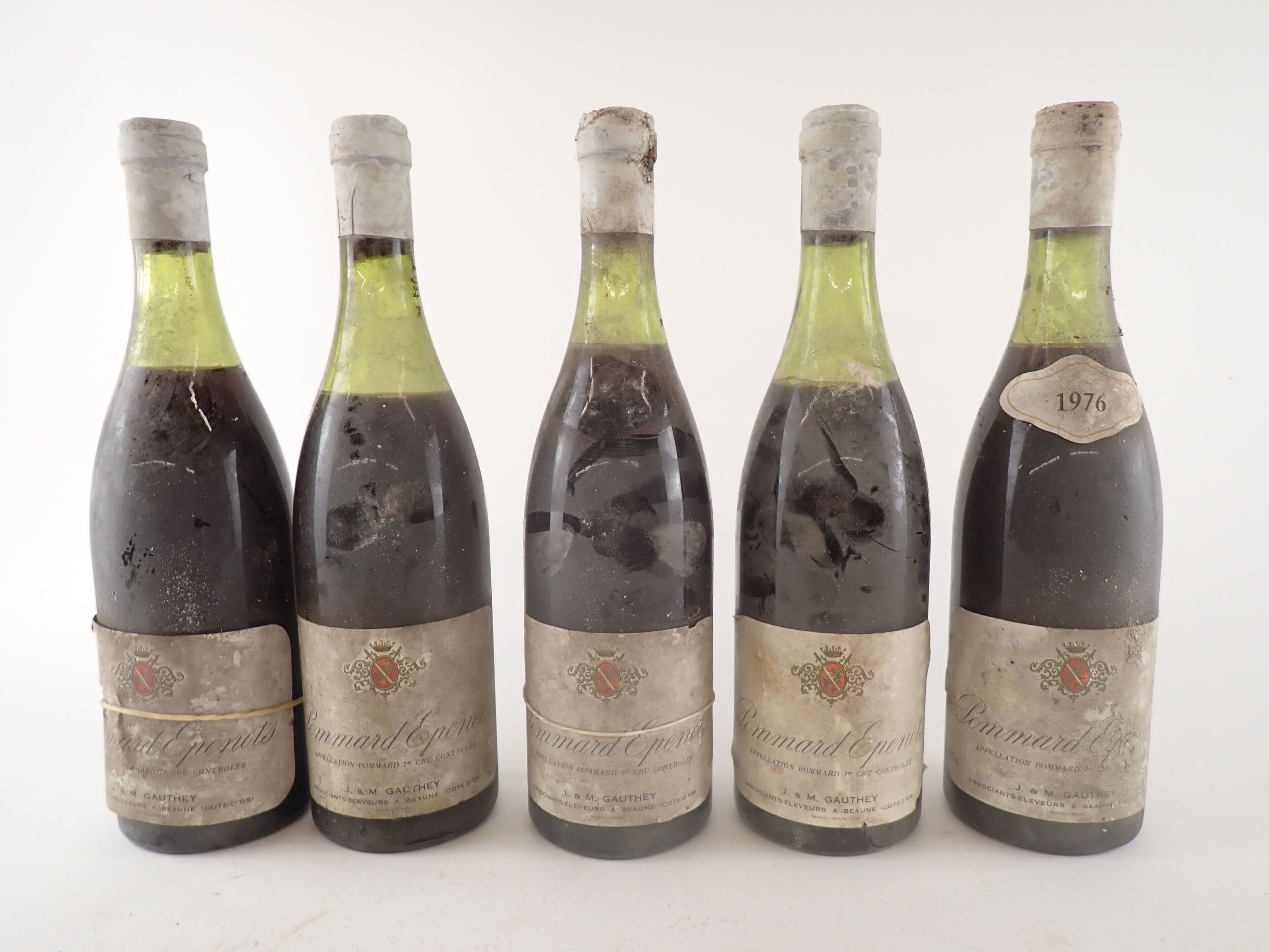 BOURGOGNE - 5 bottles, Pommard 'Epenots', Gauthey 1976 (4 of which may be of this vintage). 4.5 cm (2), 5 cm and 6 cm (2). Caps dirty to very dirty. Dirty, damaged labels, four of which are partially detached.