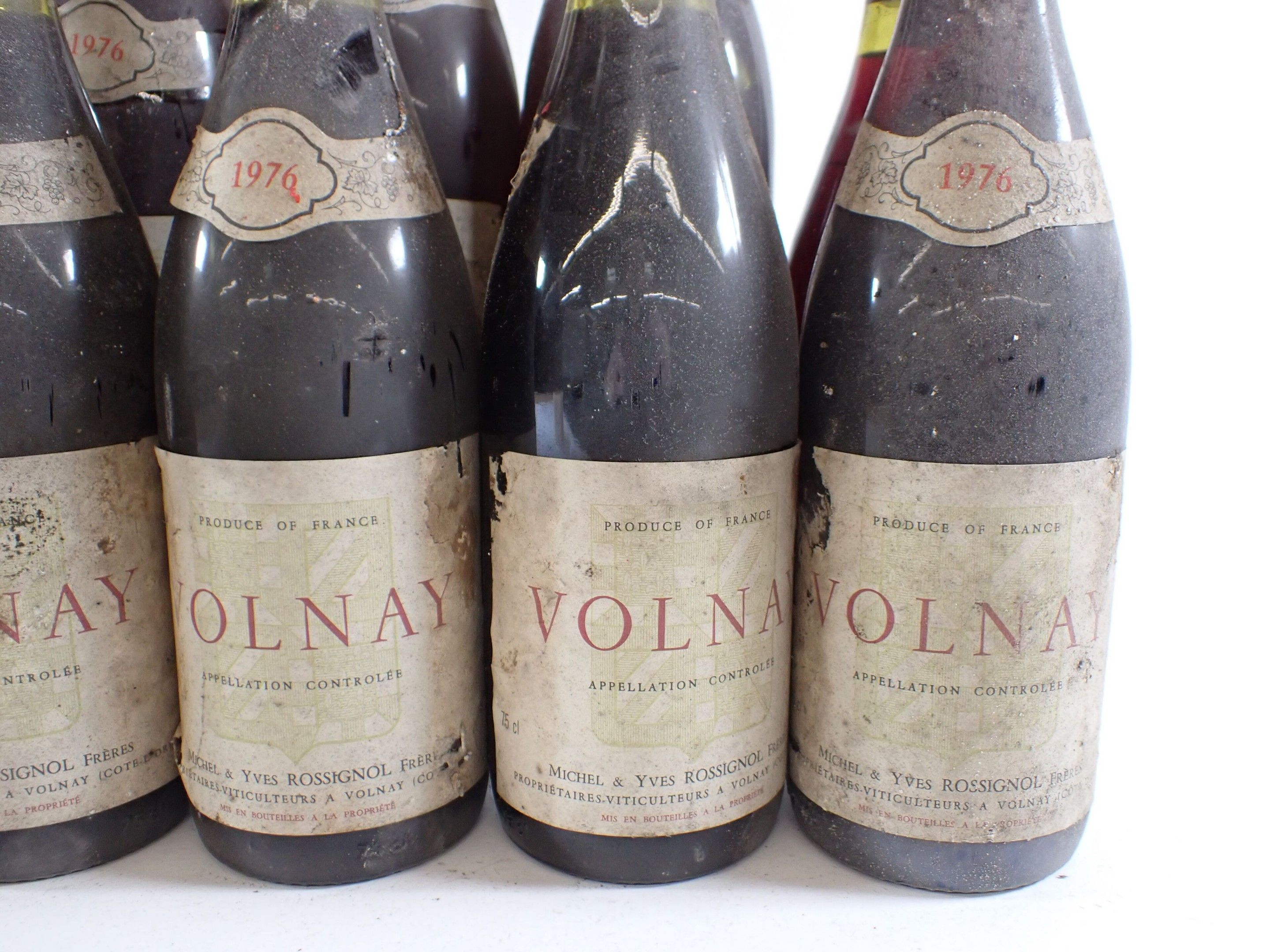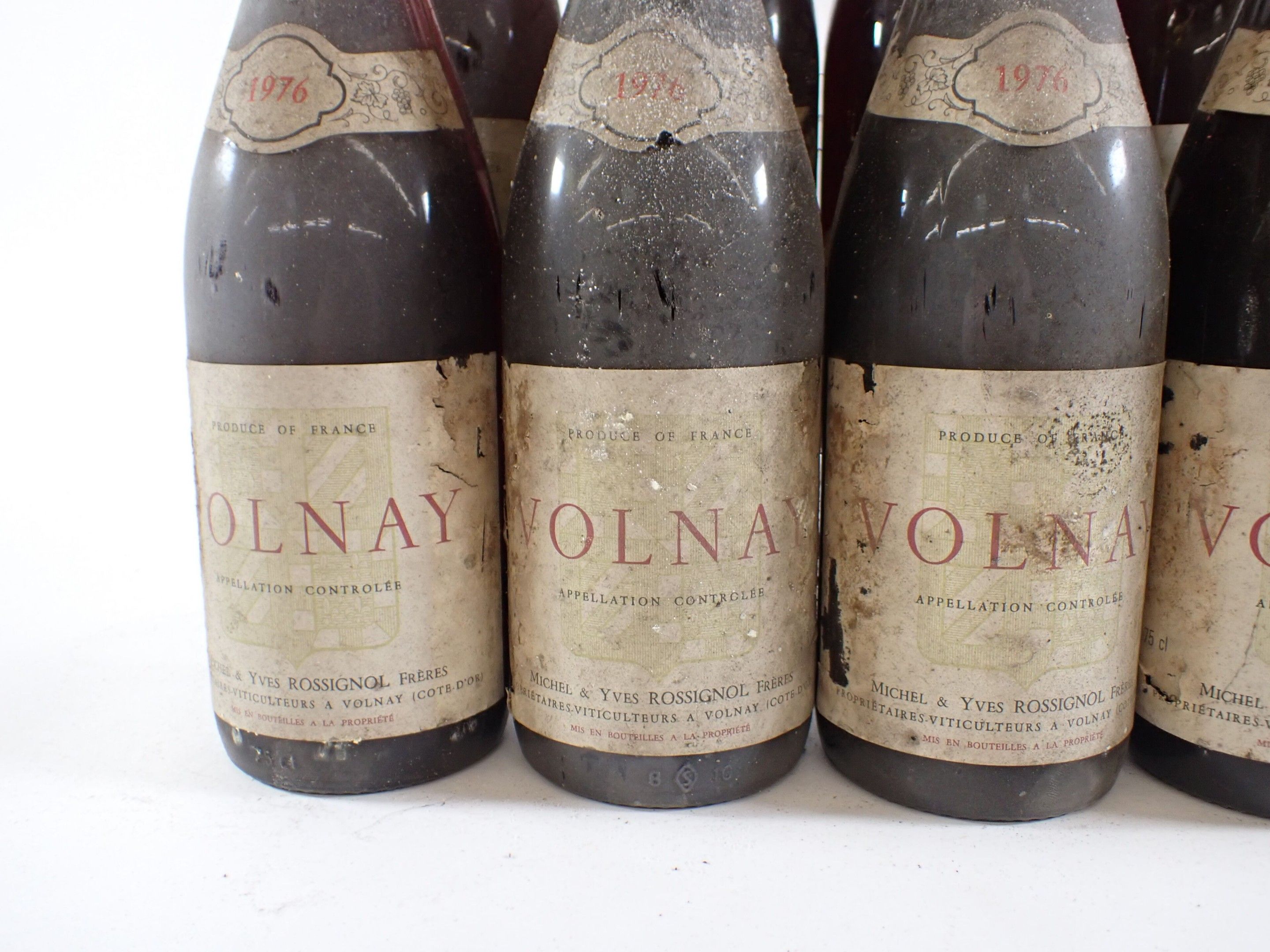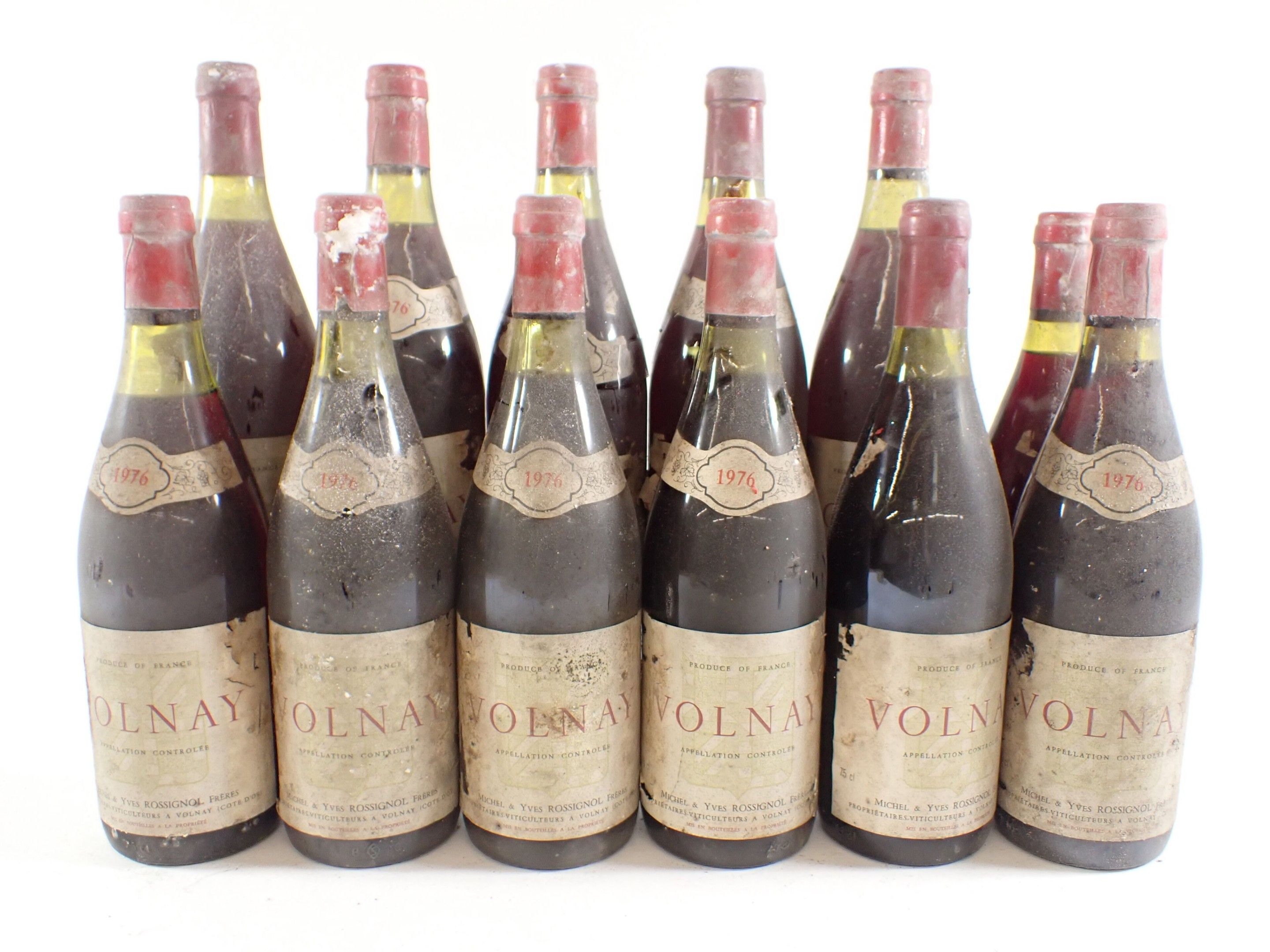 BOURGOGNE - 12 bottles, Volnay, Michel et Yves Rossignol frères, 1976 (including 4 supposed bottles of this vintage). Levels at 3.5 cm or better. Caps dirty to very dirty, six of which are slightly curved. Dirty and damaged collars, two of which are completely detached. Dirty and faded labels.