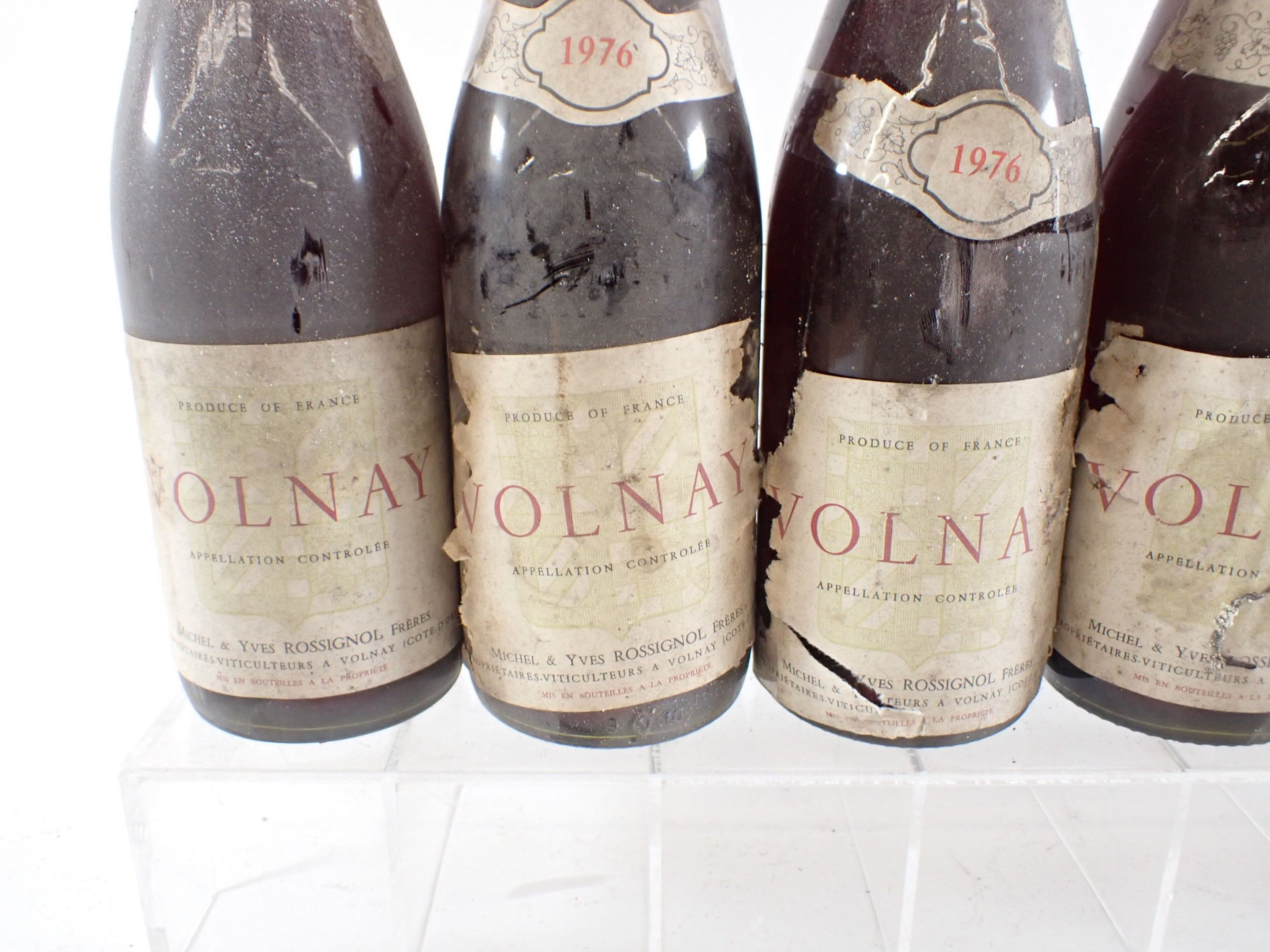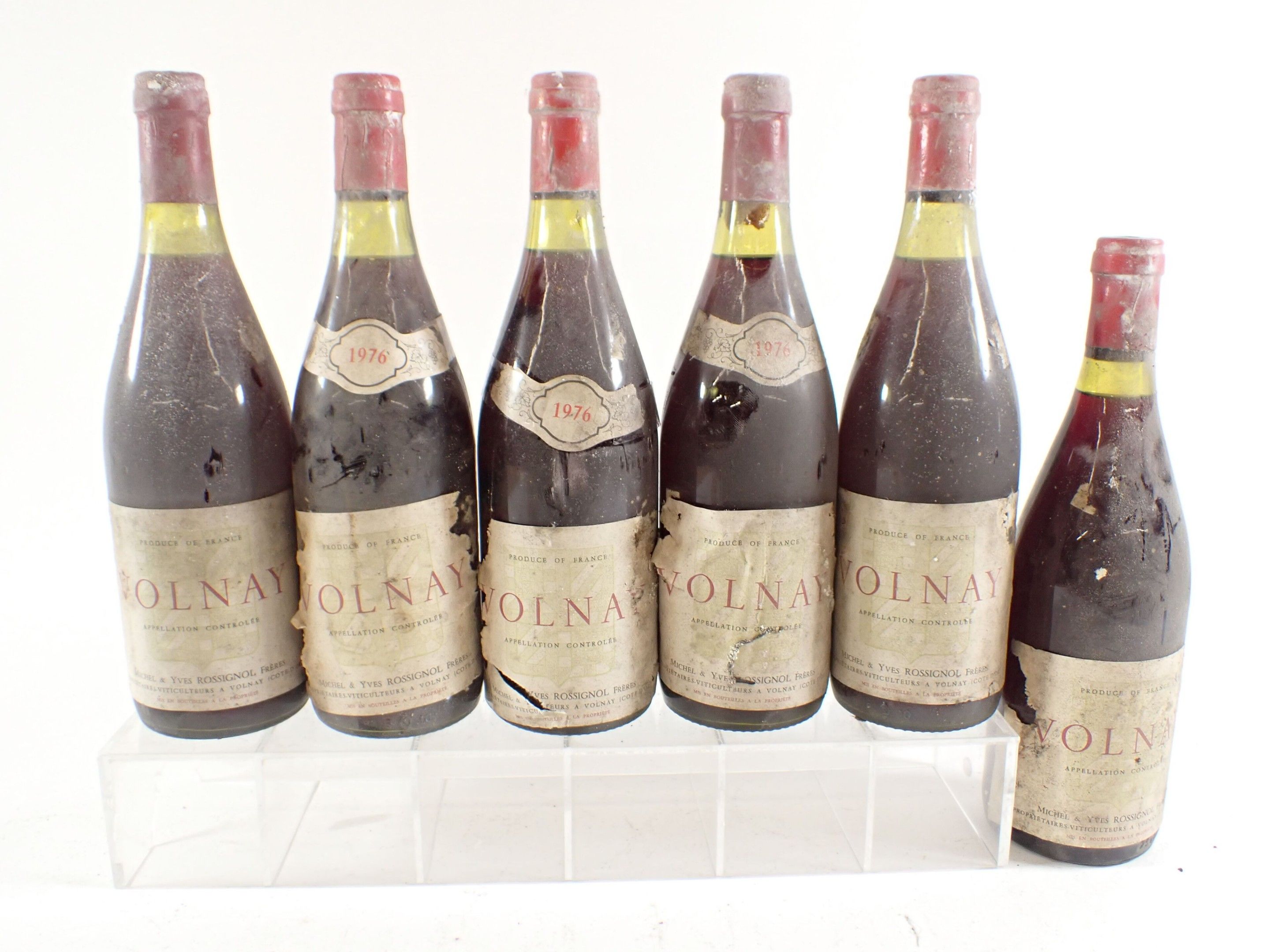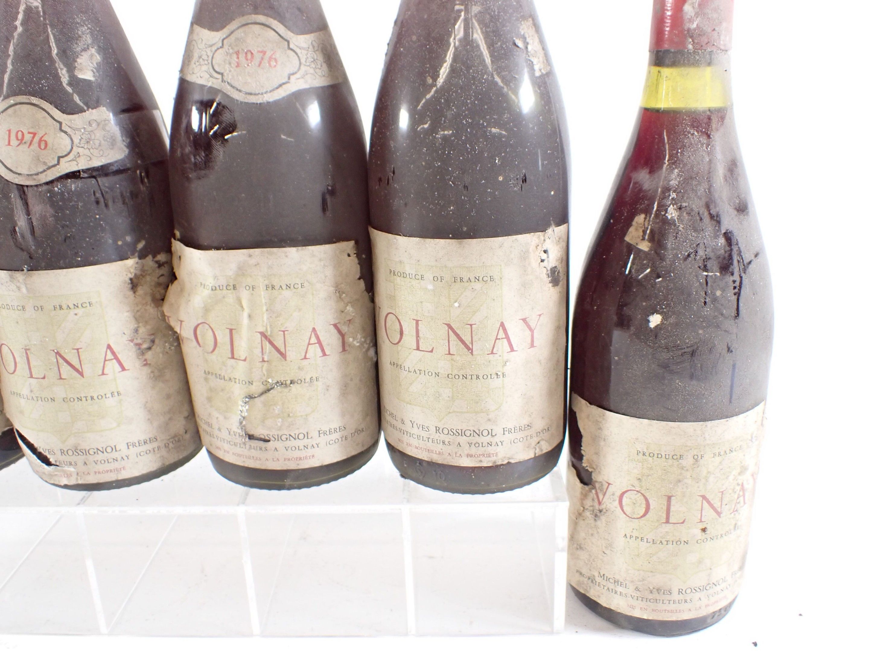 BOURGOGNE - 12 bottles, Volnay, Michel et Yves Rossignol frères, 1976 (including 4 supposed bottles of this vintage). Levels at 3.5 cm or better. Caps dirty to very dirty, six of which are slightly curved. Dirty and damaged collars, two of which are completely detached. Dirty and faded labels.