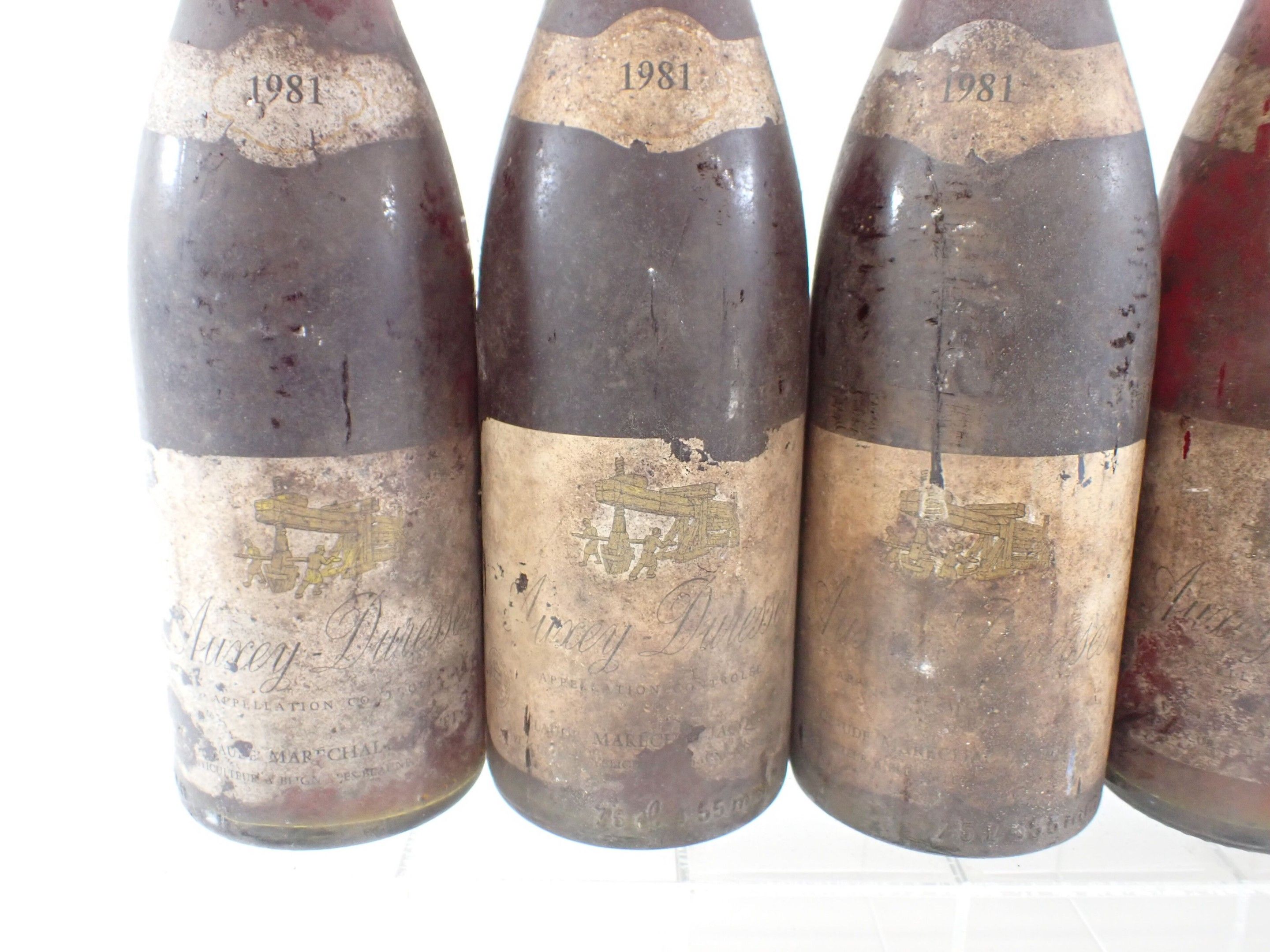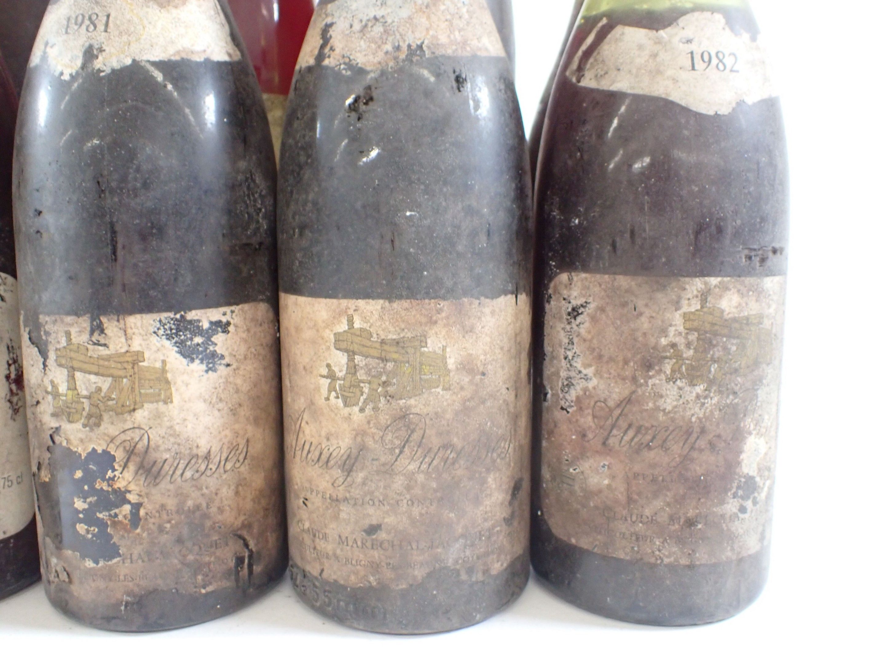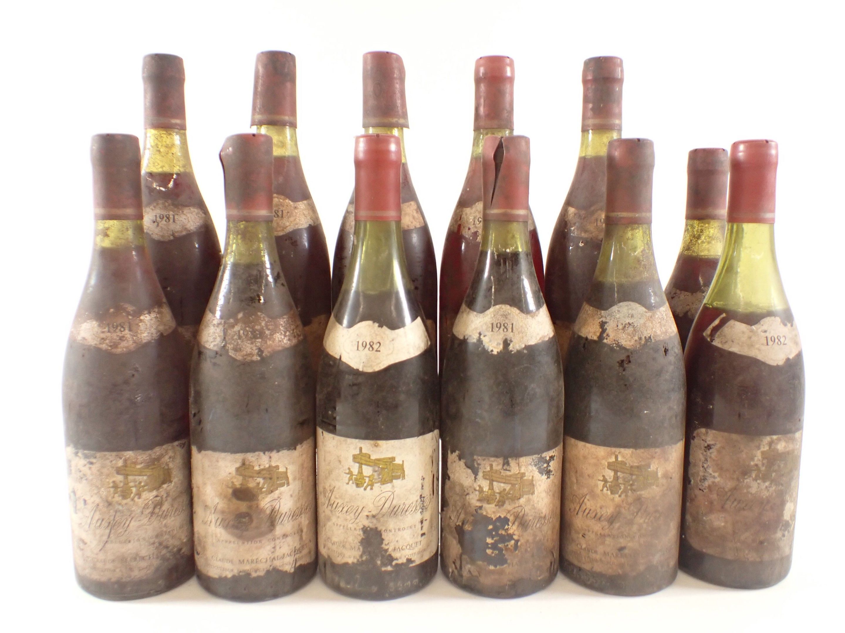 BOURGOGNE - 12 bottles, Auxey-Duresses, Claude Maréchal-Jacquet, 1981 (9 including one supposedly of this vintage) and 1982 (3). Levels above 3.8 cm except for one level at 4.6 cm (1982) and one level at 5.7 cm (1982). Caps, collars and labels very dirty and damaged to very damaged.
