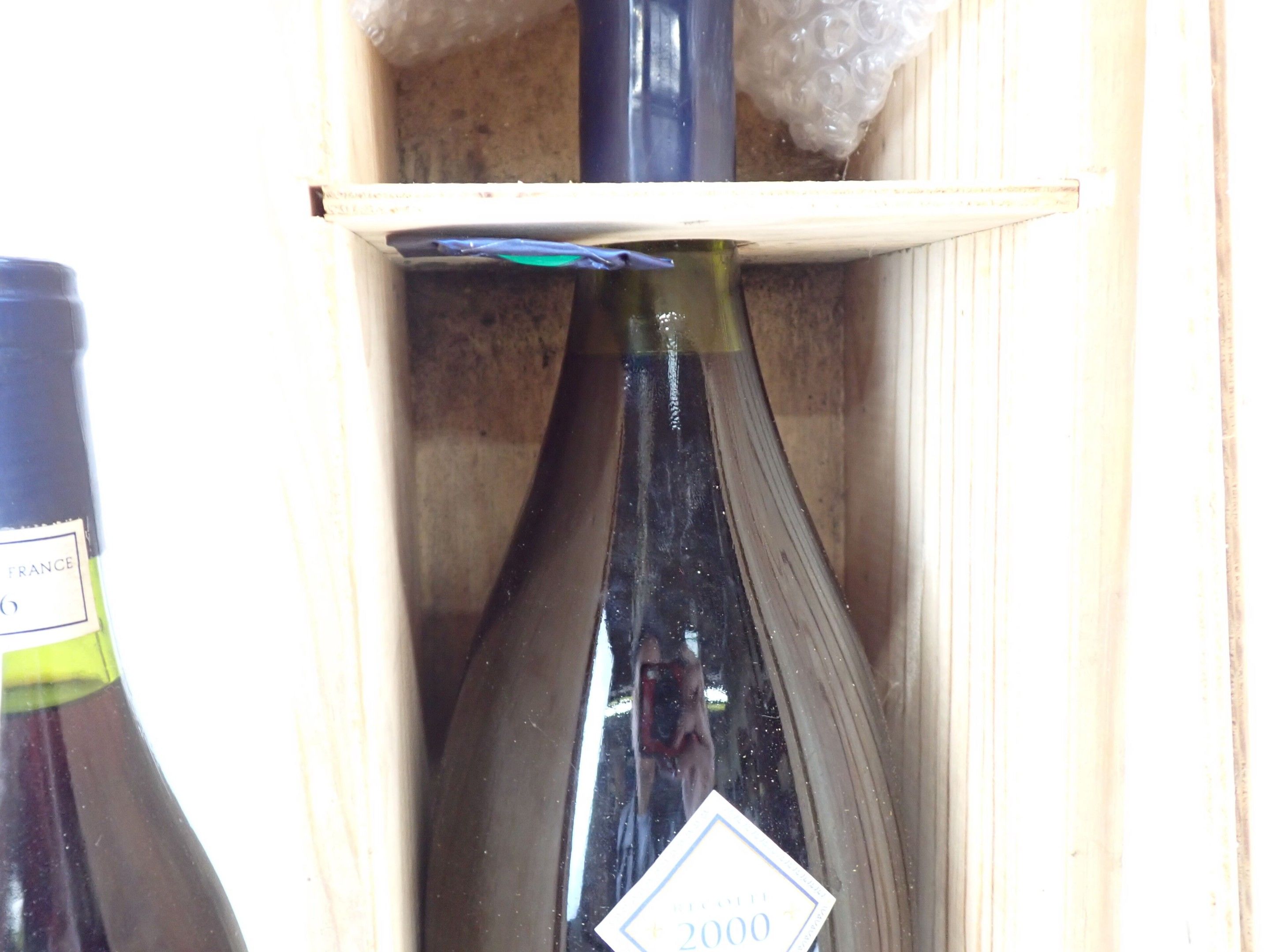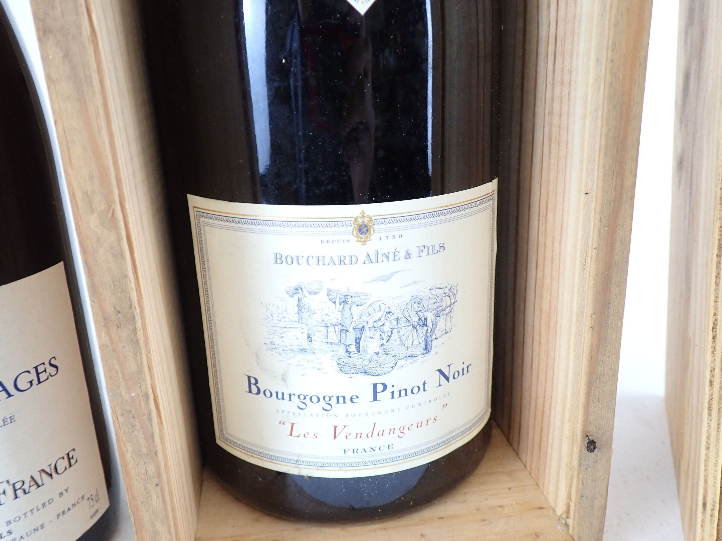 1 magnum, Bourgogne, Bouchard Ainé et fils, Les Vendangeurs, 2000. In wooden case (damaged and dirty). 2.7 cm. Wax capsule with traces. Label with marks. Back label slightly dirty and damaged.