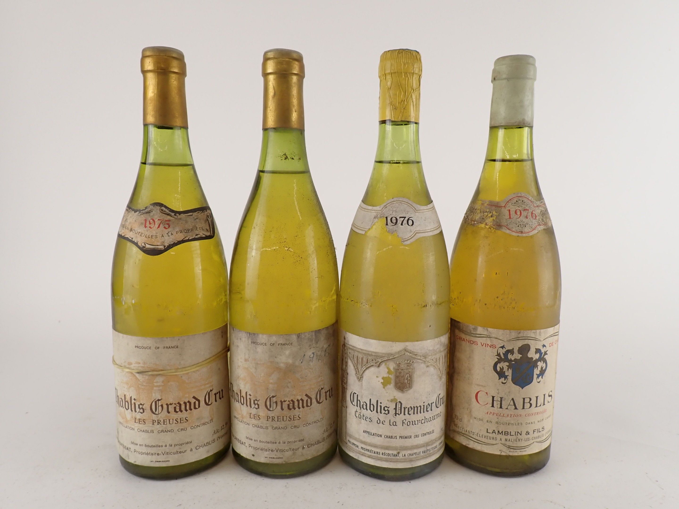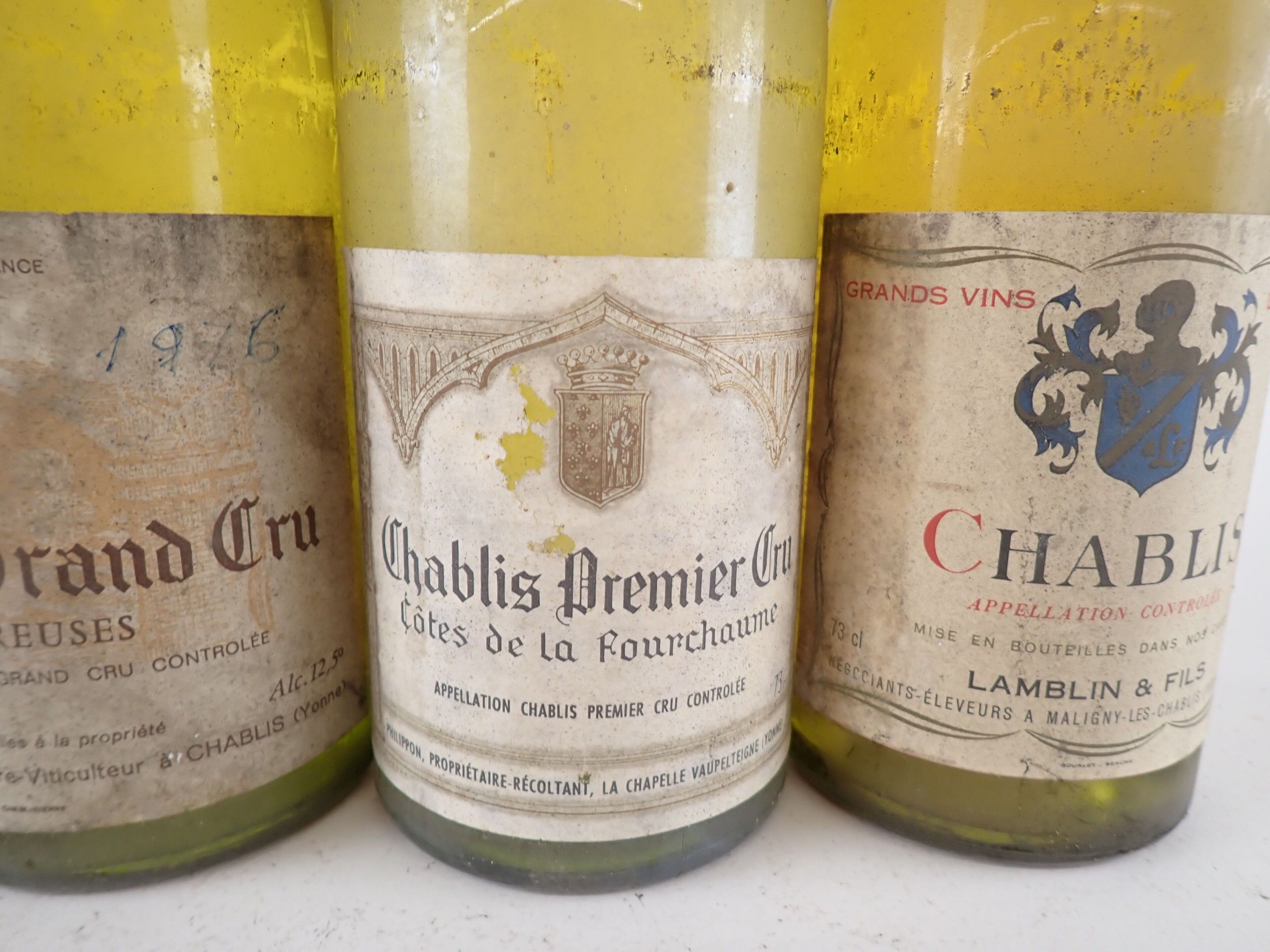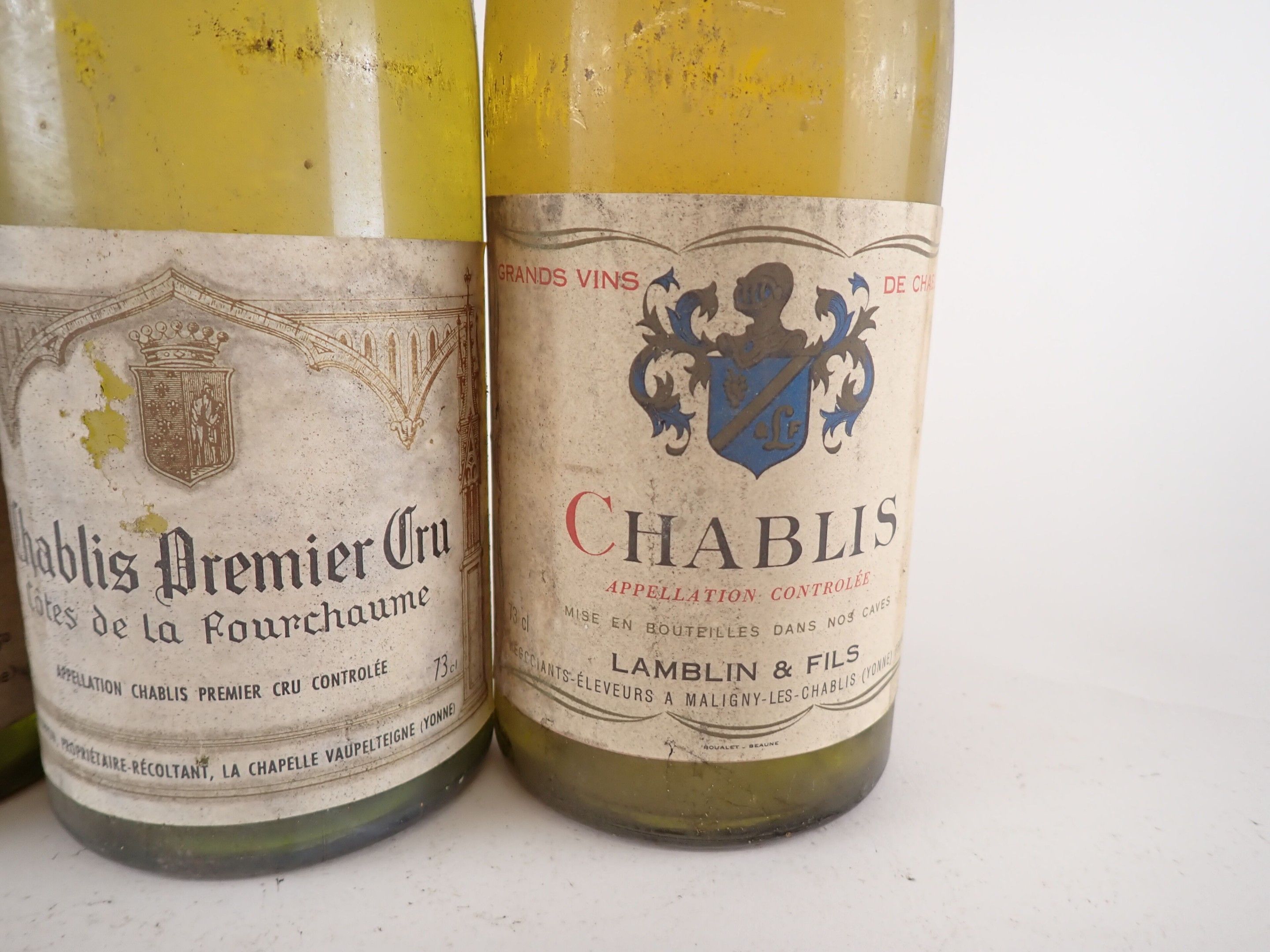 1 bottle Chablis, Lamblin & fils, 1976. Slightly dirty capsule. Collar dirty and damaged. Dirty label.
