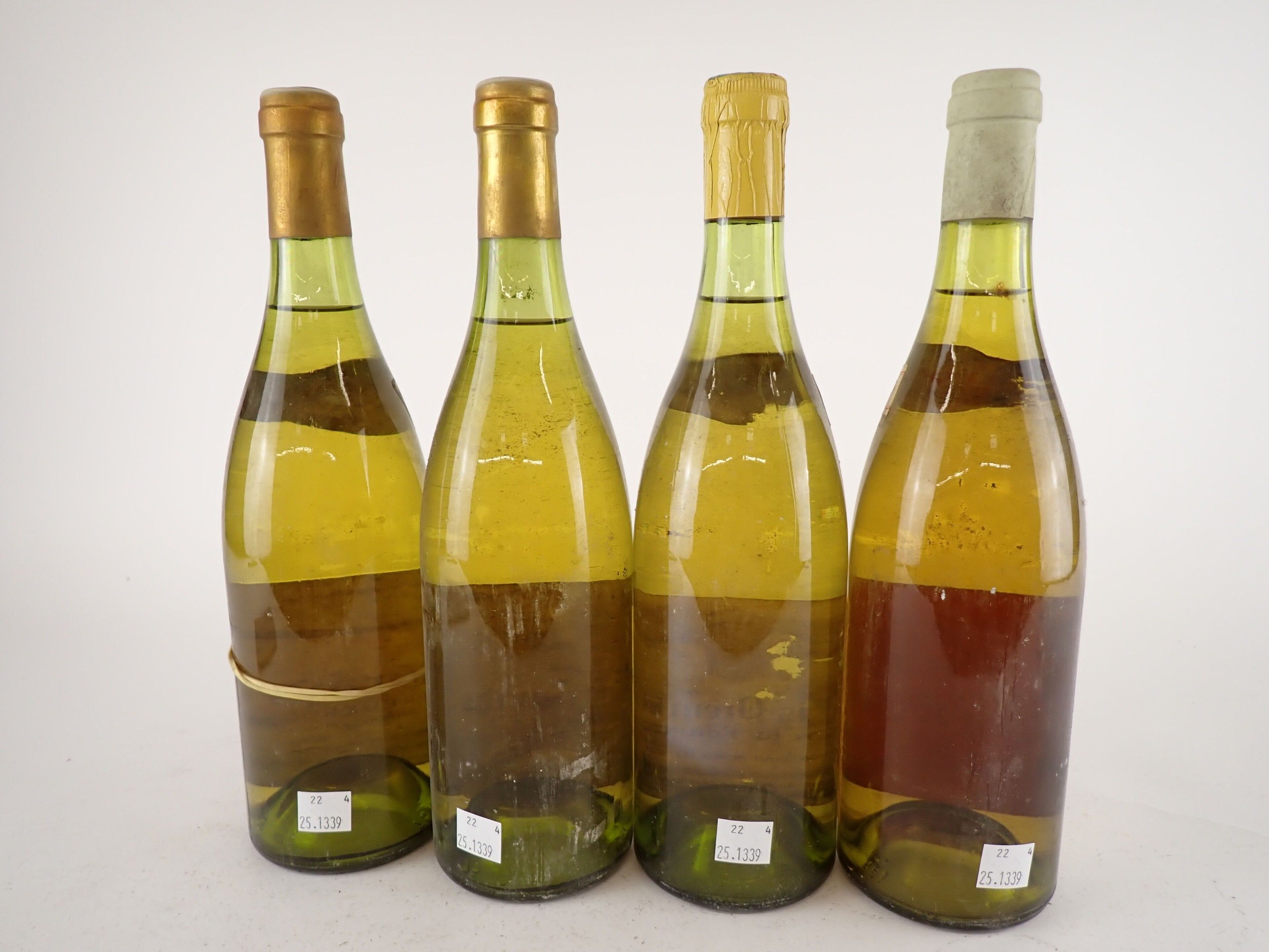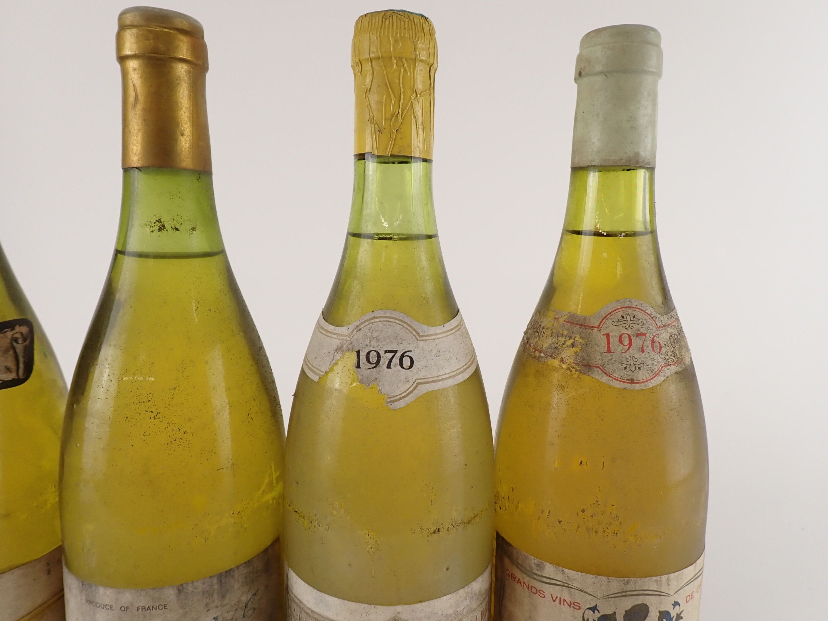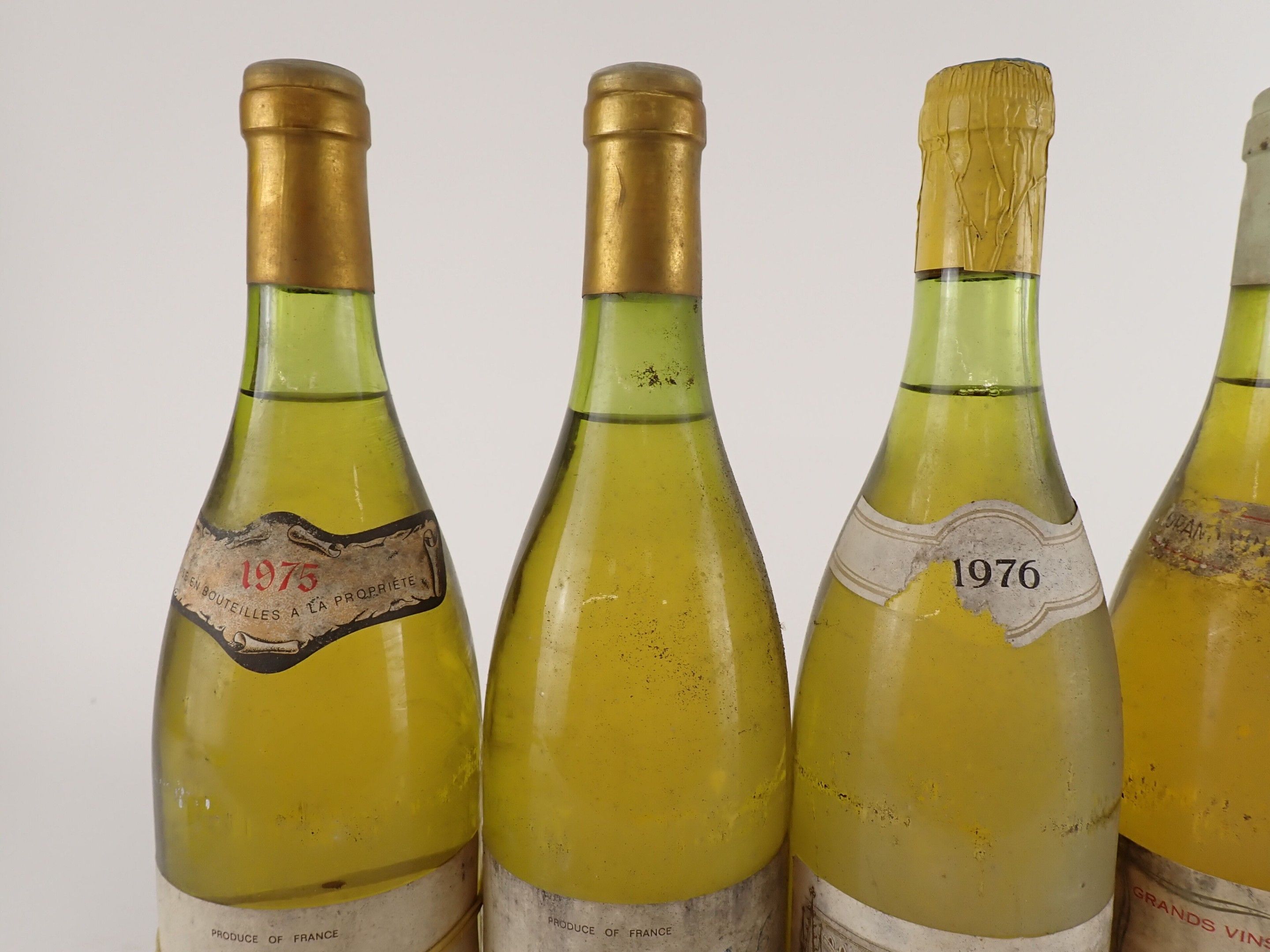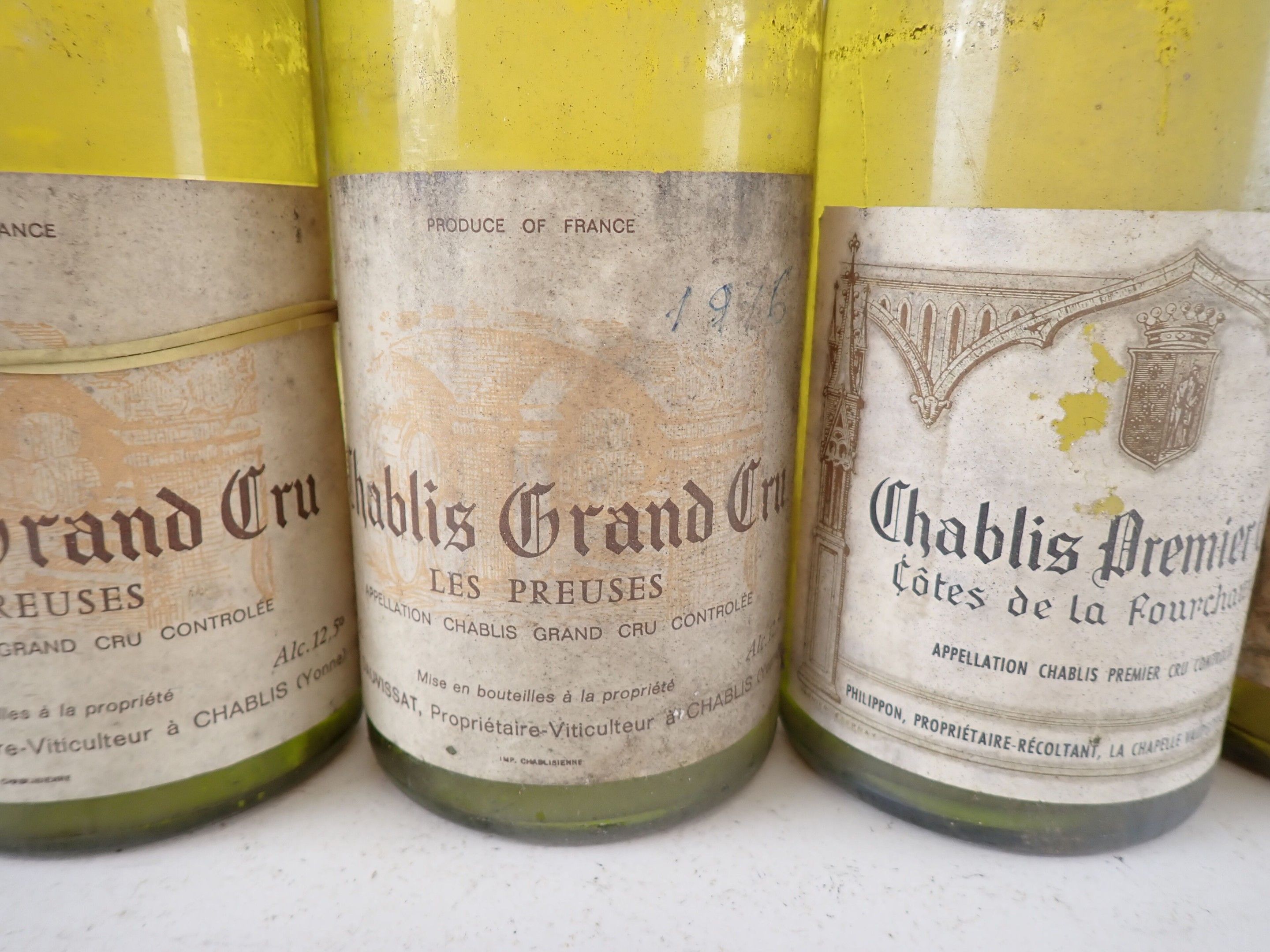 2 bottles, Chablis Grand Cru 'Les Preuses', Jean Dauvissat, 1975 (1) and maybe 1976 (1) ? Caps very slightly dirty. One collar is dirty and the other is missing. Slightly dirty to dirty labels, one of which is completely detached and the other bears a handwritten inscription.