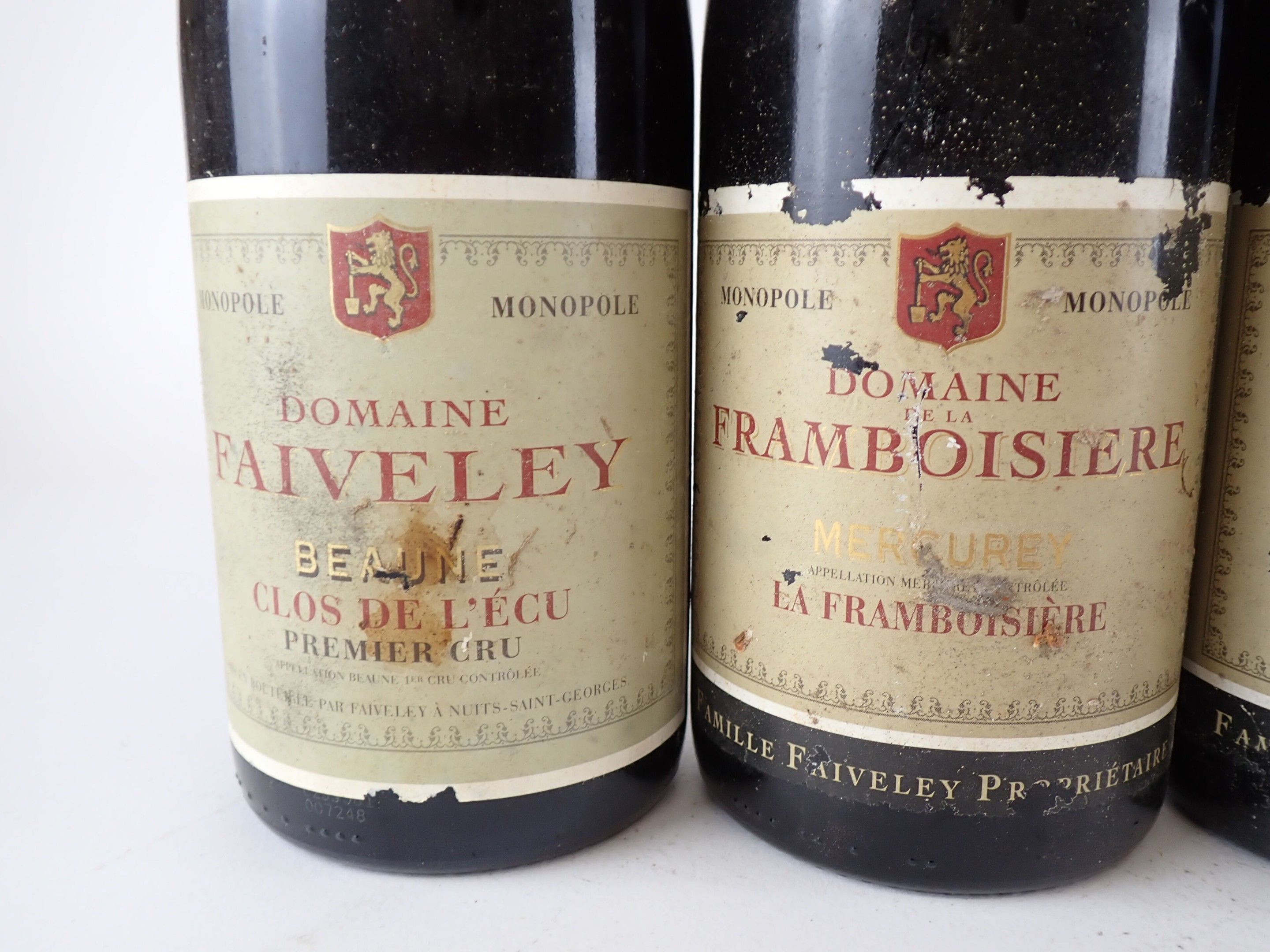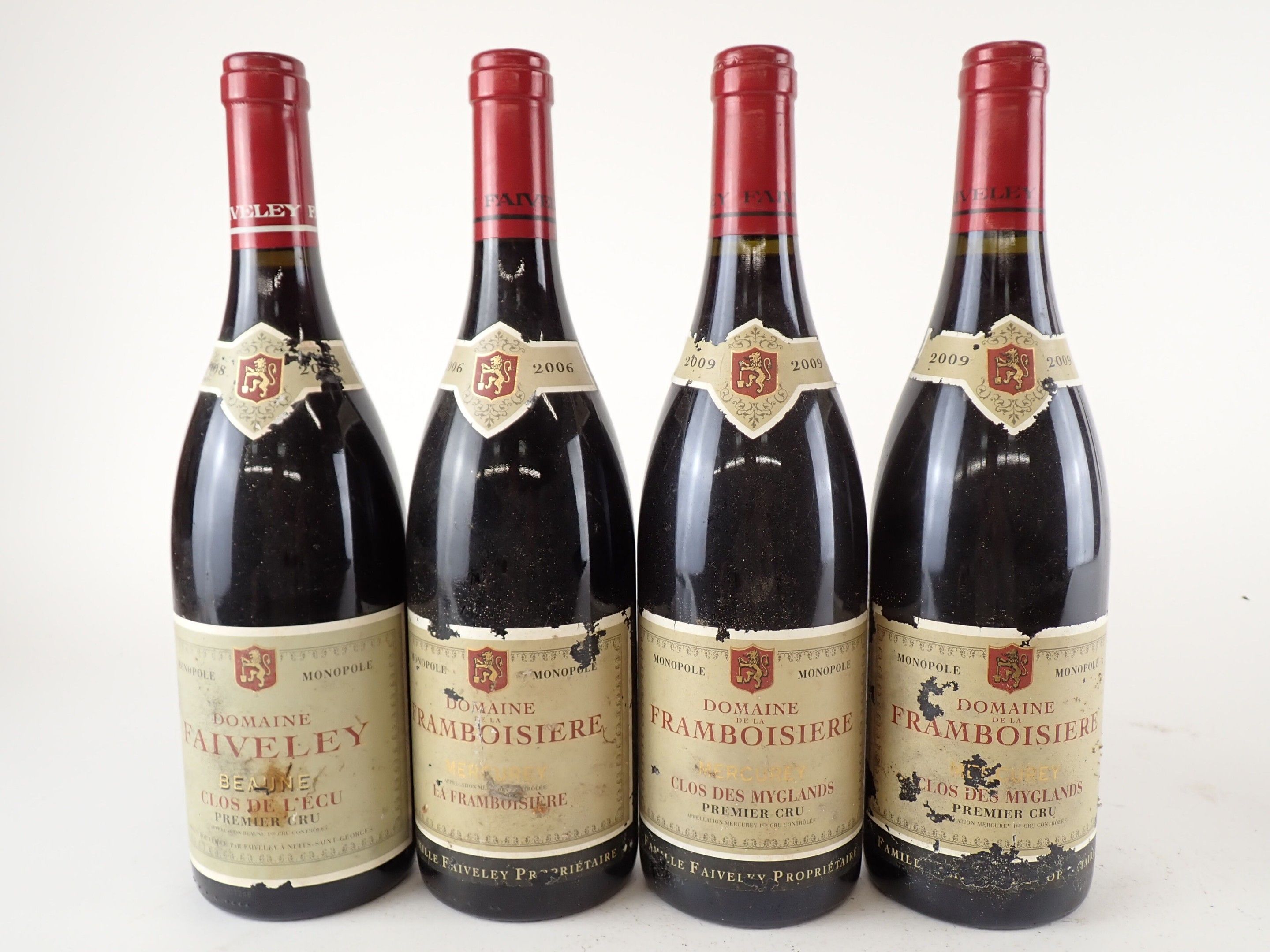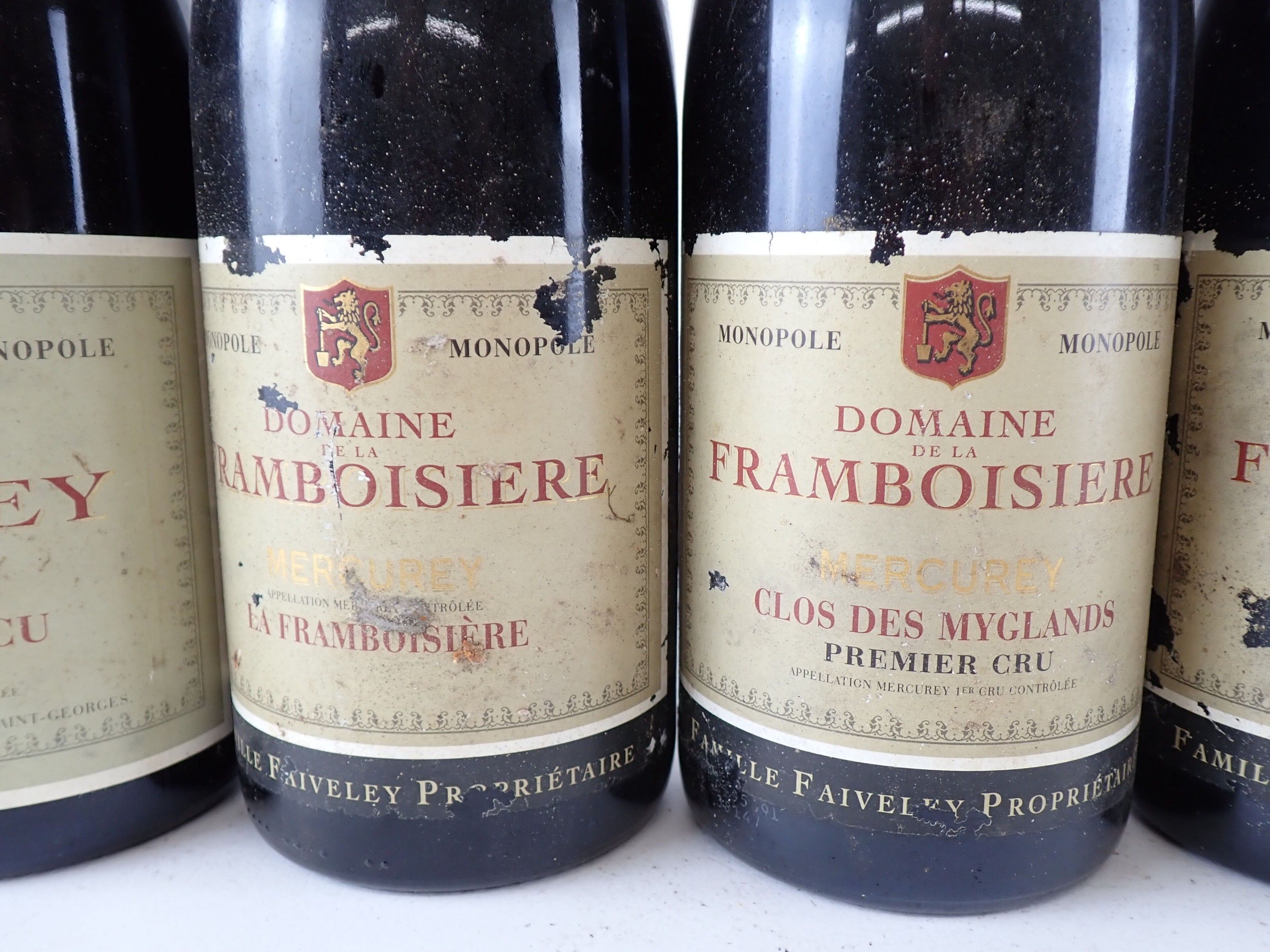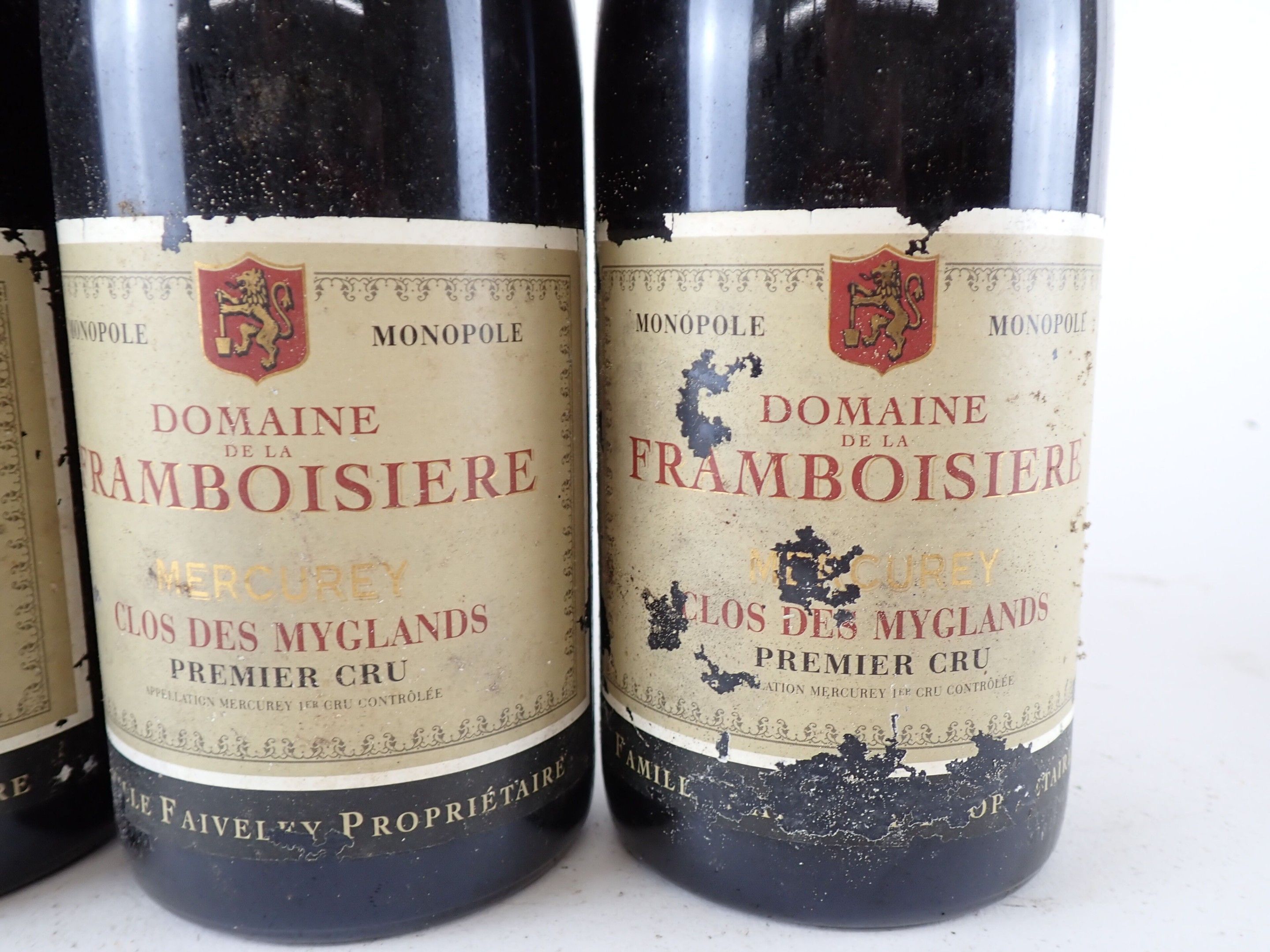 2 bottles, Mercurey 1er 'Clos des Myglands', Faiveley, Domaine de la Framboisière, 2009. Collars and labels slightly dirty and damaged. Back labels dirty and very damaged.