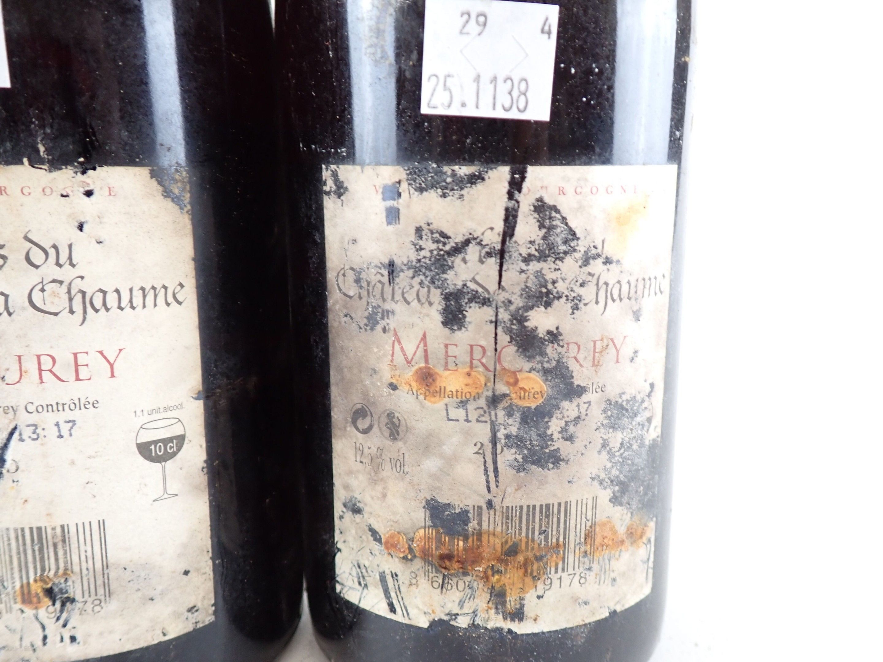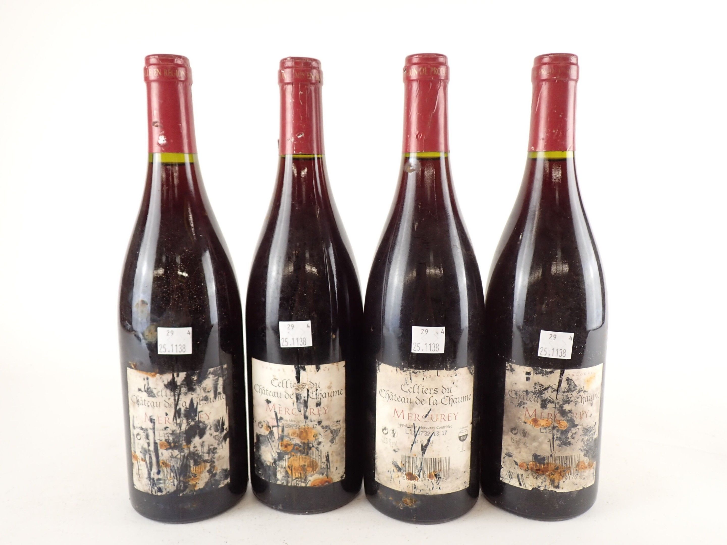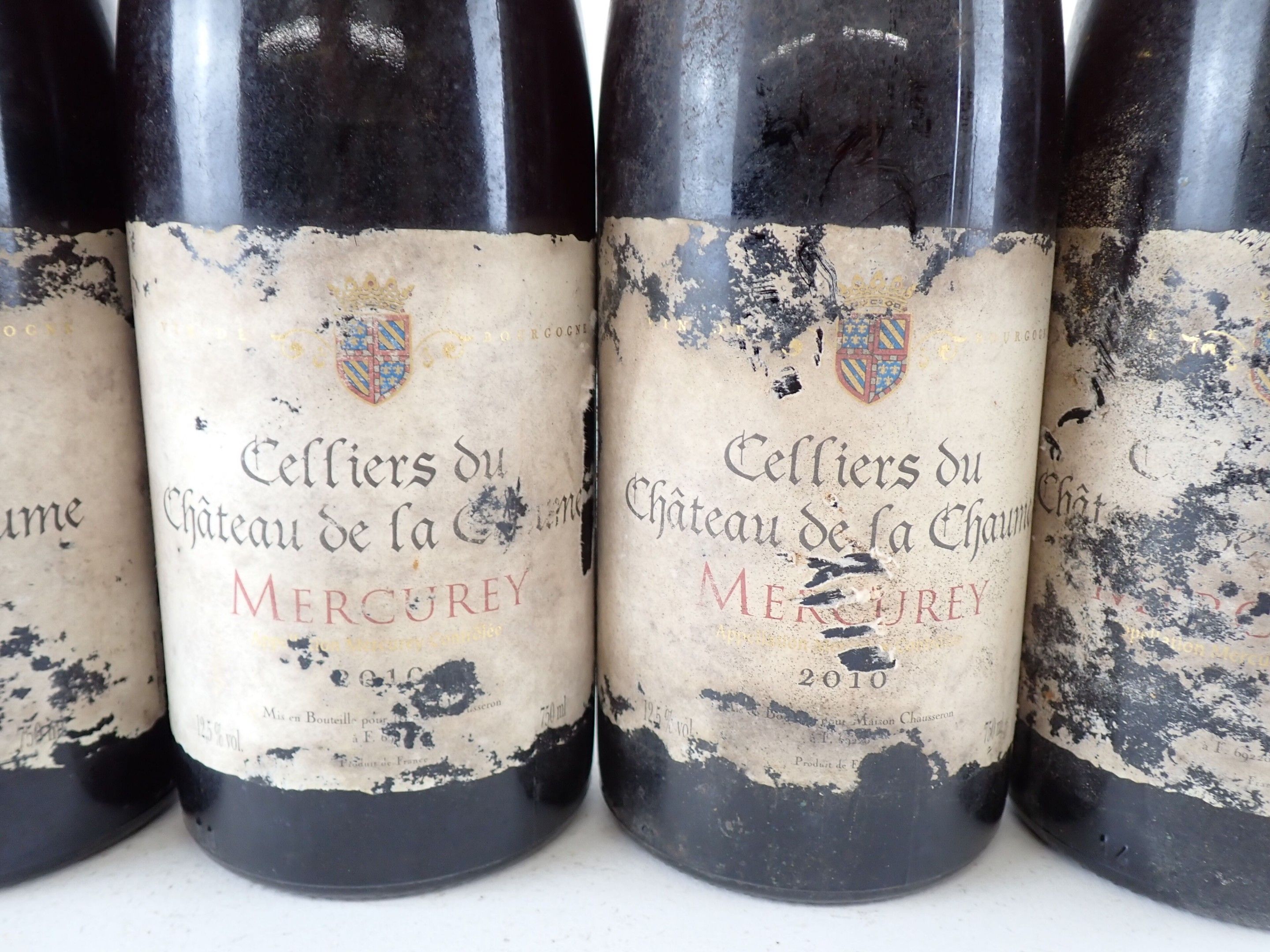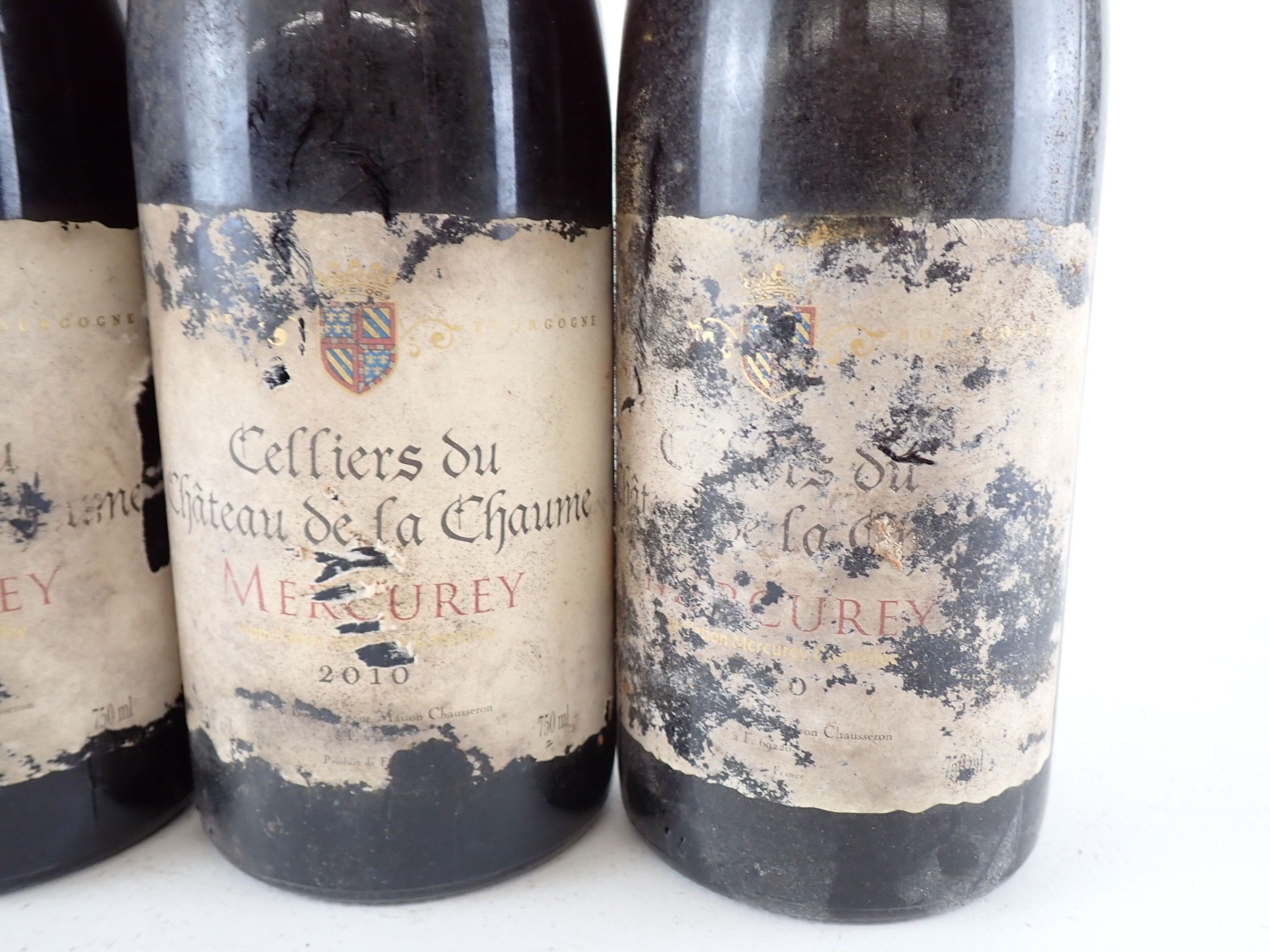 BOURGOGNE - 4 bottles, Mercurey, Cellier du Château de la Chaume, 2010 (or supposedly of this vintage for 3 bottles). Damaged capsules. Labels and back labels dirty to very dirty and degraded to very degraded.