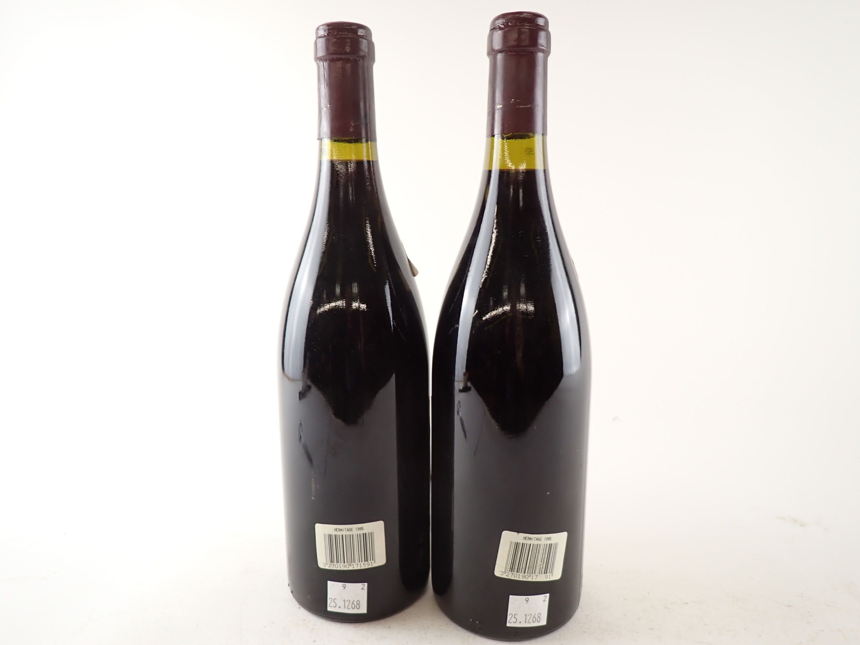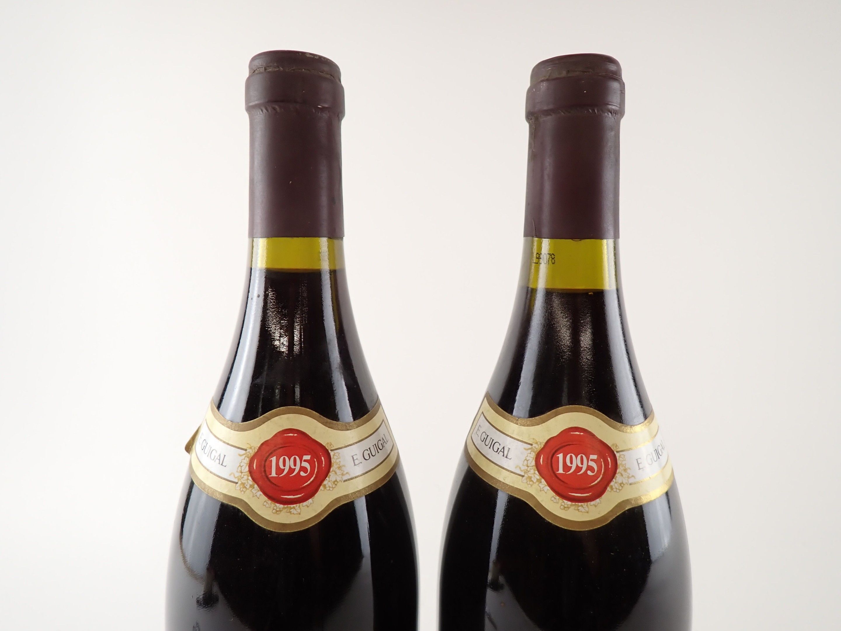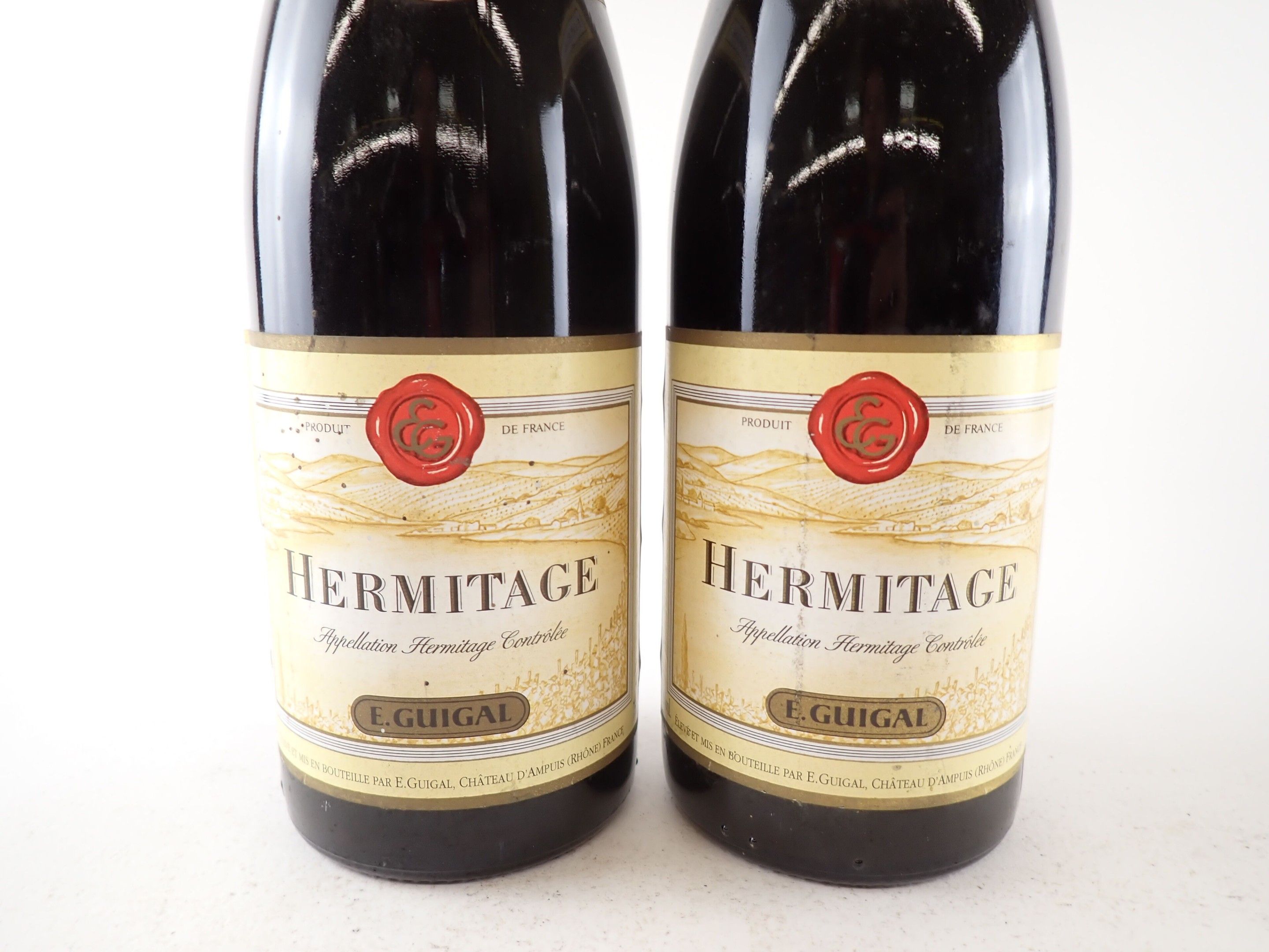 RHÔNE - 2 bottles, Hermitage, Guigal, 1995. Corks very slightly engaged. Caps slightly dirty and curved. Labels very slightly dirty, one of which is detached on its left side.