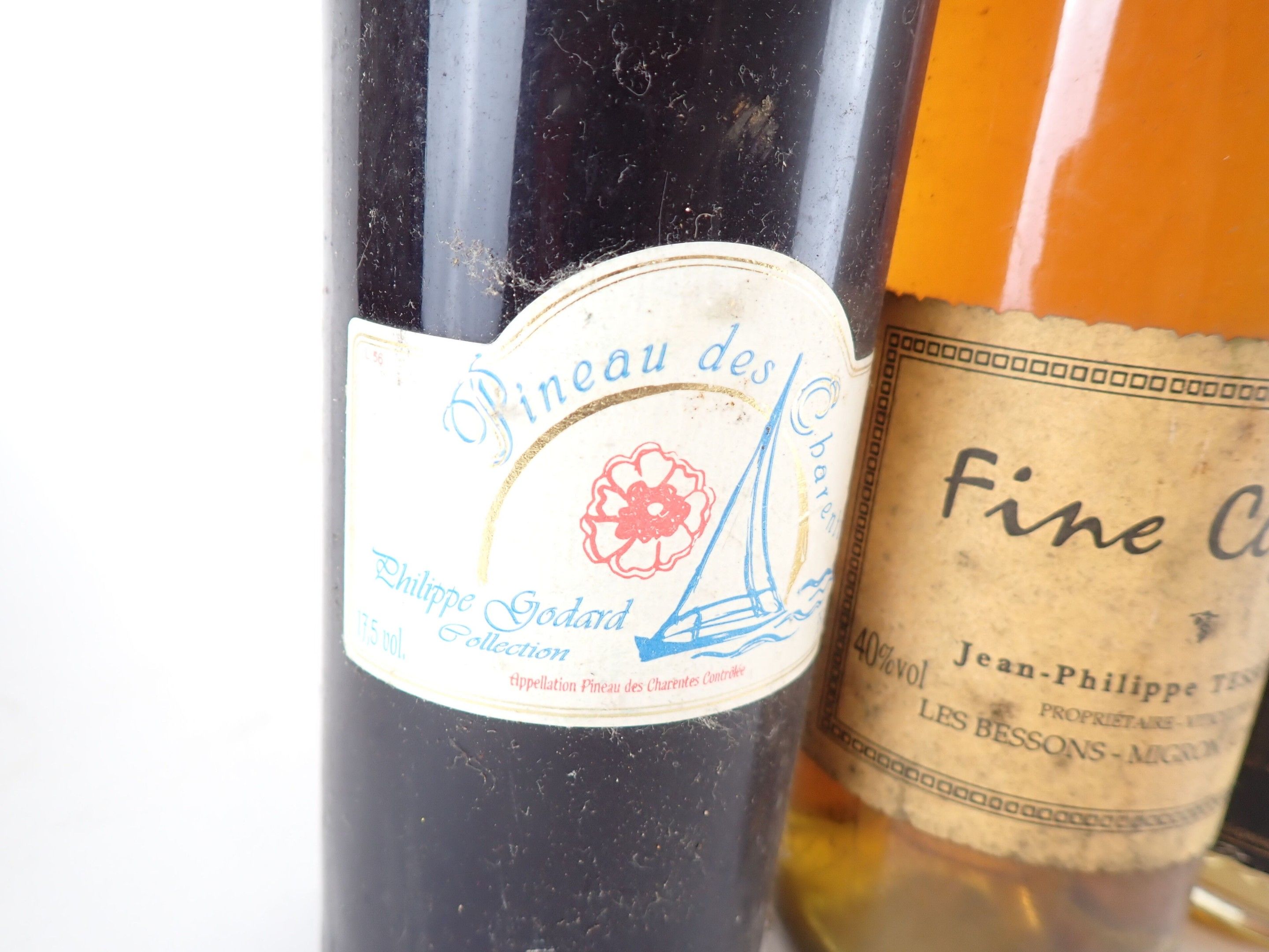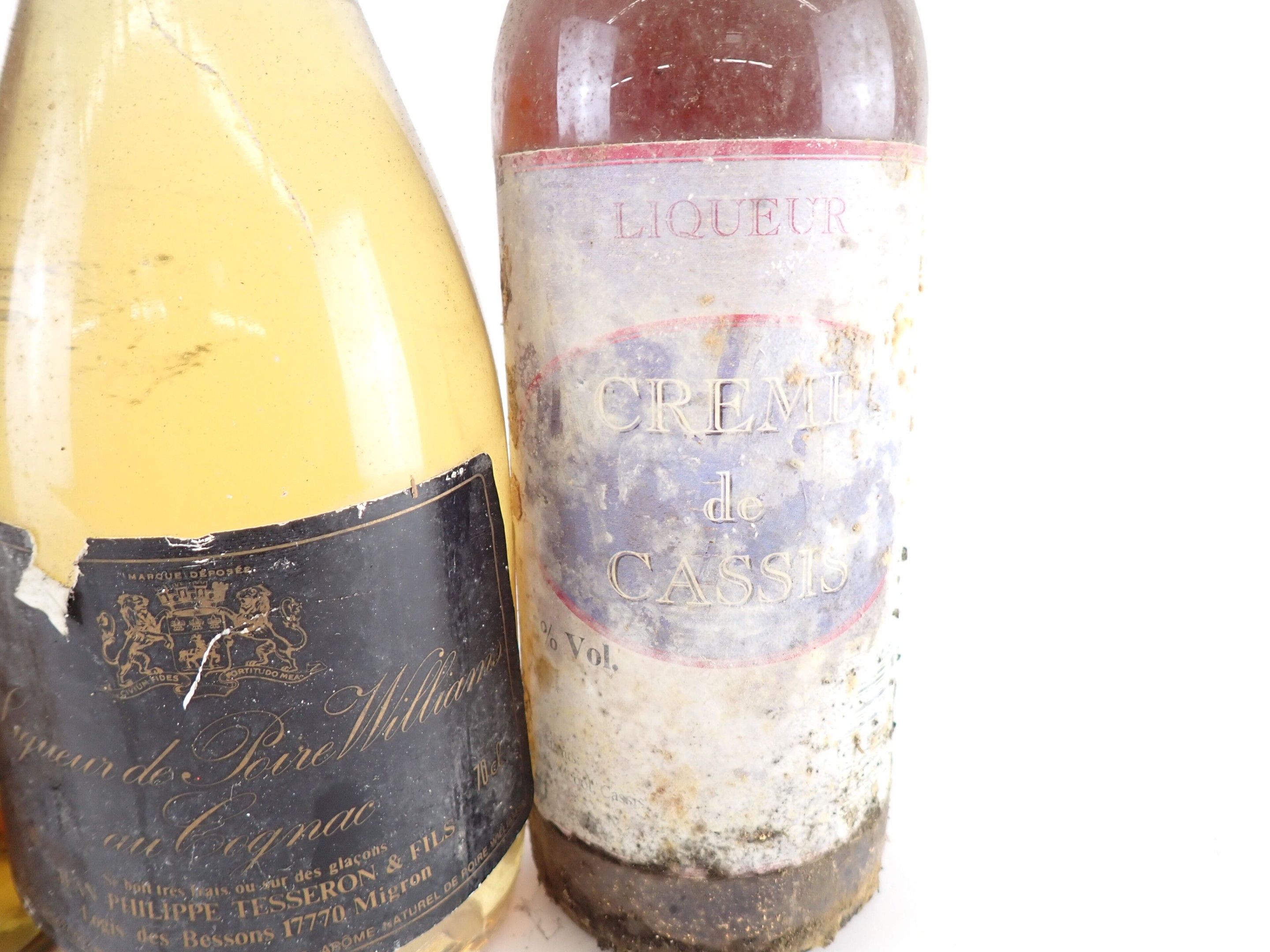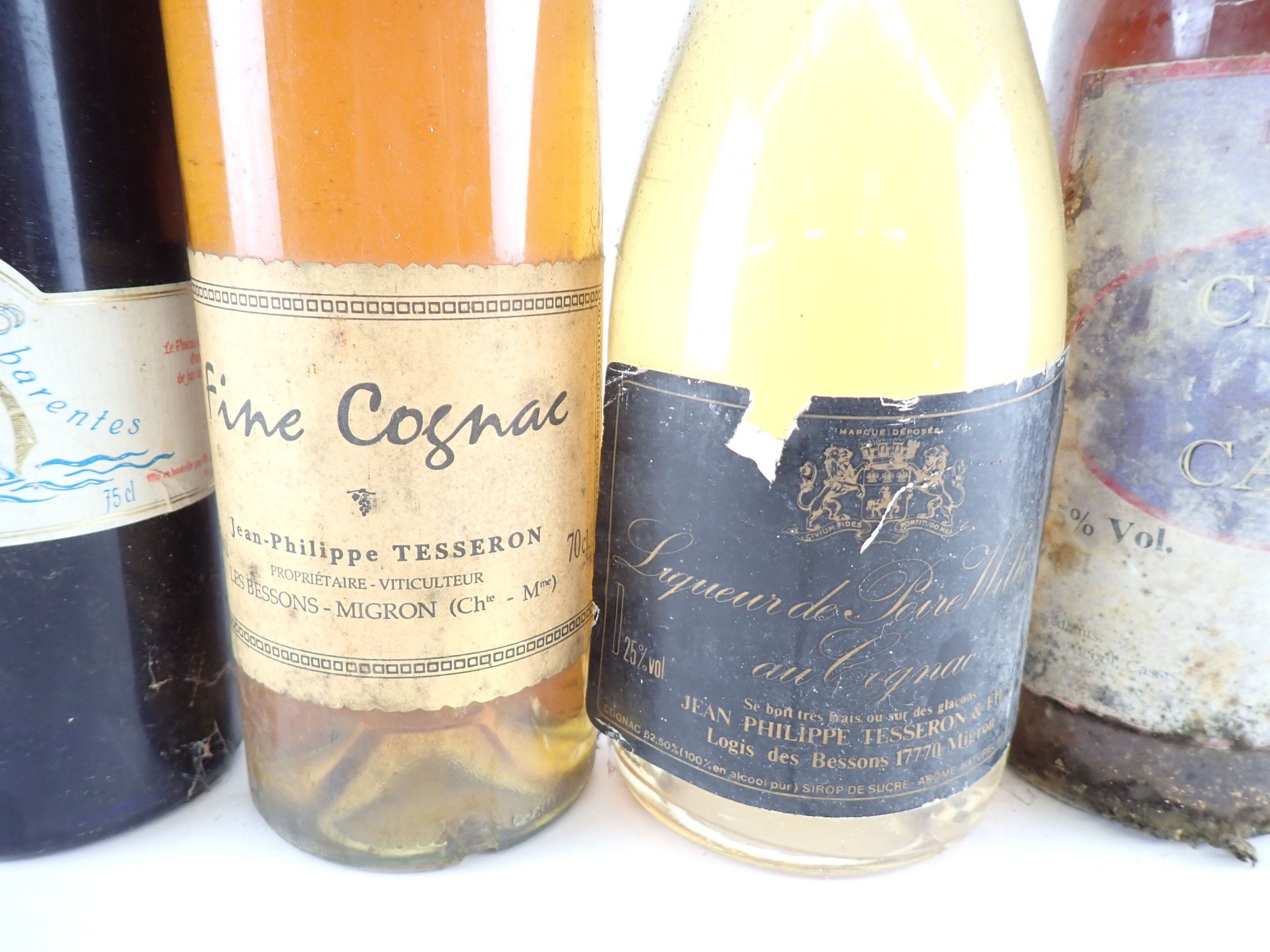 MISCELLANEOUS - Set of 4 bottles comprising a bottle of Fine Cognac, a bottle of Pineau des Charentes, a bottle of Williams Pear Liqueur with Cognac and a bottle of Crème de Cassis. As is.
