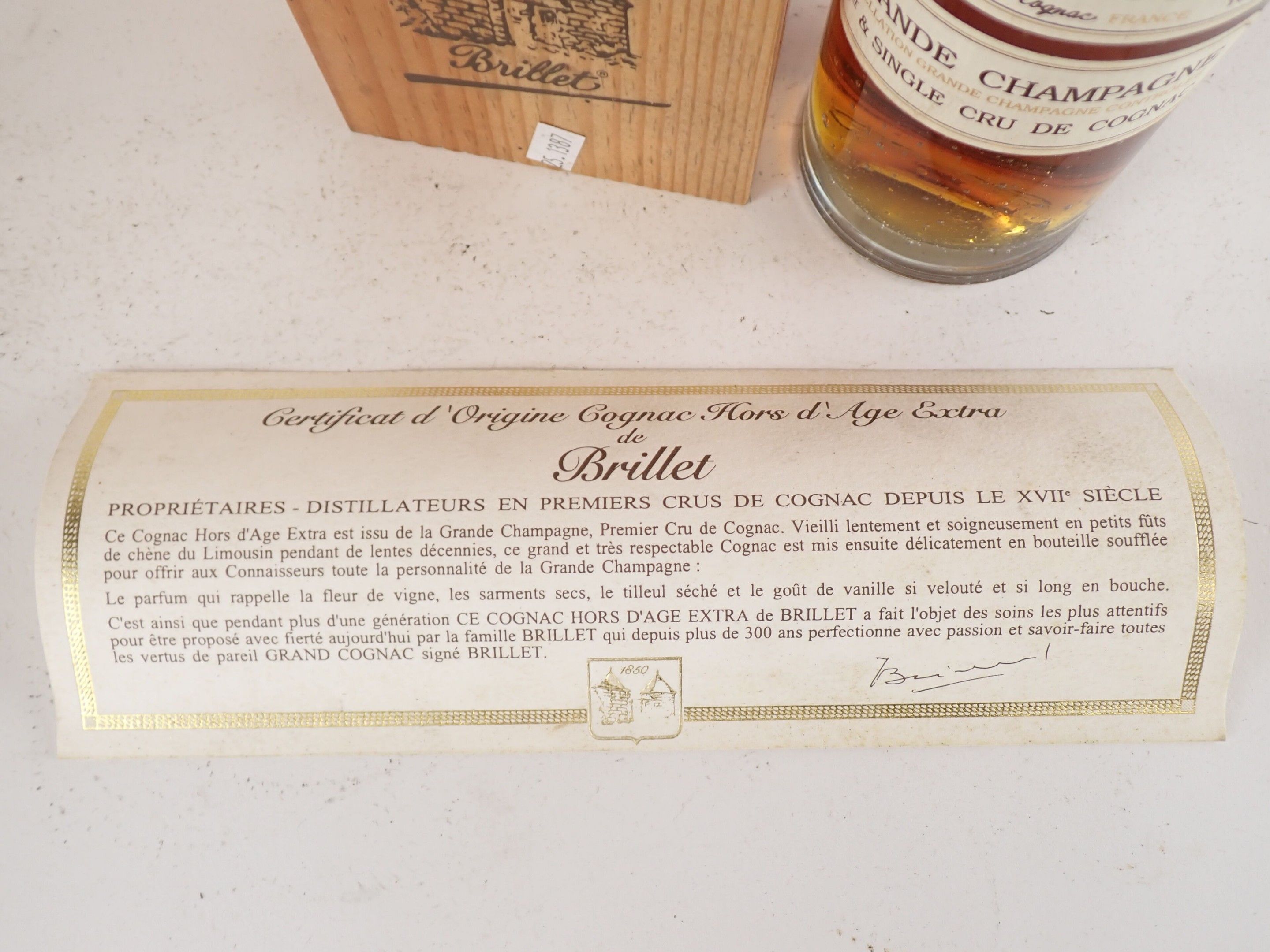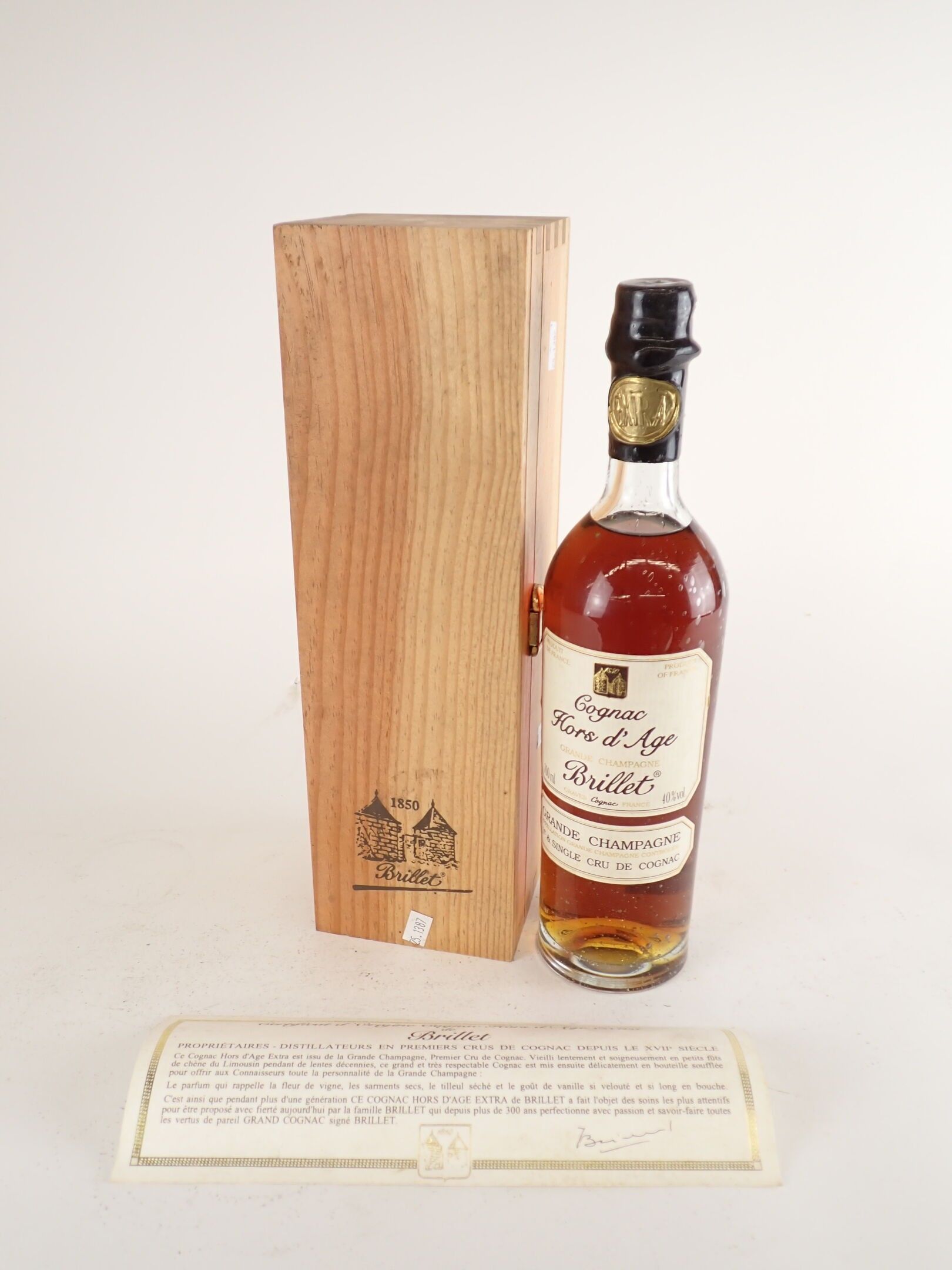 COGNAC - 1 bottle, Cognac Grande Champagne, Brillet, Hors d'Âge Extra. In wooden box with certificate of origin. Slightly low level. Wax capsule and label with some slight traces.