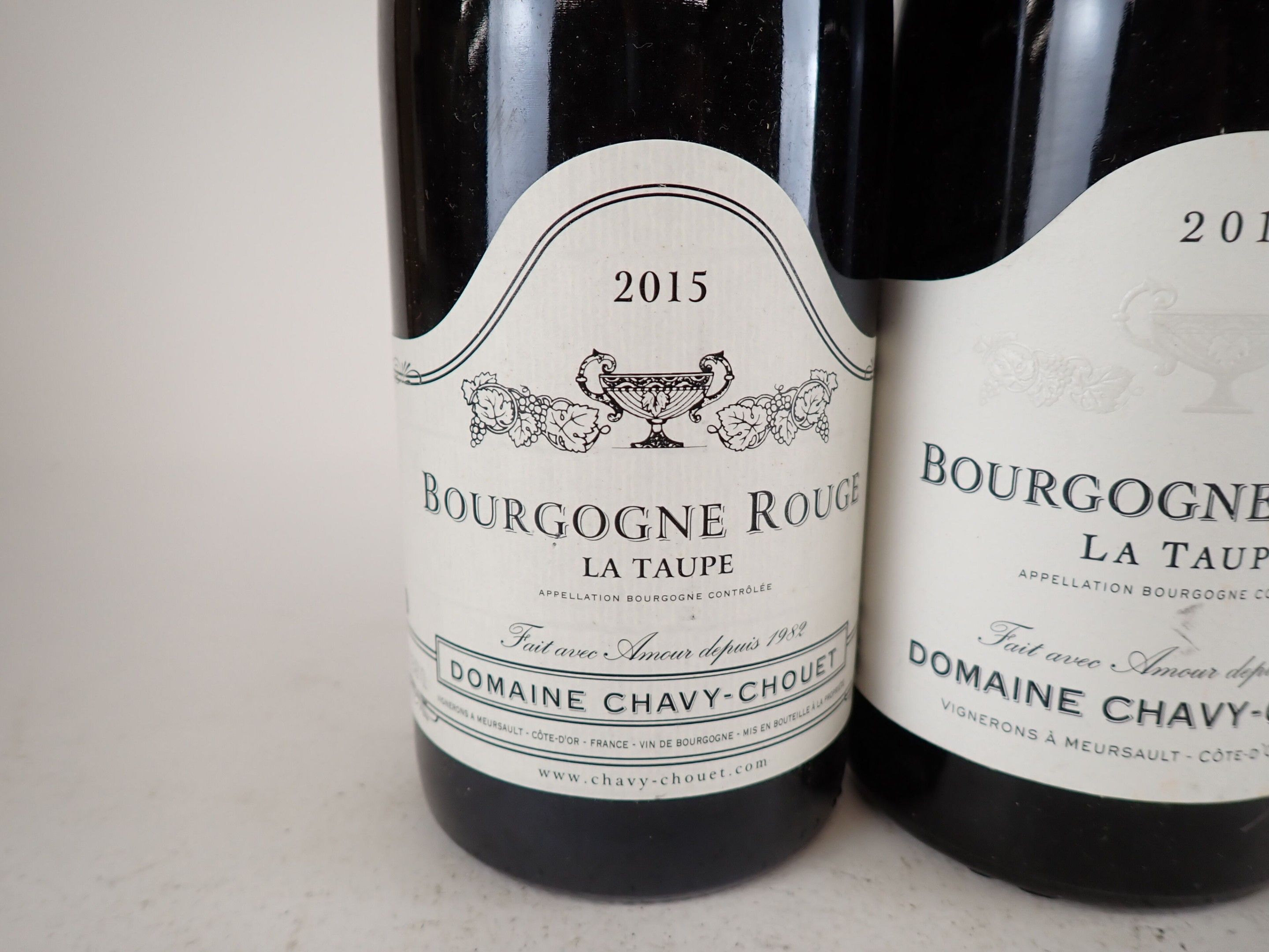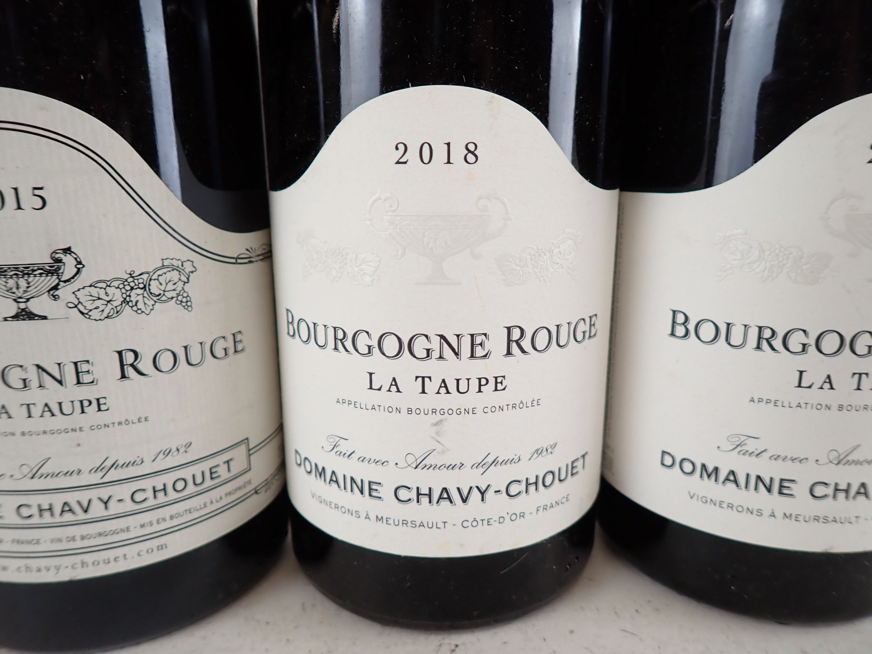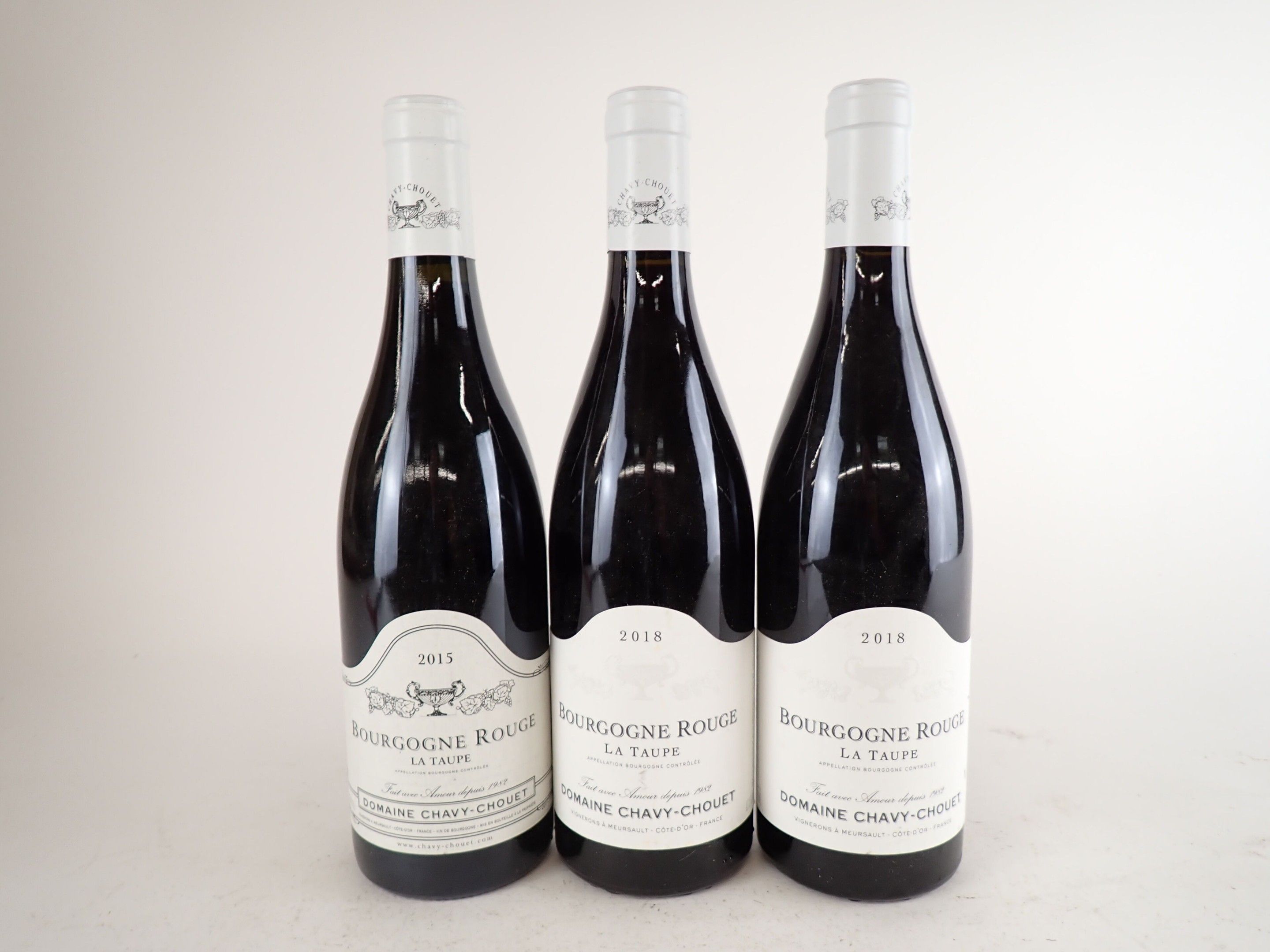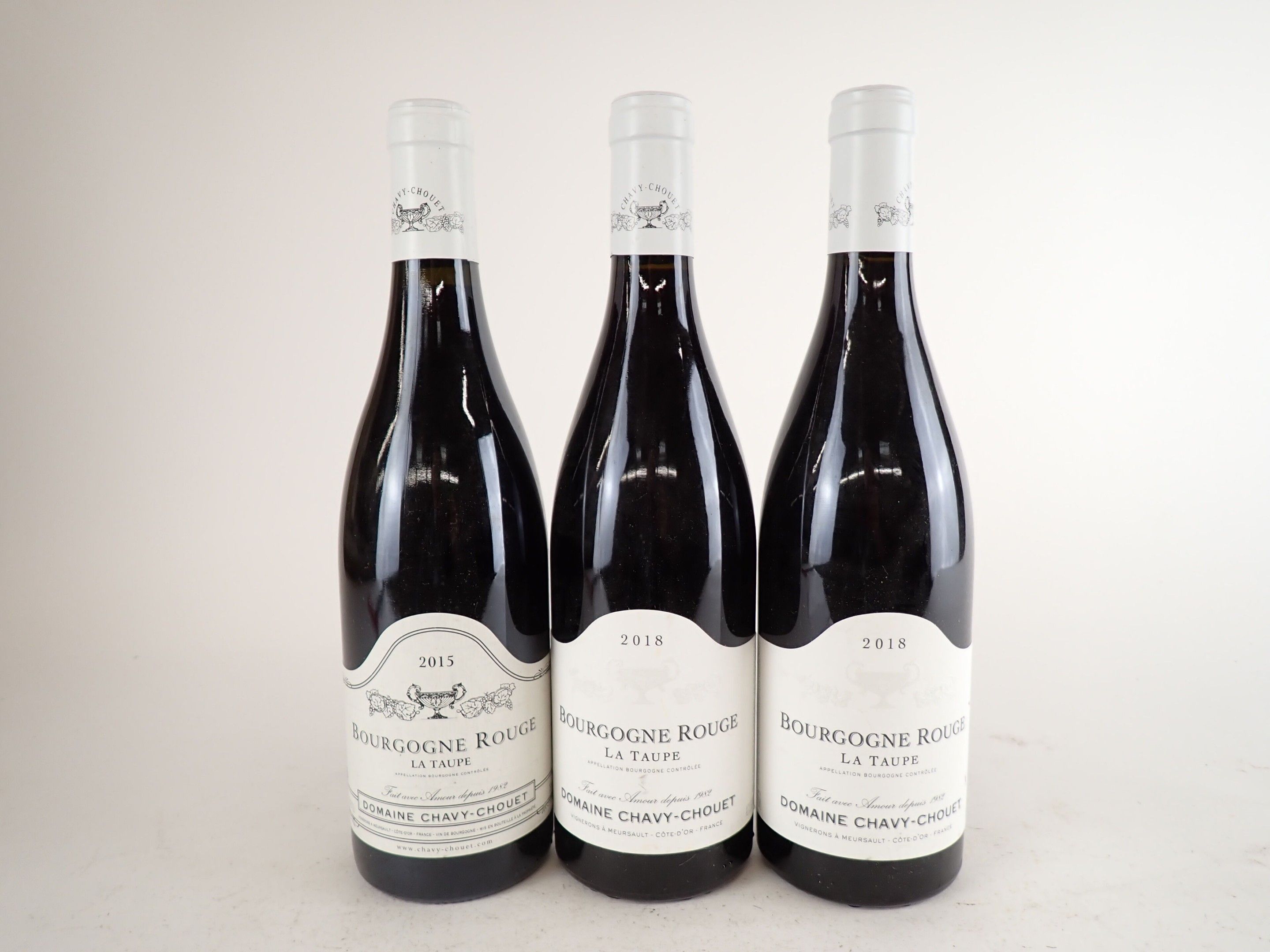 BOURGOGNE - 3 bottles, Bourgogne 'La Taupe', Domaine Chavy-Chouet, 2015 (1) and 2018 (2). Two labels with marks, one of which also has small scratches.
