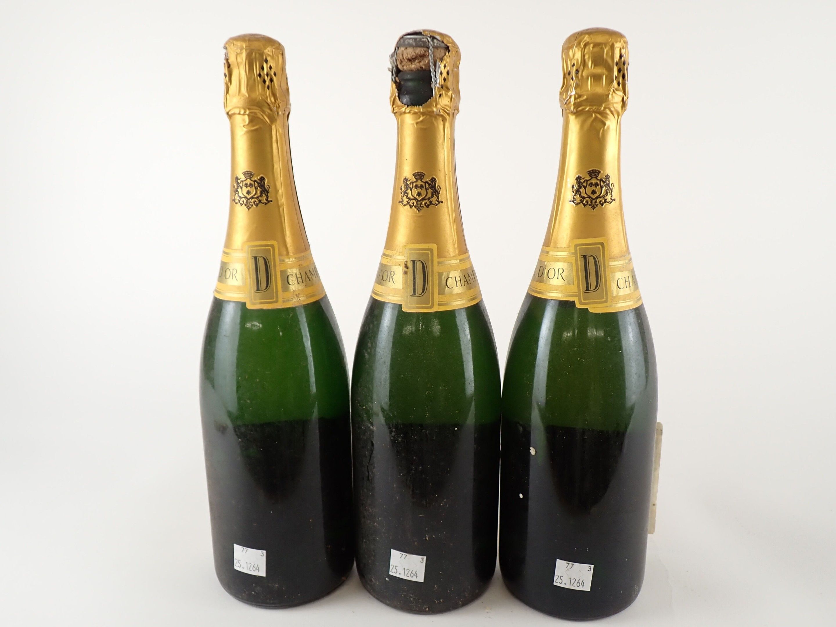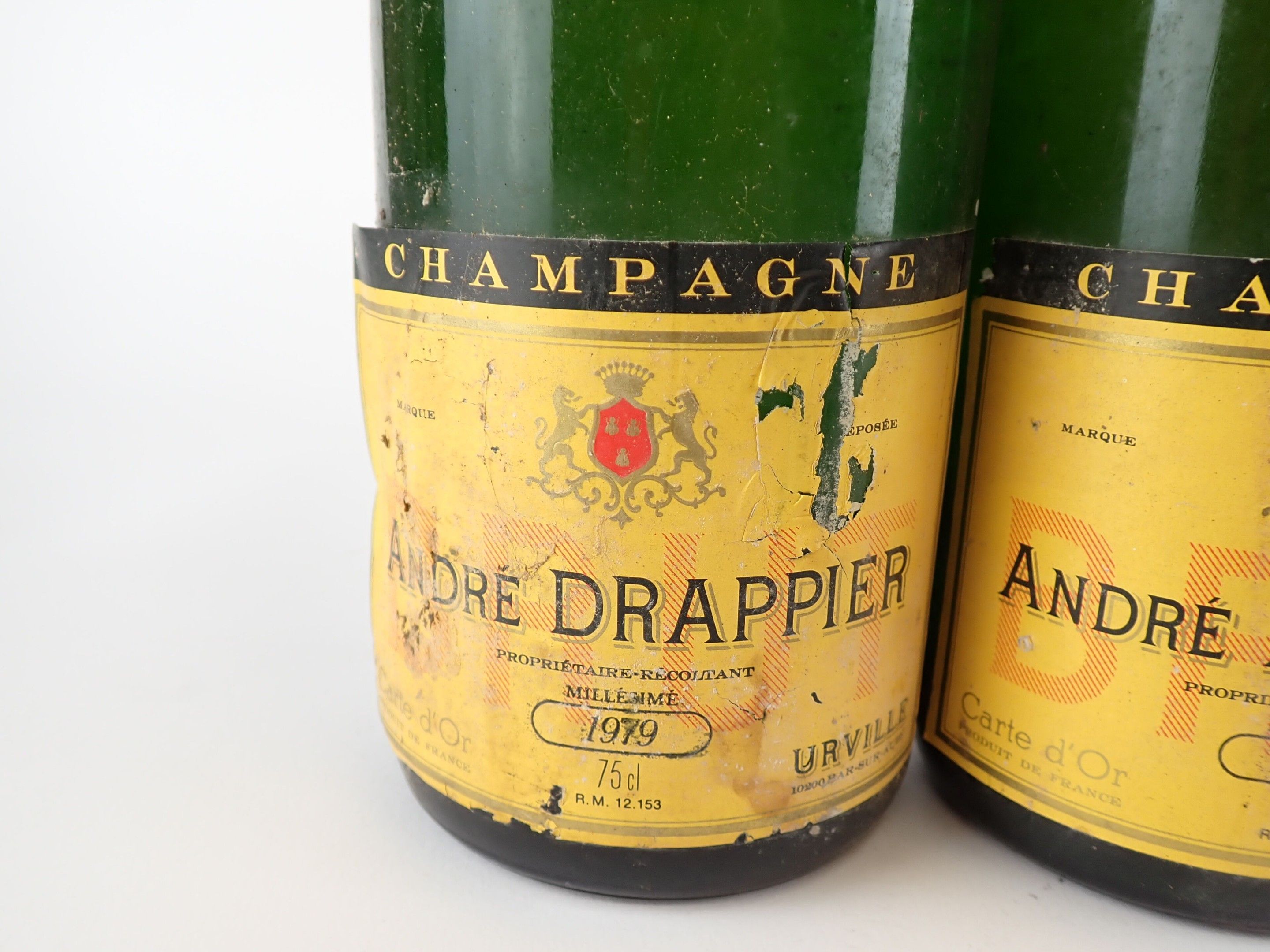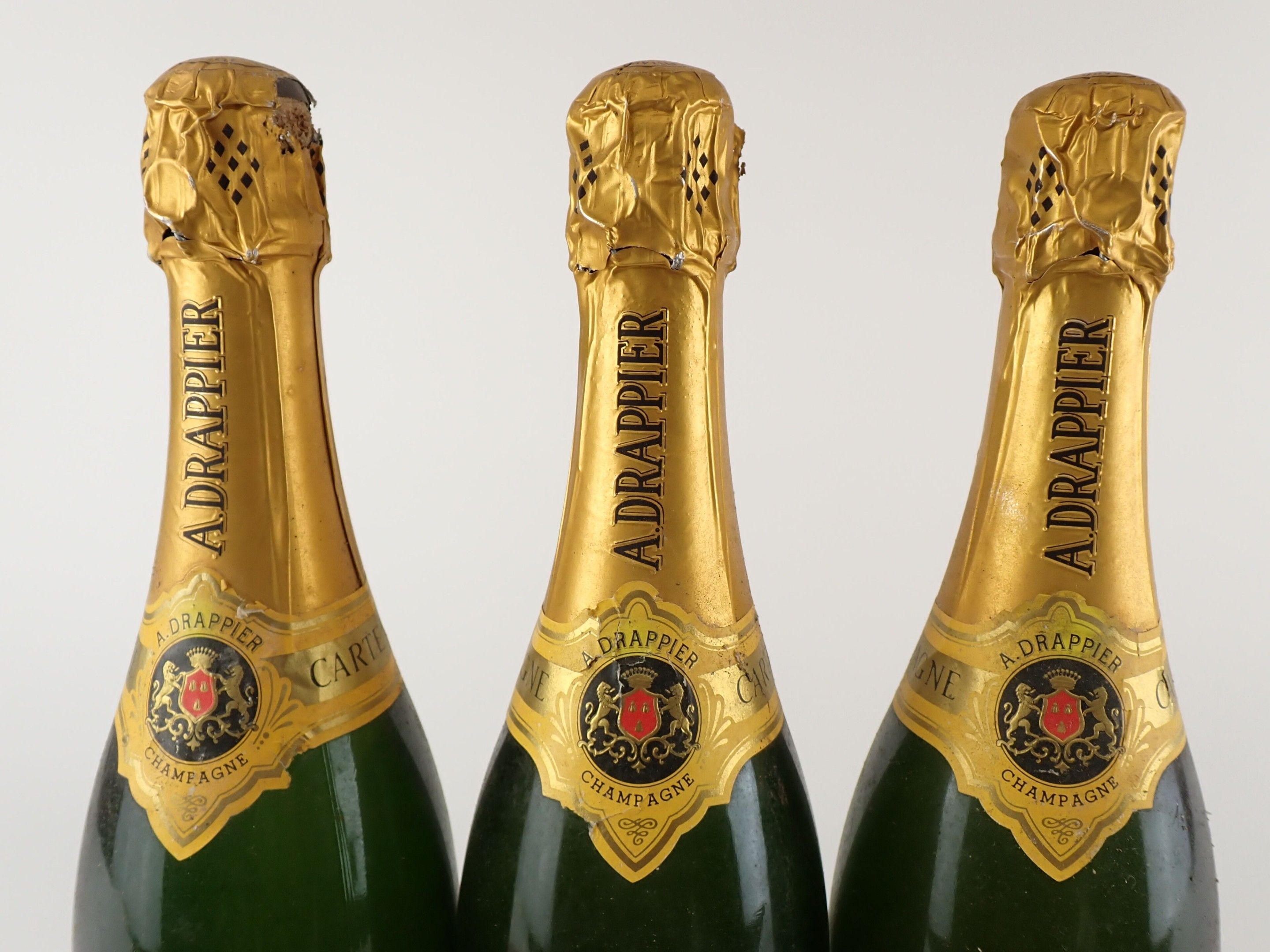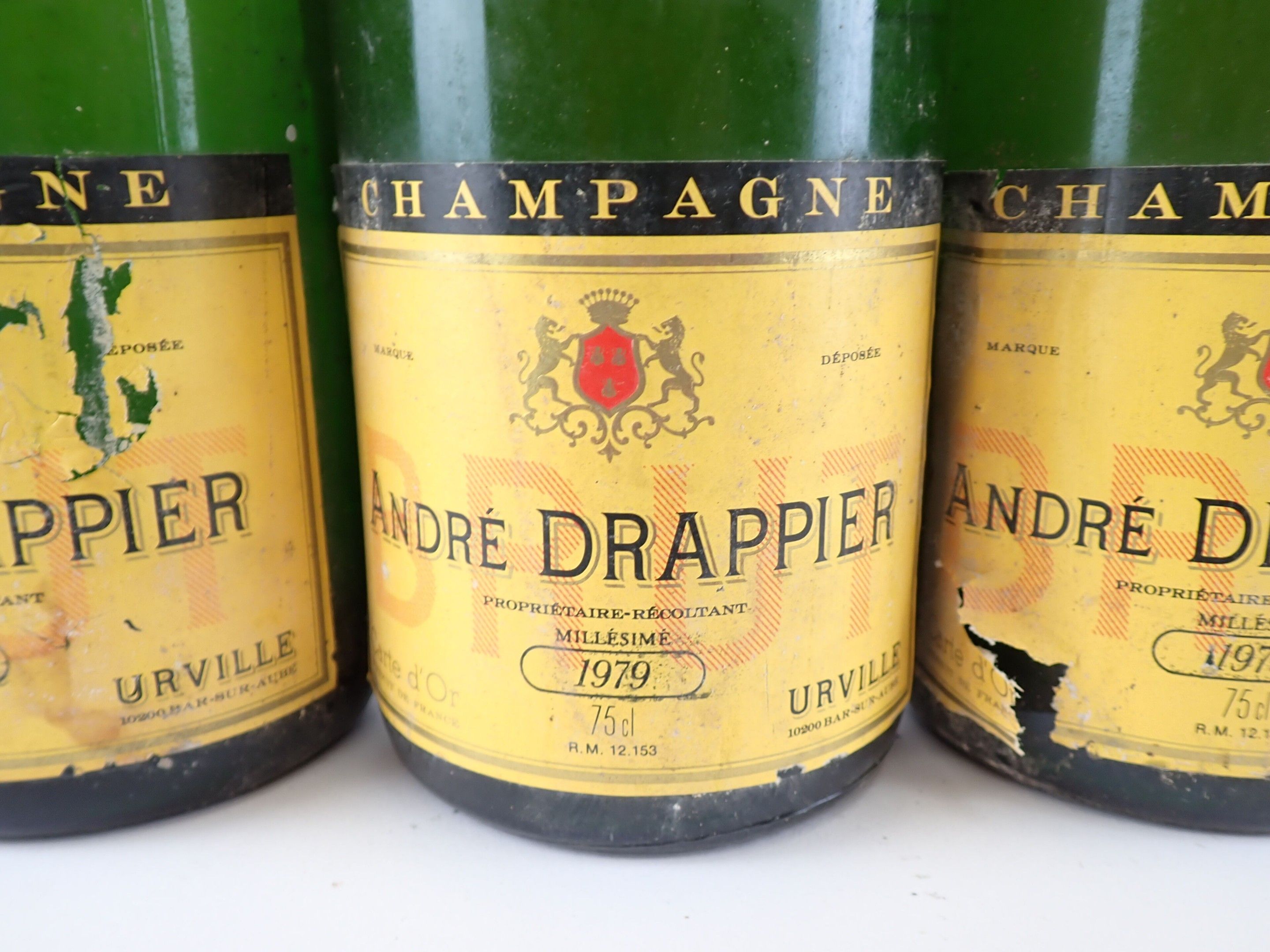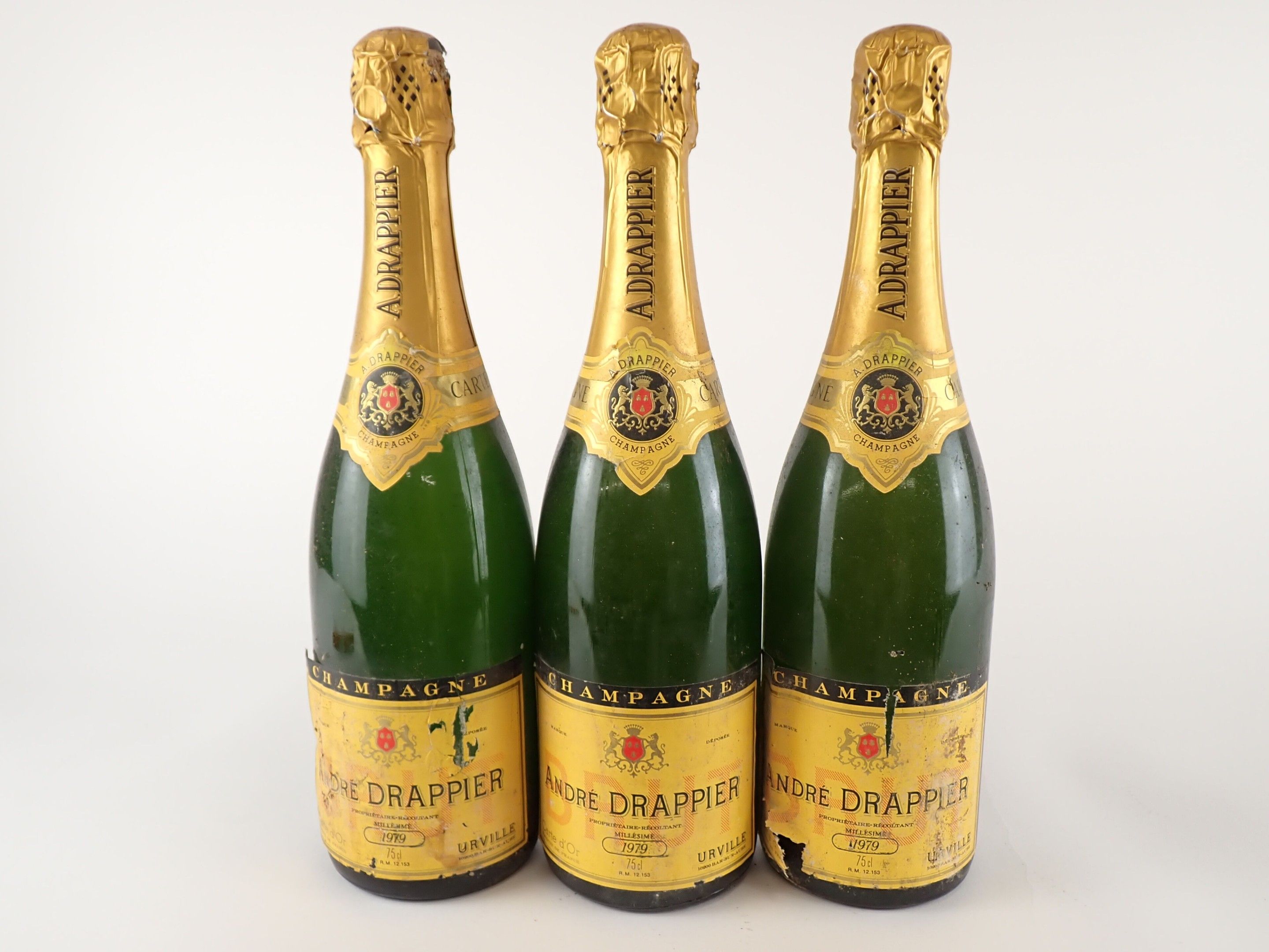 CHAMPAGNE - 3 bottles, Champagne, André Drappier, Carte d'Or, Brut,1979. Covers slightly dirty. Lightly soiled to dirty labels, two of which are partially detached and damaged.