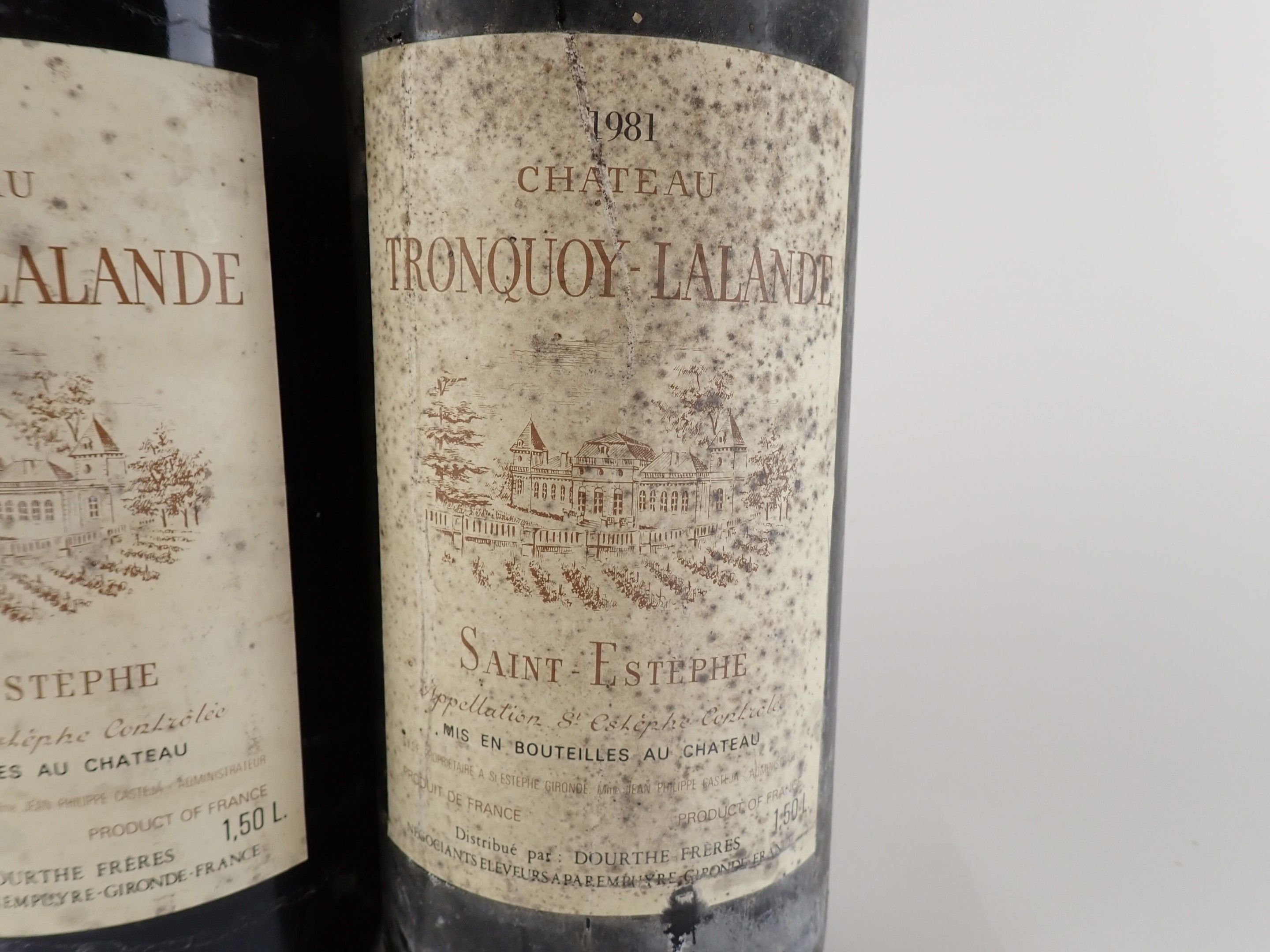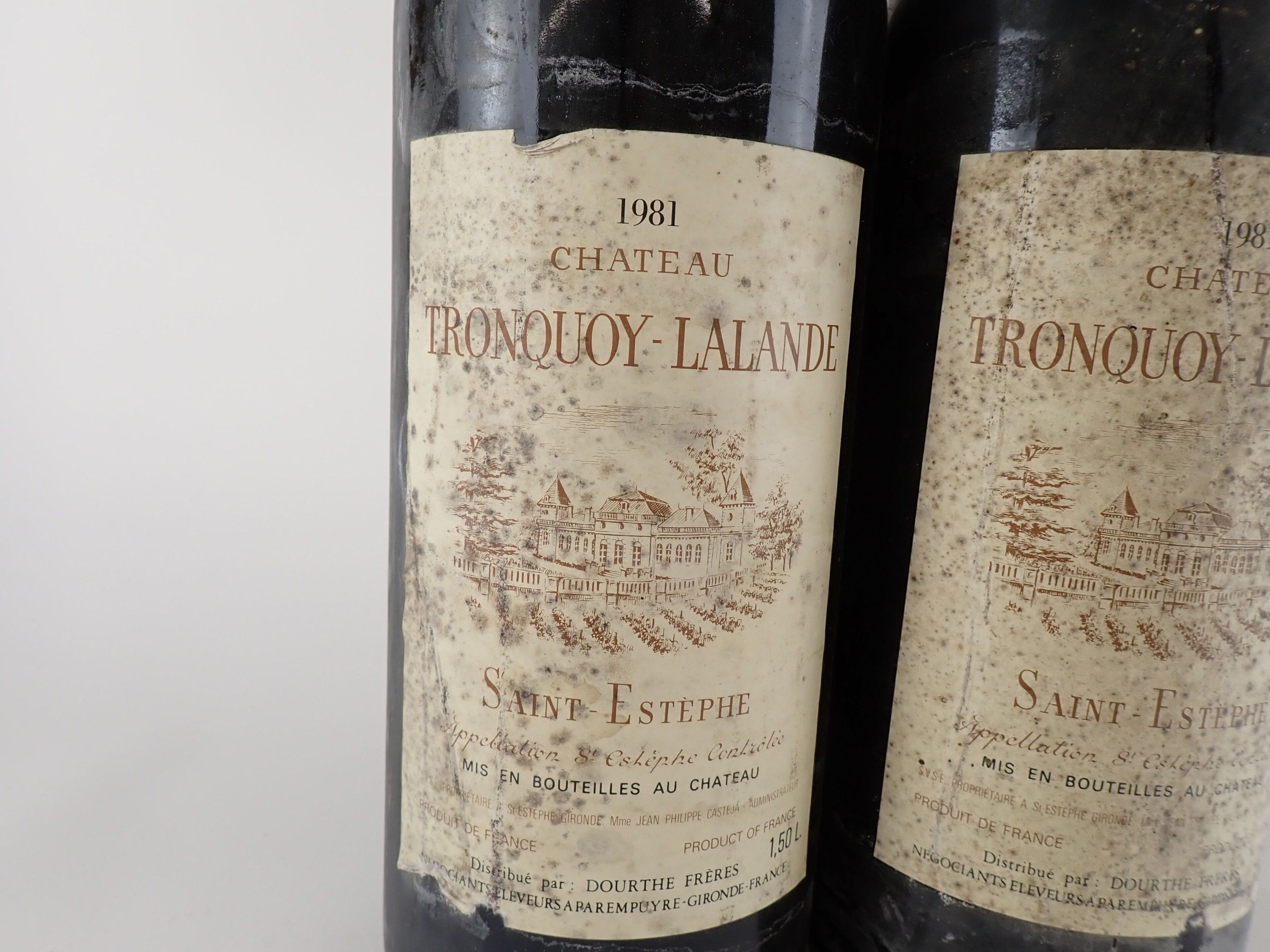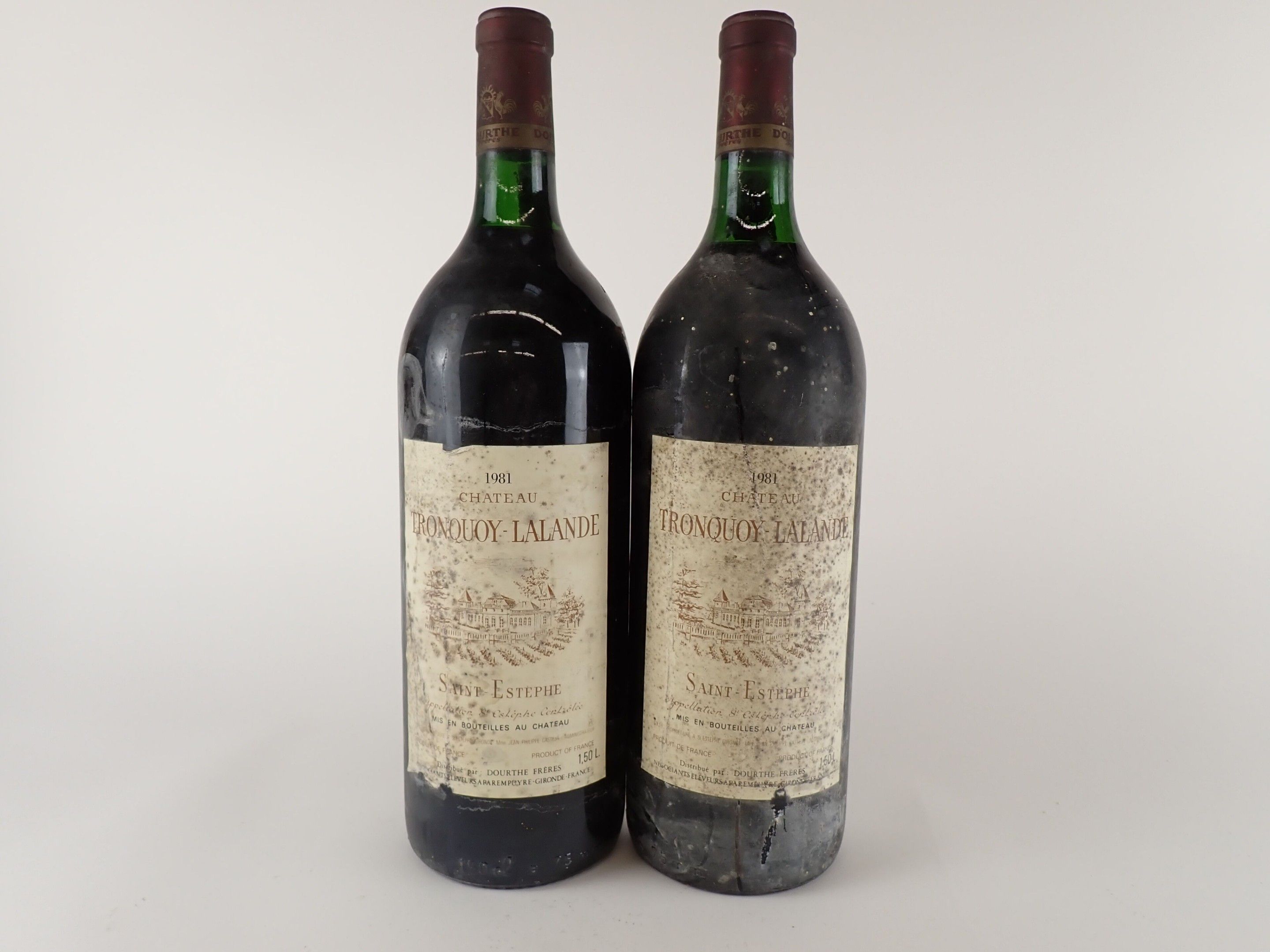 BORDEAUX - 2 magnums, Saint-Estèphe, Château Tronquoy-Lalande, 1981. 2.8 cm and 3.5 cm. Caps slightly dirty and curved. Dirty to very dirty labels, one slightly damaged.