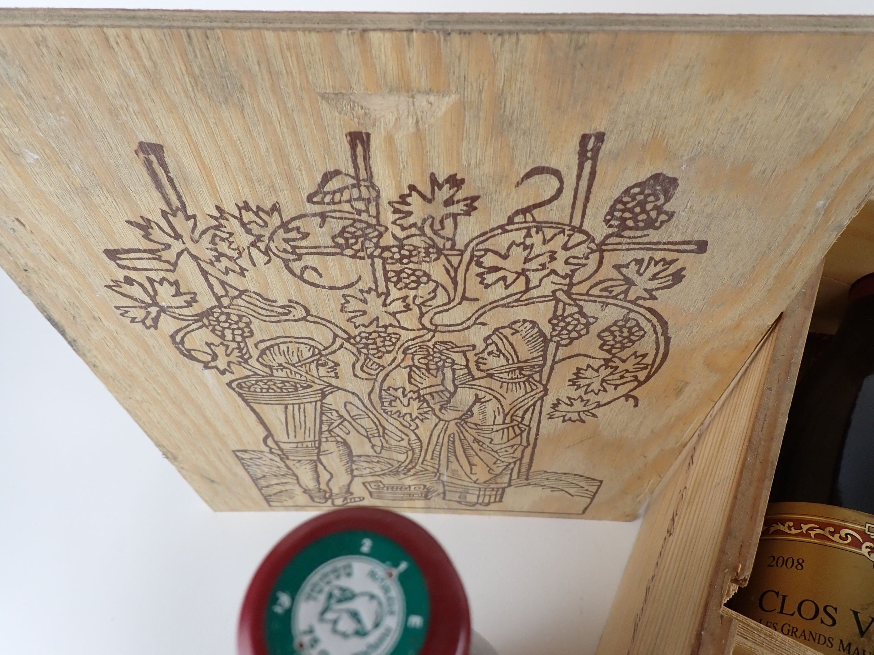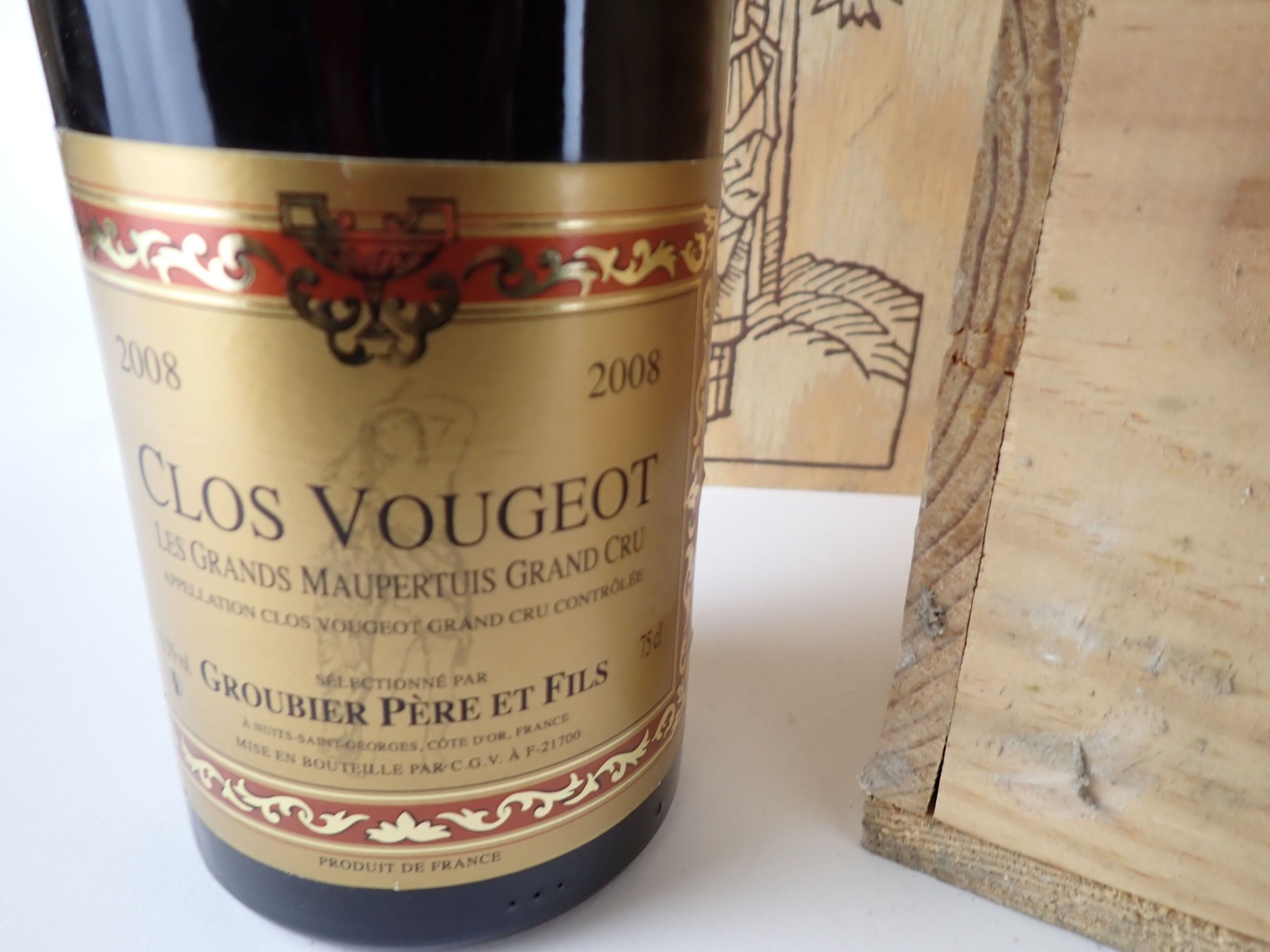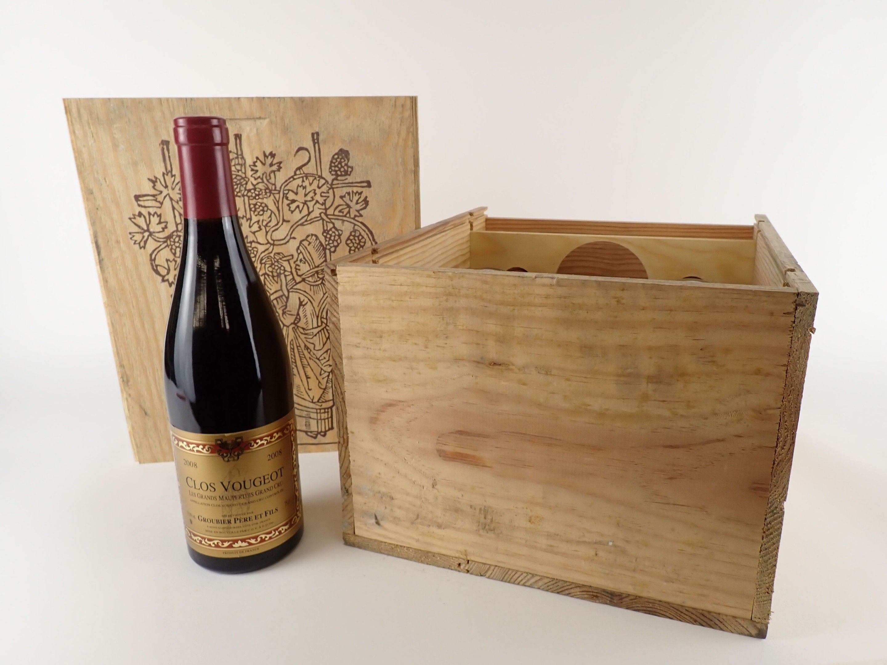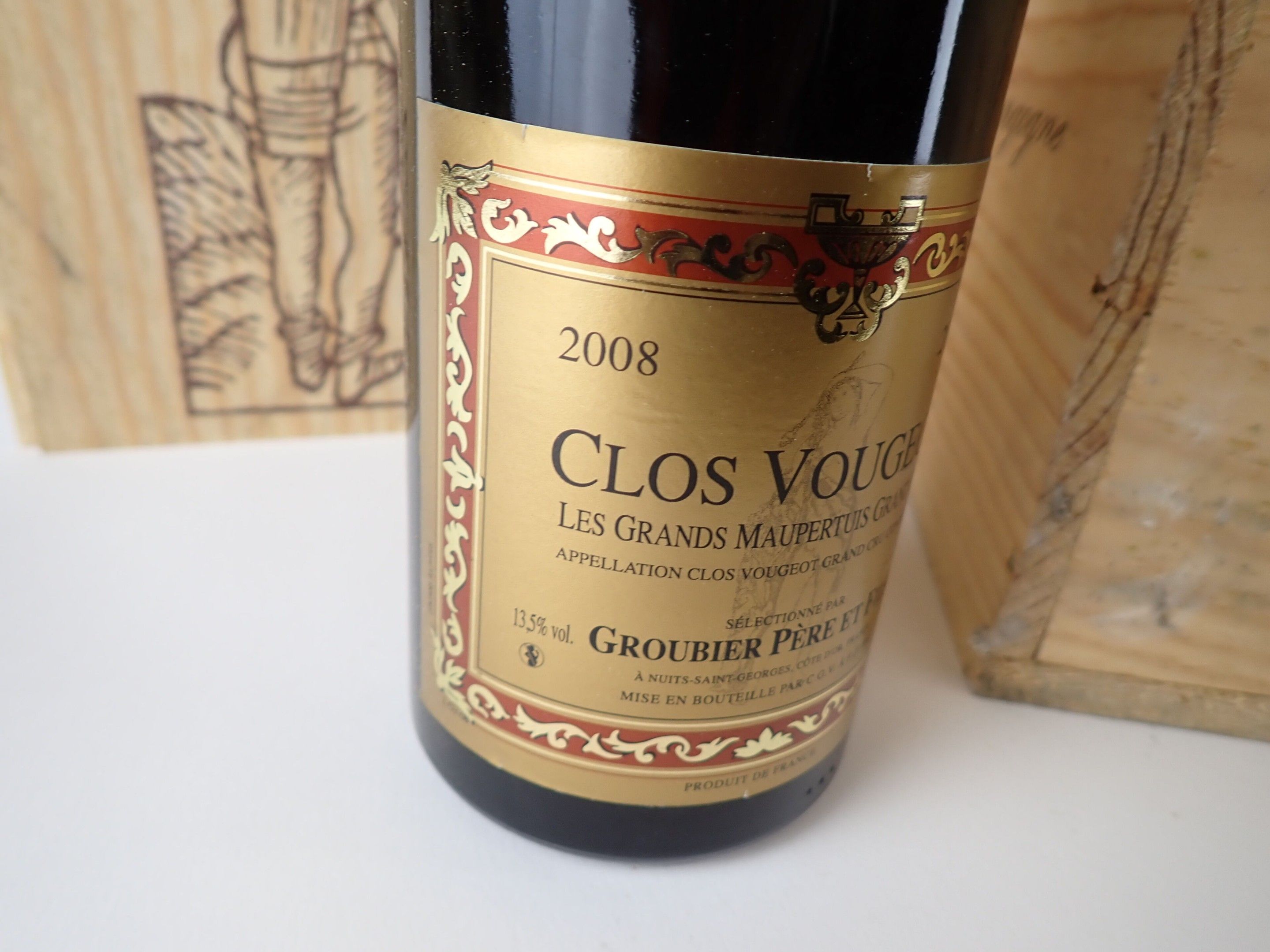 BOURGOGNE - 6 bottles, Clos Vougeot Grand Cru 'Les Grands Maupertuis', Groubier père et fils, 2008. In wooden case. Labels with three small peeling marks on the right-hand side and one with rubbing marks on the left-hand side.