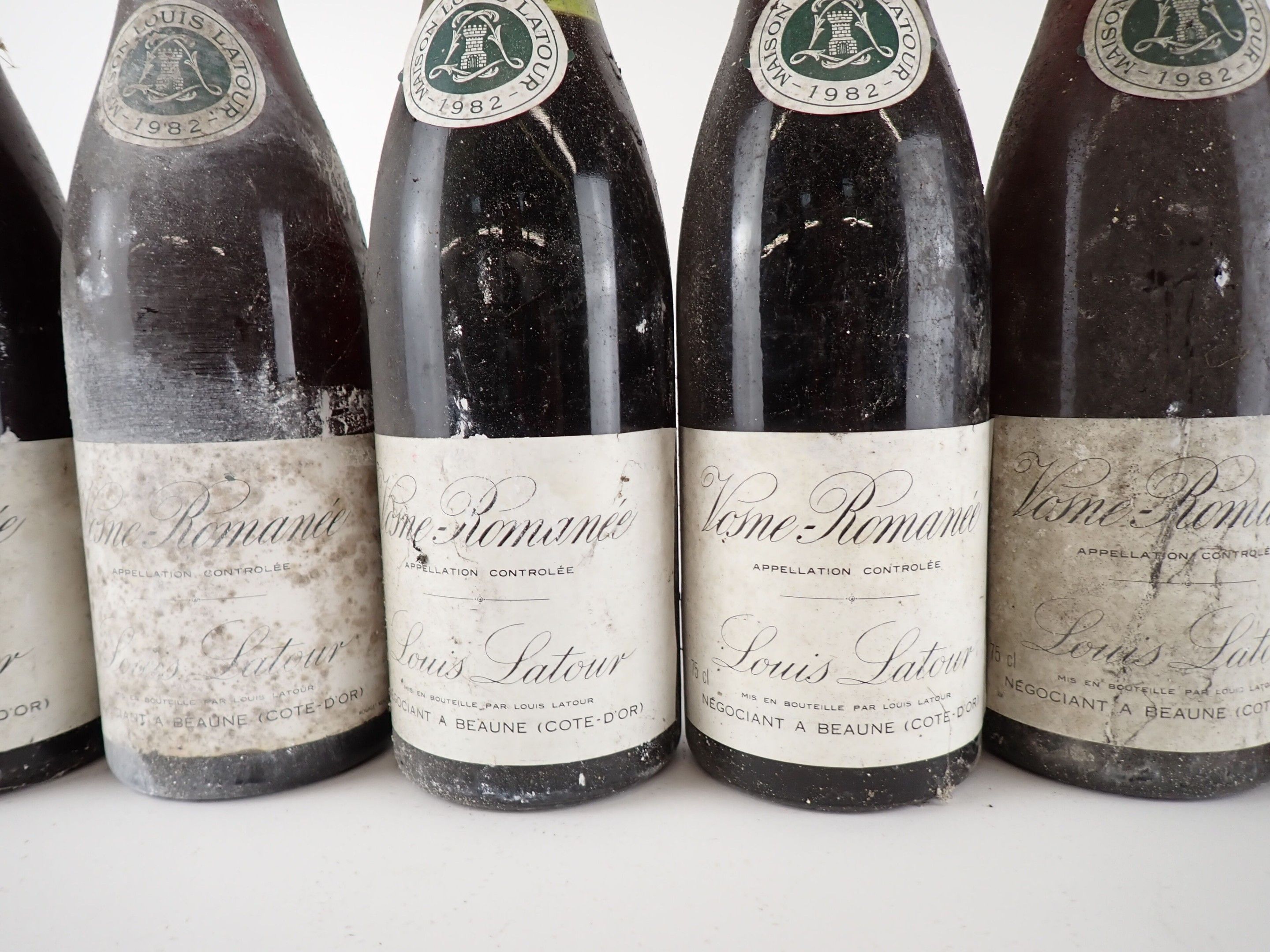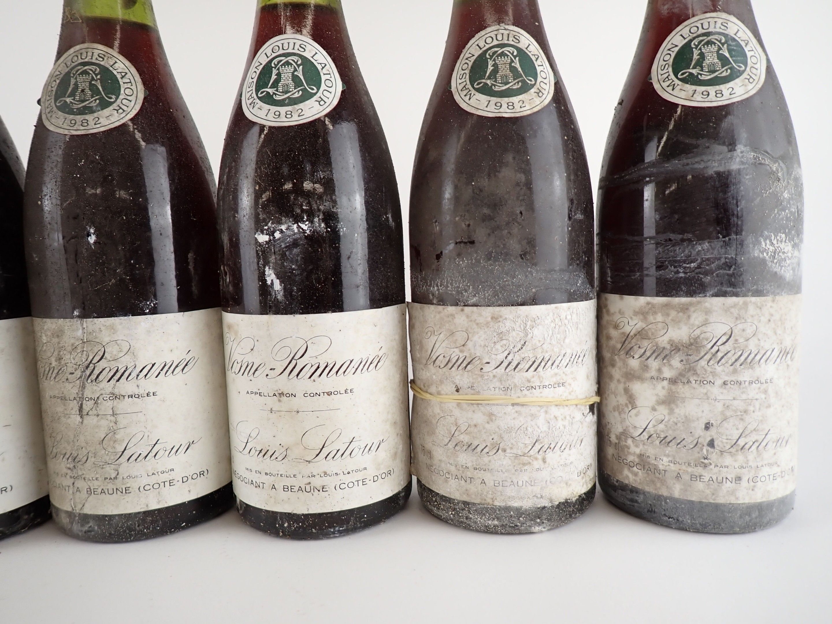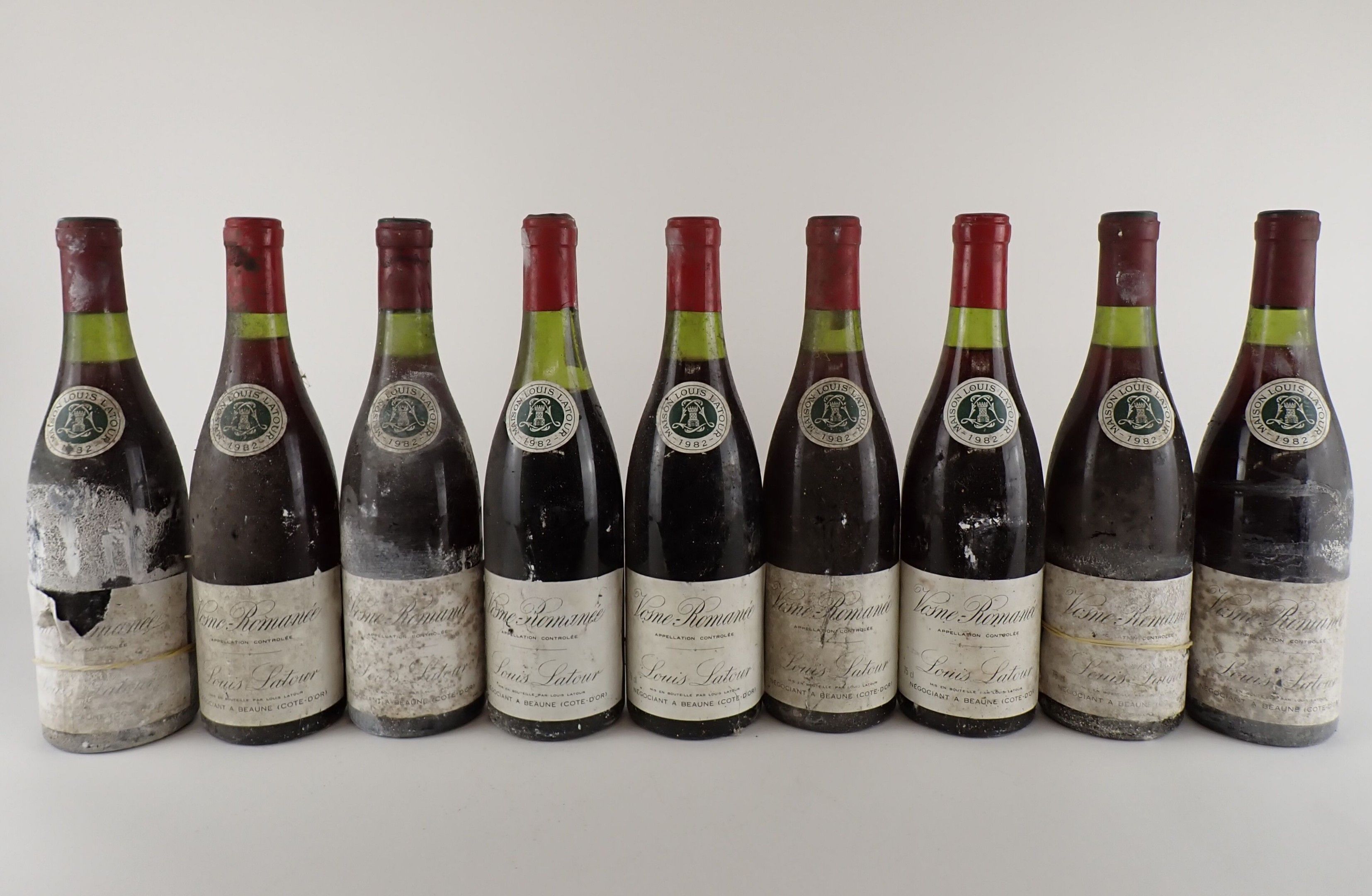 BOURGOGNE - 9 bottles, Vosne-Romanée, Louis Latour, 1982. One level at 4.5 cm. Dirty capsules and escutcheons. Dirty to very dirty labels, three of which are damaged, one partially peeled off and one completely peeled off.