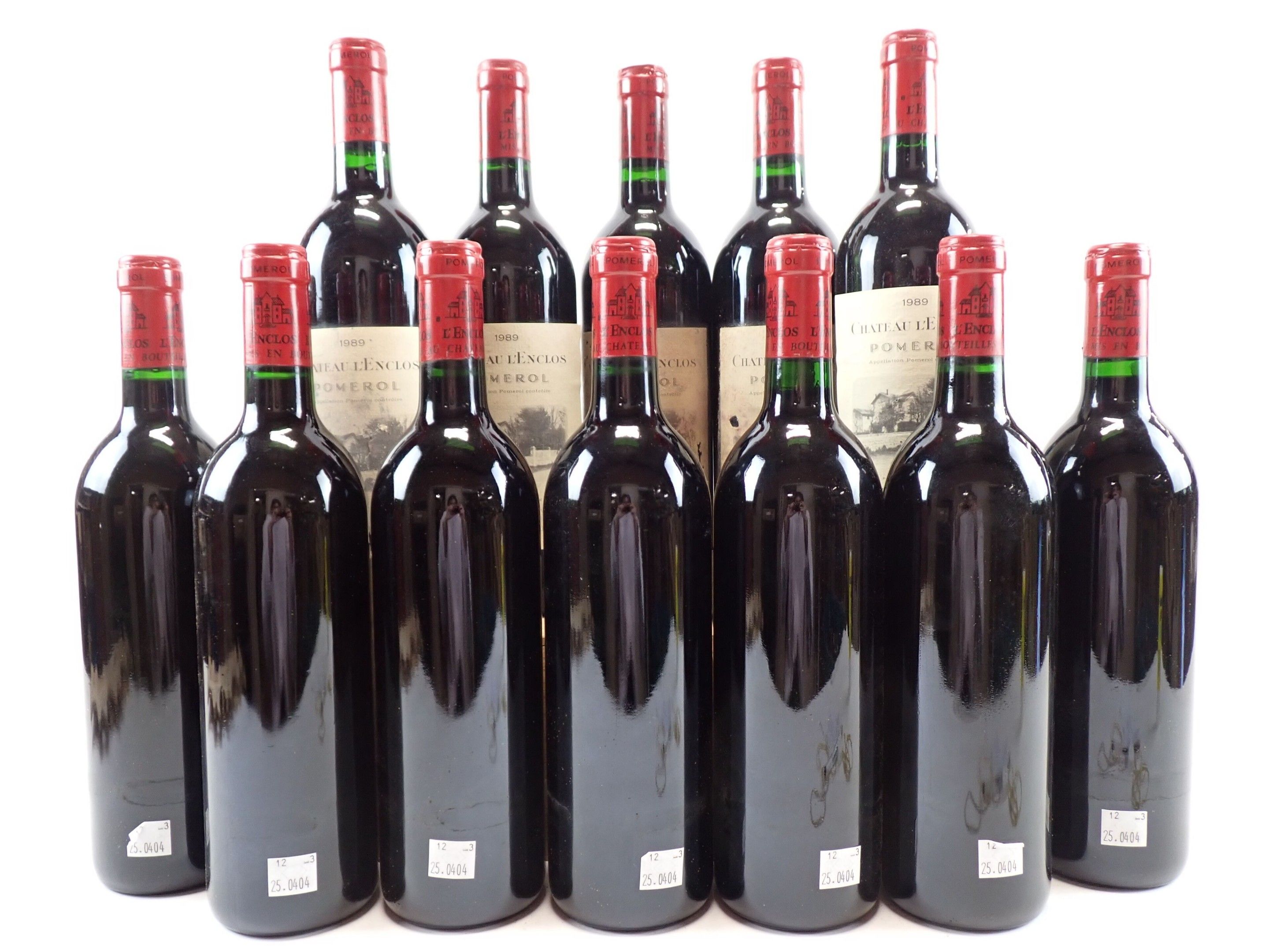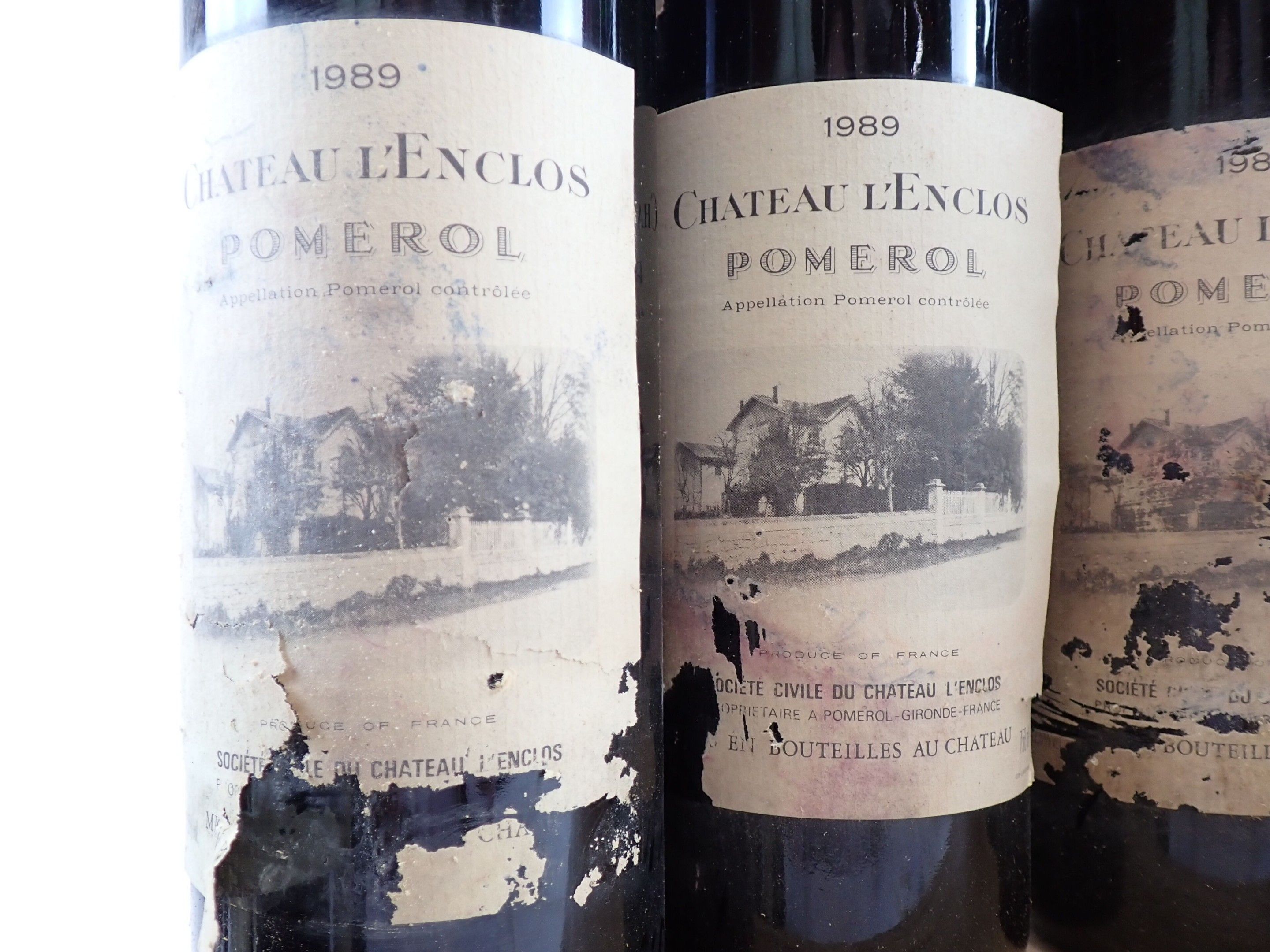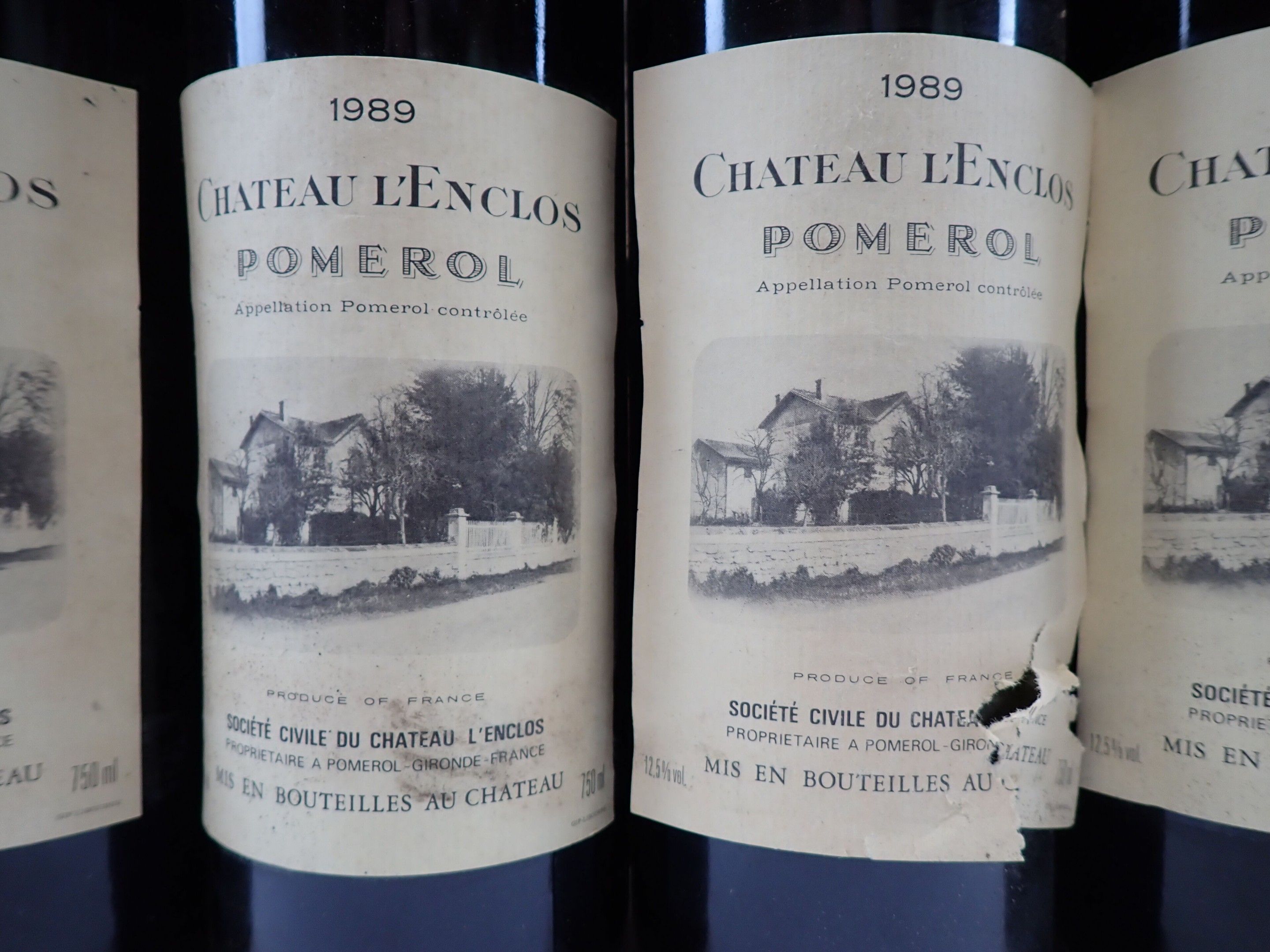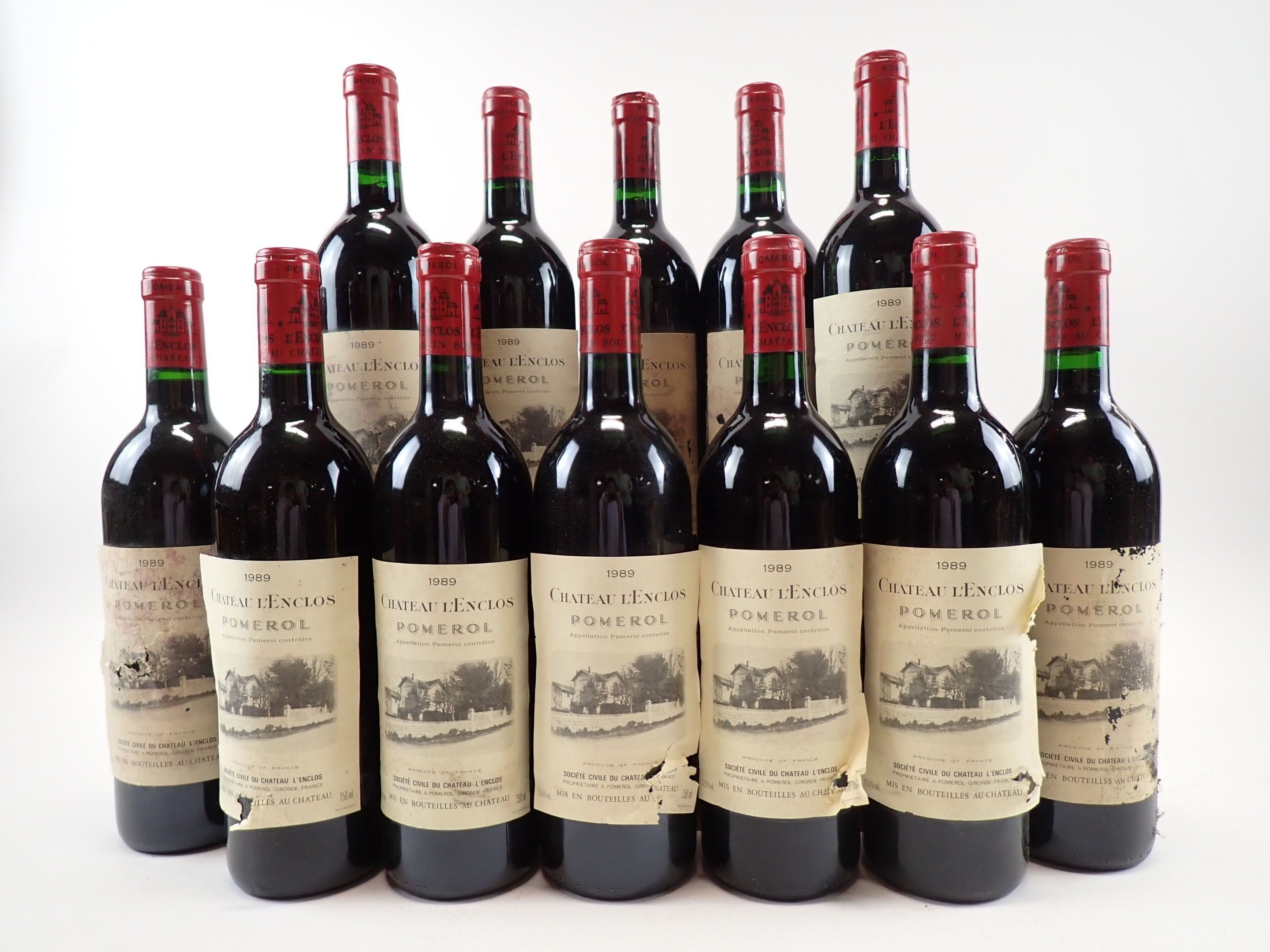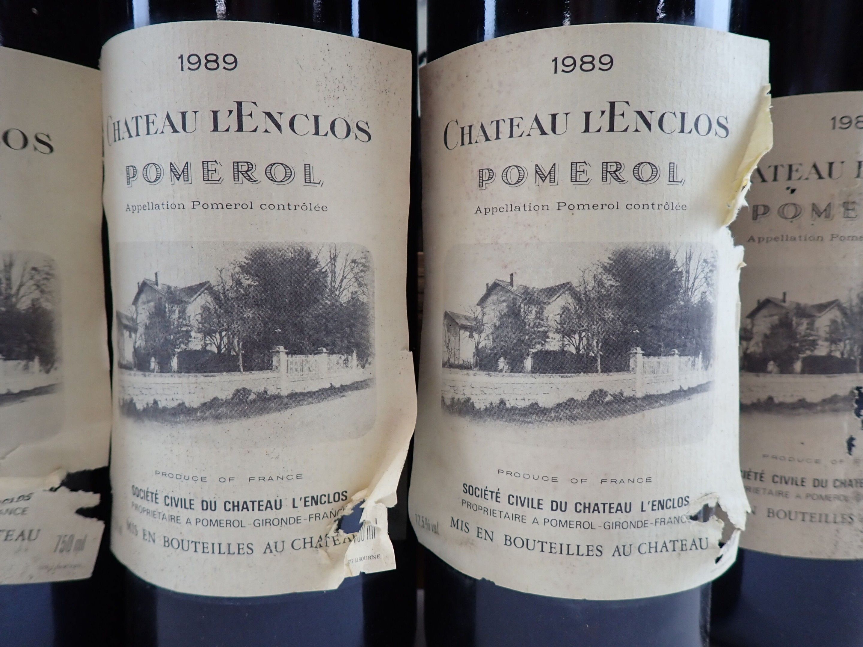 BORDEAUX - 1 CBO, 12 bottles, Pomerol, Château L'Enclos, 1989. Labels faded, slightly dirty to dirty and slightly damaged to very damaged. 4 labels partially detached, 3 labels almost completely detached and 3 labels completely detached.