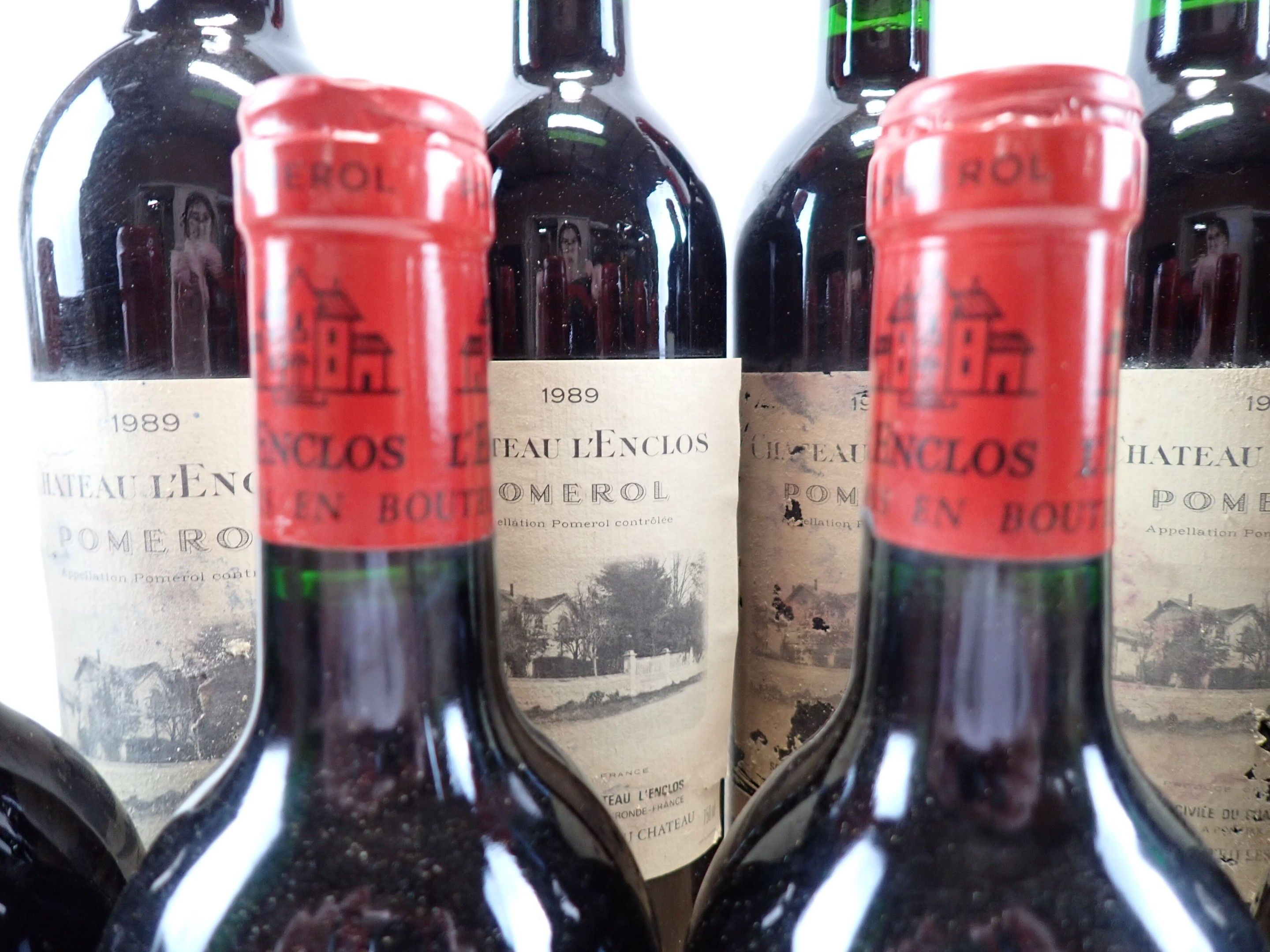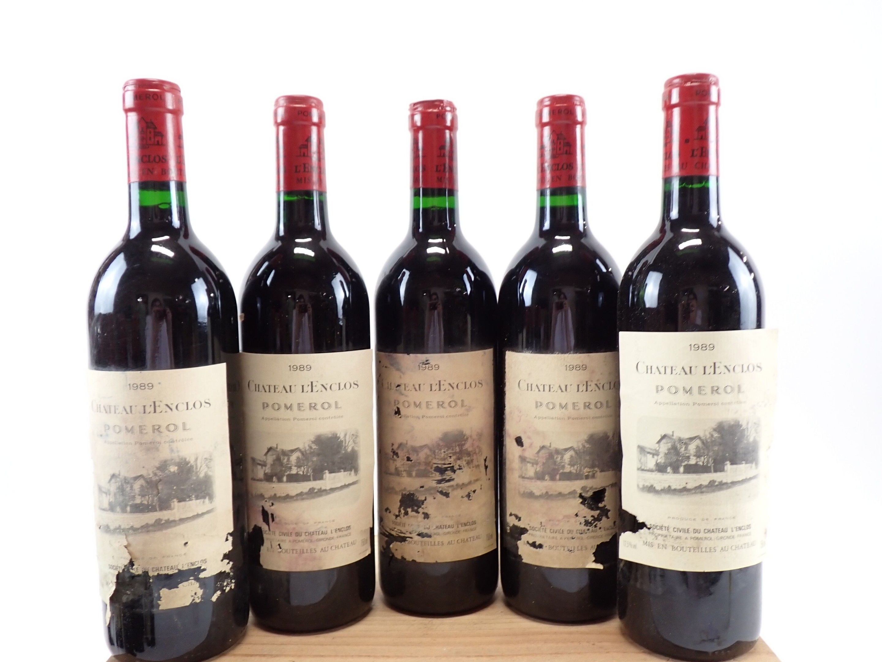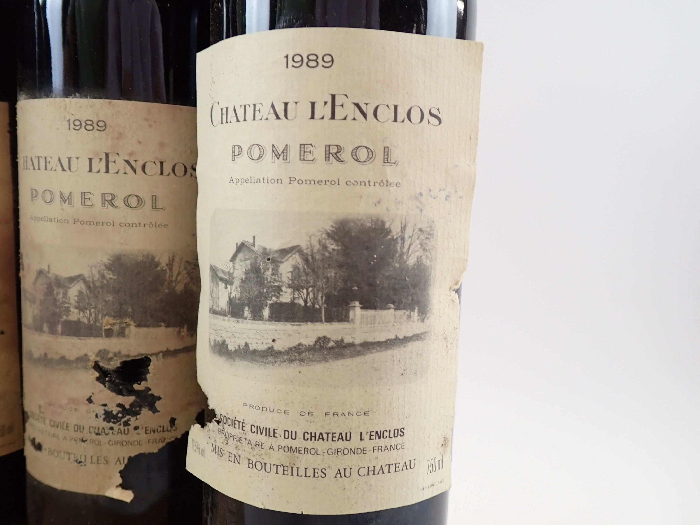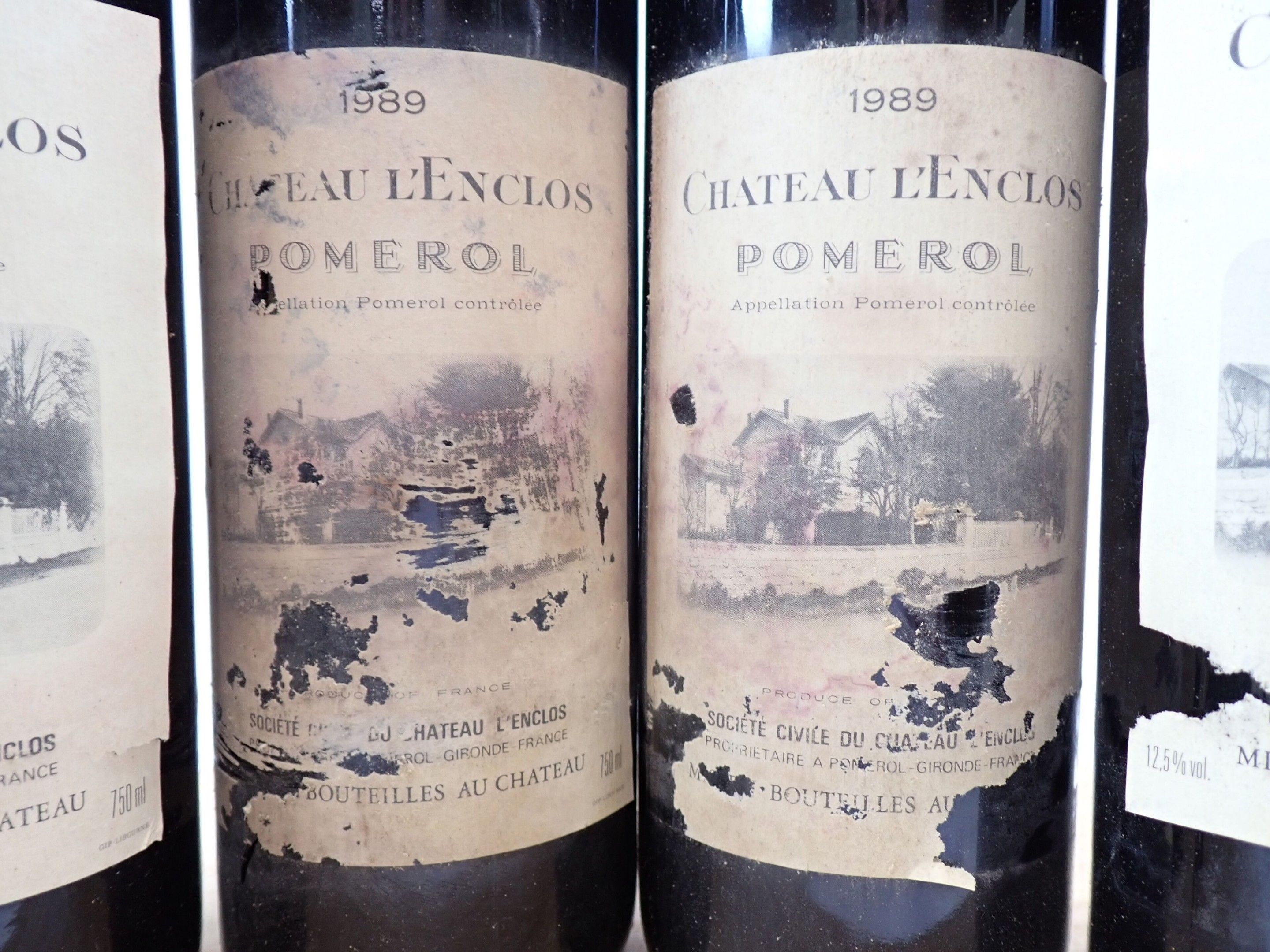 BORDEAUX - 1 CBO, 12 bottles, Pomerol, Château L'Enclos, 1989. Labels faded, slightly dirty to dirty and slightly damaged to very damaged. 4 labels partially detached, 3 labels almost completely detached and 3 labels completely detached.