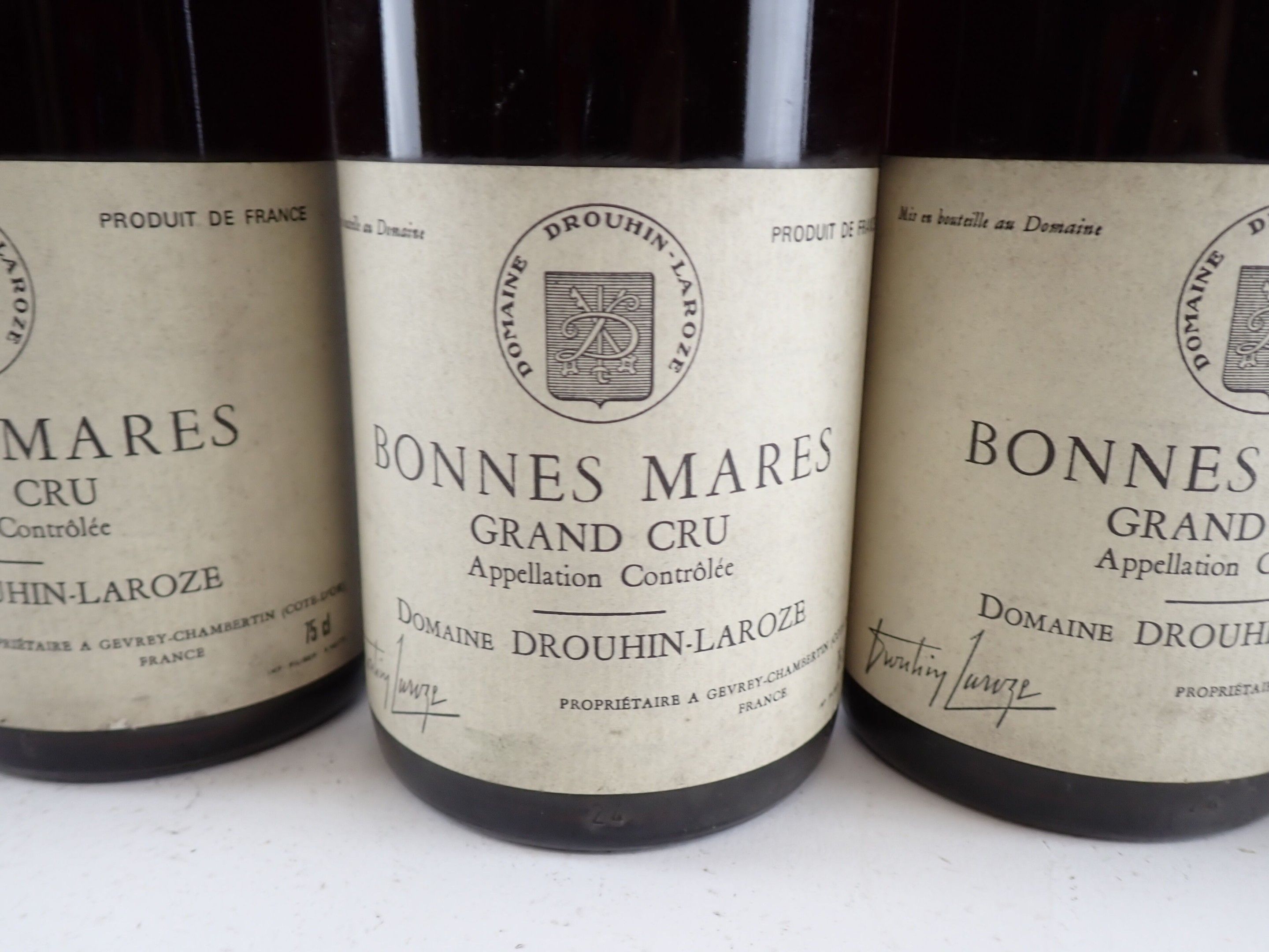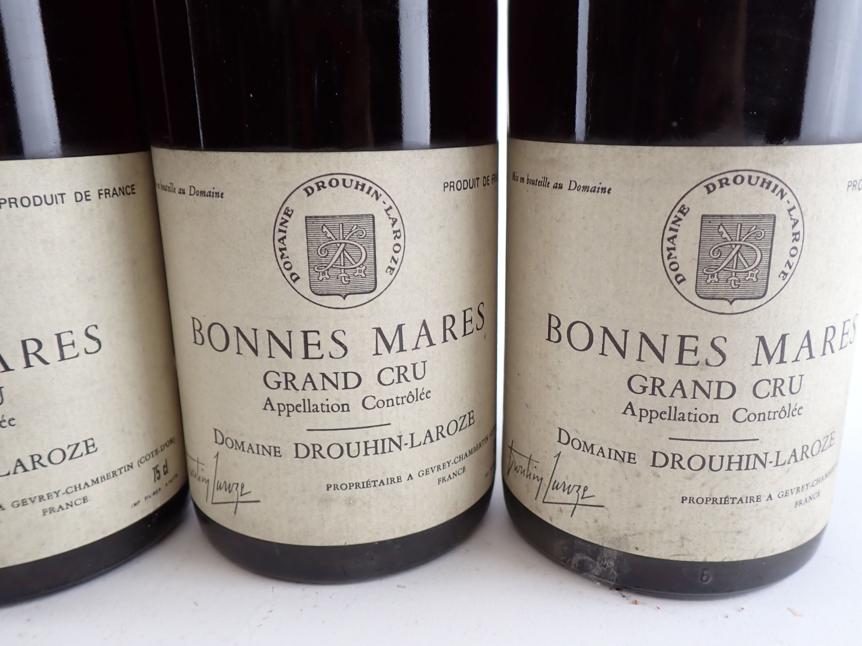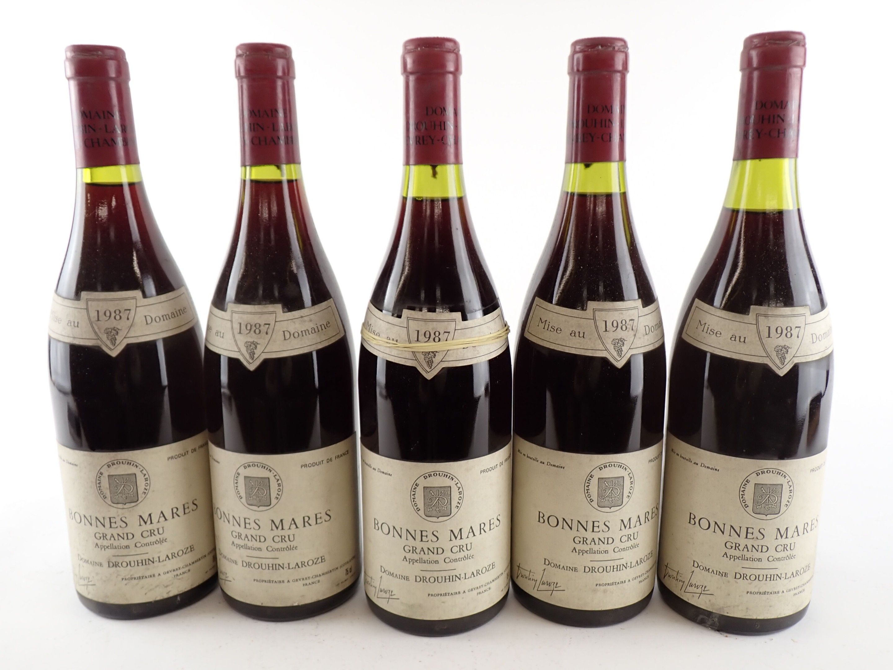 BOURGOGNE - 5 bottles, Bonnes Mares Grand Cru, Domaine Drouhin-Laroze, 1987. One level at 2.2 cm. Caps, rims and labels slightly dirty to dirty. One collar is detached.