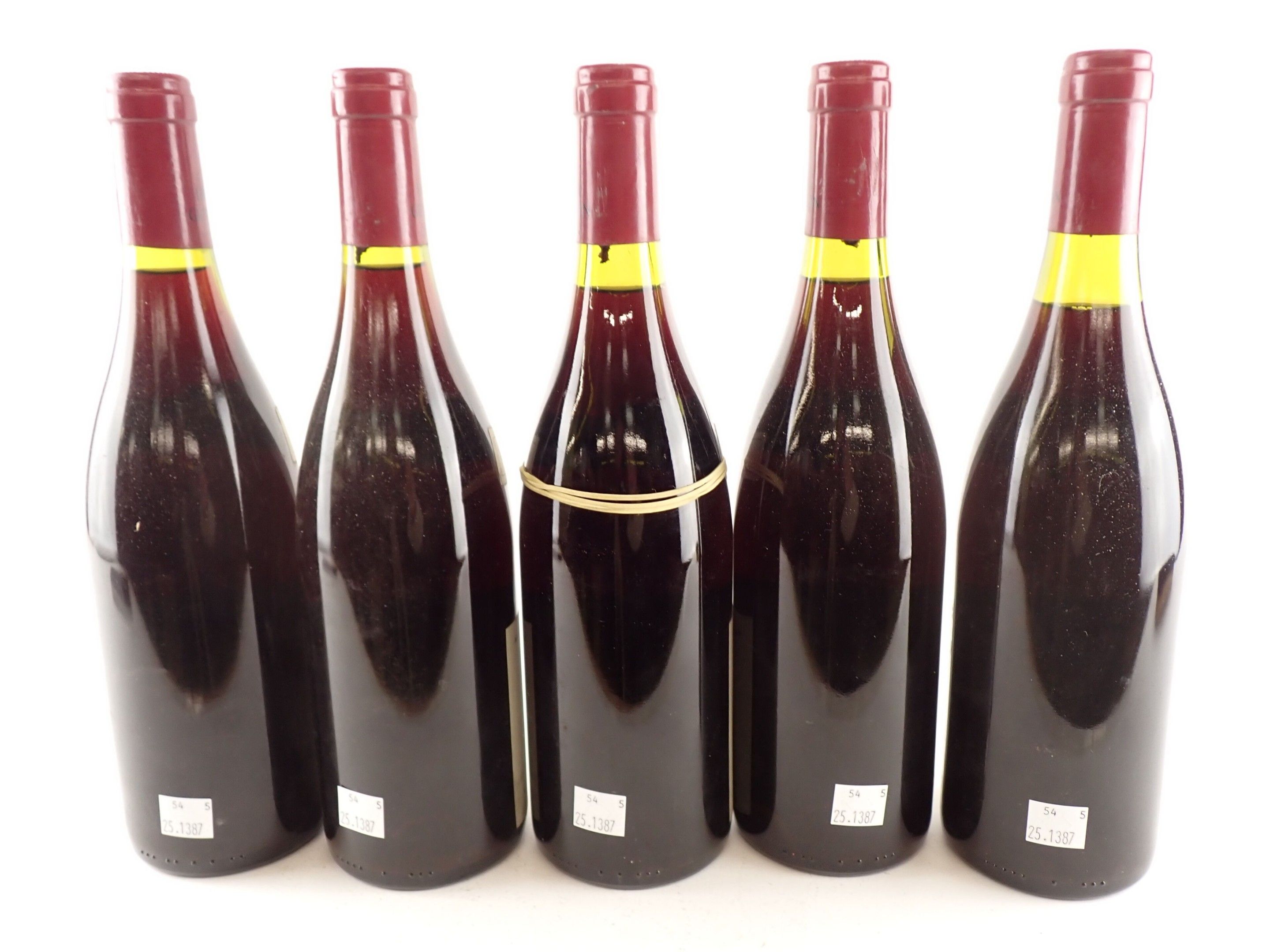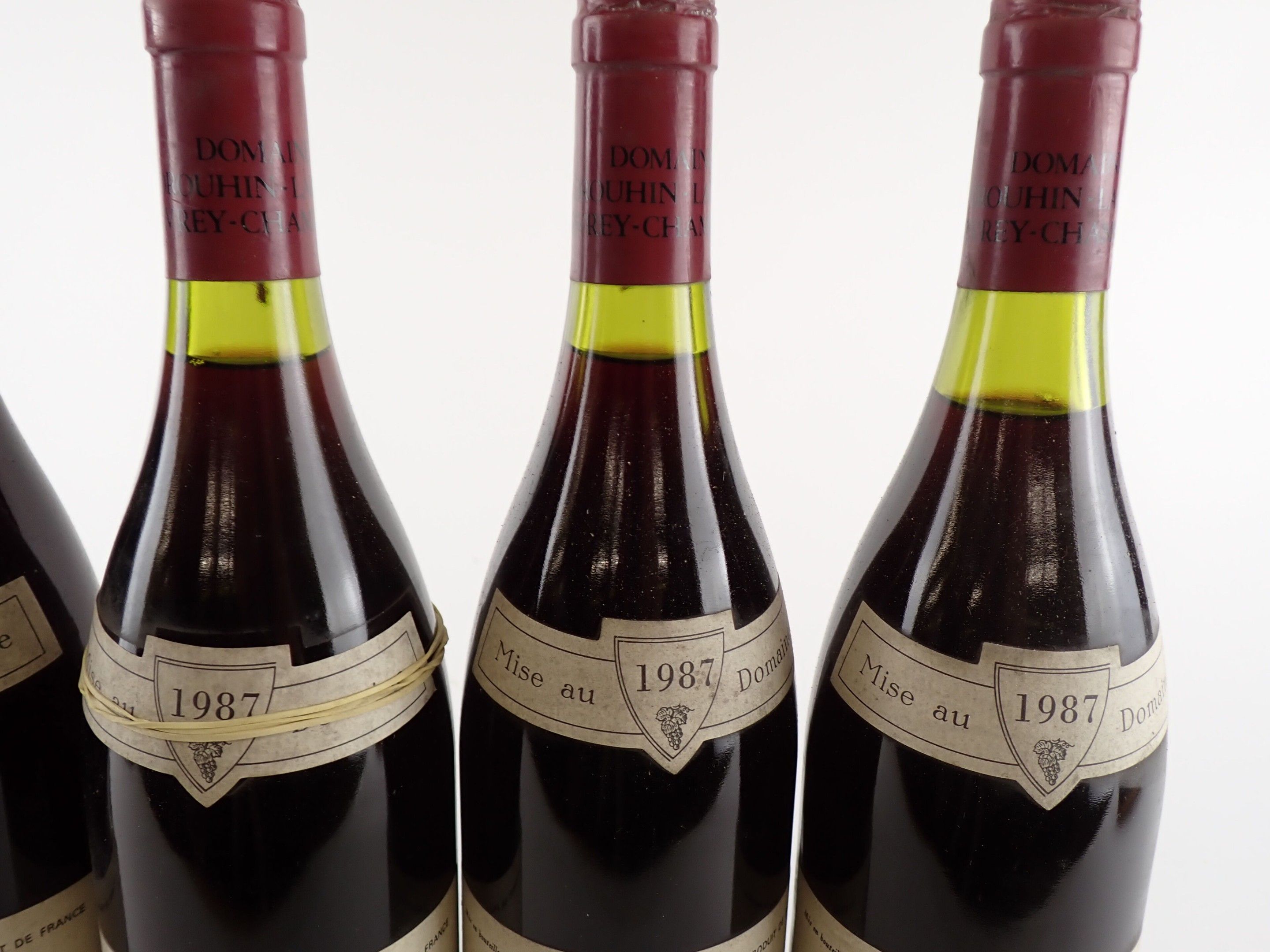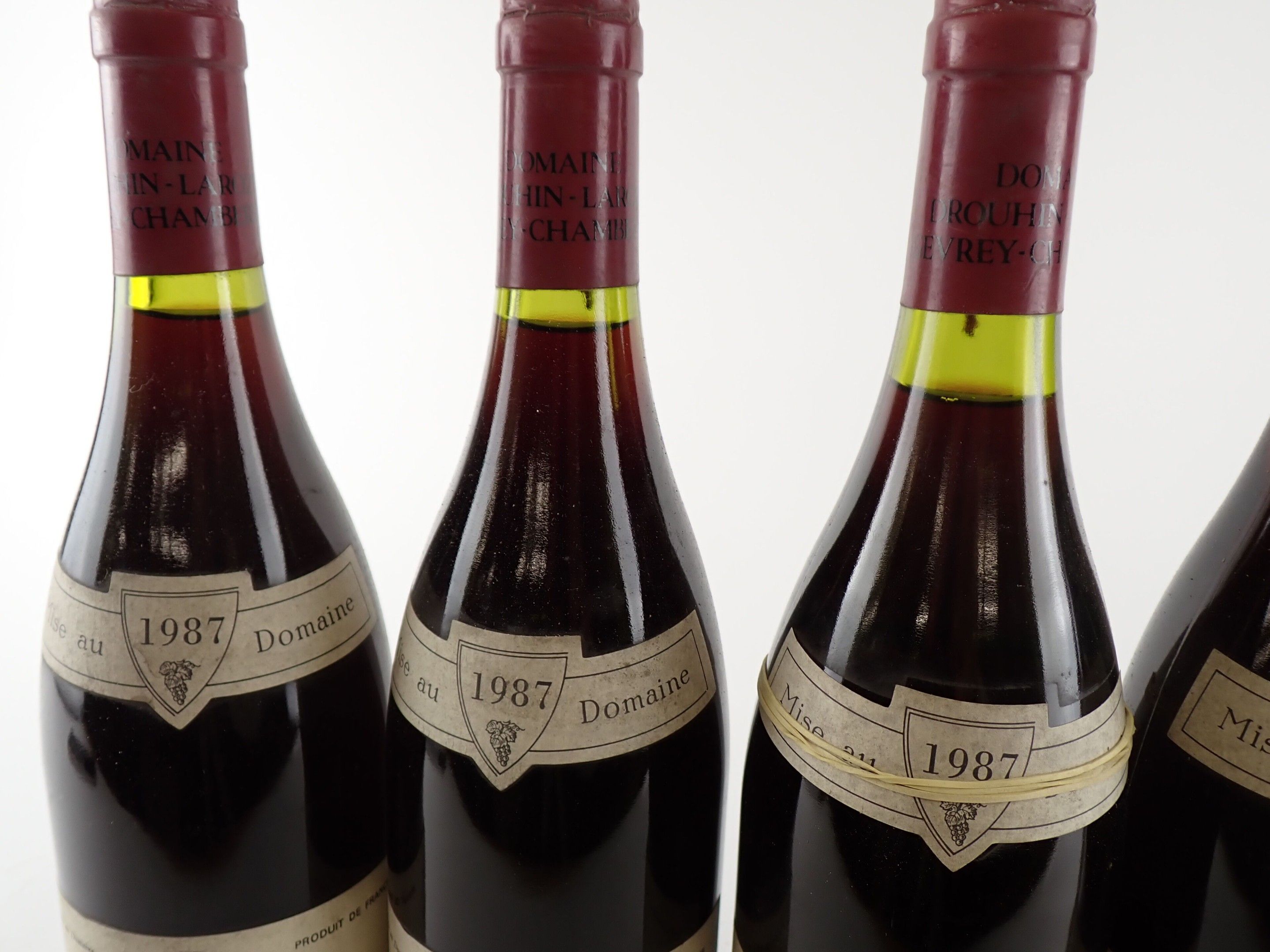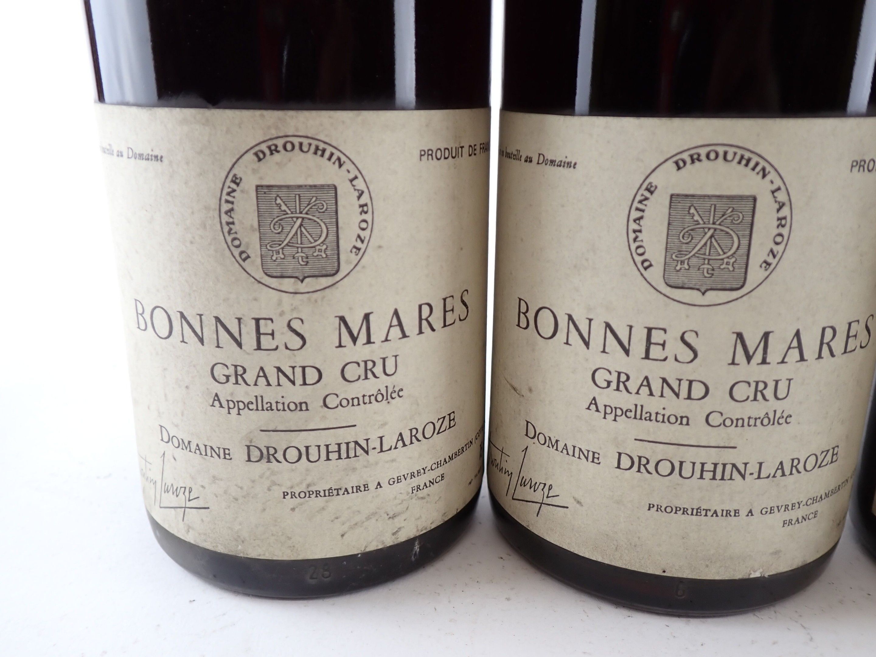 BOURGOGNE - 5 bottles, Bonnes Mares Grand Cru, Domaine Drouhin-Laroze, 1987. One level at 2.2 cm. Caps, rims and labels slightly dirty to dirty. One collar is detached.