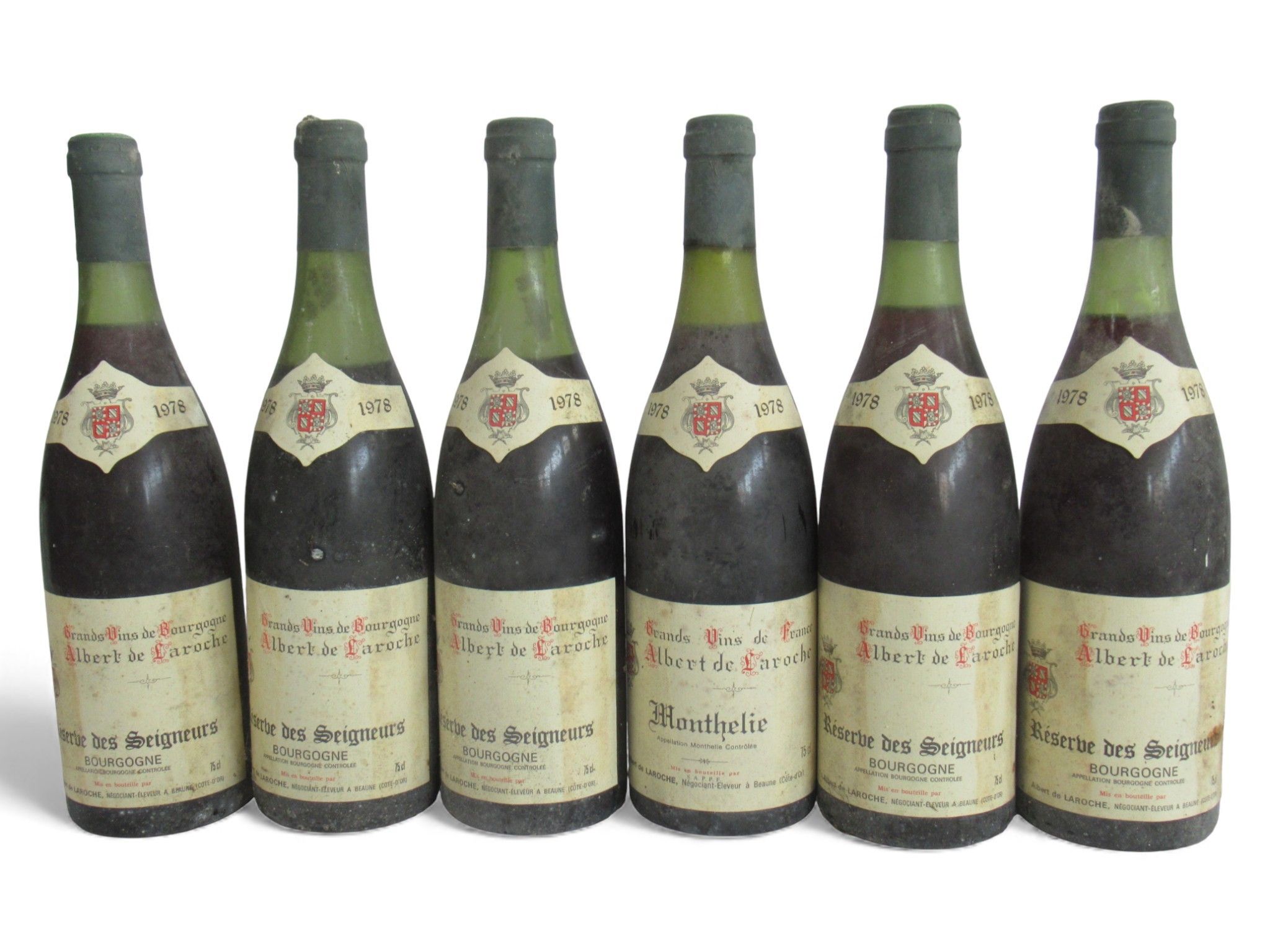 42, Lot of 6 blles Al. de Laroche neg. comprising:, 5 Blles BOURGOGNE Réserve des Seigneurs 1978, 1 Blle MONTHELIE, 1978, Et. stained. N: 2.5 to 5 cm,