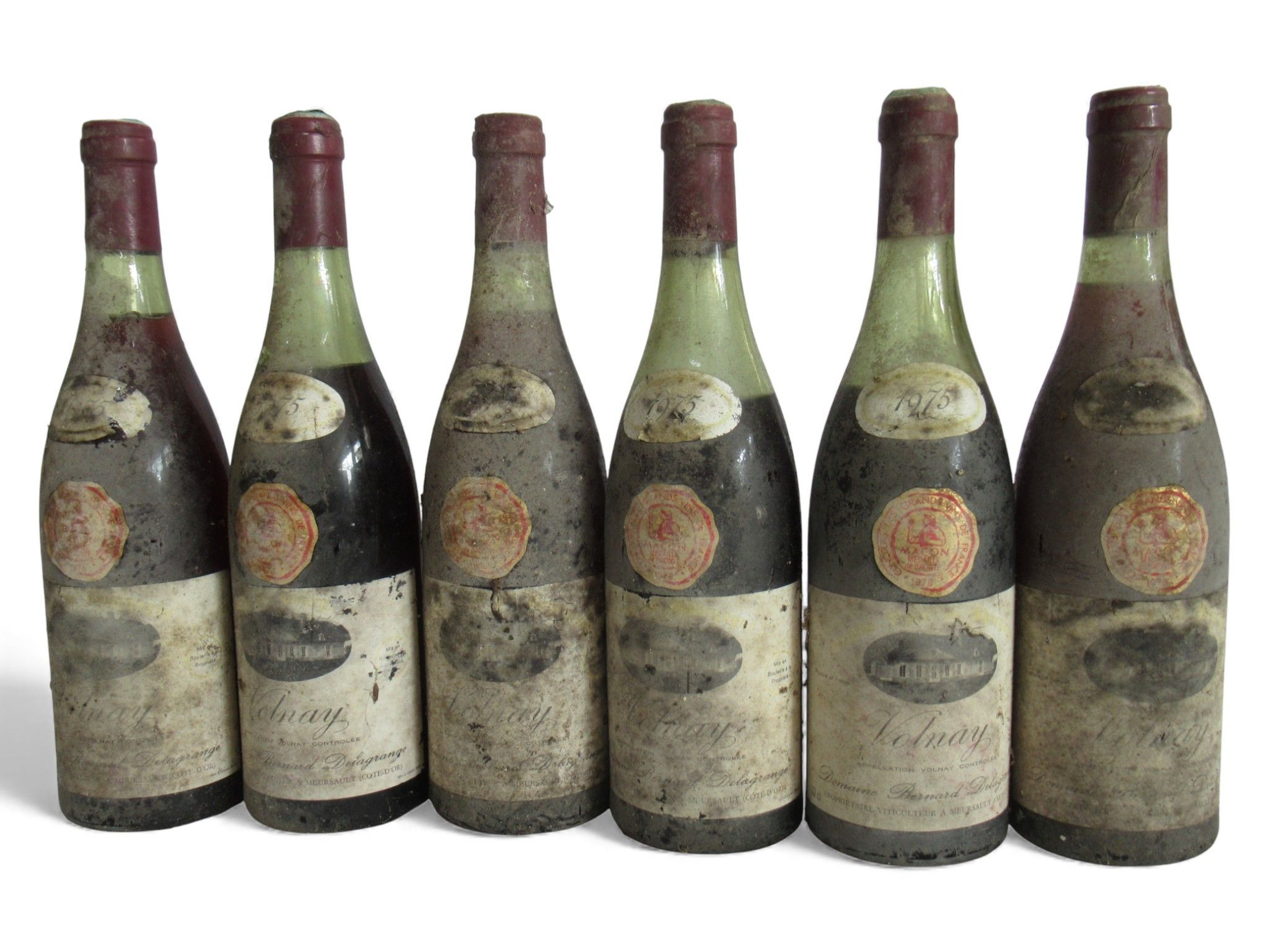 64 6 Blles VOLNAY mise Domaine B. Delagrange Prop. 1975, Faded, stained and worn. N: 2 to 5 cm,