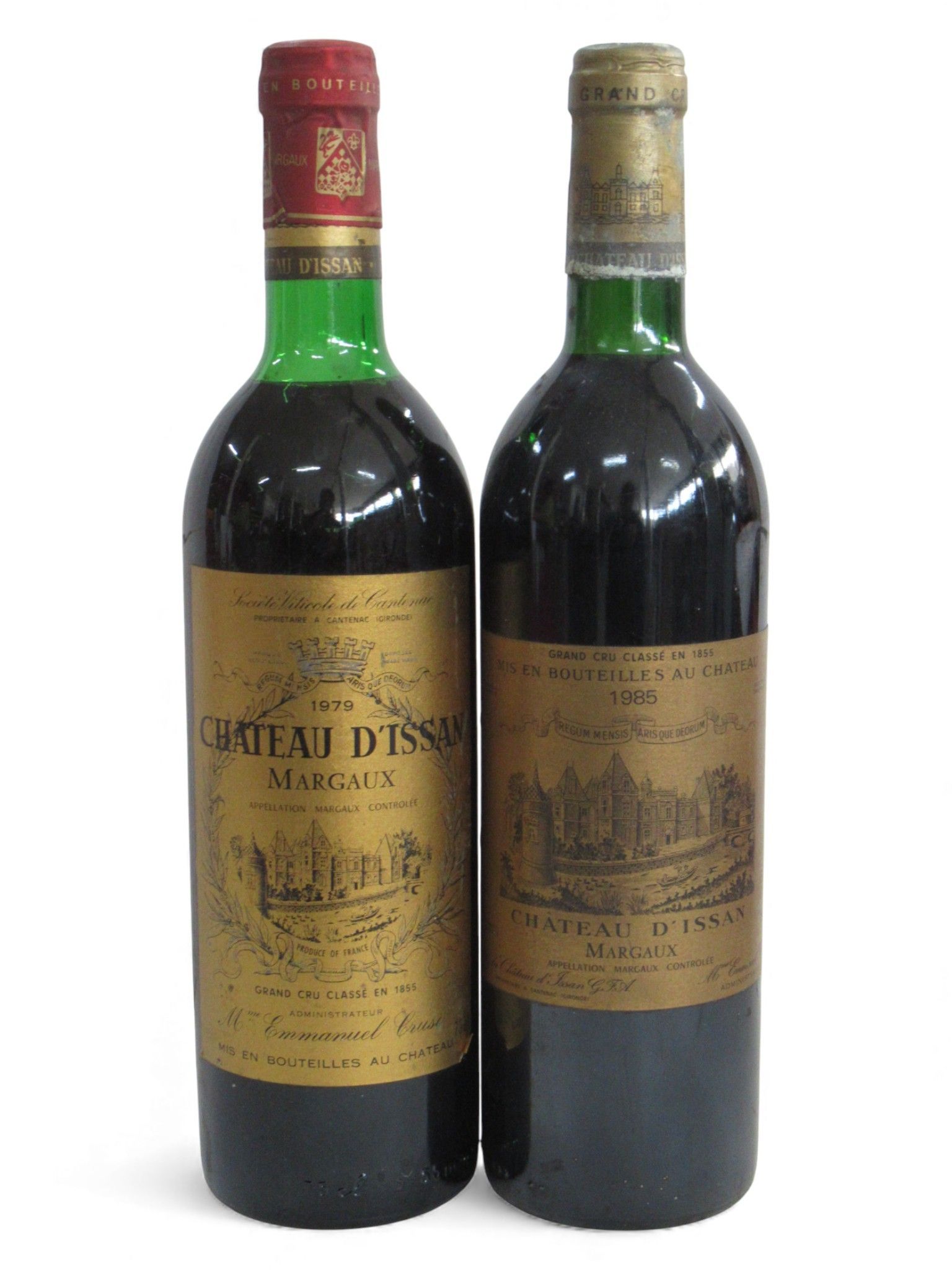76 2 bottles CH. D'ISSAN Margaux GCC, 1 blle de 1985, 1 blle de 1979, Et. bonnes. N: 1 low neck/high shoulder limit, 1 very high shoulder..,