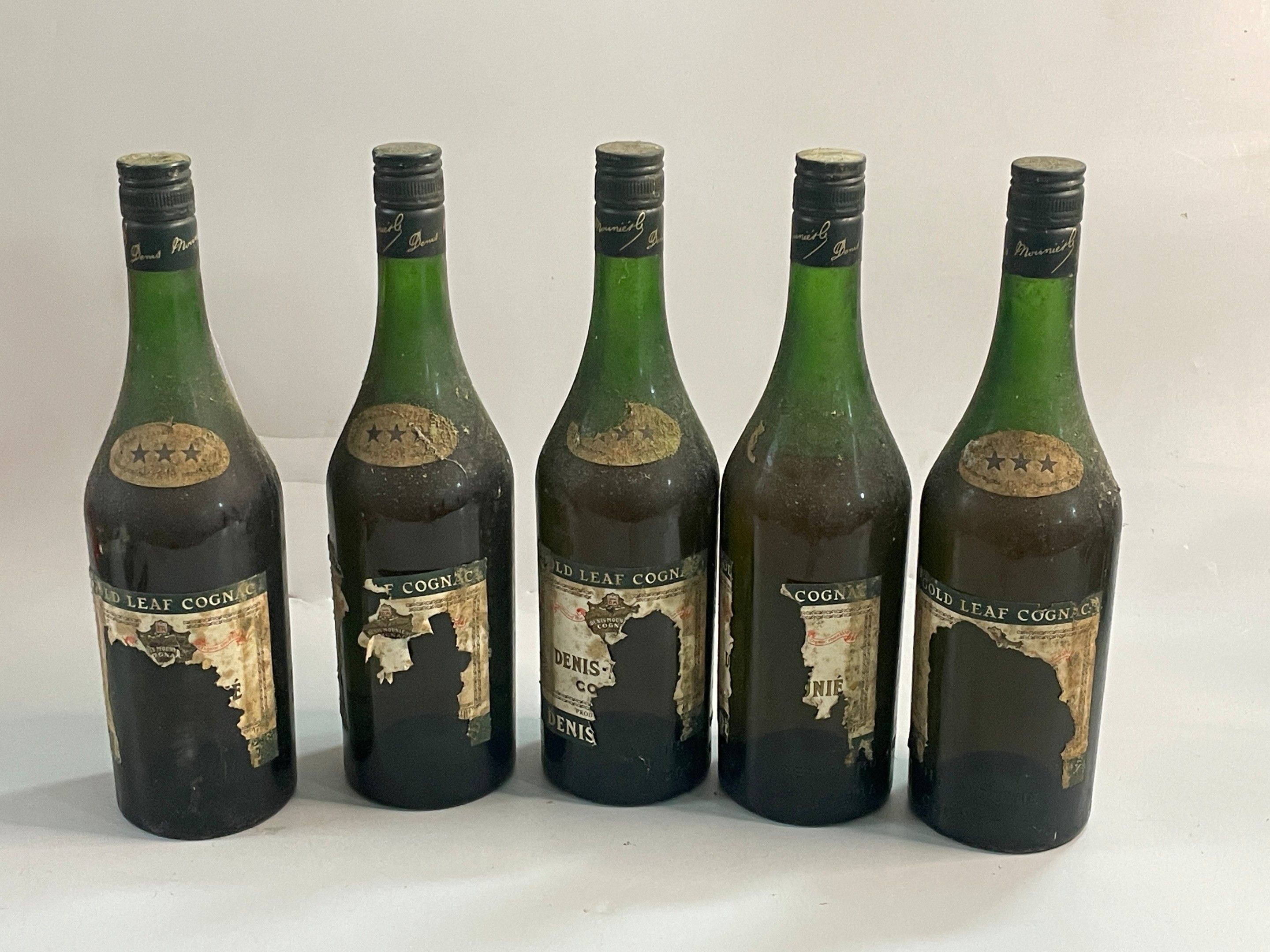 5 bottles COGNAC Denis Mounié 3 stars (torn bottles, half co…