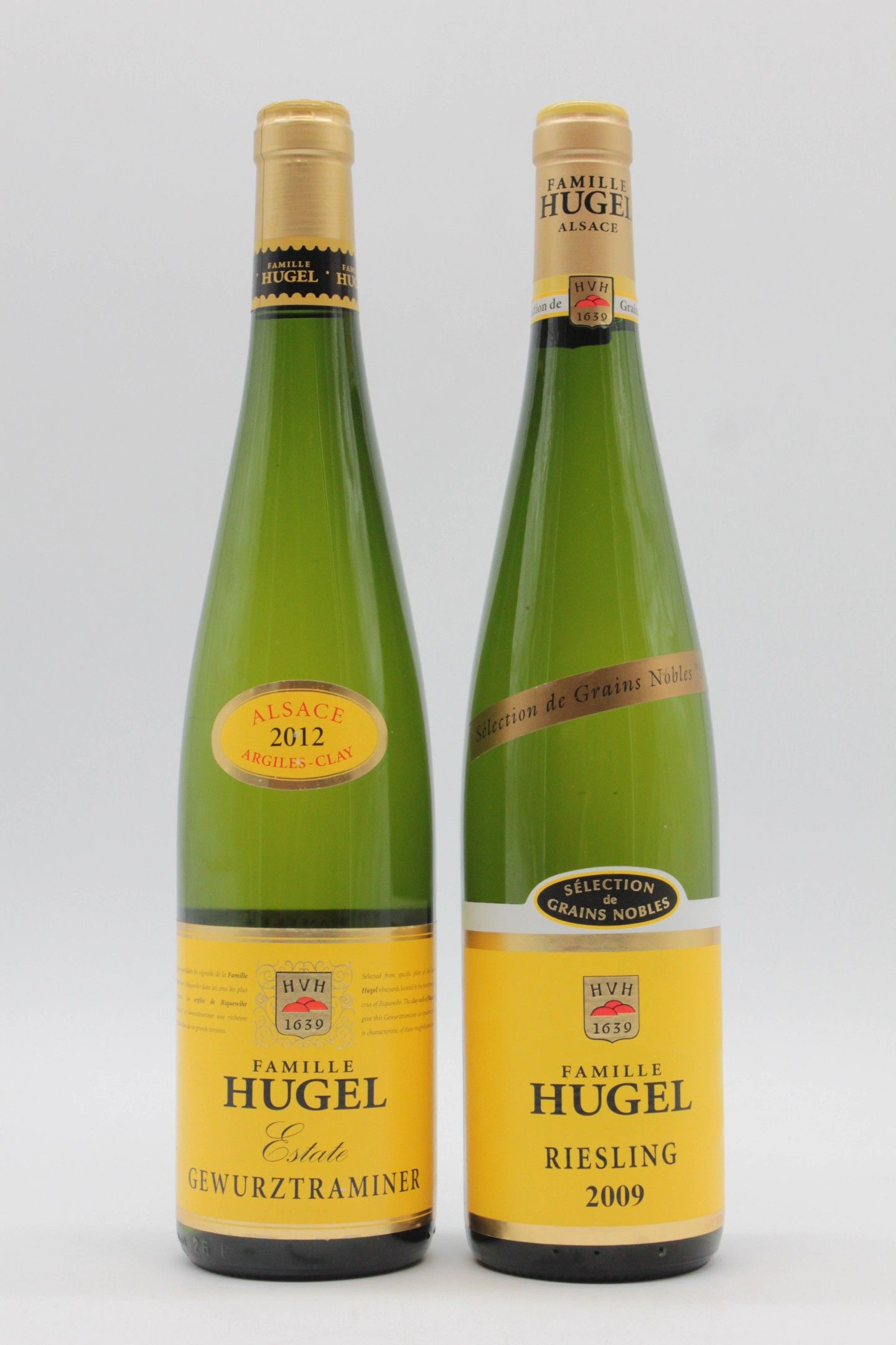 Set of 2 Hugel bottles including : - 1 Bottle, RIESLING Sélection de Grains Nobles, 2009 - 1 Bottle, GEWURZTRAMINER "Argiles-Clay", 2012 Impeccable presentation and levels.