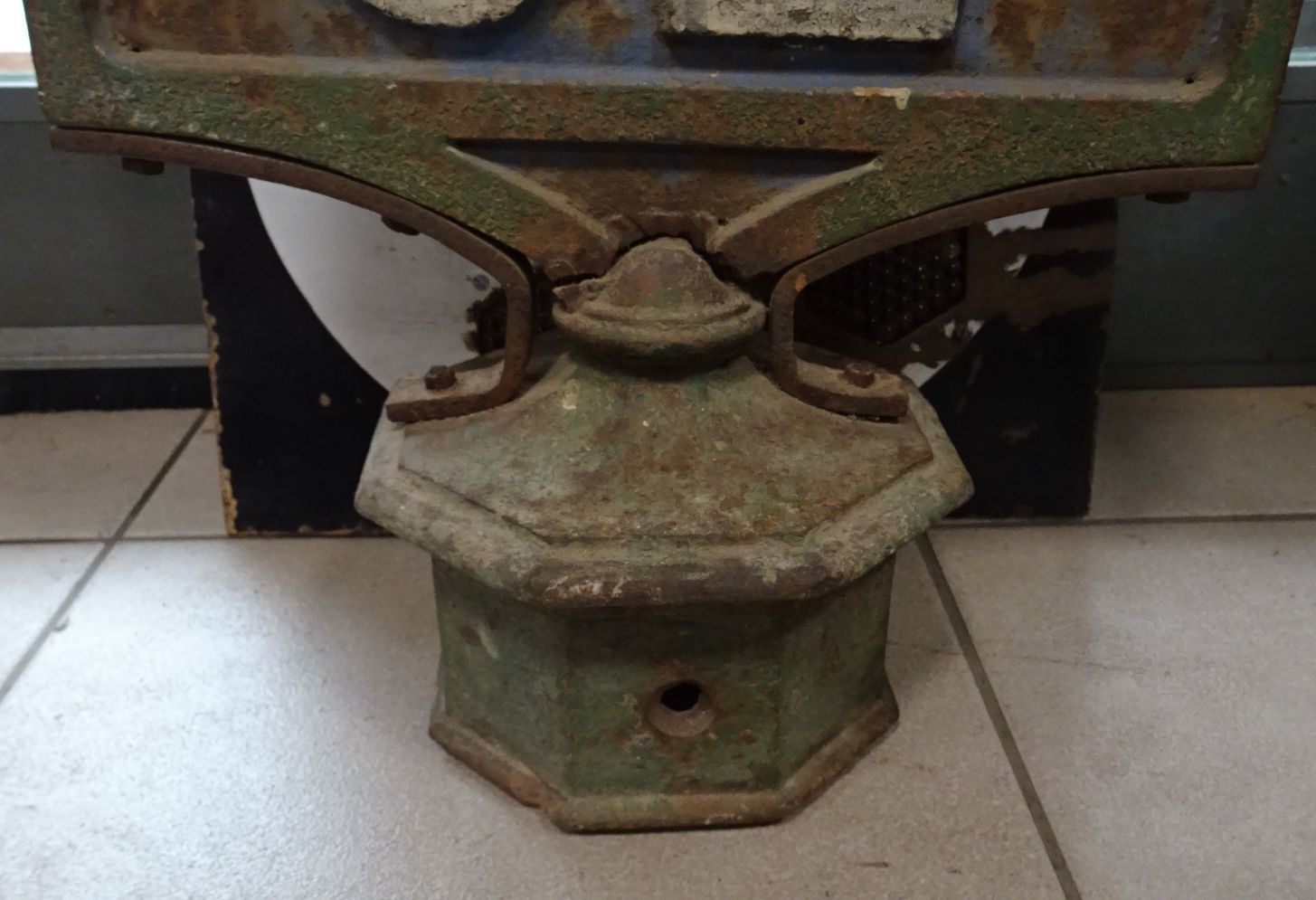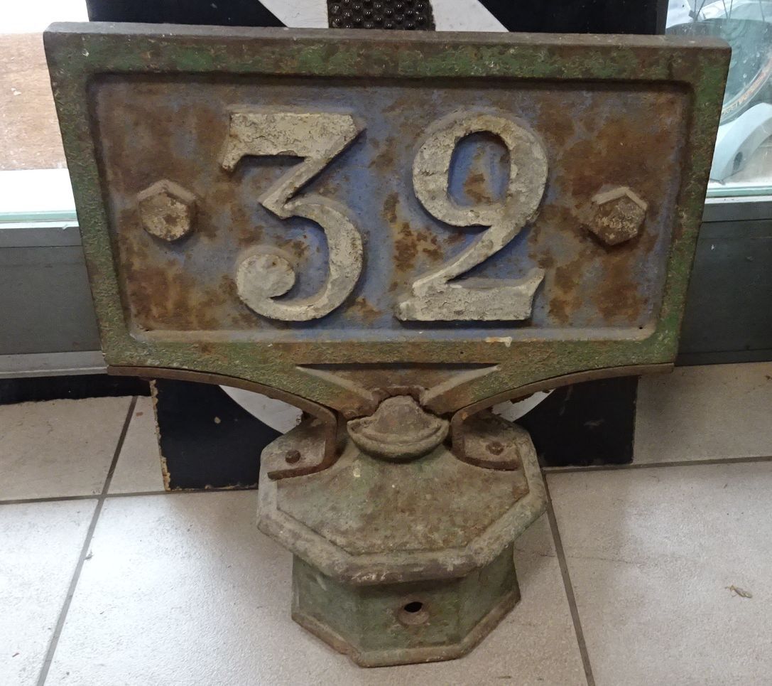 Enamelled plaque with "S" (whistle) SNCF reflectors. Railway track. 85 x 45 cm (acc. and missing) + Cast iron milestone "32" Height 45 x 41 cm