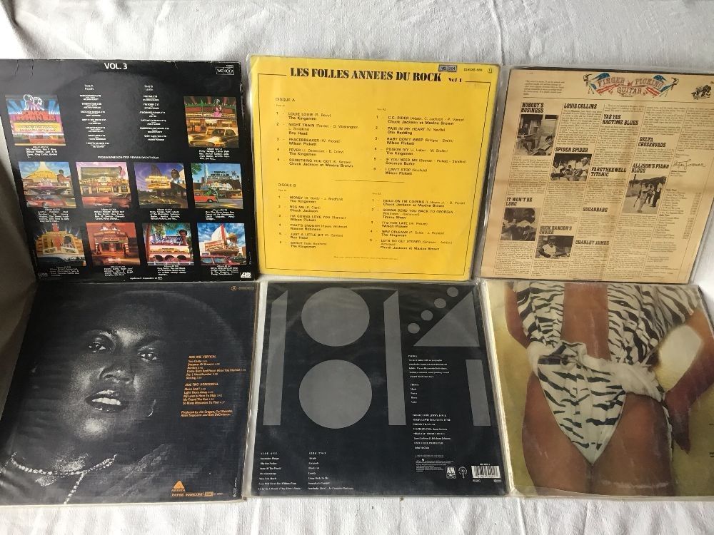 Set of 6 LP vinyl records in plastic sleeves, namely Diana Ross, Janet Jackson, Linda Lewis, Finger picking guitar, Les folles années du rock (double album), Formidable Rhythm'n'Blues.
