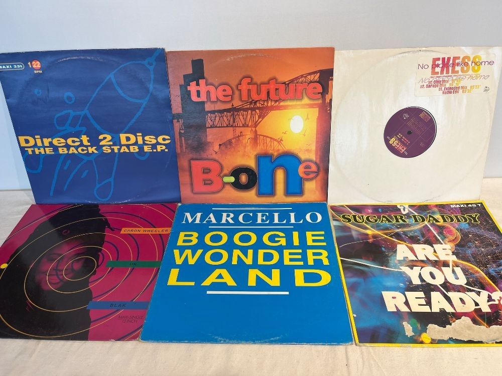 Pack of 18 maxi 45T and 33T vinyl records, mainly dance, hou…