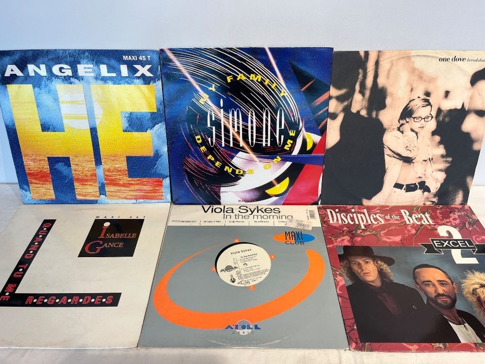 Pack of 18 maxi 45T and 33T vinyl records, mainly dance, house, pop, electro and Eurodance from the 80s and 90s.