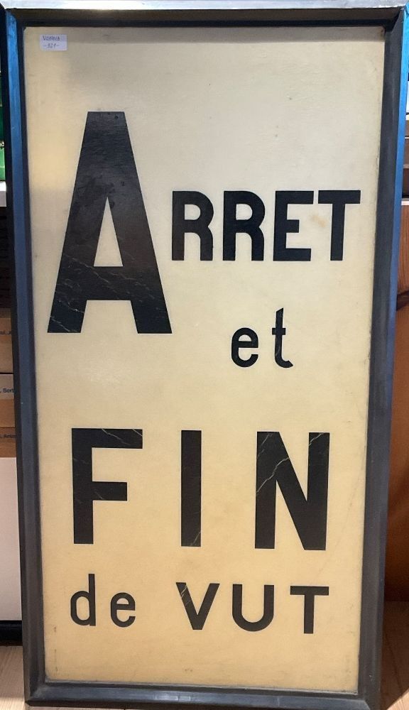 Antique railway sign, black lettering on a translucent cream background "Arrêt et fin de Vut" ("Stop and end of Vut"). 50 x 100 cm