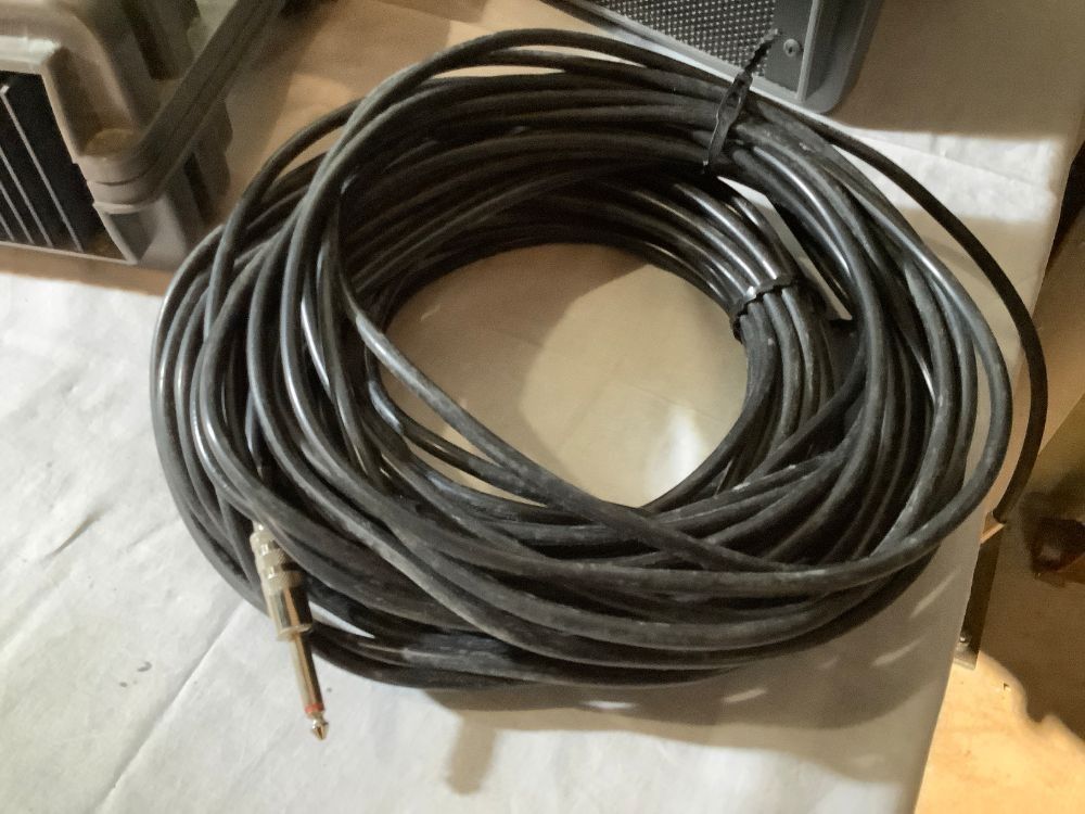 The set is functional with 2 speakers, 2 jack cables of approximately 14 metres and a 2.4 metre power cable. Good condition.