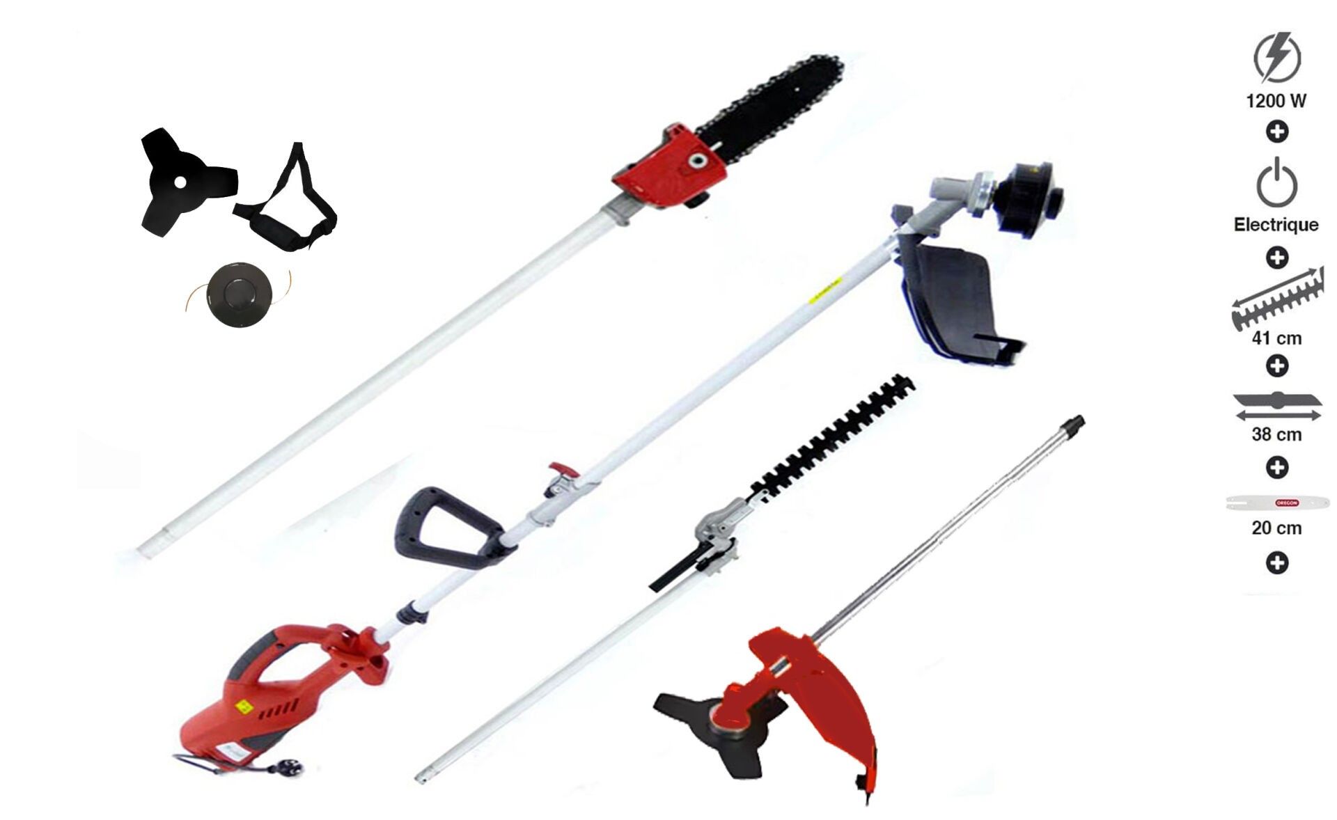 4-in-1 electric brushcutter - 7000 rpm, with 3-tooth blade, semi-automatic edger, adjustable hedge trimmer, chainsaw with guide bar, harness, adjustable handle, 2-level safety device and assembly keys - new, VAT reclaimable.