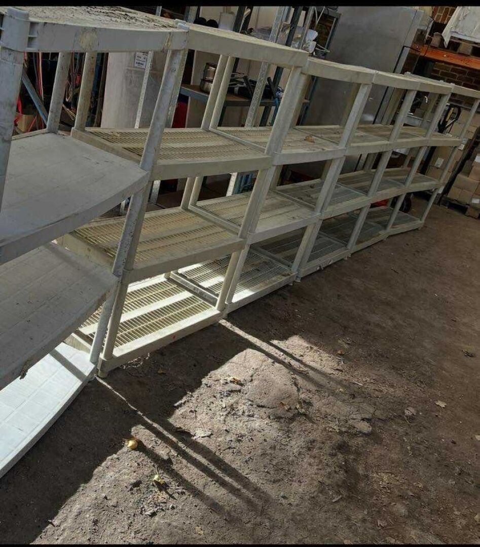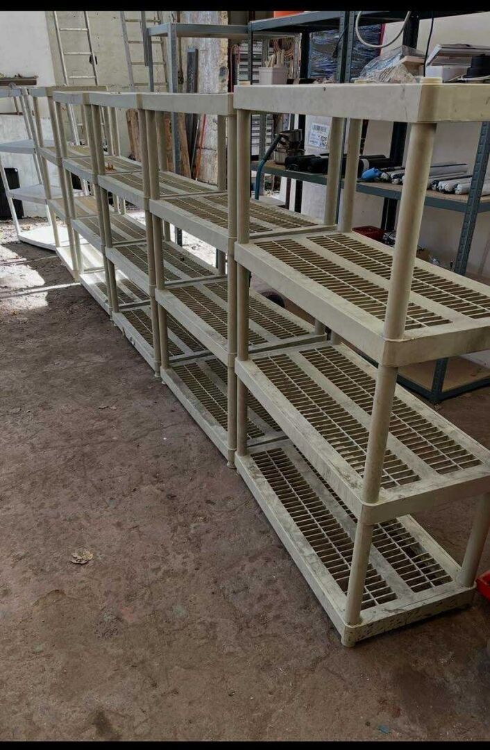 set of 6 beige pvc shelves, 4 levels.